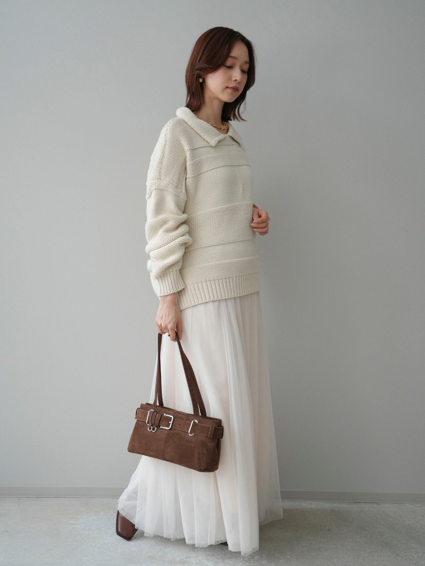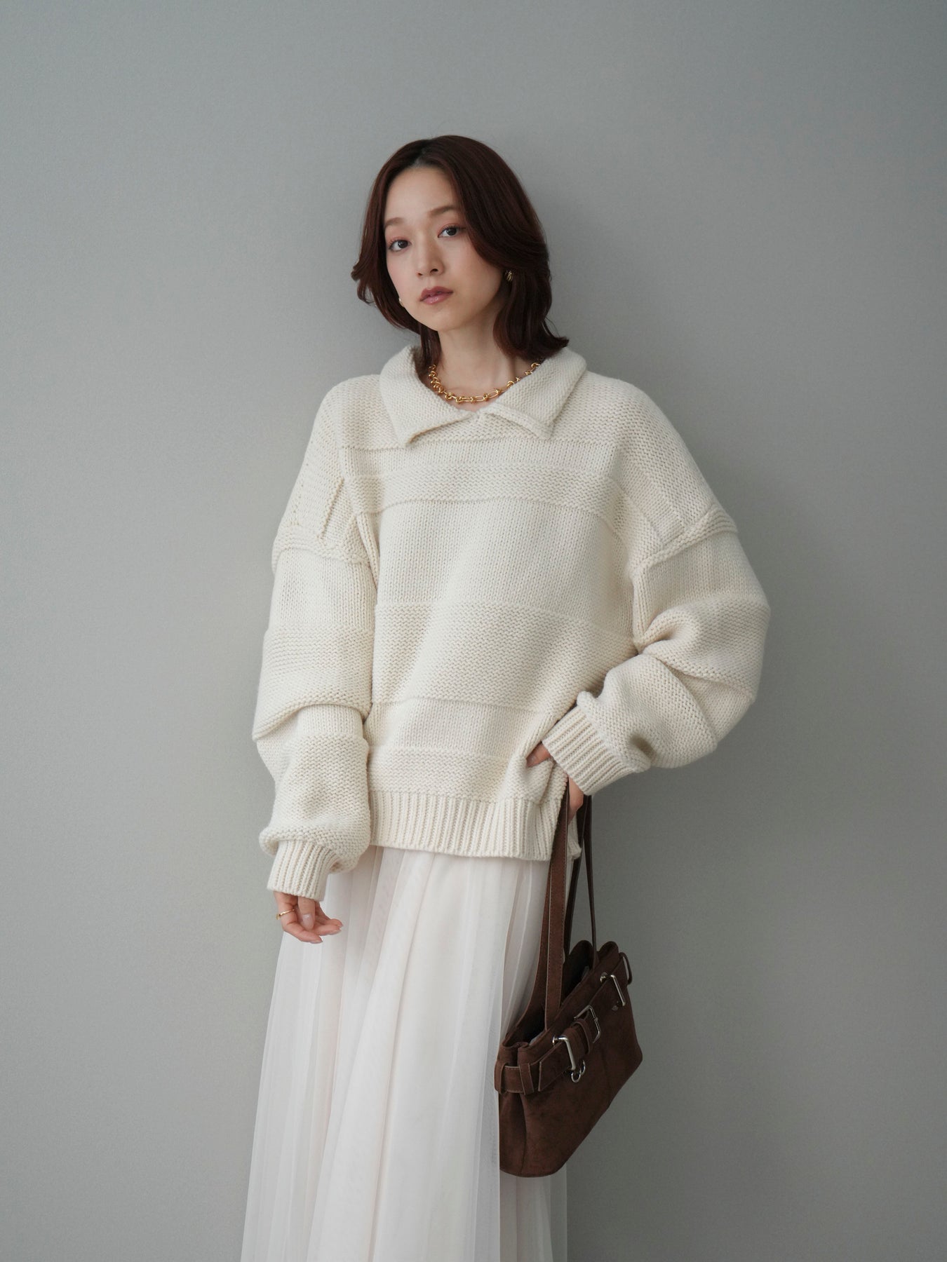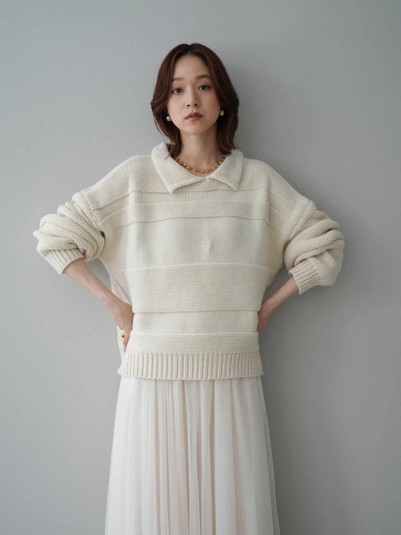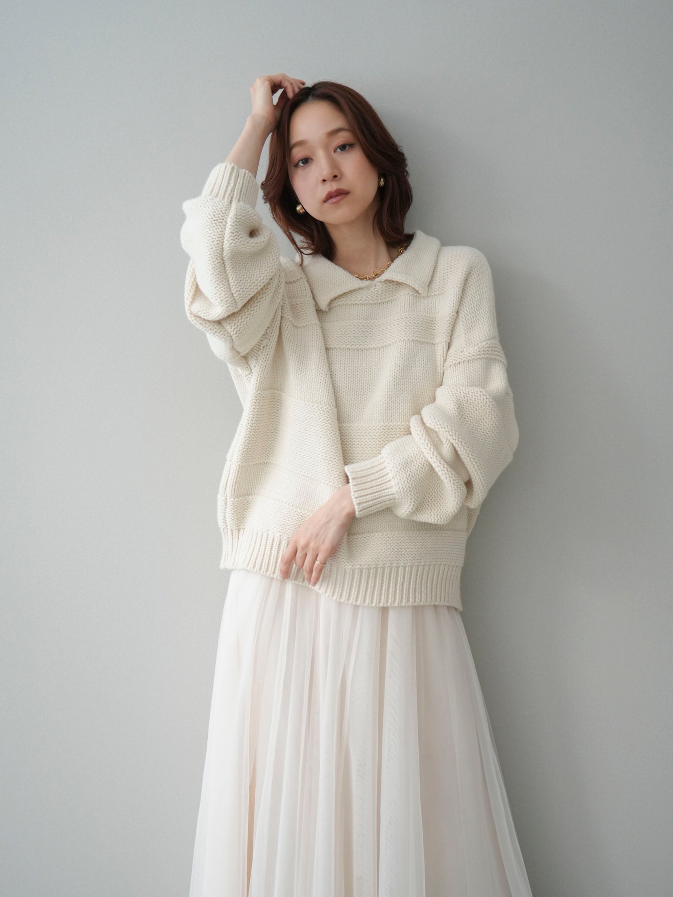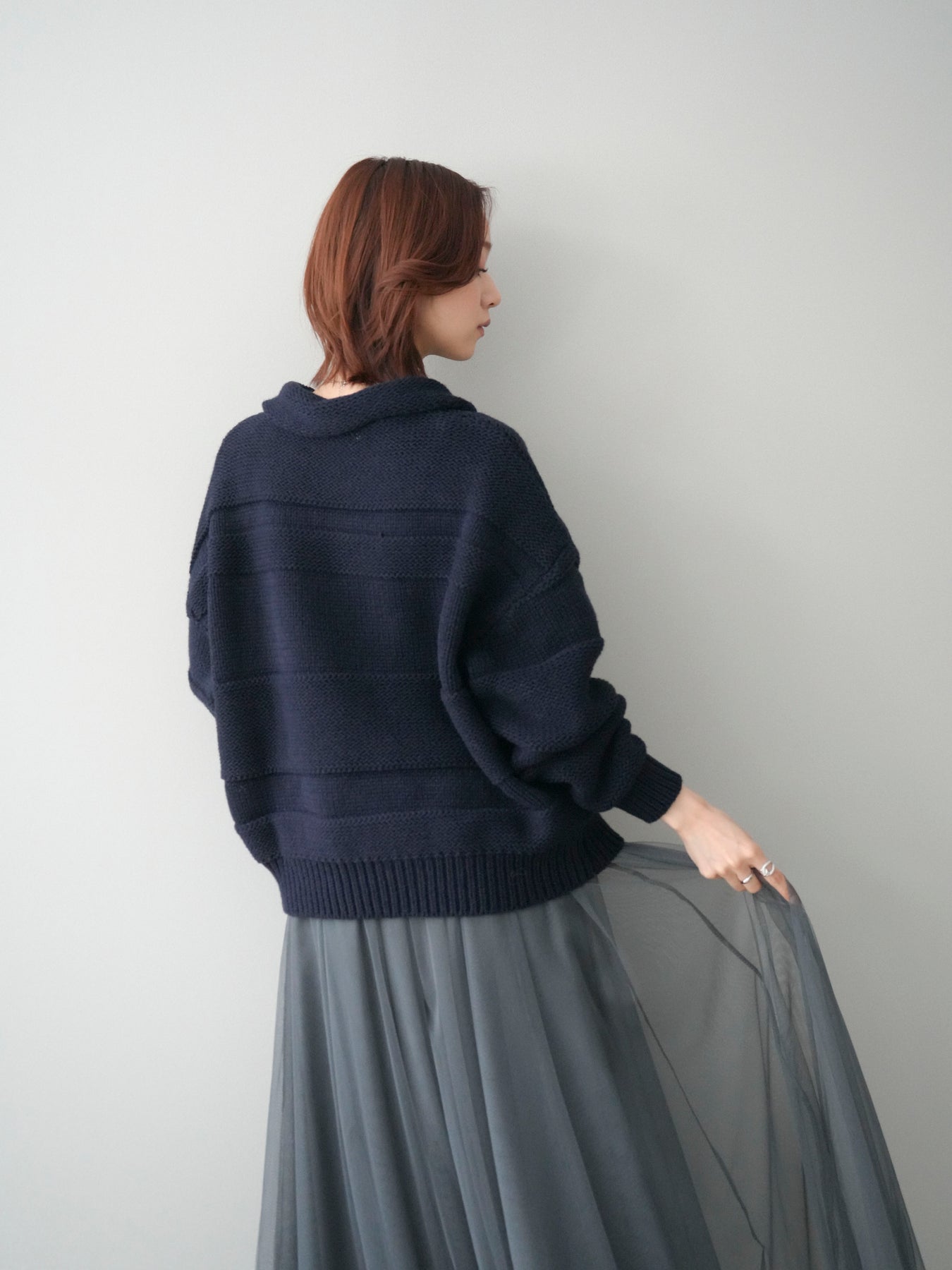 [SET]襟付きボーダー編みニットプルオーバー+チュールボリュームスカート(2set)