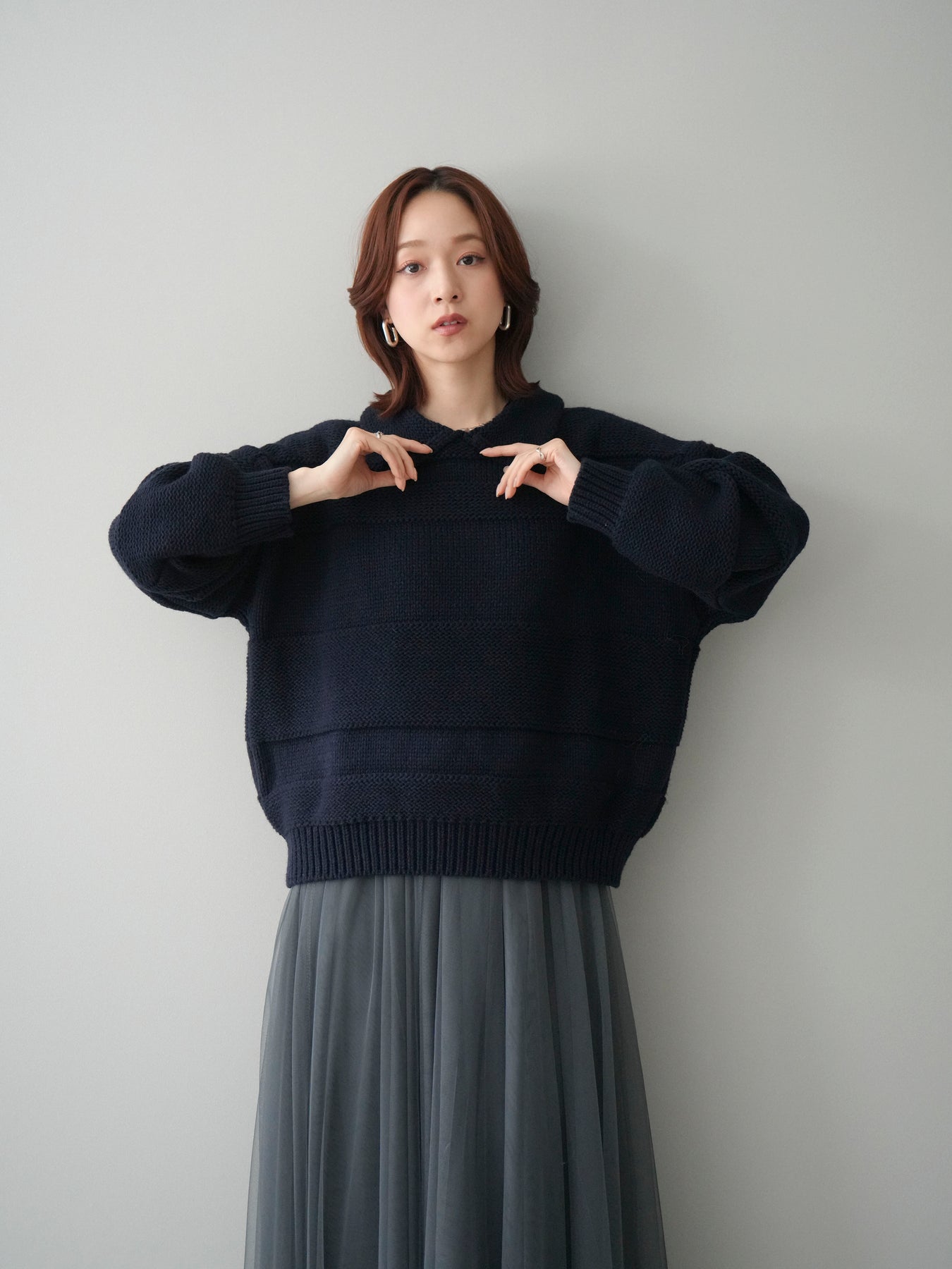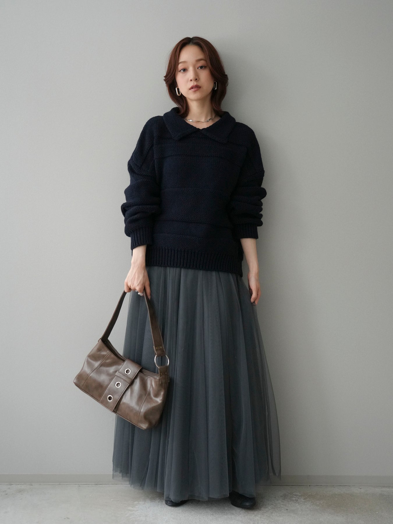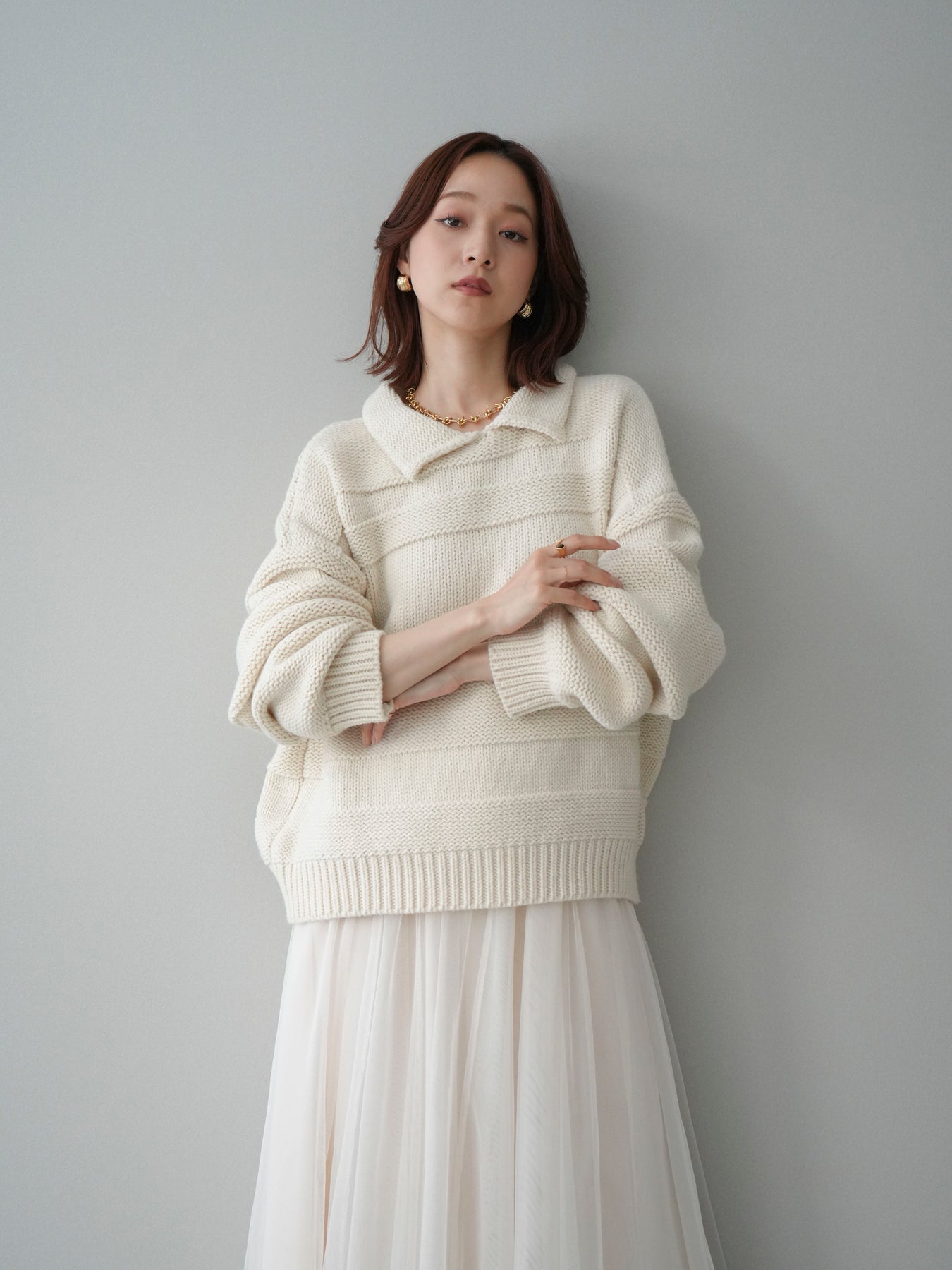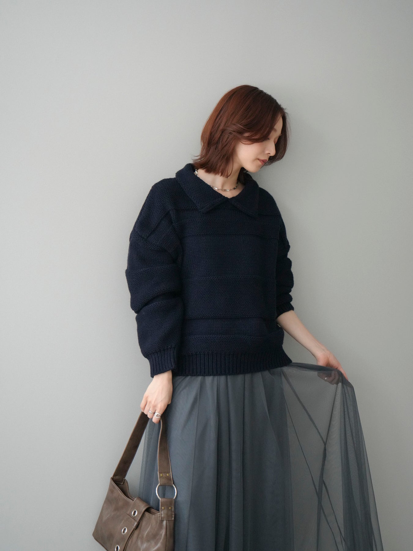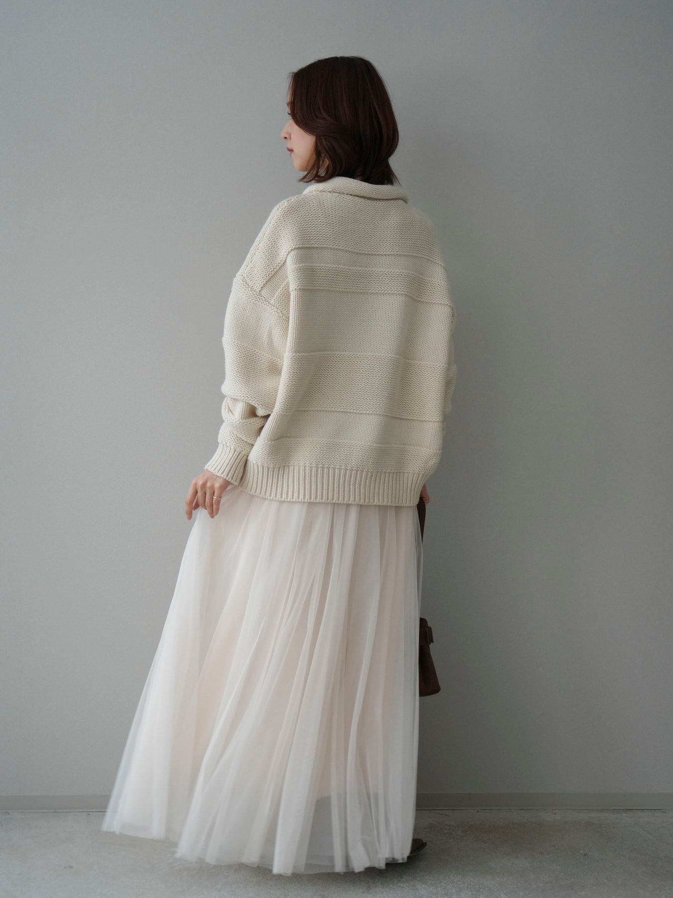 [SET]襟付きボーダー編みニットプルオーバー+チュールボリュームスカート(2set)