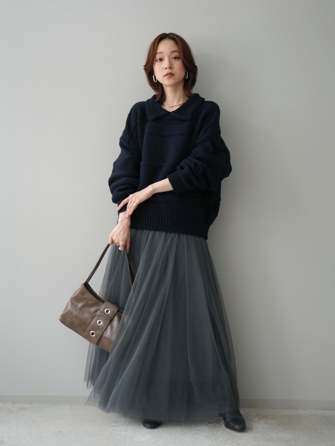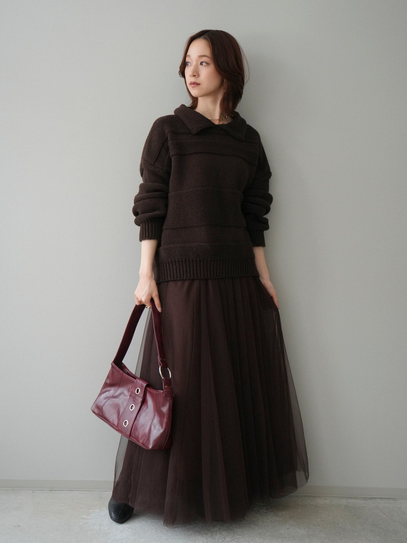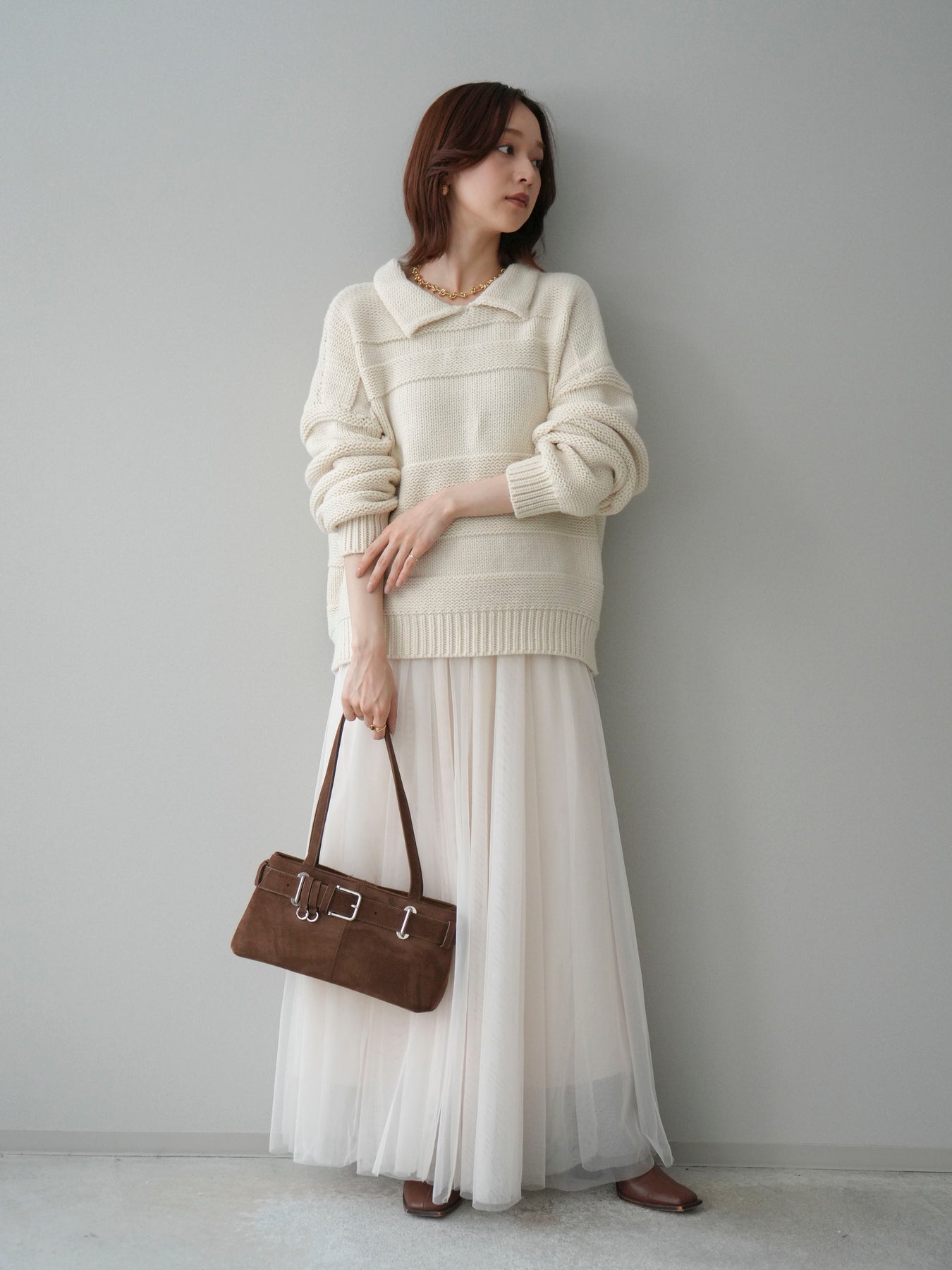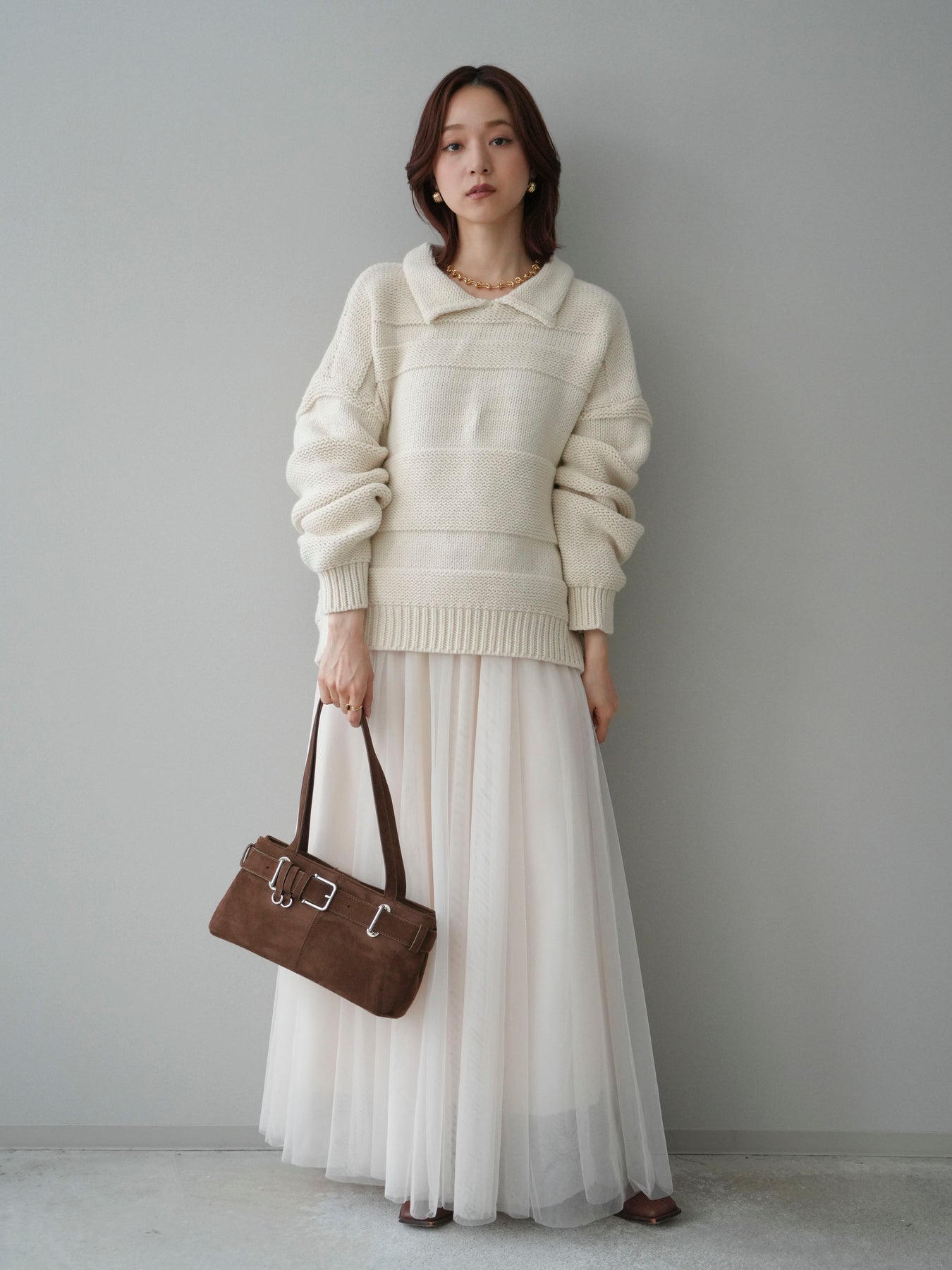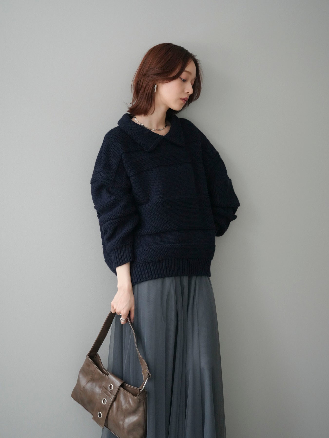 [SET]襟付きボーダー編みニットプルオーバー+チュールボリュームスカート(2set)