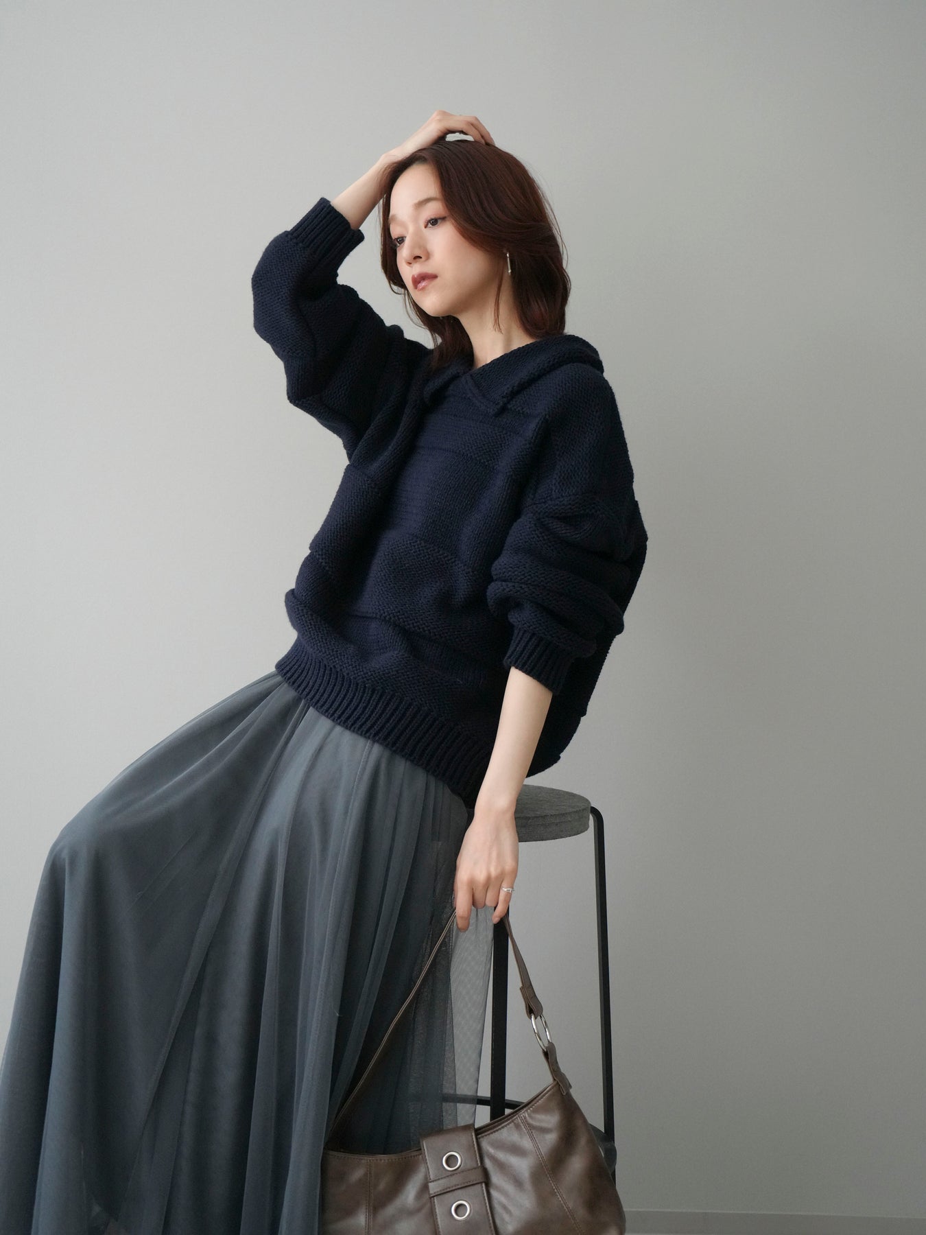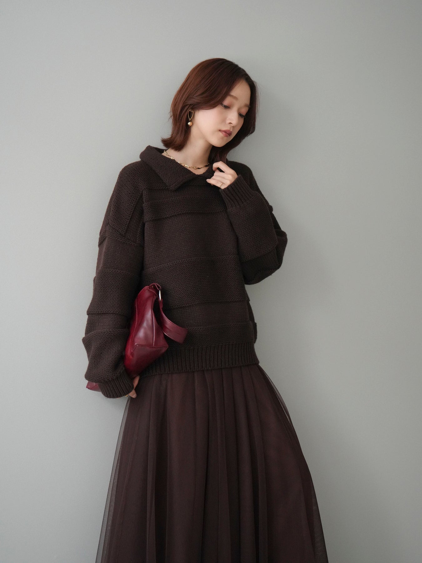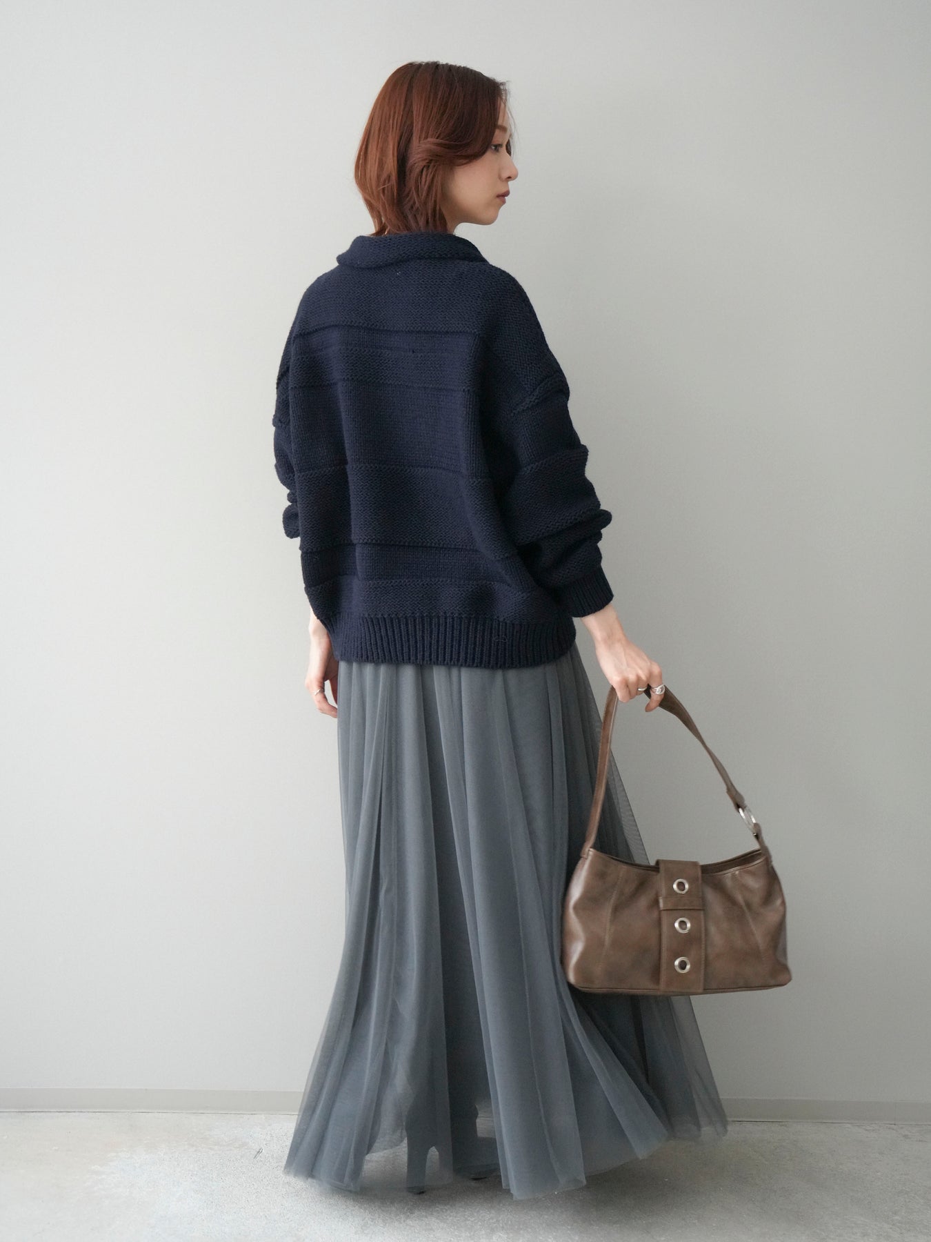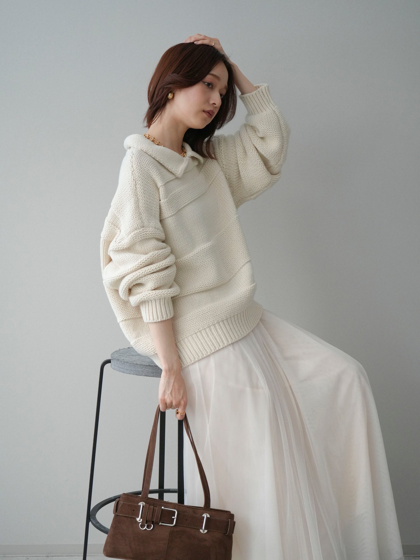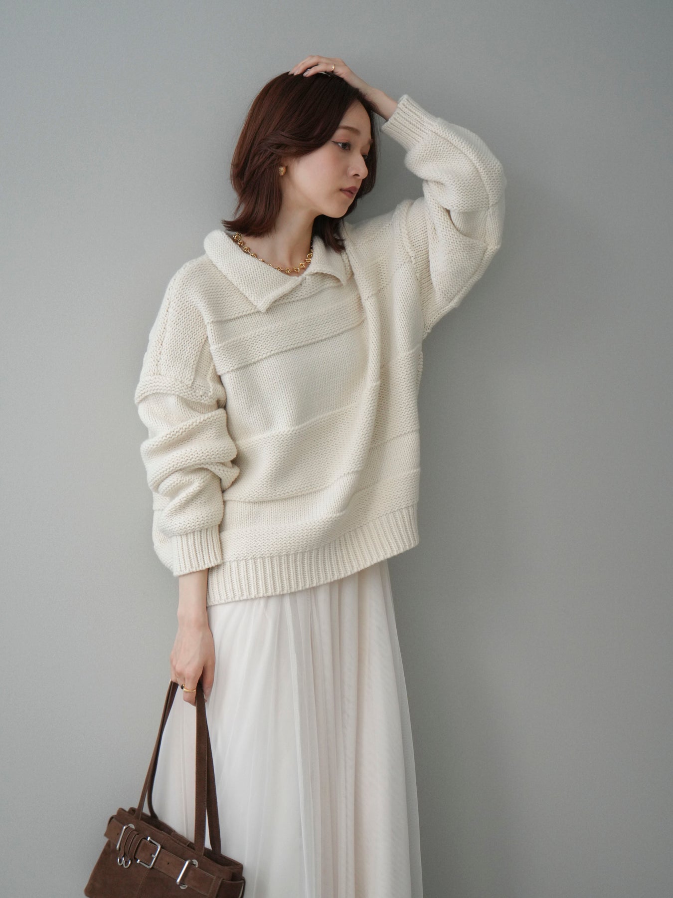 [SET]襟付きボーダー編みニットプルオーバー+チュールボリュームスカート(2set)