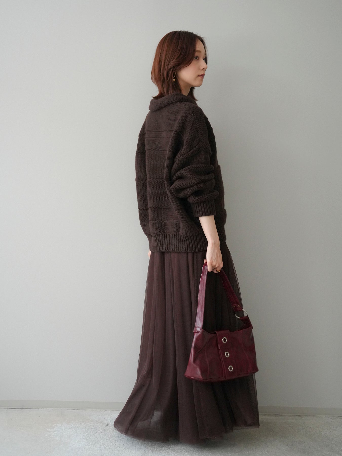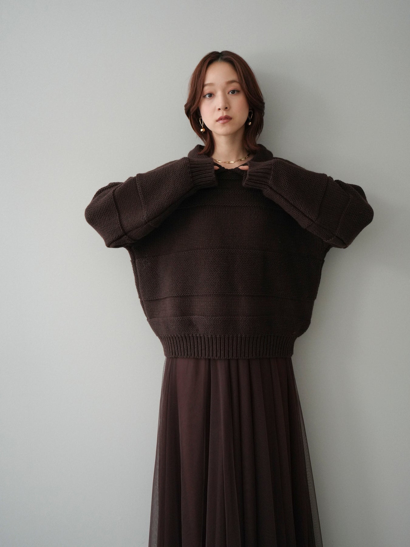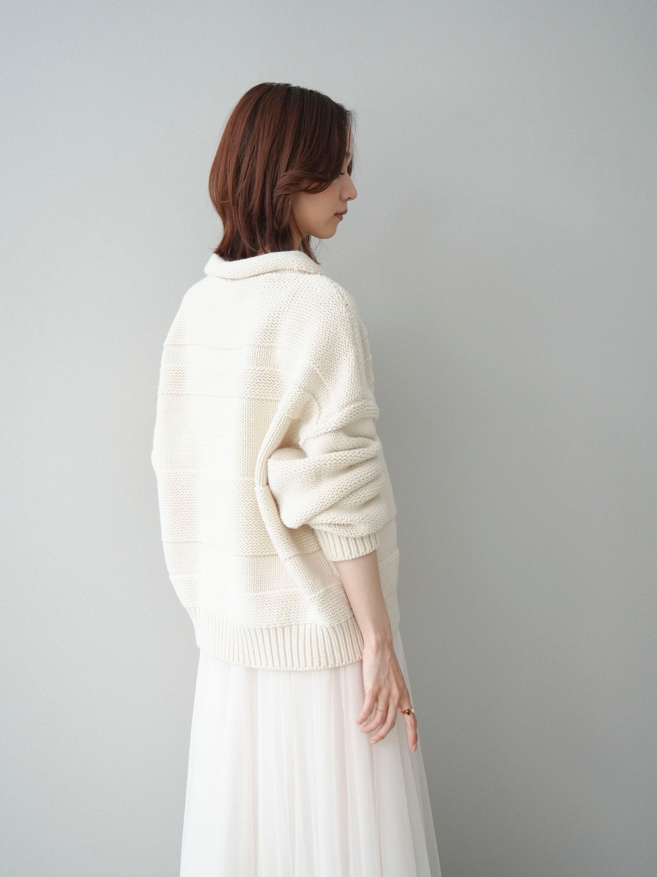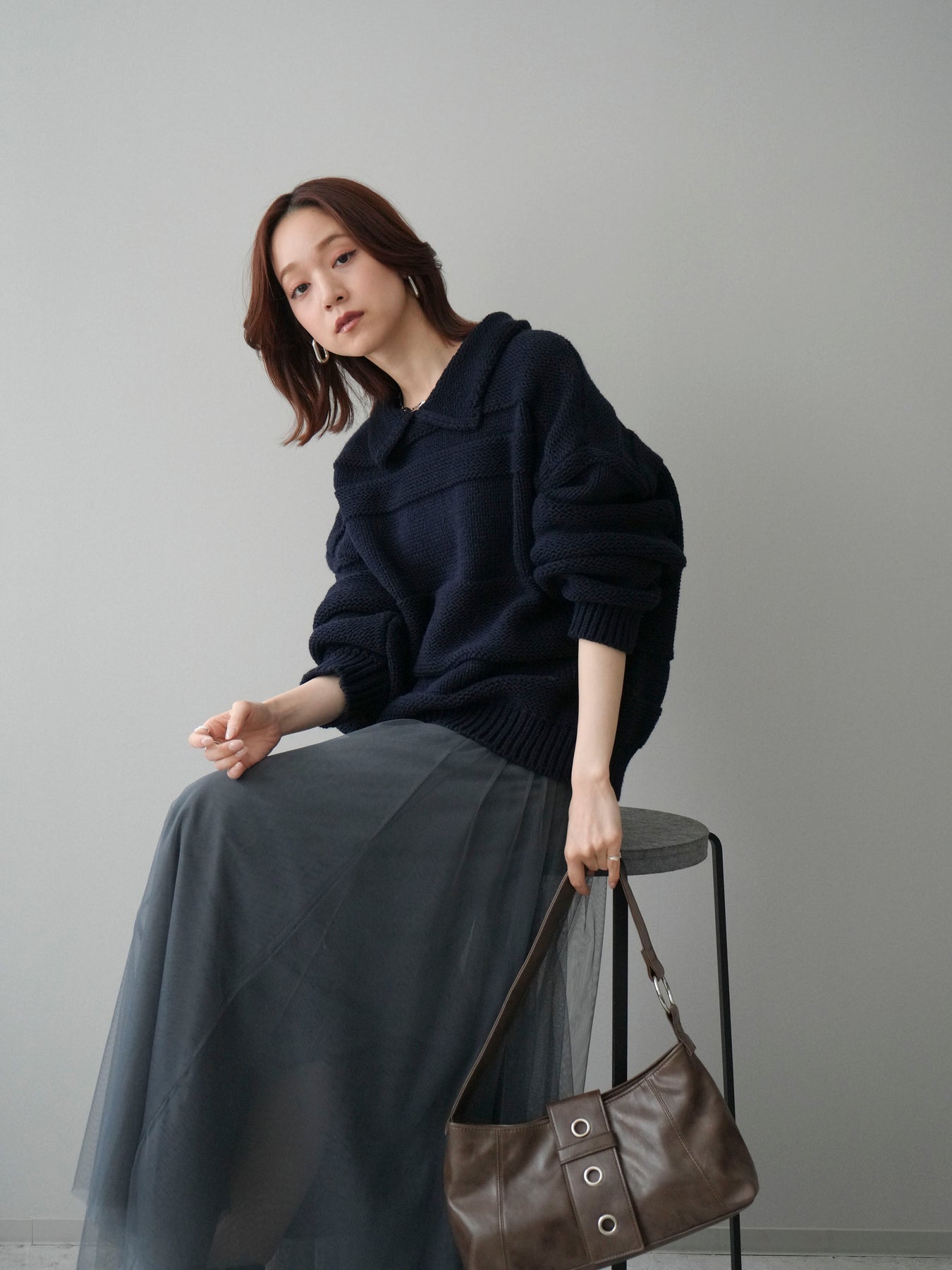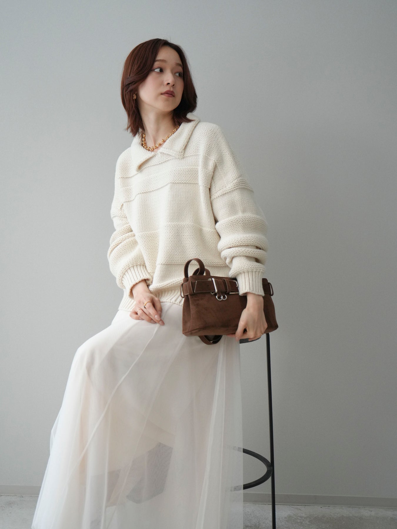 [SET]襟付きボーダー編みニットプルオーバー+チュールボリュームスカート(2set)