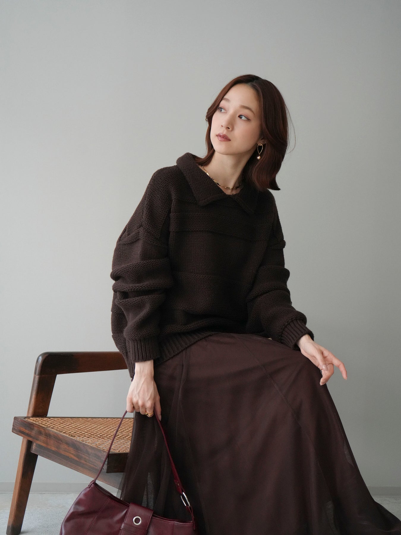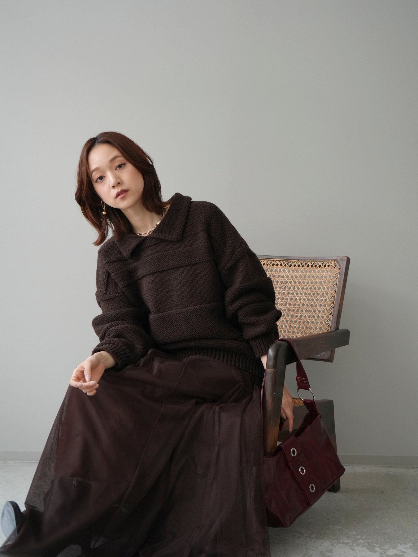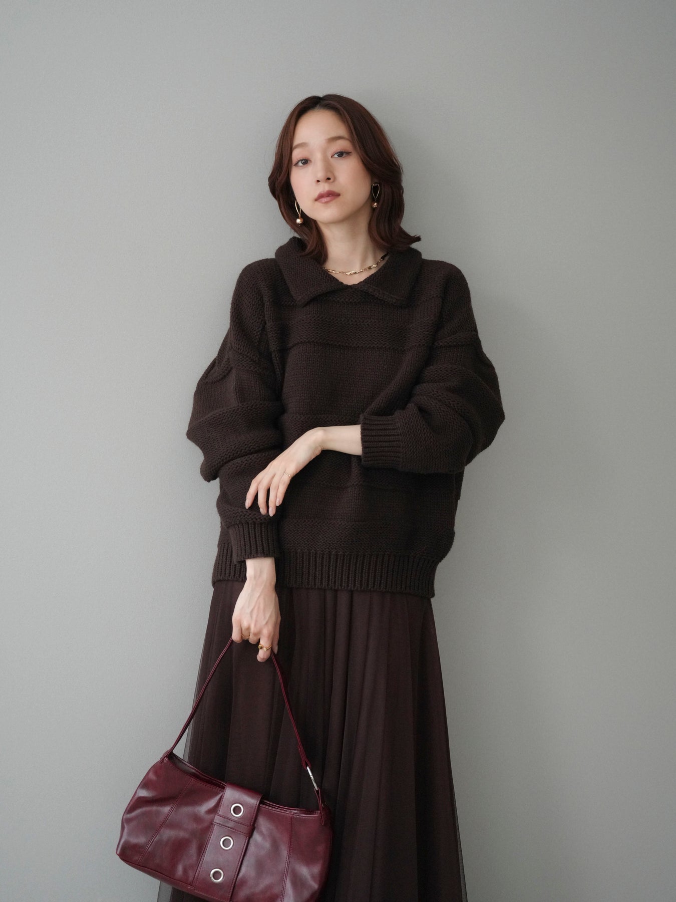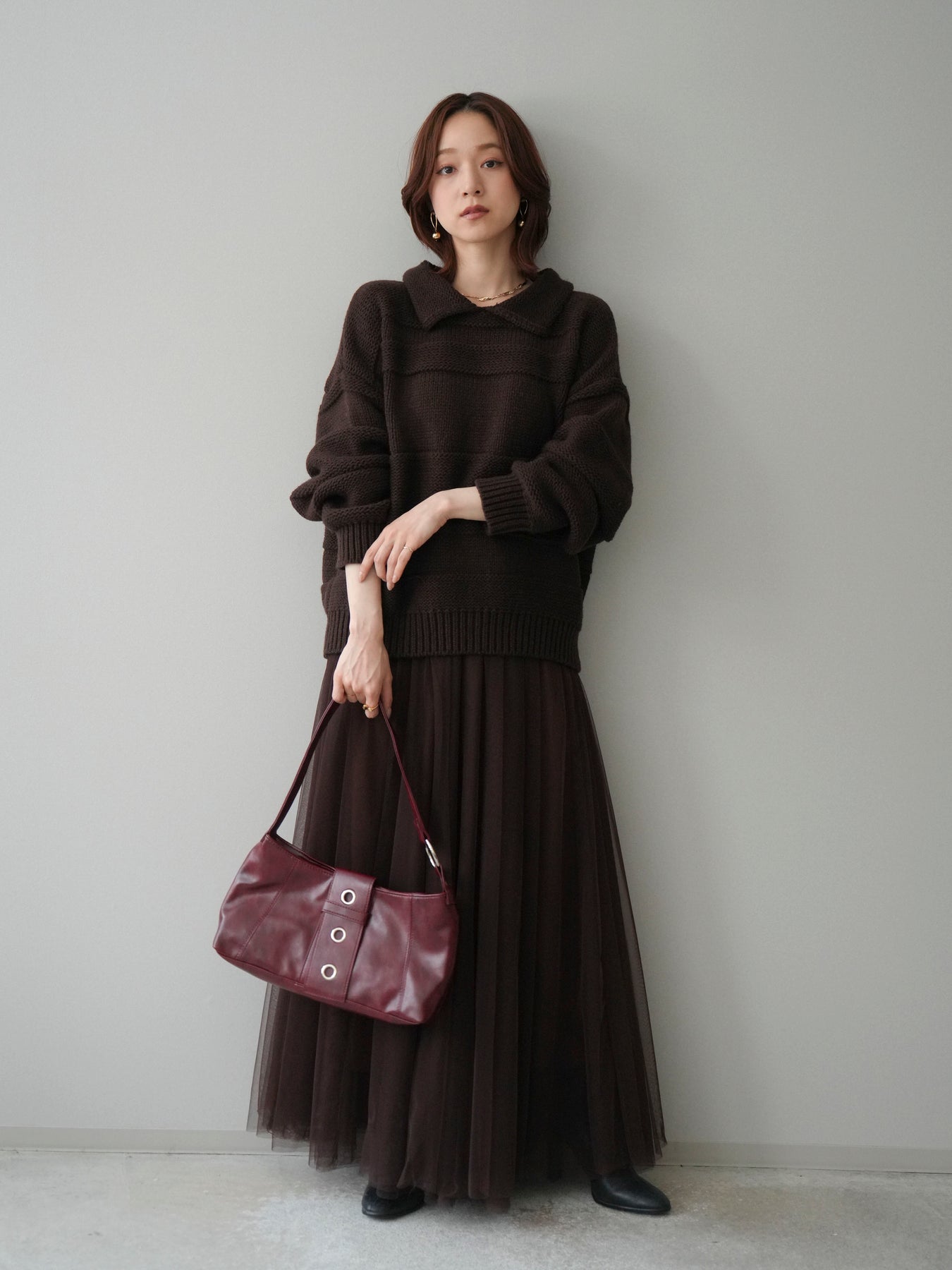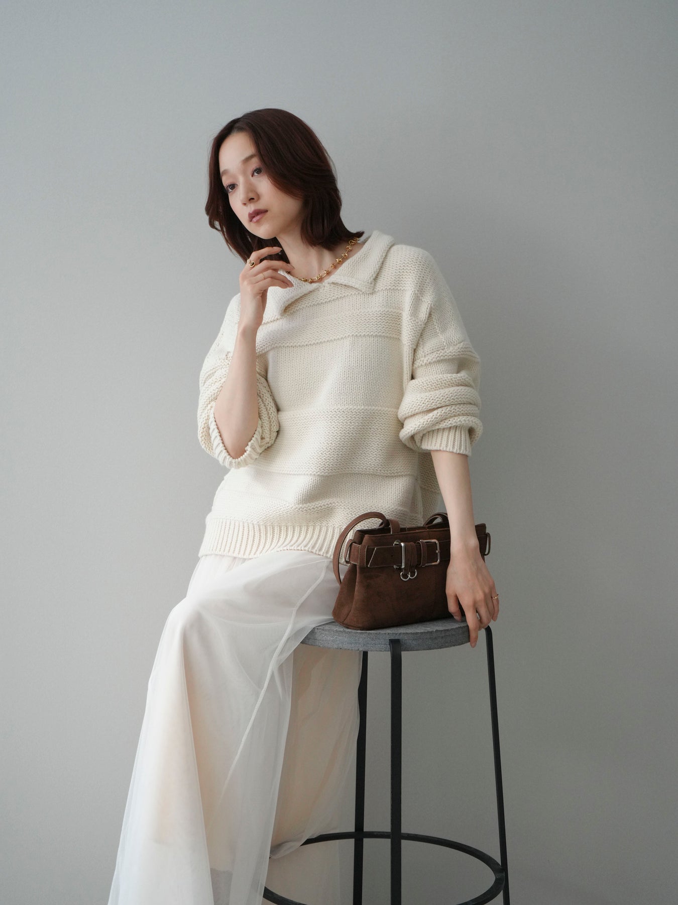 [SET]襟付きボーダー編みニットプルオーバー+チュールボリュームスカート(2set)