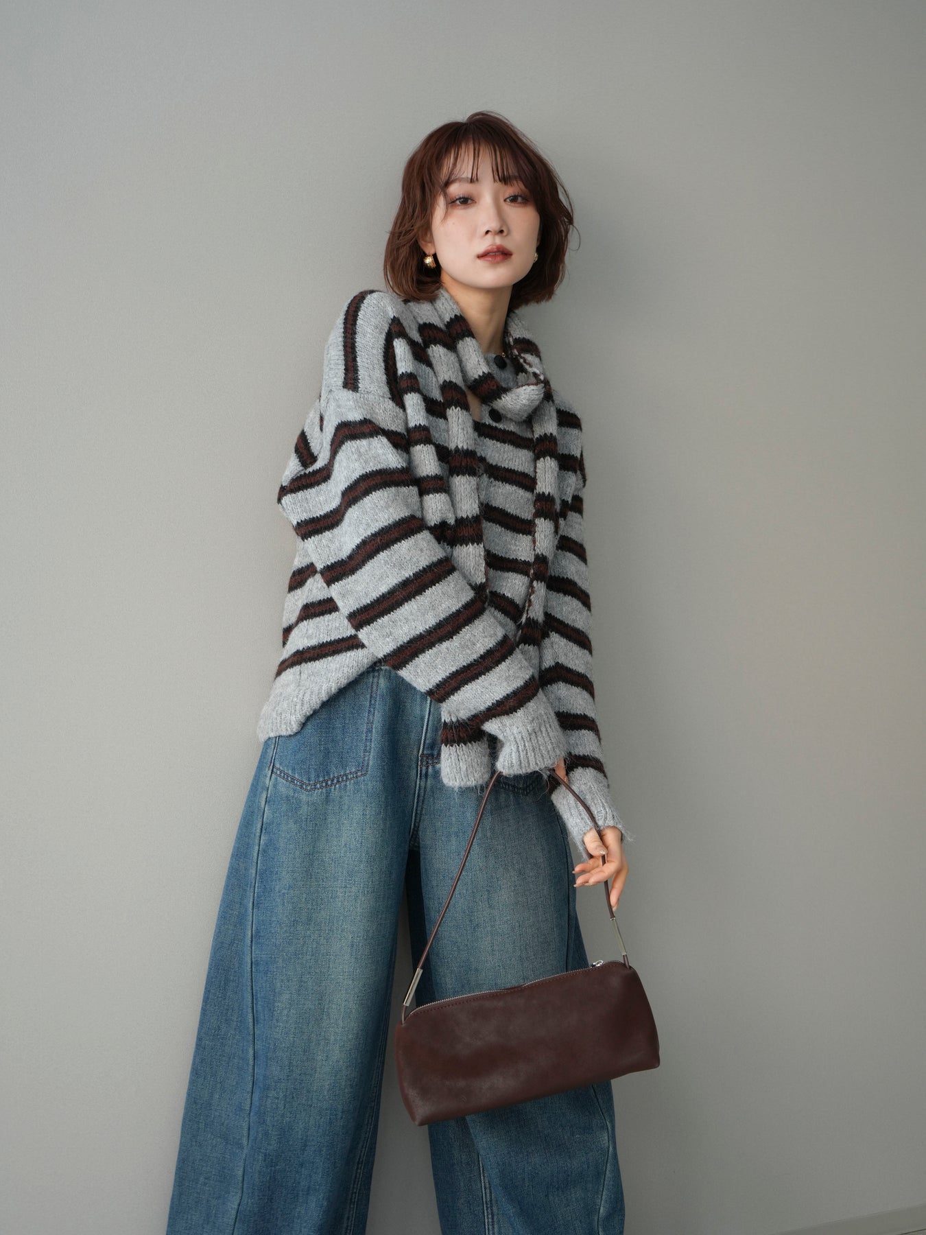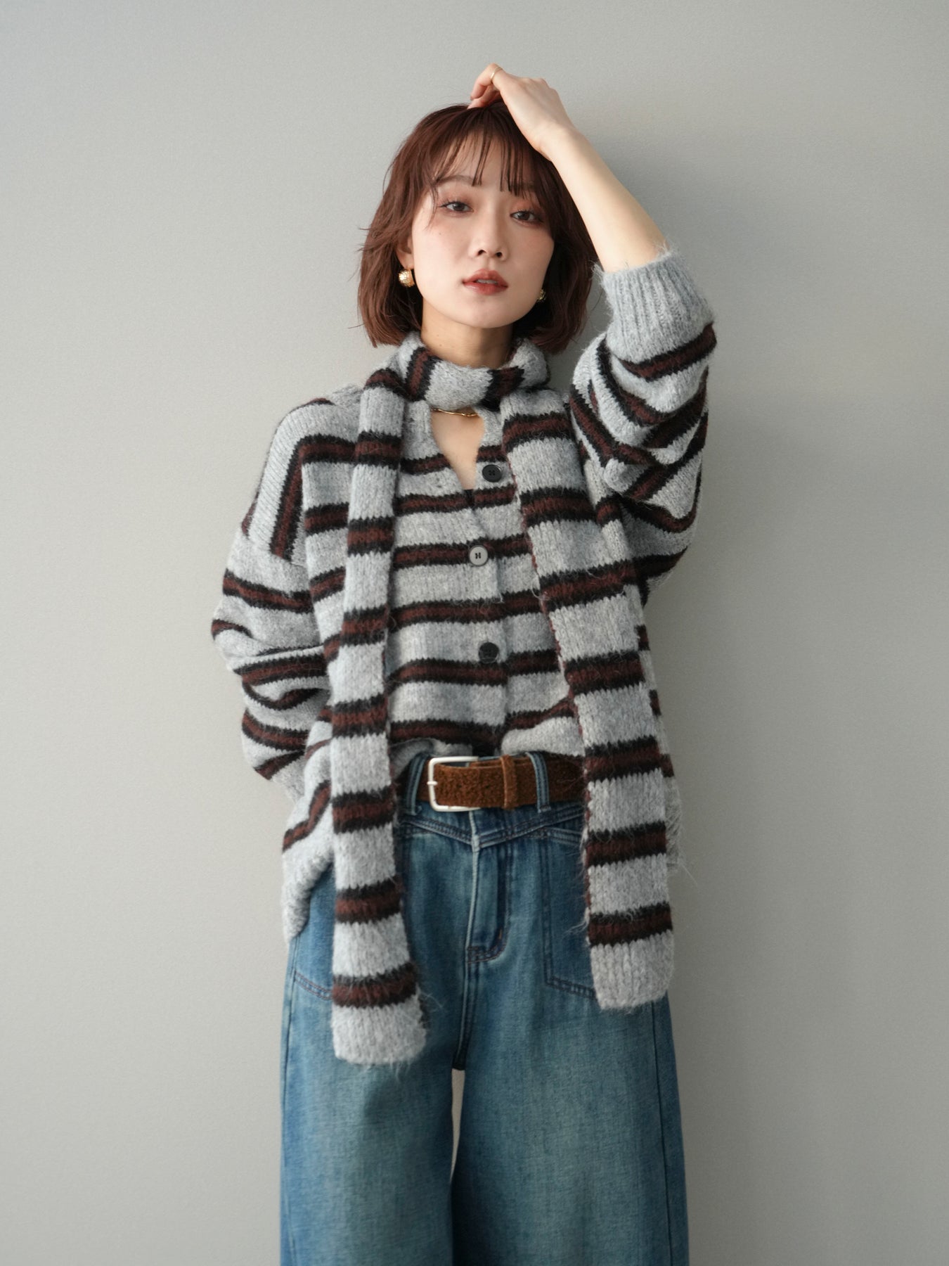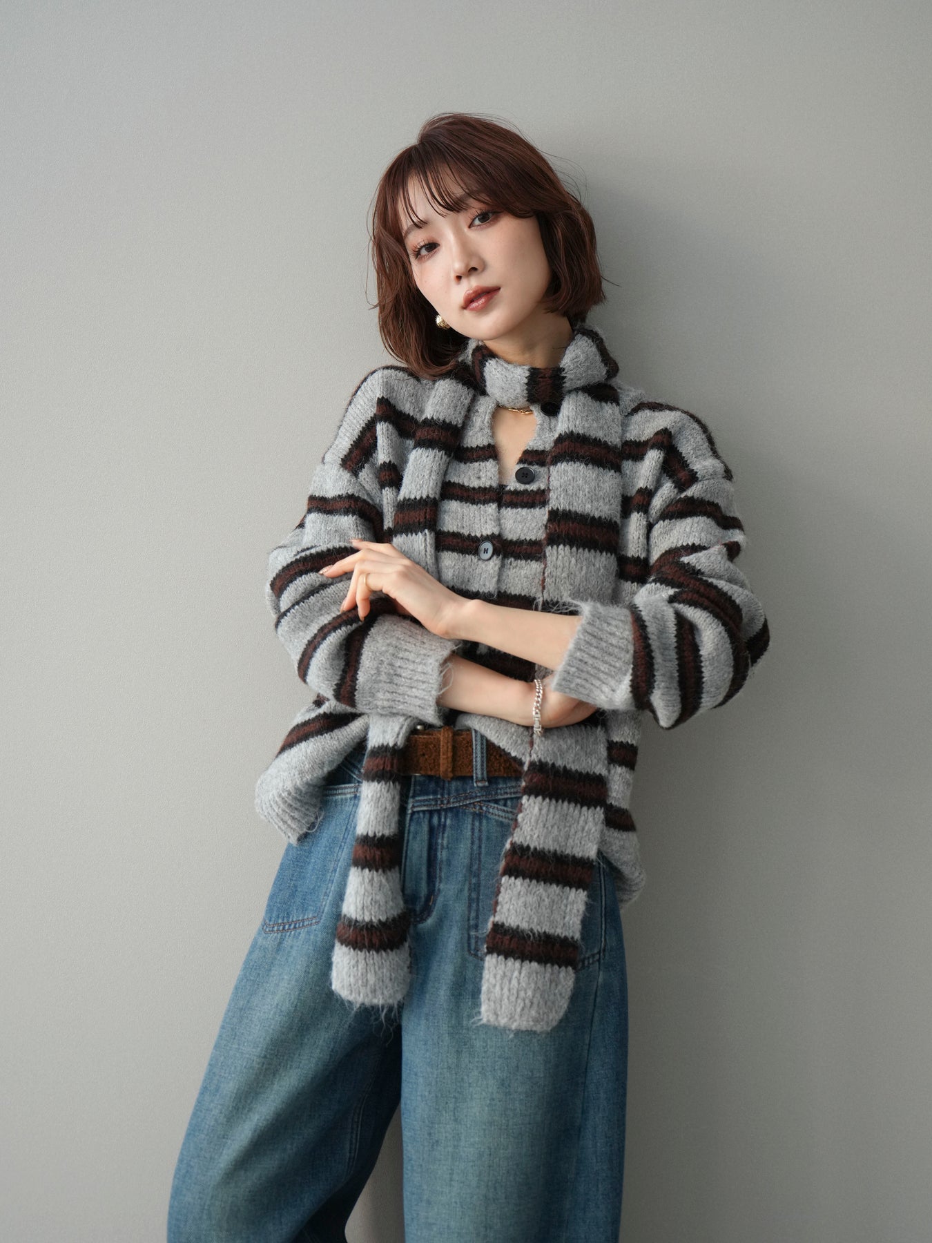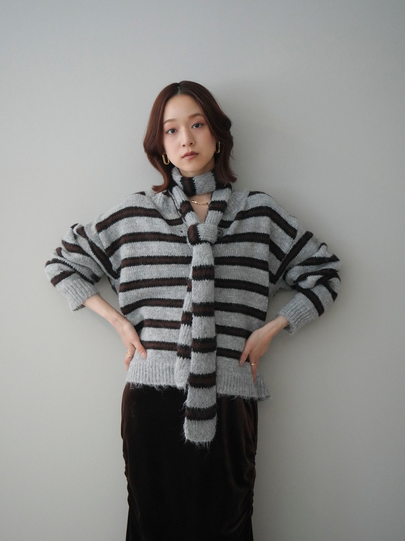 ふんわりとしたシャギーニットにボーダー柄を乗せ、顔まわりを華やかに演出するボウタイ付きのデザインニット。首元はボタンで取り外し可能なタイ付き仕様で、リボン結びや垂らしなど、その日の気分でアレンジが楽しめます。ボリューム感のある袖と短すぎない丈感が絶妙で、パンツにもスカートにも合わせやすいバランスに仕上げました。