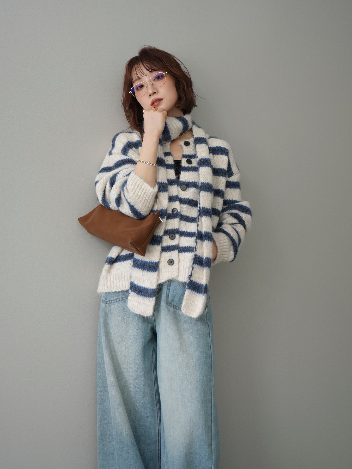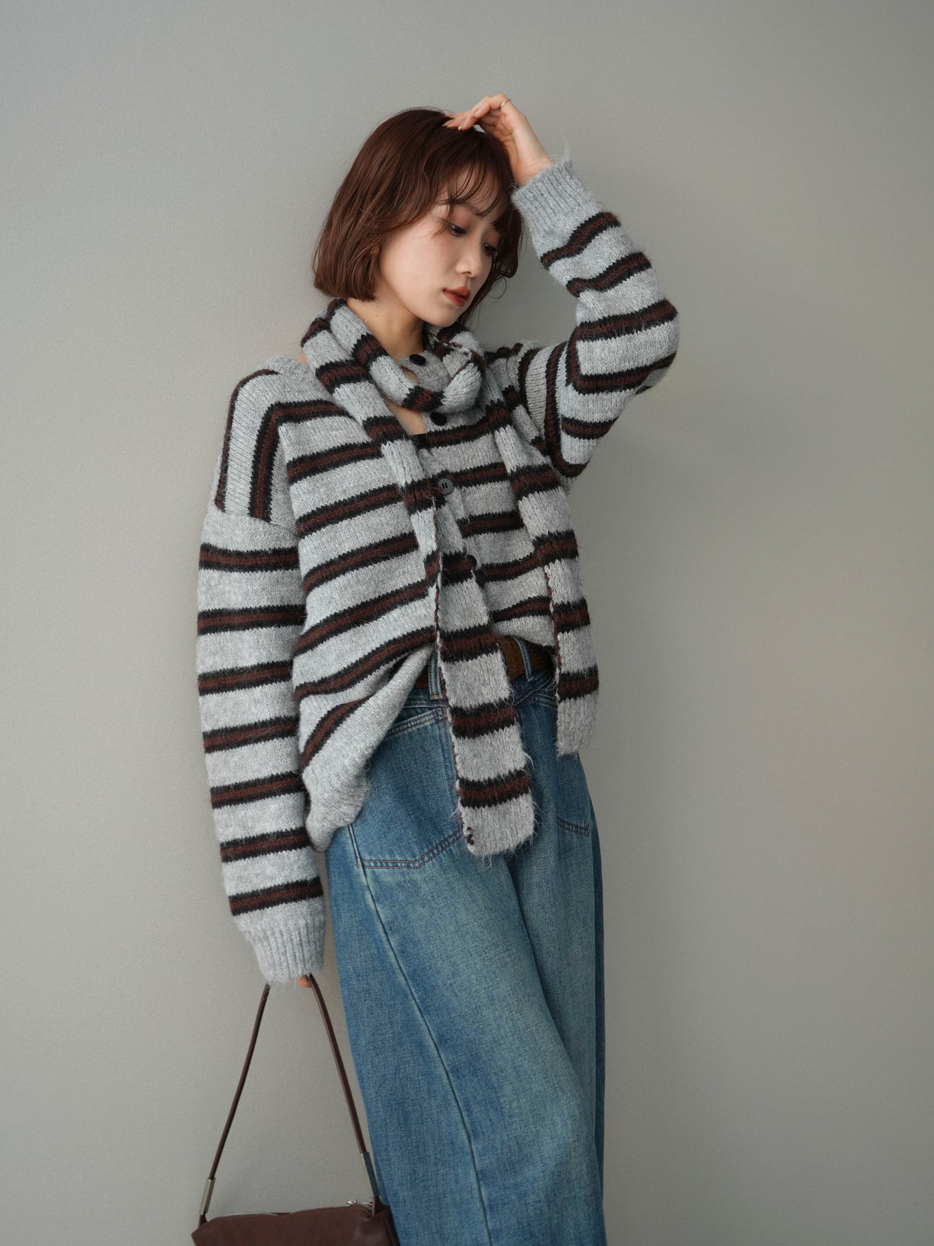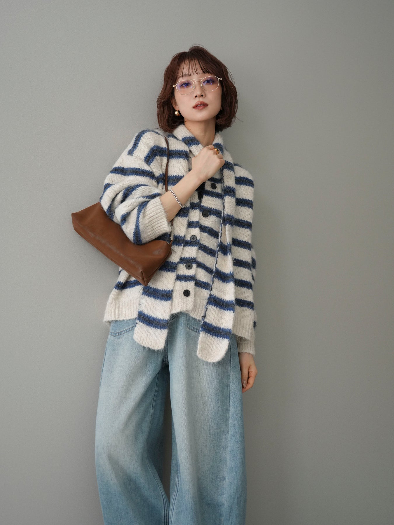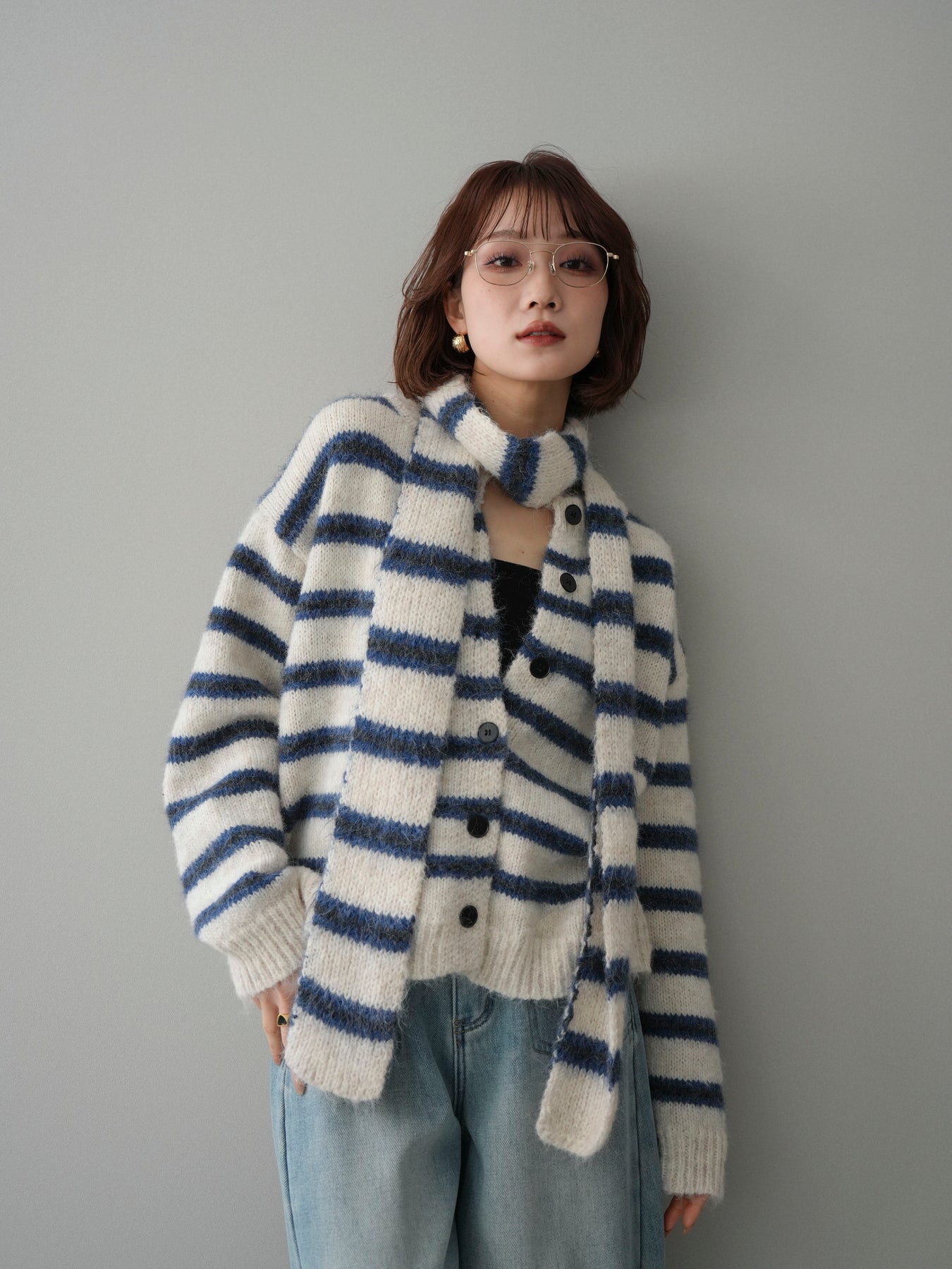 ふんわりとしたシャギーニットにボーダー柄を乗せ、顔まわりを華やかに演出するボウタイ付きのデザインニット。首元はボタンで取り外し可能なタイ付き仕様で、リボン結びや垂らしなど、その日の気分でアレンジが楽しめます。ボリューム感のある袖と短すぎない丈感が絶妙で、パンツにもスカートにも合わせやすいバランスに仕上げました。