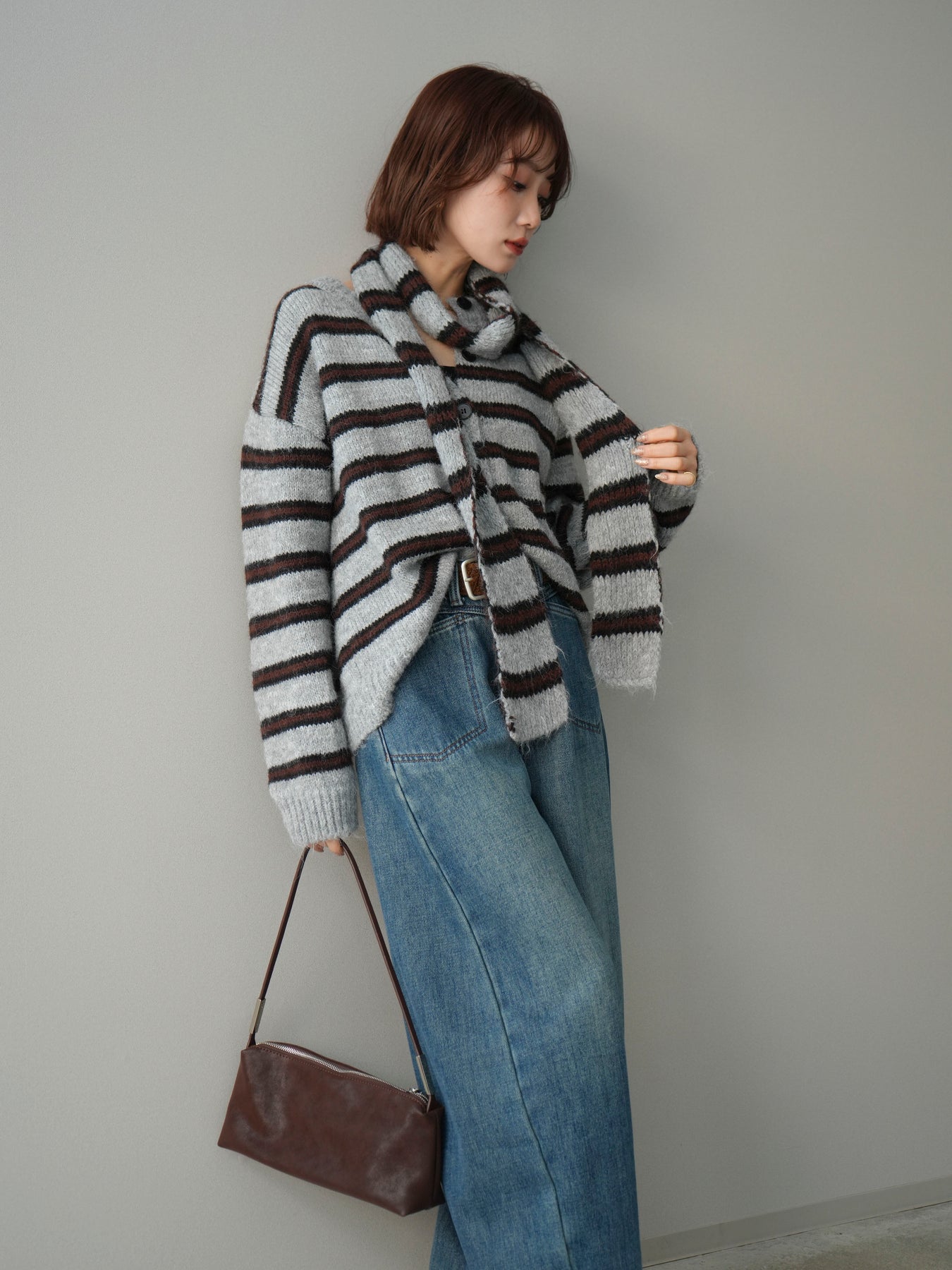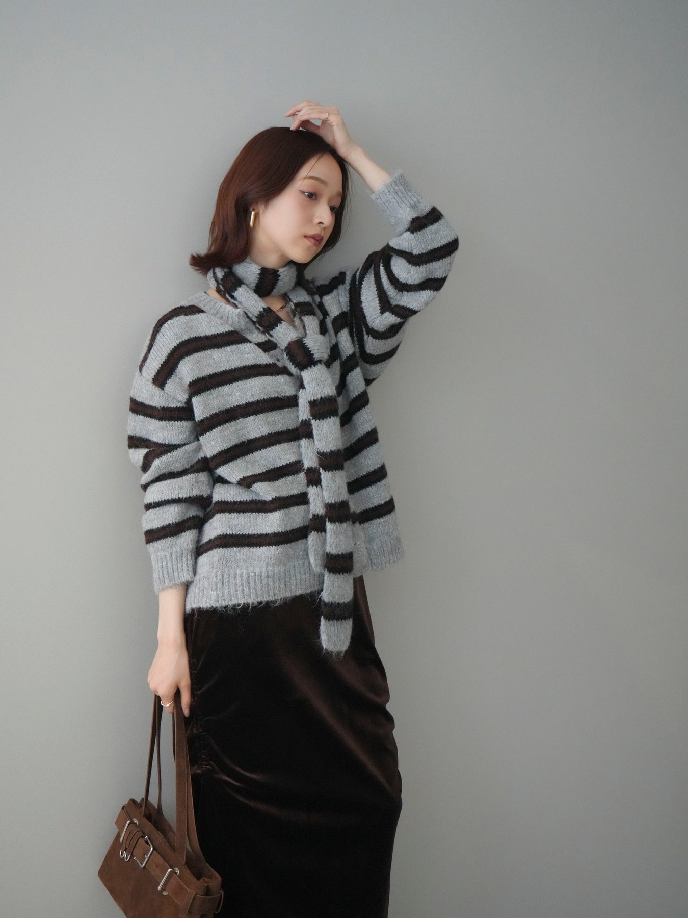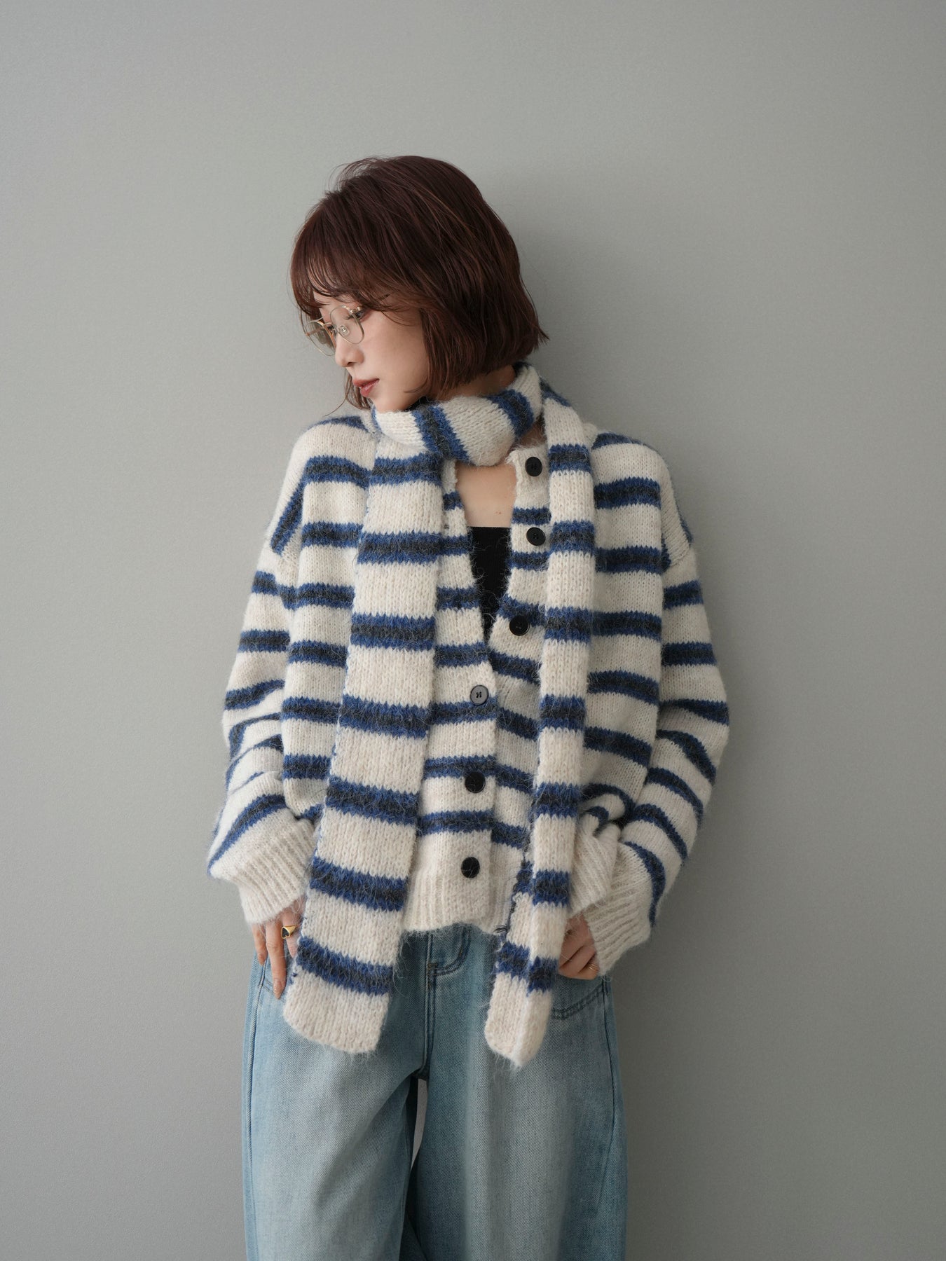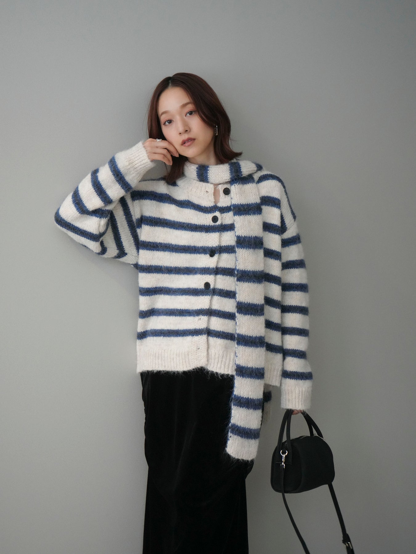 ふんわりとしたシャギーニットにボーダー柄を乗せ、顔まわりを華やかに演出するボウタイ付きのデザインニット。首元はボタンで取り外し可能なタイ付き仕様で、リボン結びや垂らしなど、その日の気分でアレンジが楽しめます。ボリューム感のある袖と短すぎない丈感が絶妙で、パンツにもスカートにも合わせやすいバランスに仕上げました。