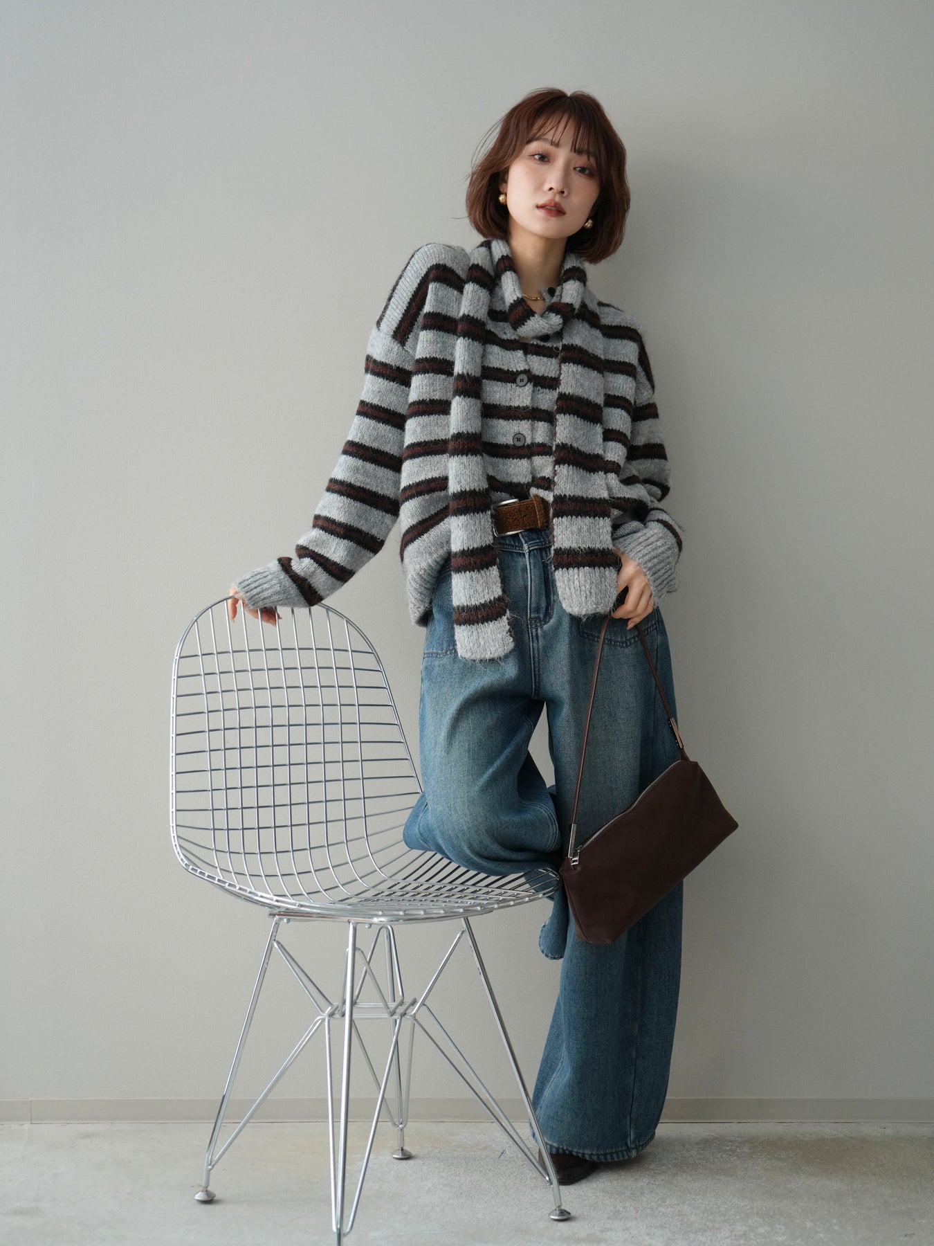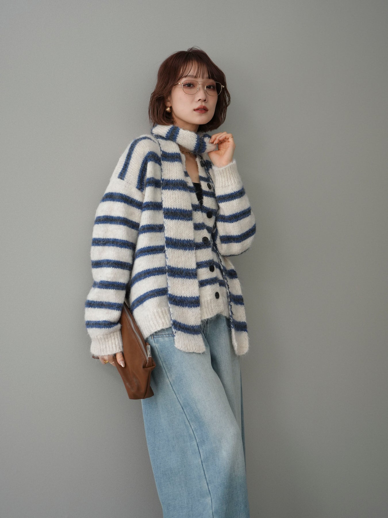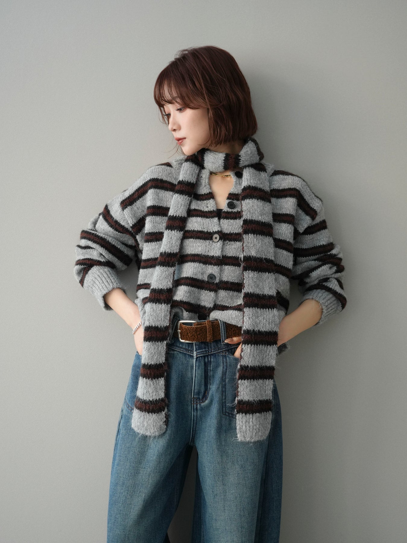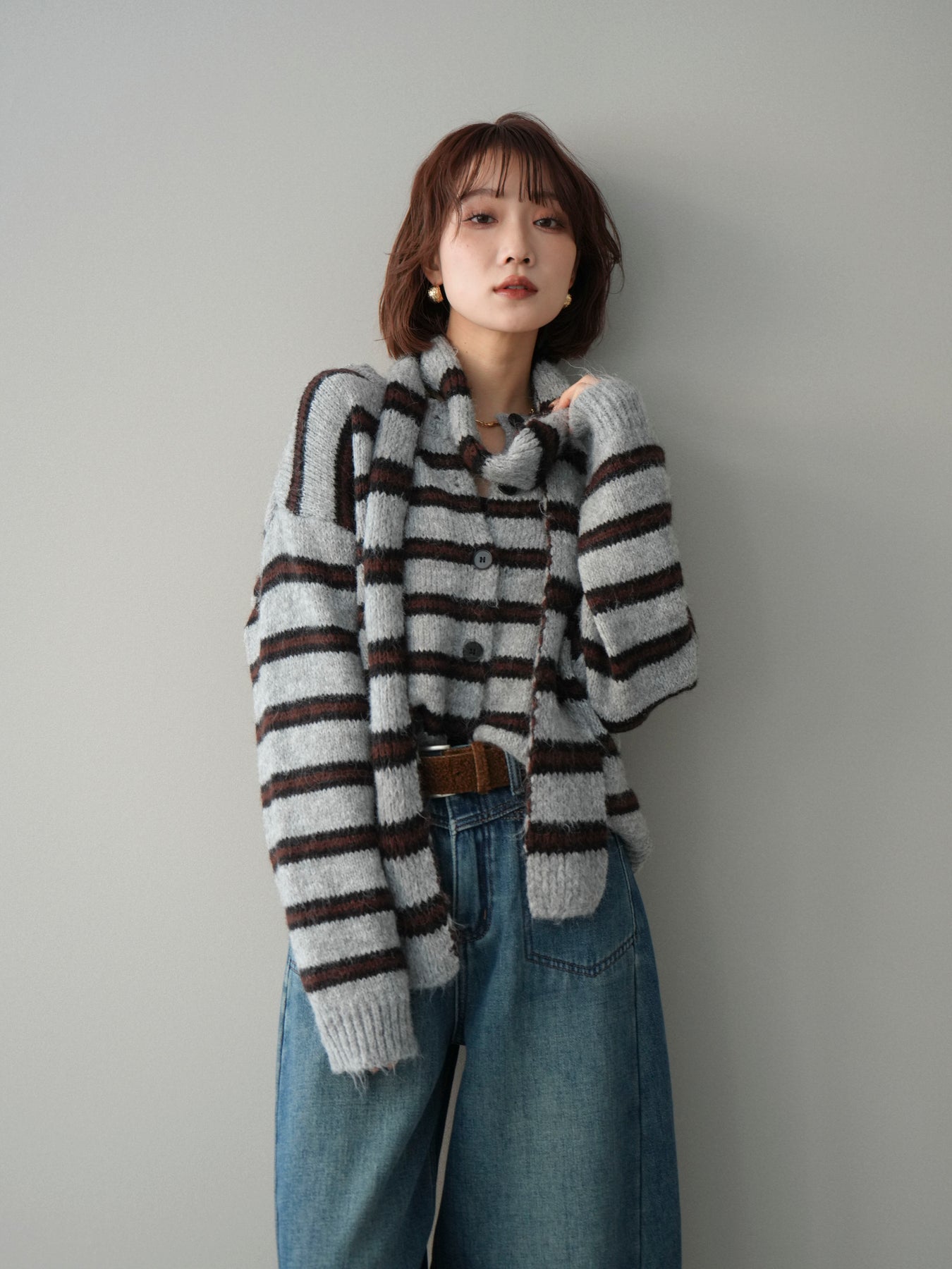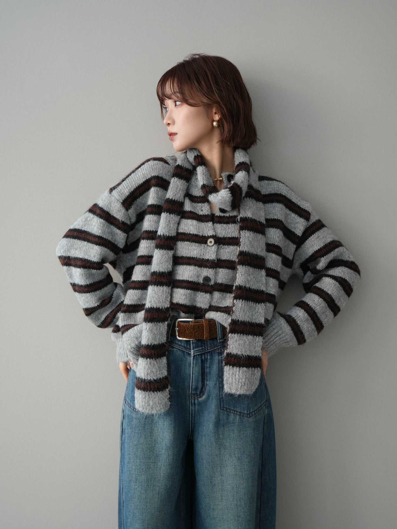 ふんわりとしたシャギーニットにボーダー柄を乗せ、顔まわりを華やかに演出するボウタイ付きのデザインニット。首元はボタンで取り外し可能なタイ付き仕様で、リボン結びや垂らしなど、その日の気分でアレンジが楽しめます。ボリューム感のある袖と短すぎない丈感が絶妙で、パンツにもスカートにも合わせやすいバランスに仕上げました。