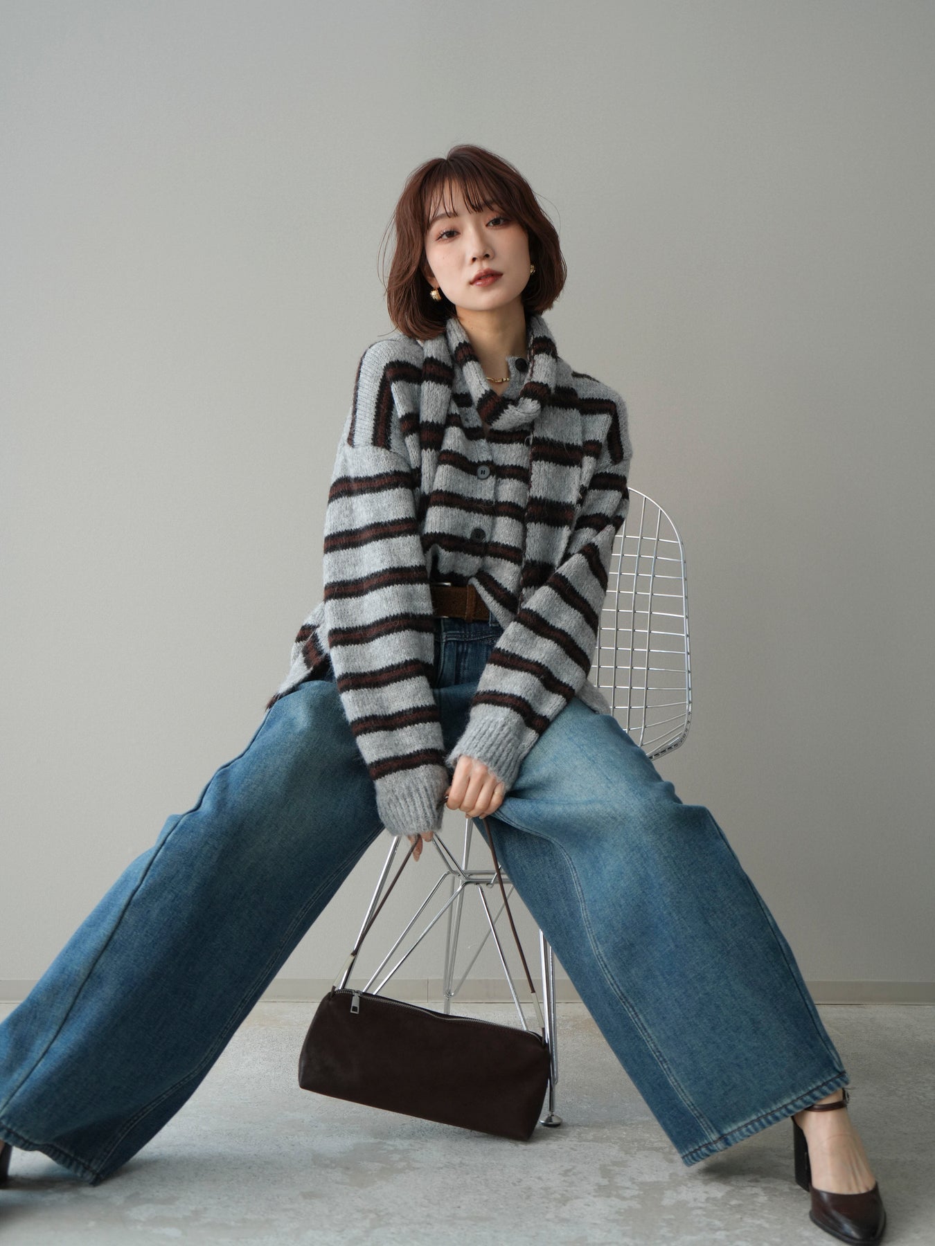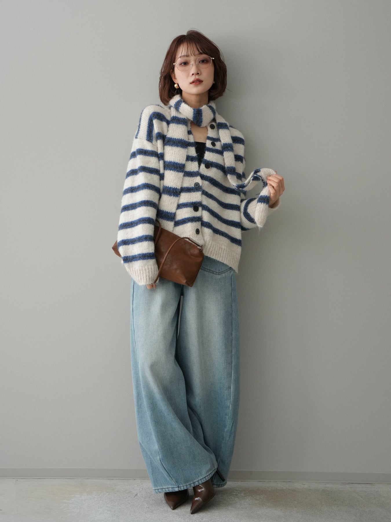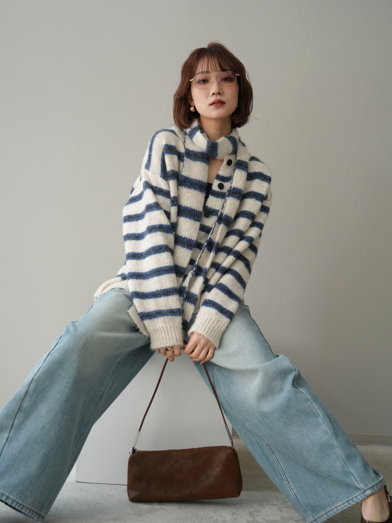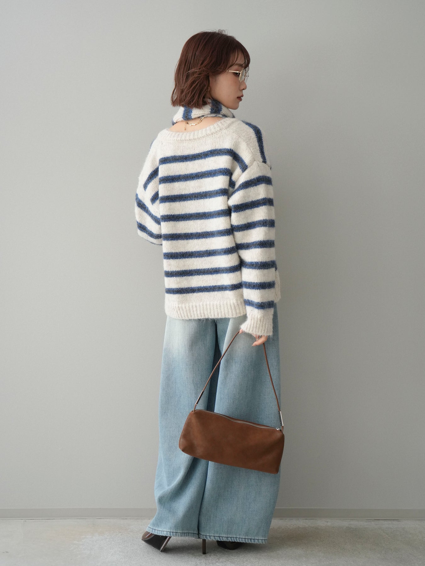 ふんわりとしたシャギーニットにボーダー柄を乗せ、顔まわりを華やかに演出するボウタイ付きのデザインニット。首元はボタンで取り外し可能なタイ付き仕様で、リボン結びや垂らしなど、その日の気分でアレンジが楽しめます。ボリューム感のある袖と短すぎない丈感が絶妙で、パンツにもスカートにも合わせやすいバランスに仕上げました。
