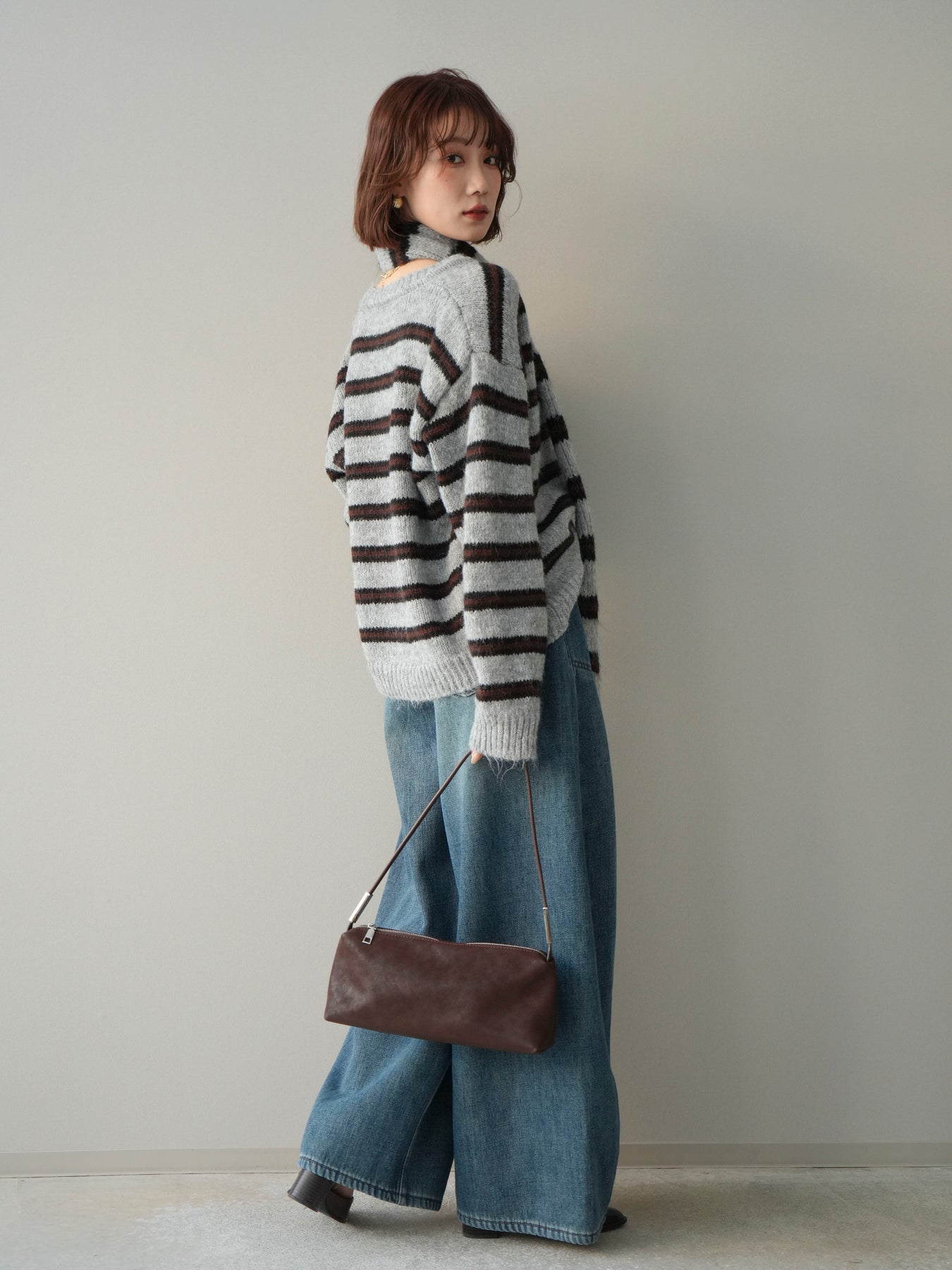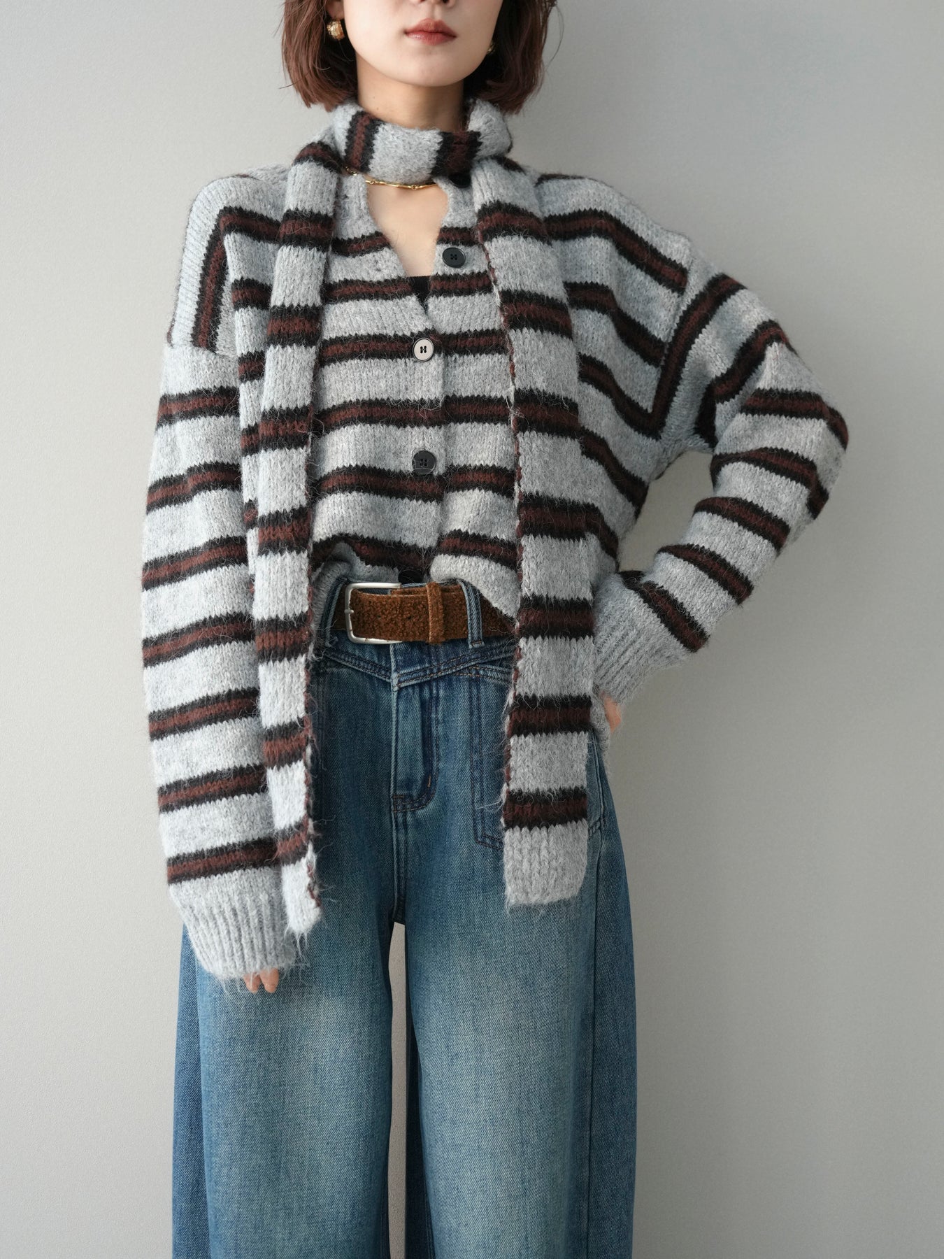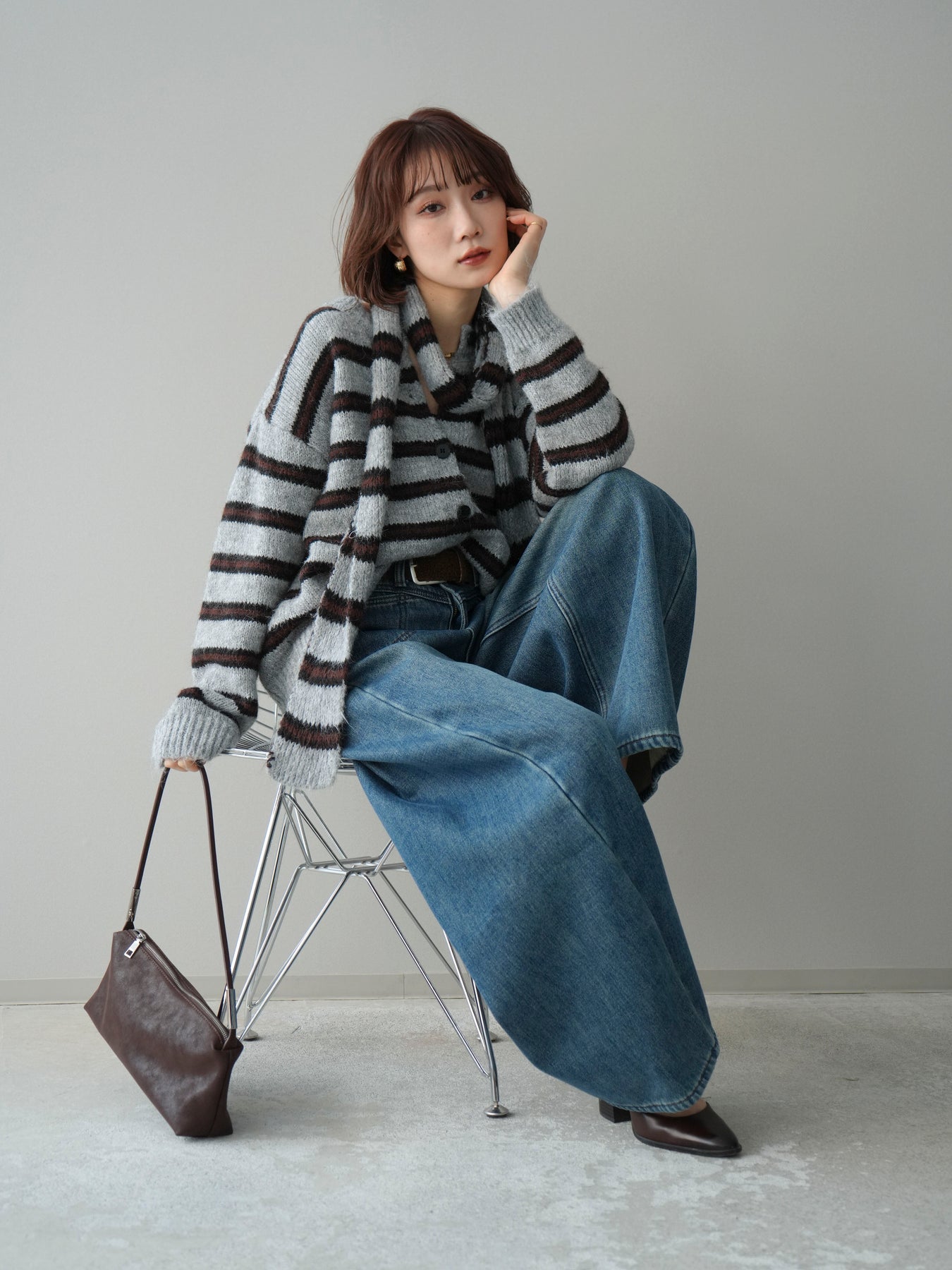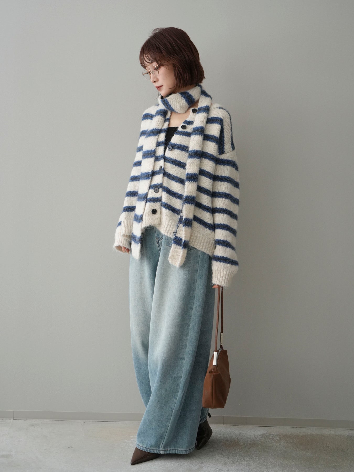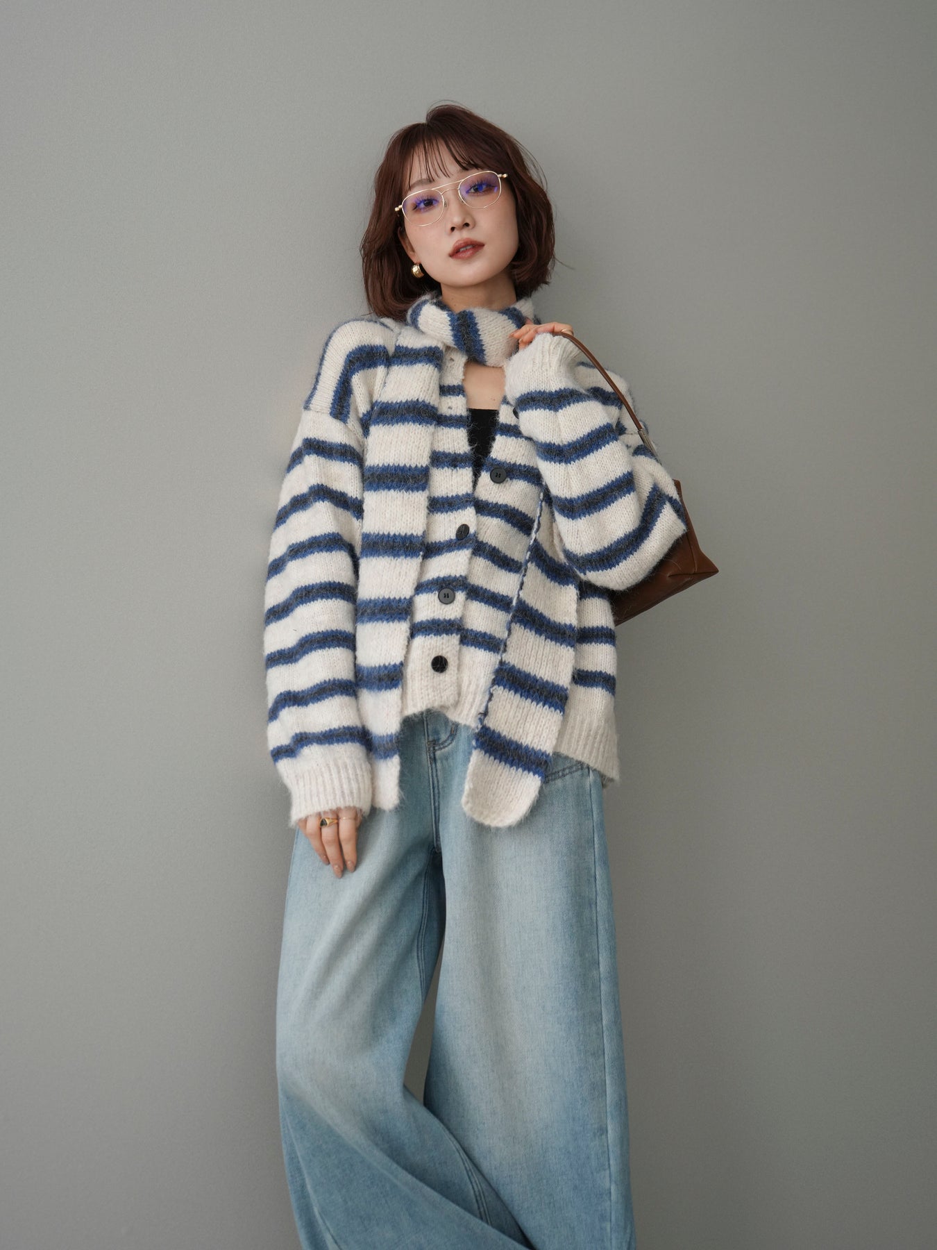 ふんわりとしたシャギーニットにボーダー柄を乗せ、顔まわりを華やかに演出するボウタイ付きのデザインニット。首元はボタンで取り外し可能なタイ付き仕様で、リボン結びや垂らしなど、その日の気分でアレンジが楽しめます。ボリューム感のある袖と短すぎない丈感が絶妙で、パンツにもスカートにも合わせやすいバランスに仕上げました。