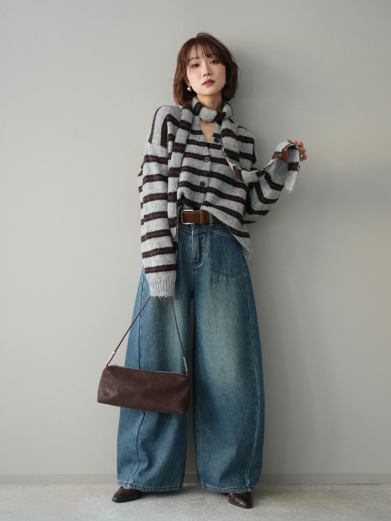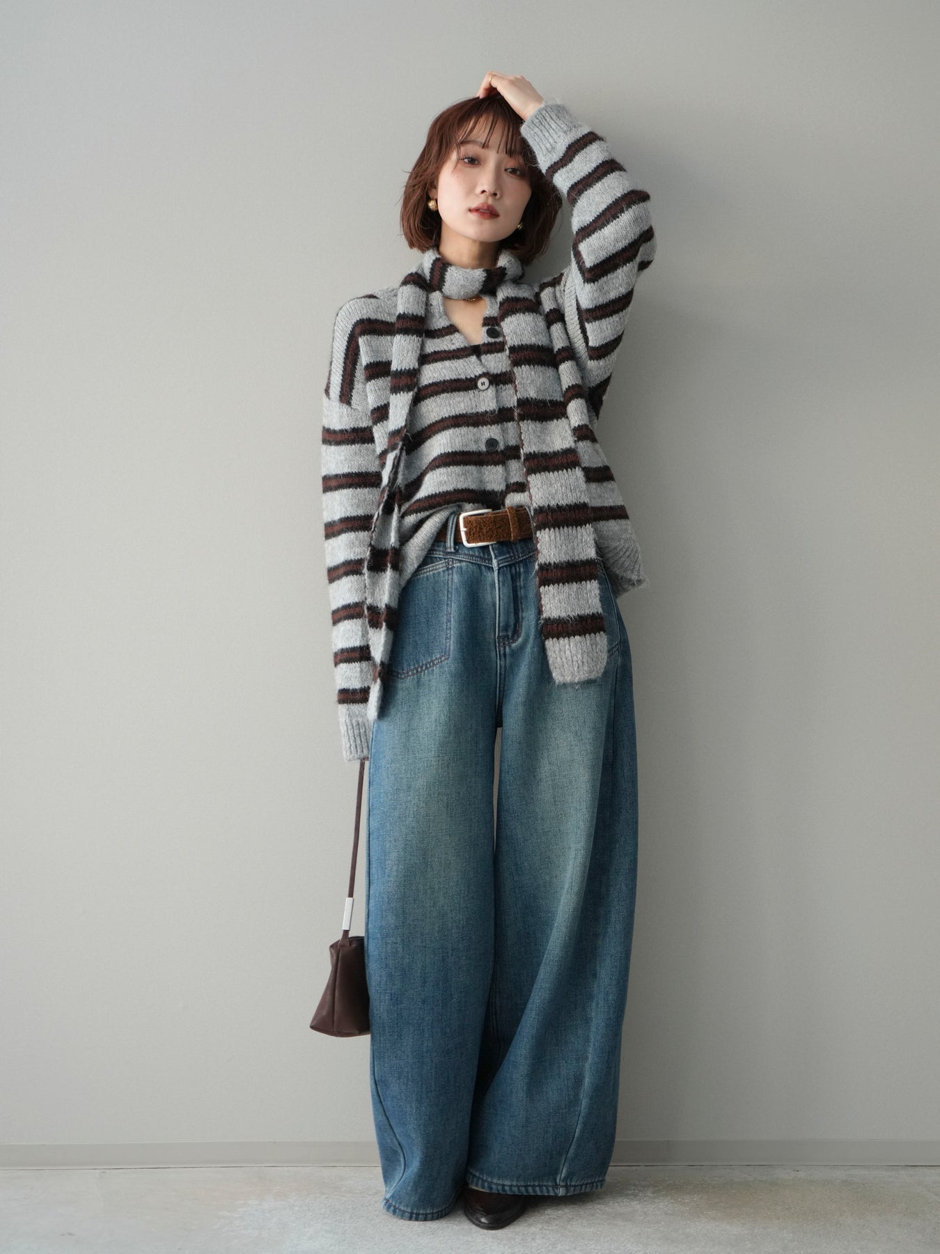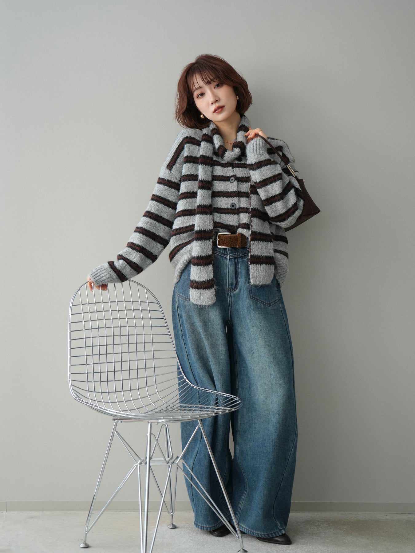 [SET]ボウタイ付きボーダーニットプルオーバー+ベルト付裏起毛カーブデニムパンツ(2set)