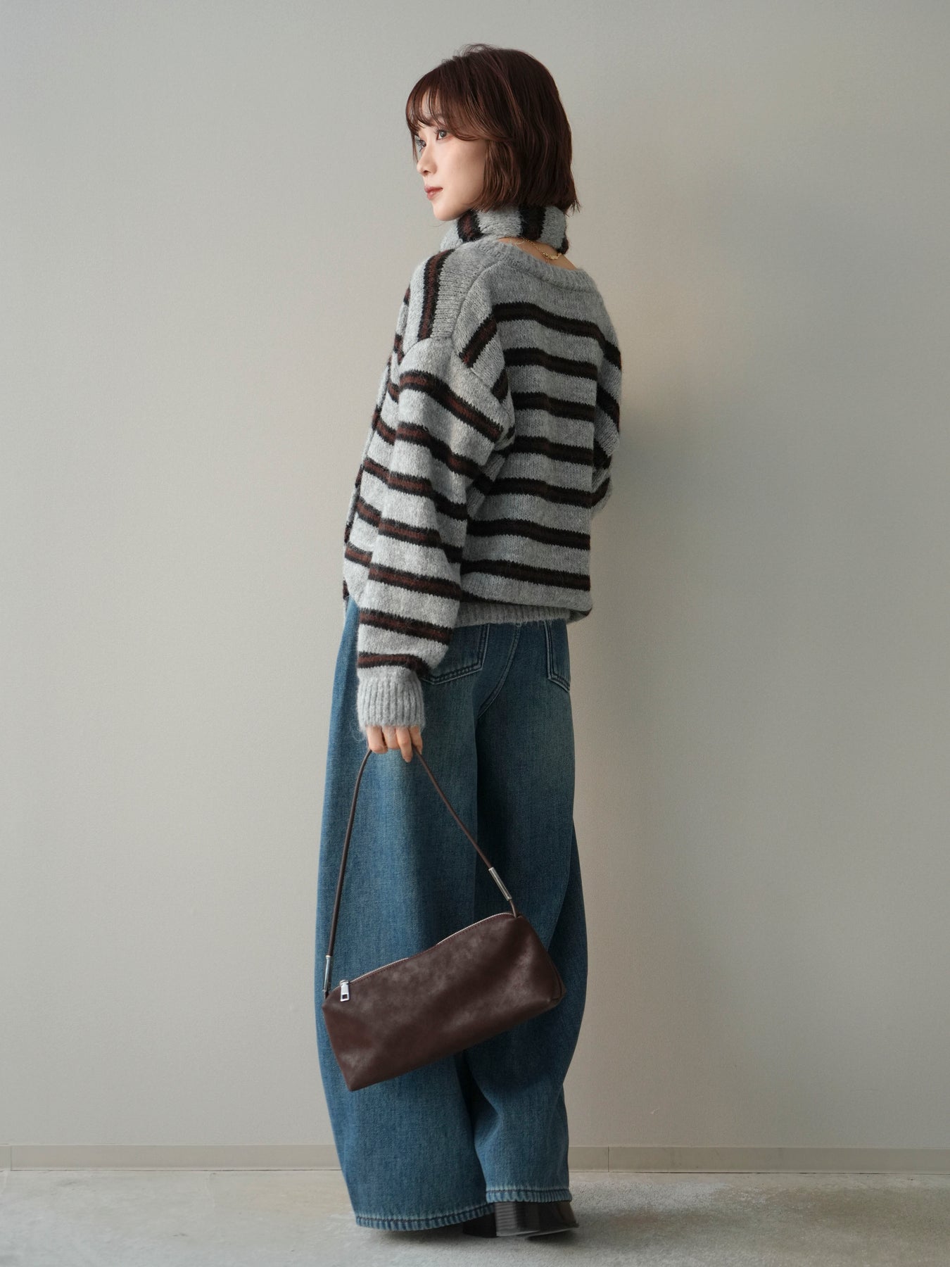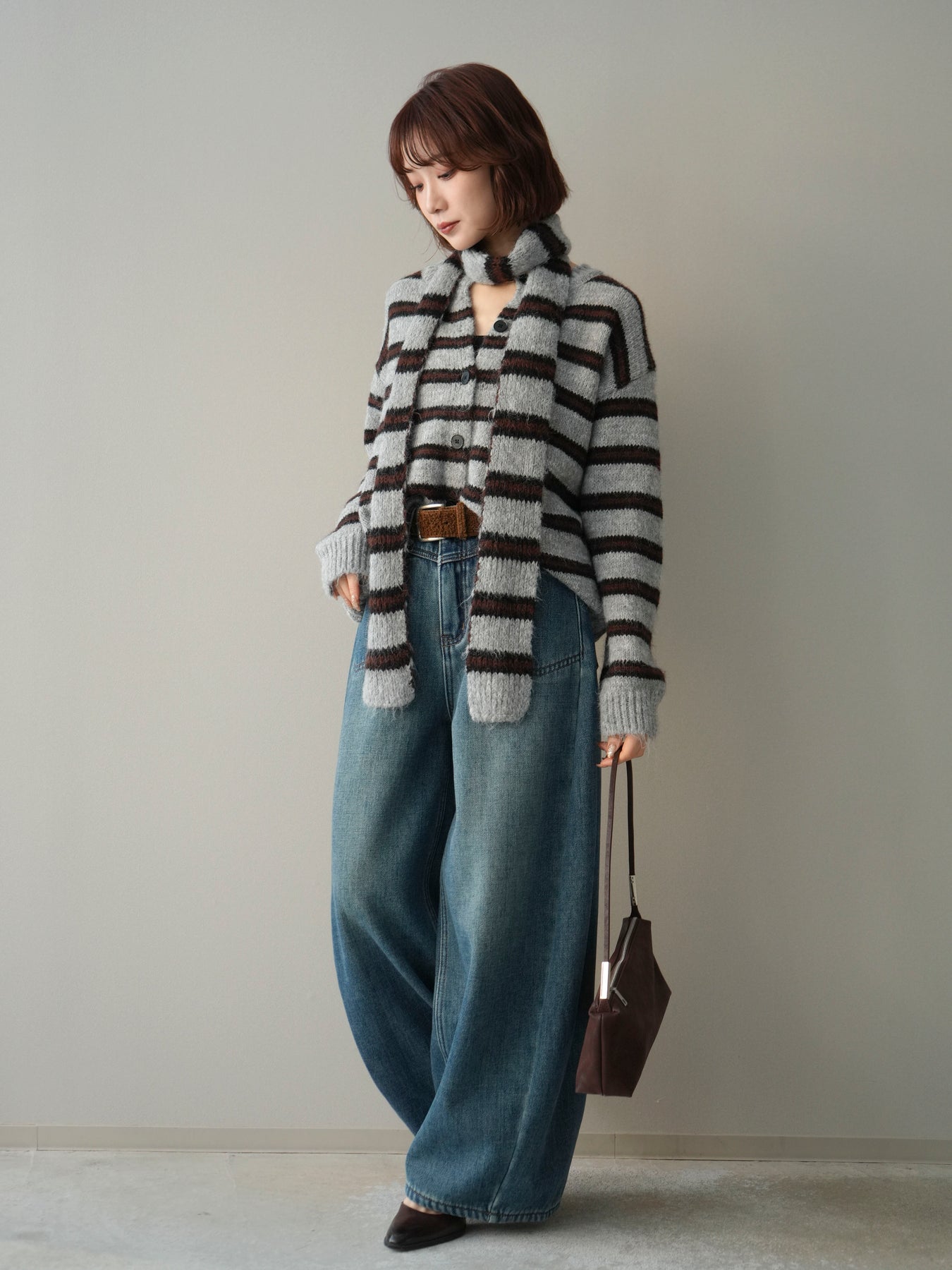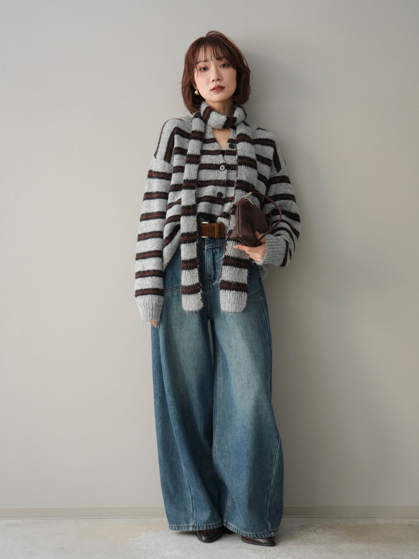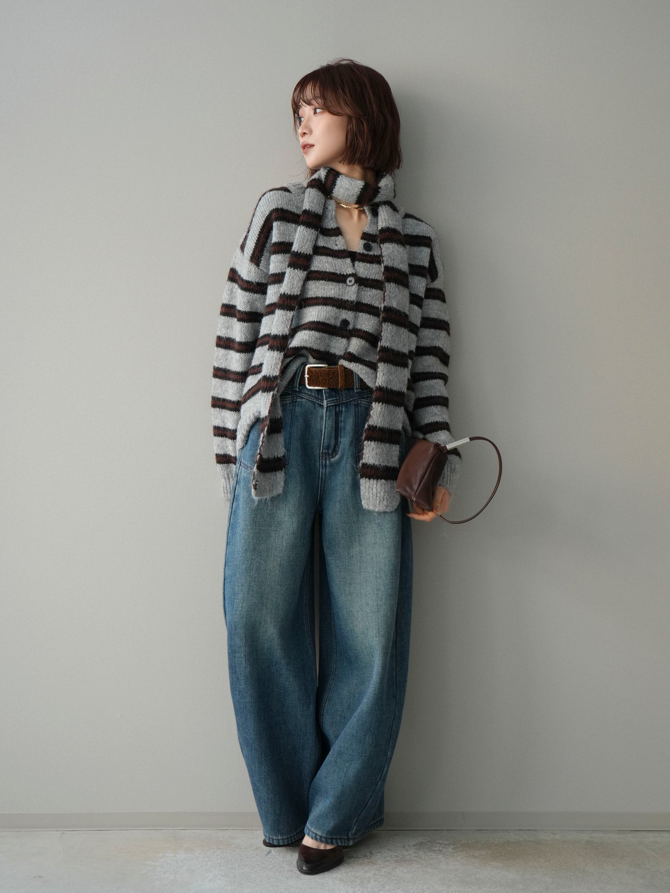 [SET]ボウタイ付きボーダーニットプルオーバー+ベルト付裏起毛カーブデニムパンツ(2set)