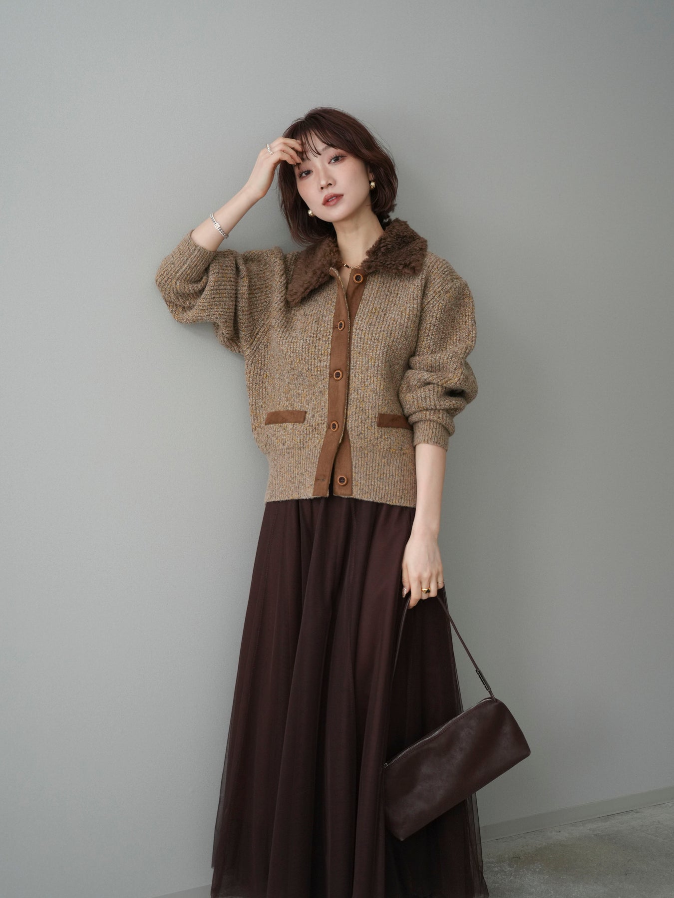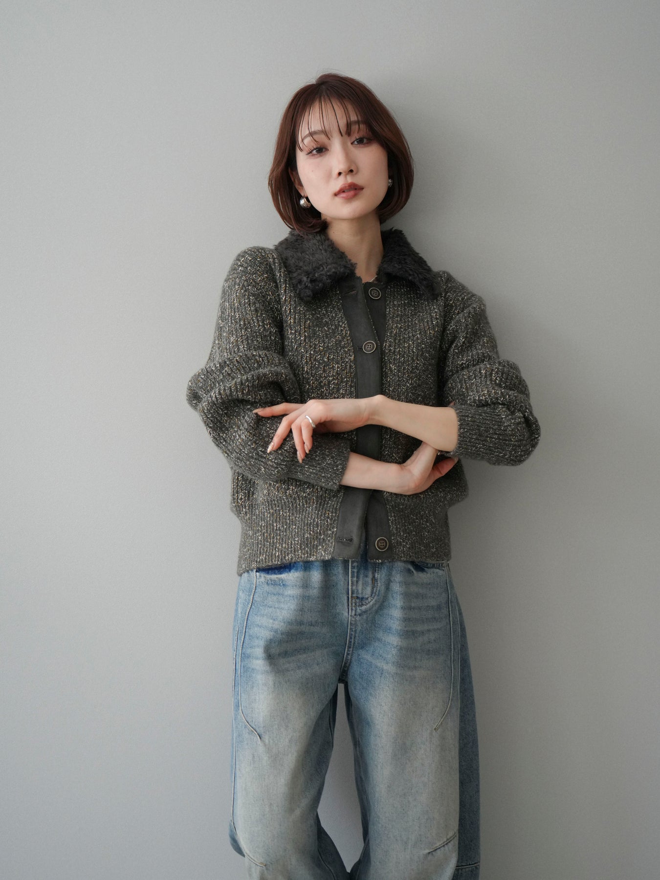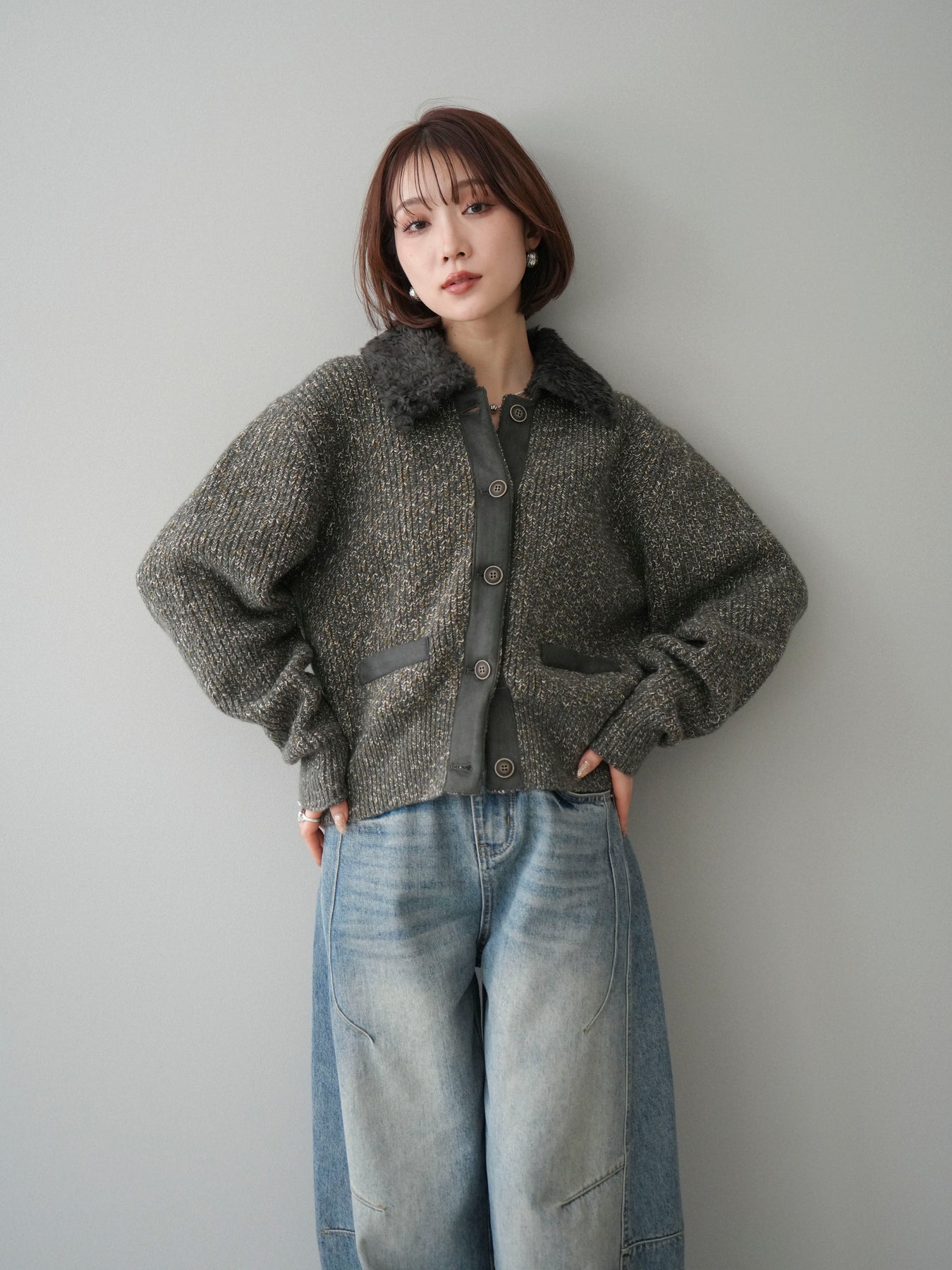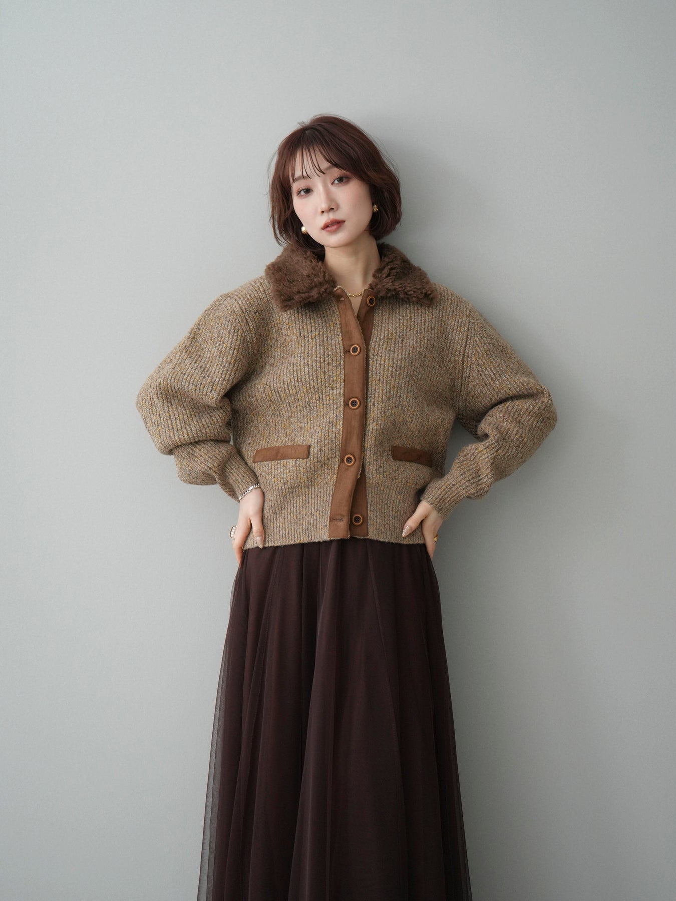 ◆ [予約]襟ボアミックスヤーンニットカーディガン