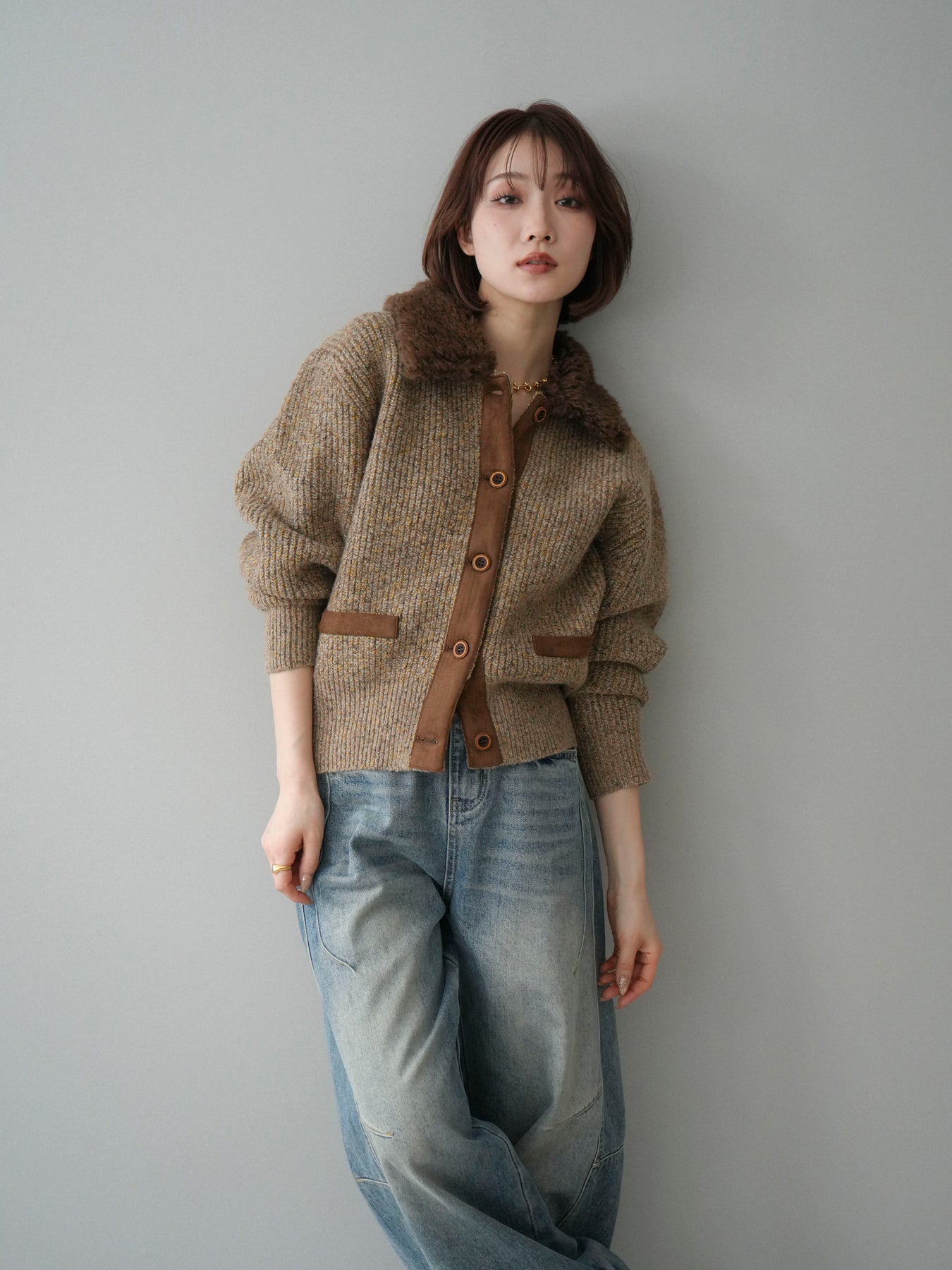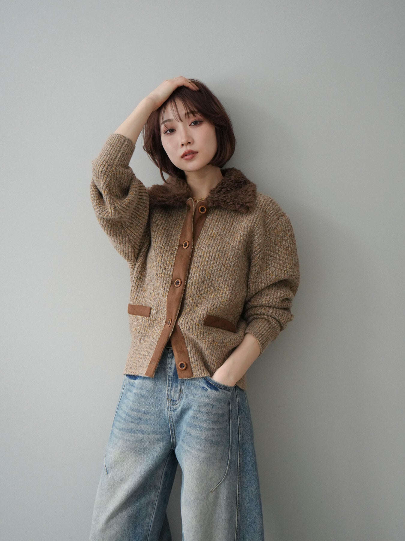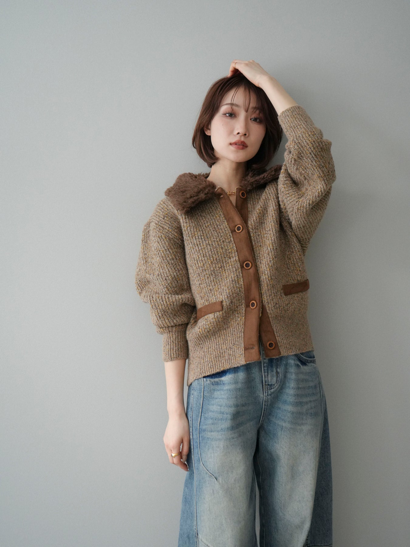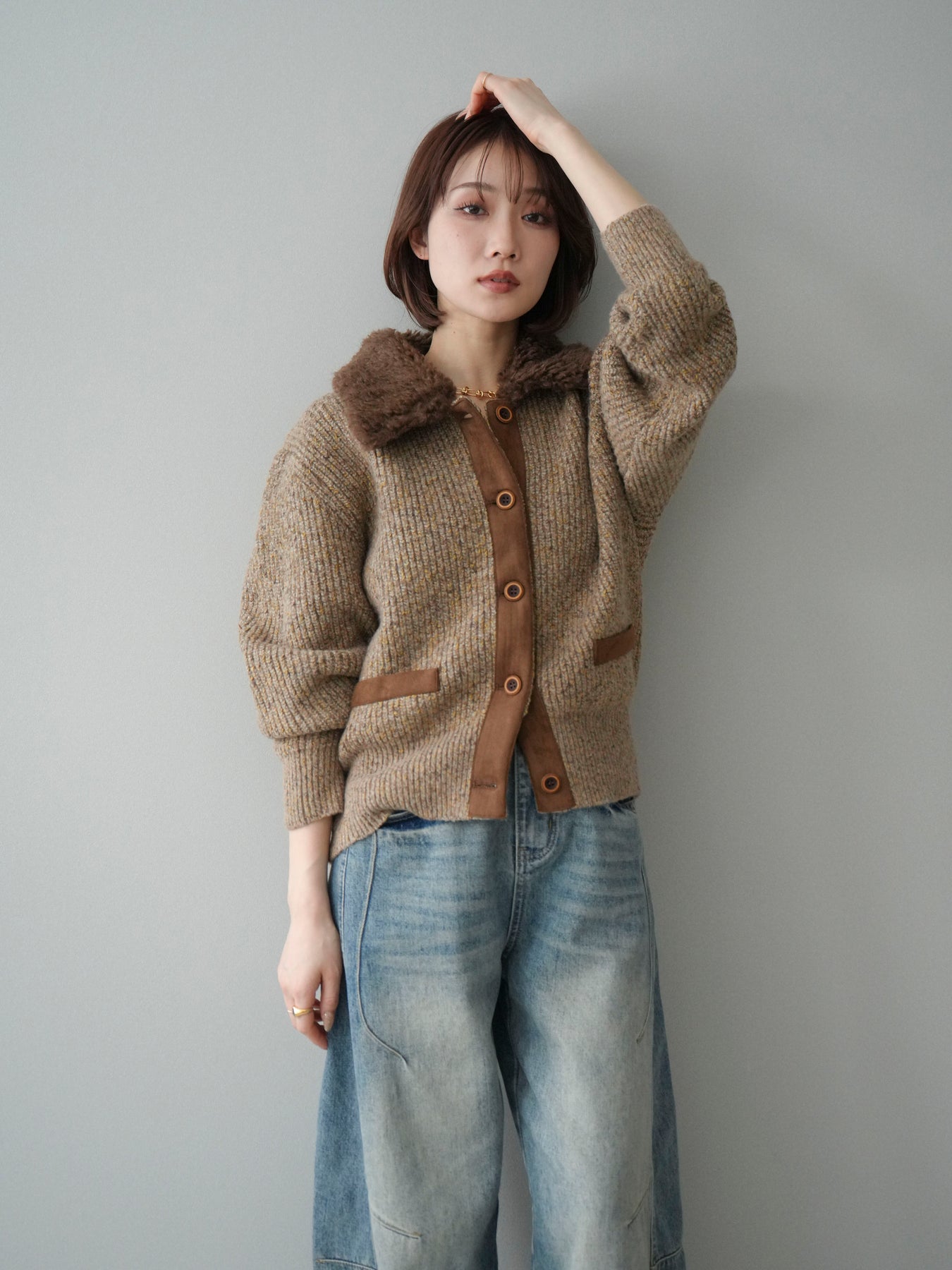 ◆ [予約]襟ボアミックスヤーンニットカーディガン