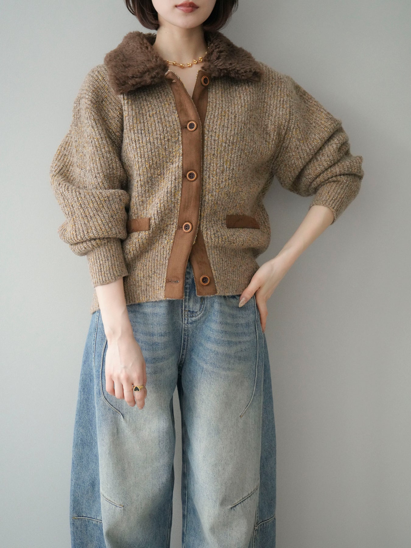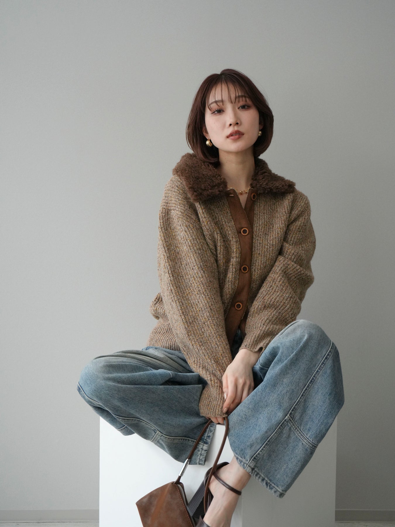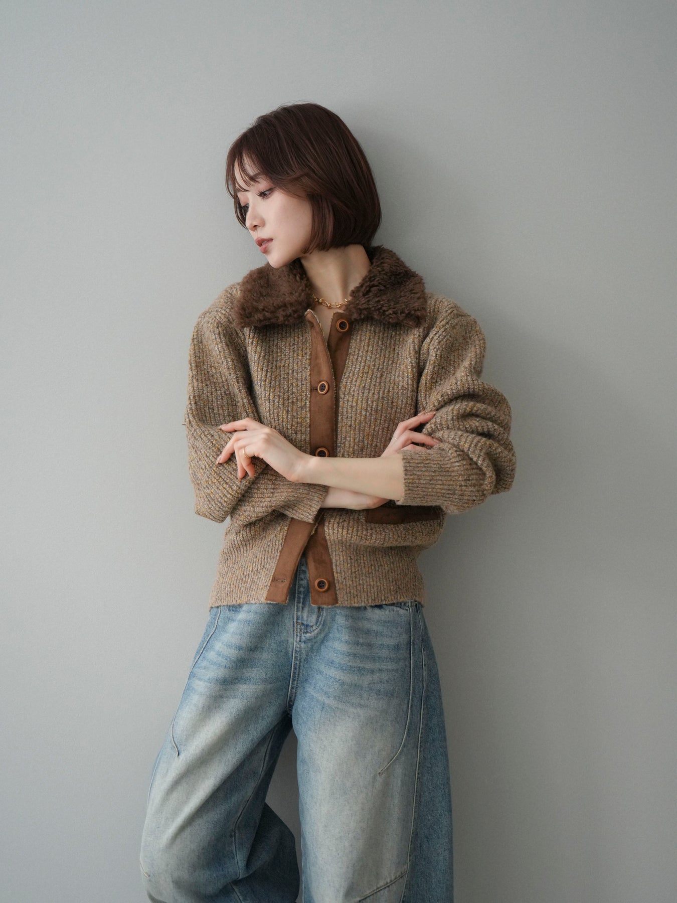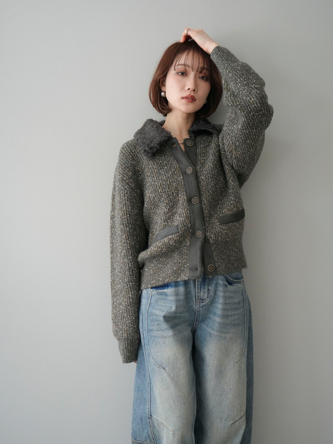 ◆ [予約]襟ボアミックスヤーンニットカーディガン