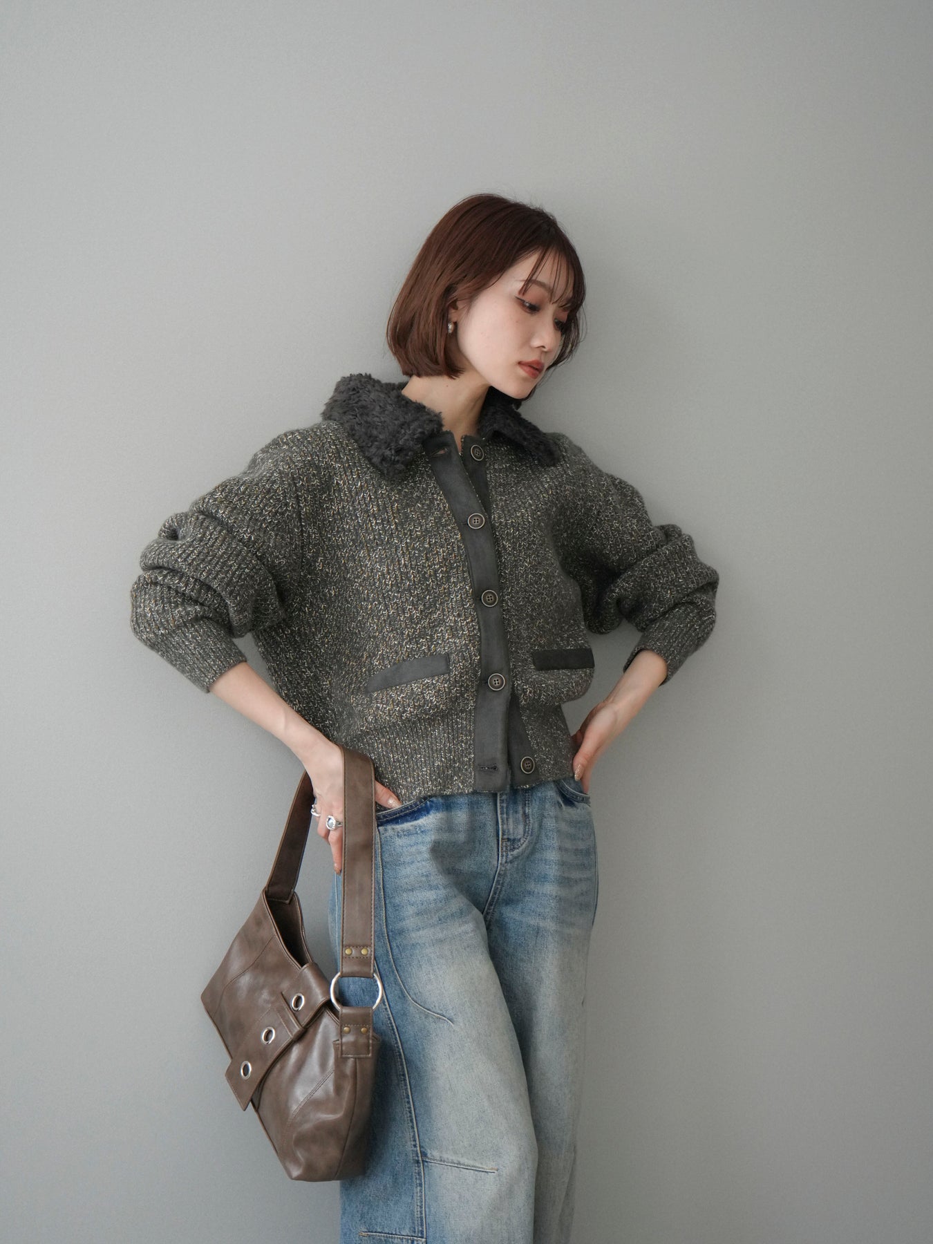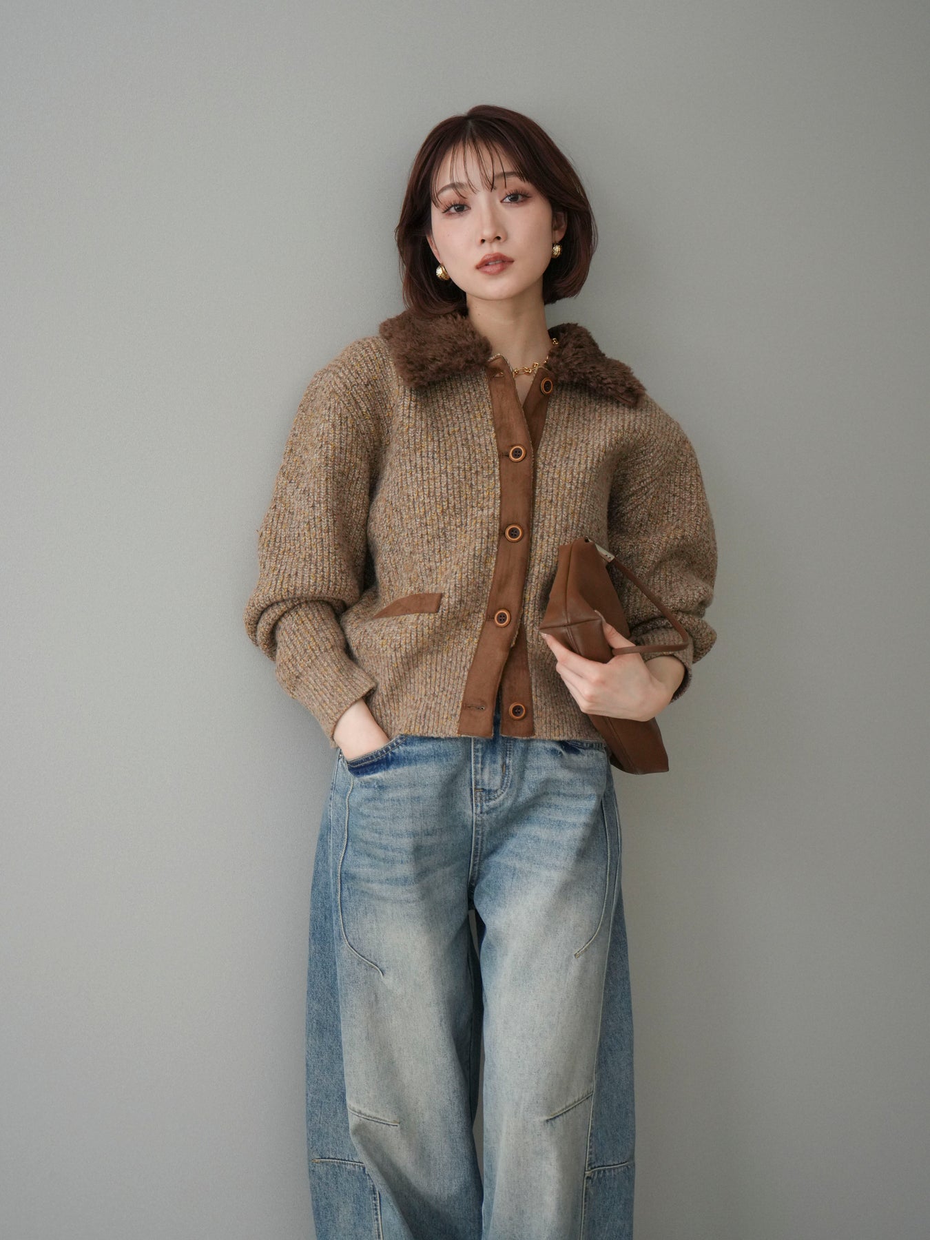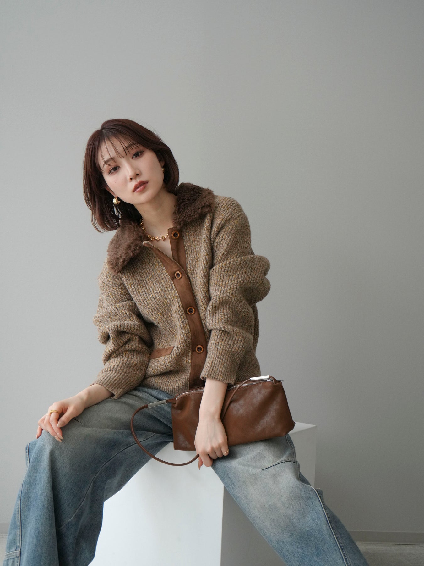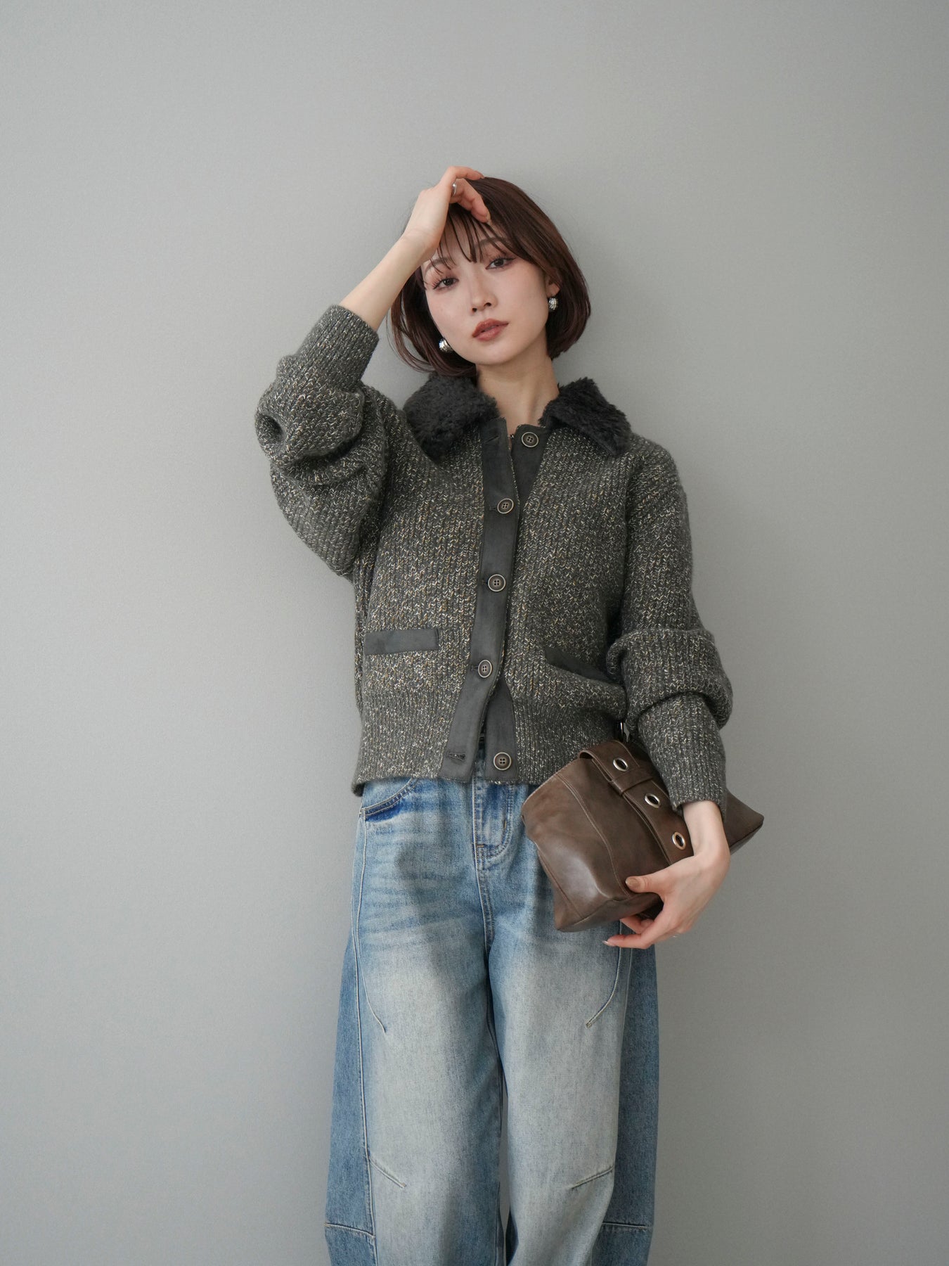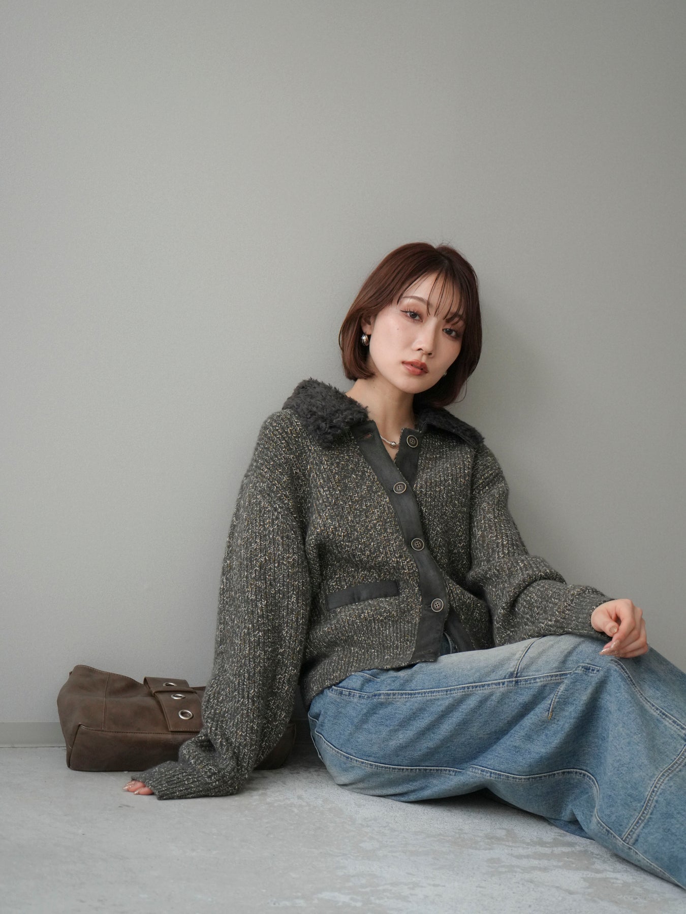 ◆ [予約]襟ボアミックスヤーンニットカーディガン
