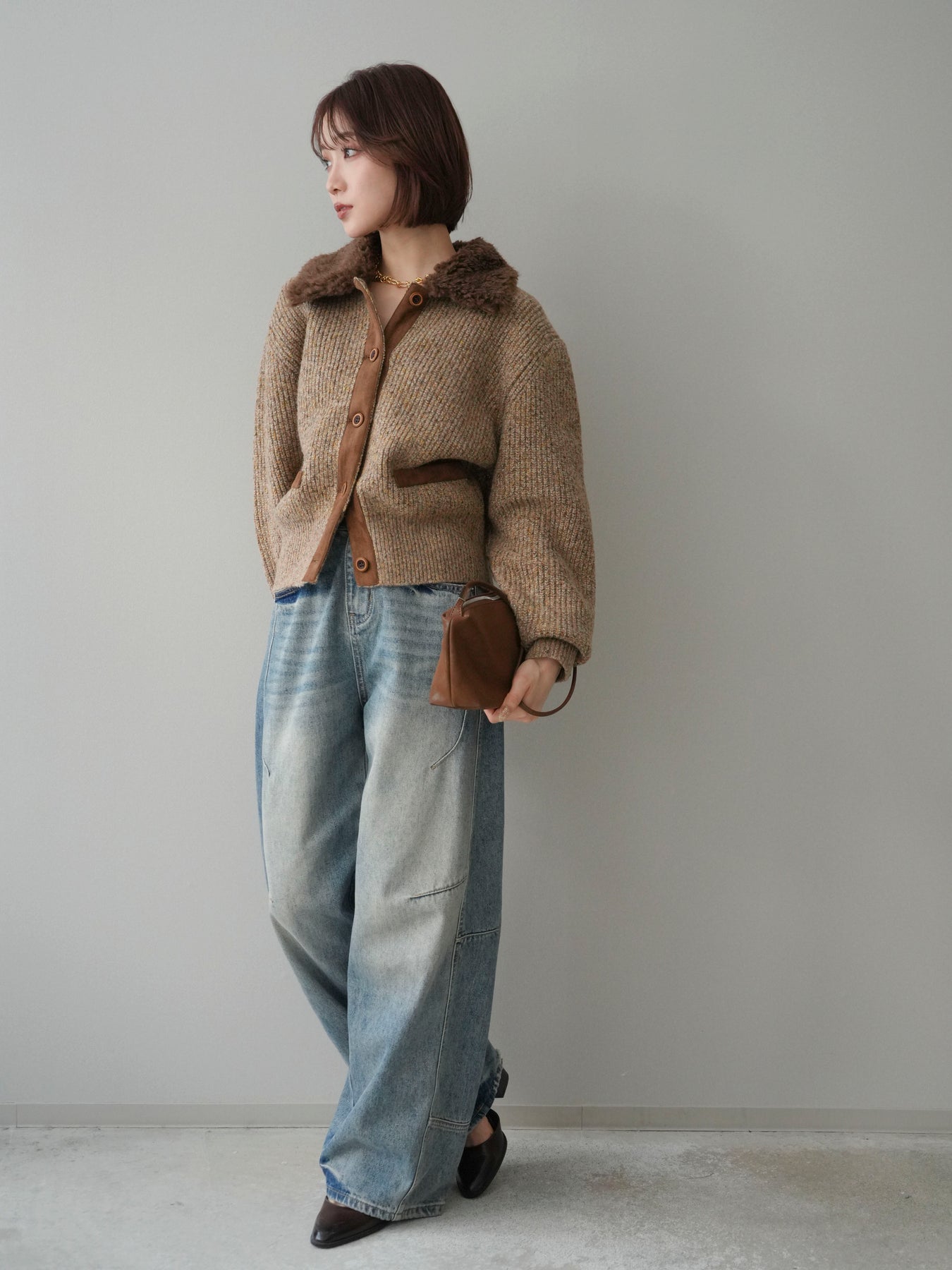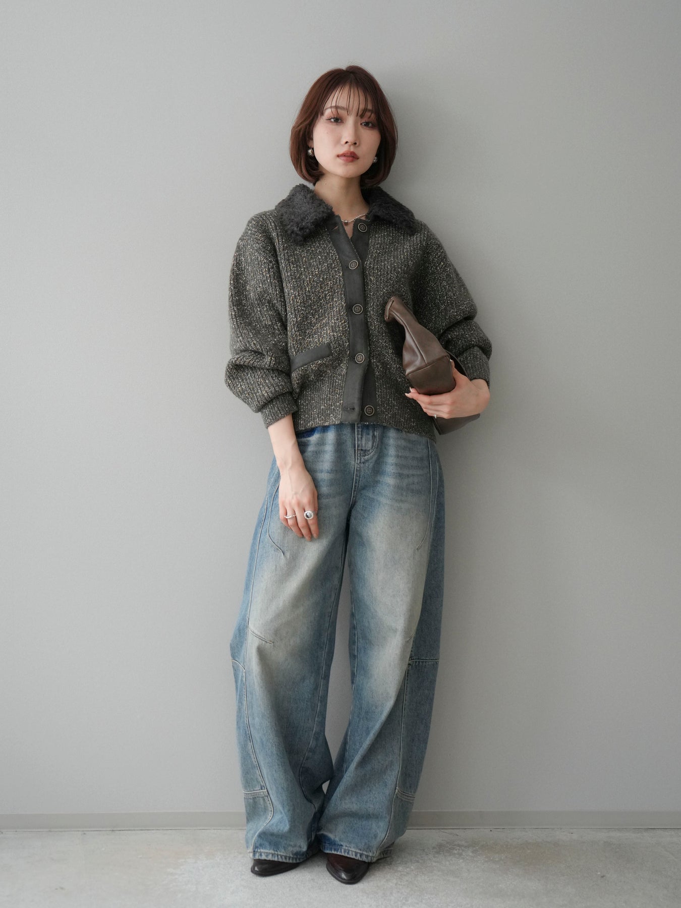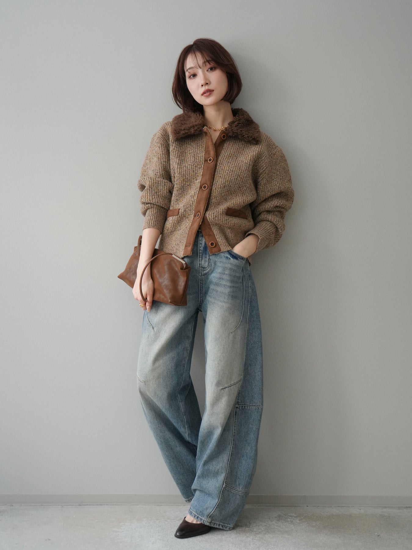 [SET]襟ボアミックスヤーンニットカーディガン+ベルト付カーブデニムパンツ(2set)