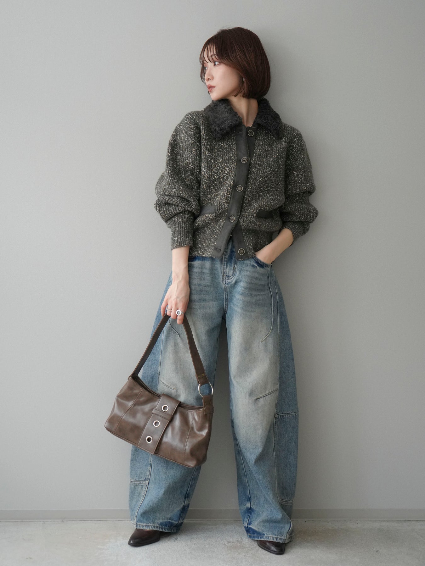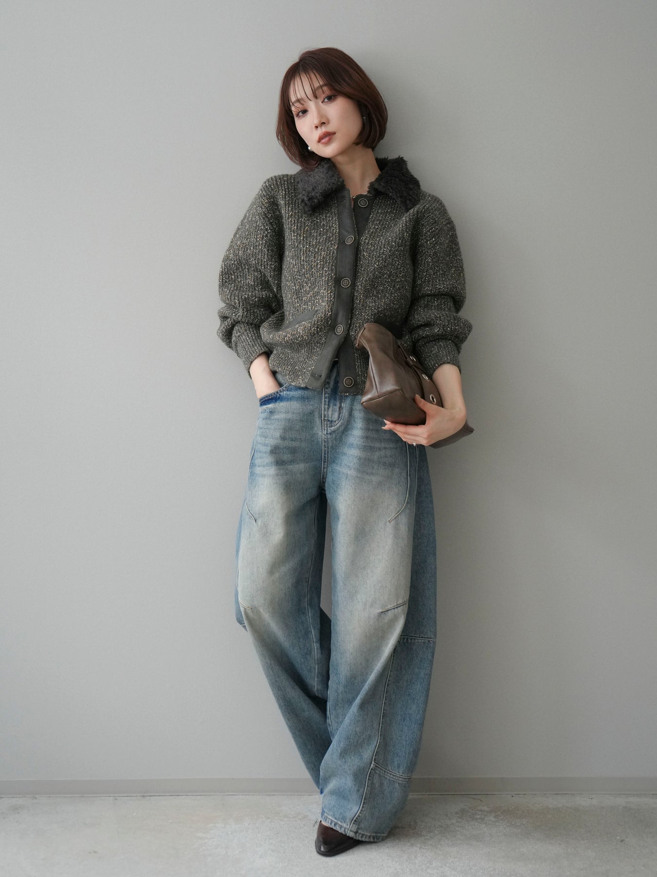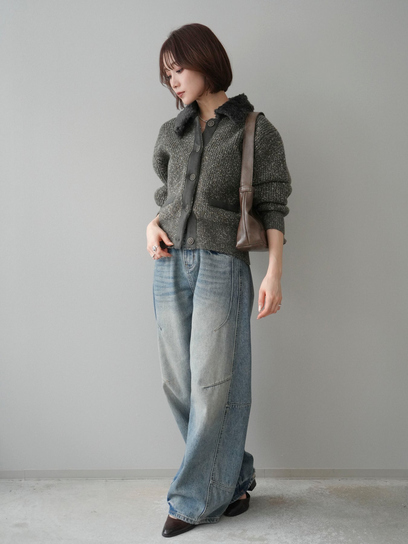 [SET]襟ボアミックスヤーンニットカーディガン+ベルト付カーブデニムパンツ(2set)
