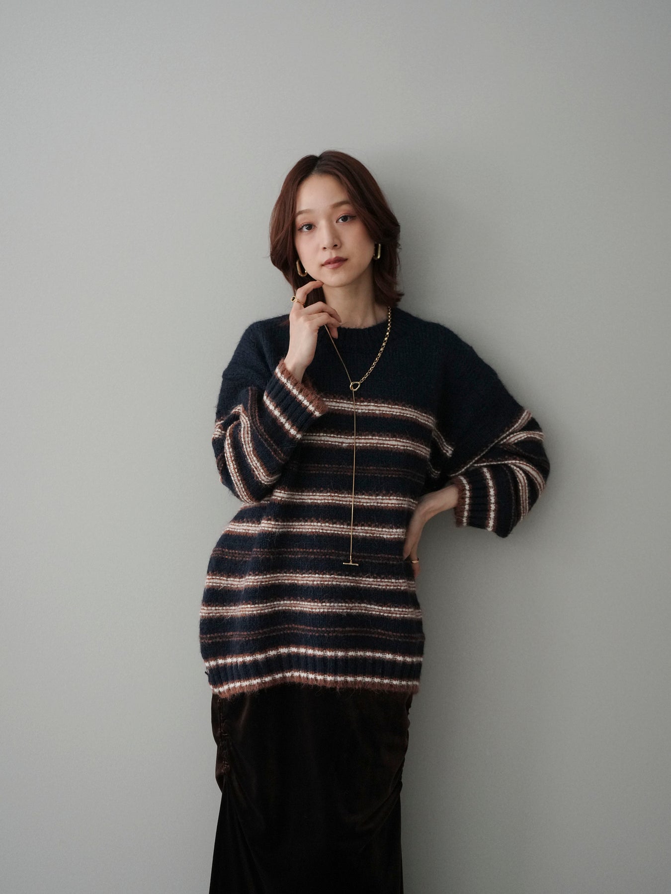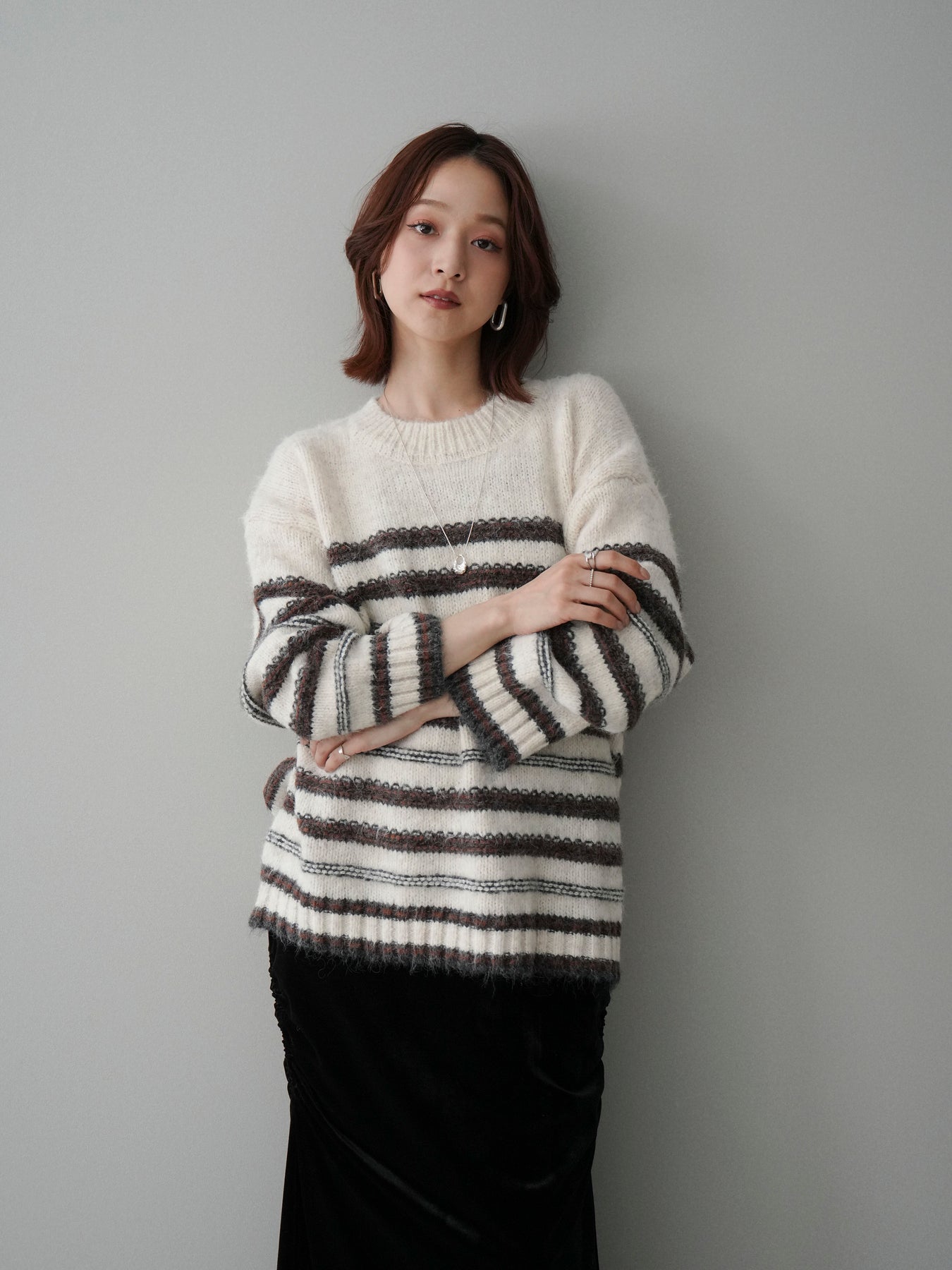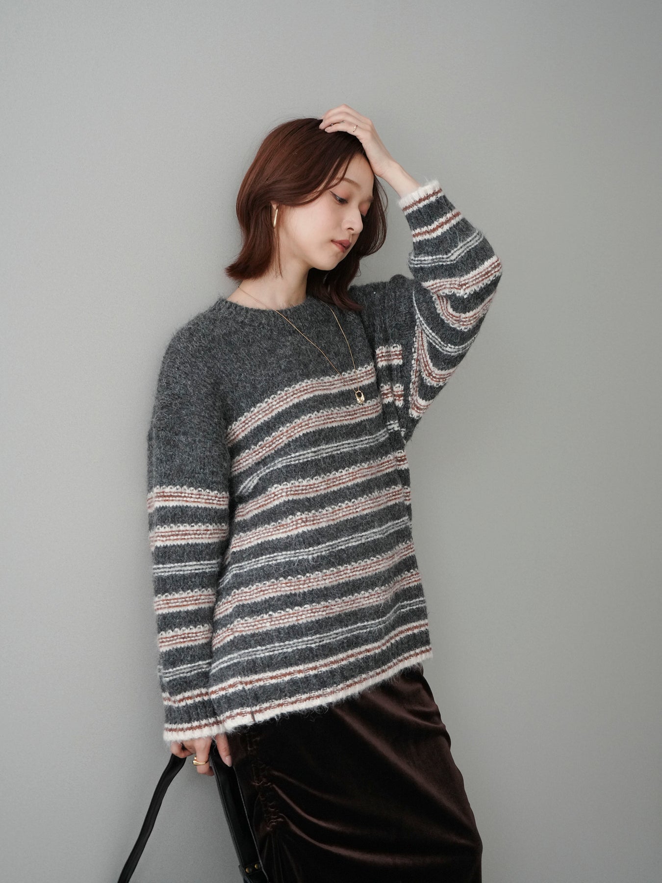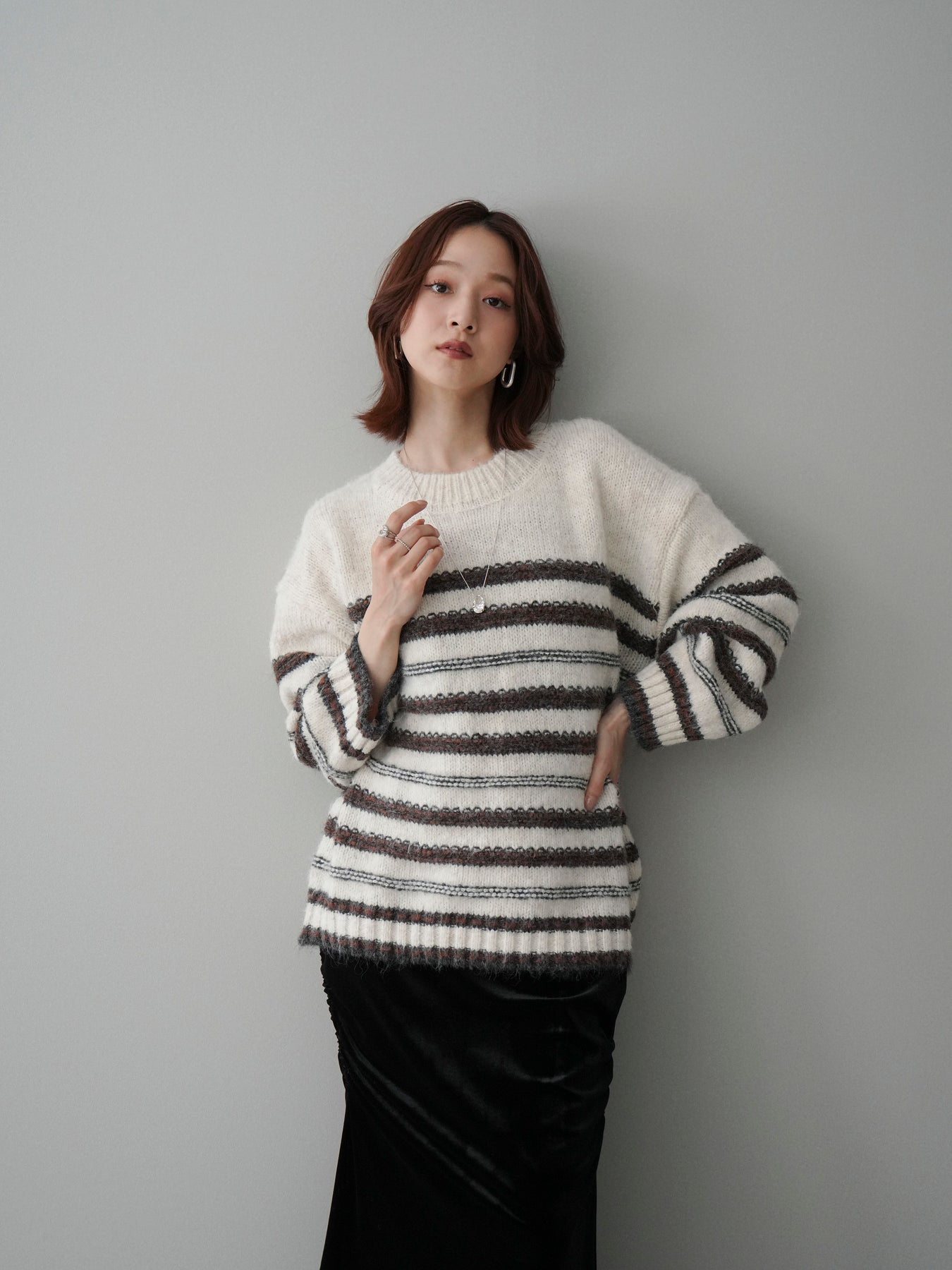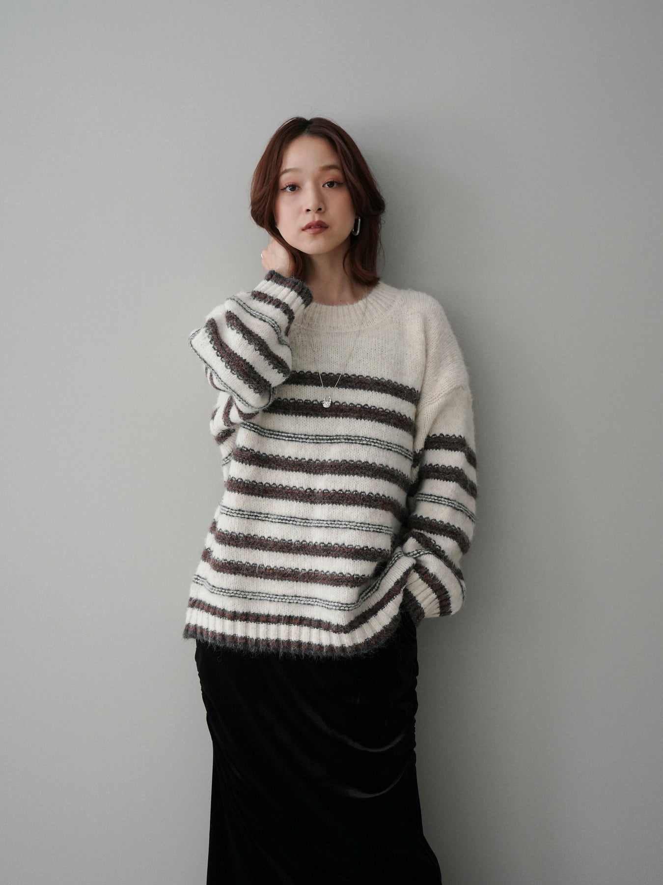 ゆるやかに抜け感を演出するボーダーニット。 シャギー感のある優しい風合いと、ステッチのようなボーダー柄が印象的な1枚。落ち感のあるルーズなシルエットが、カジュアルながらもこなれた雰囲気をプラス。デニムやスラックスはもちろん、スカートとの合わせも◎。1枚で着映えする主役級ニットです。