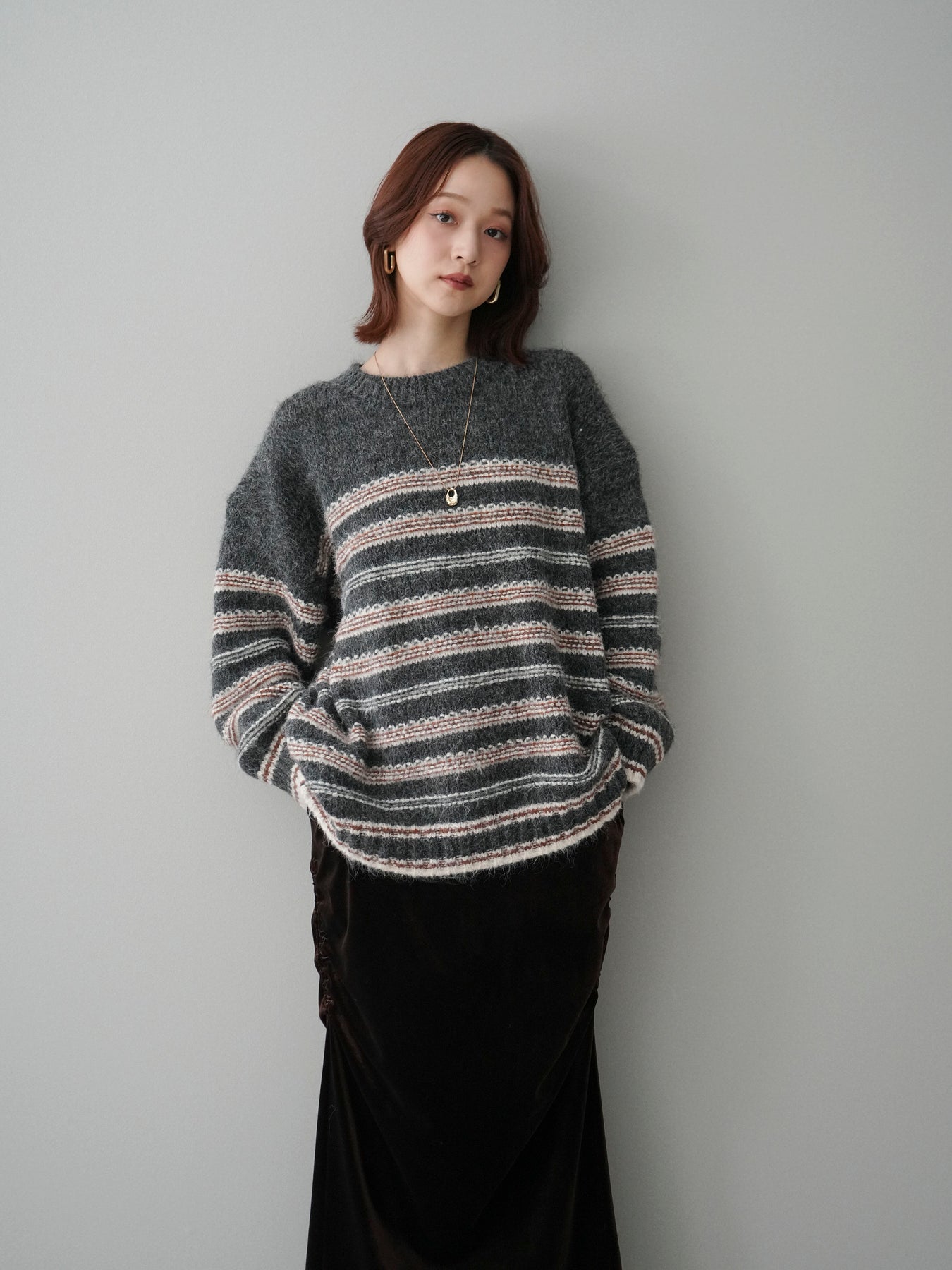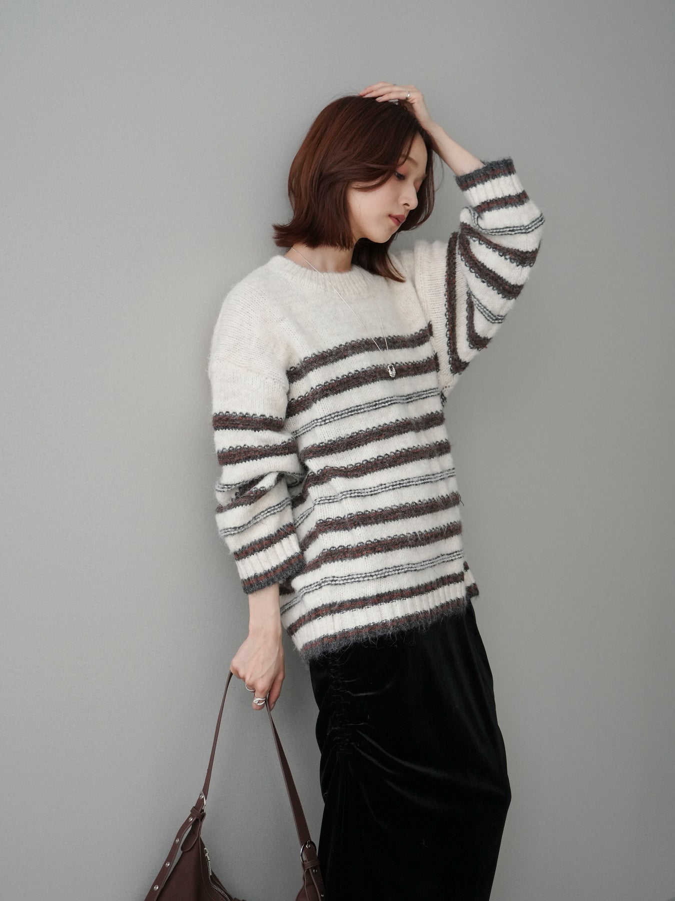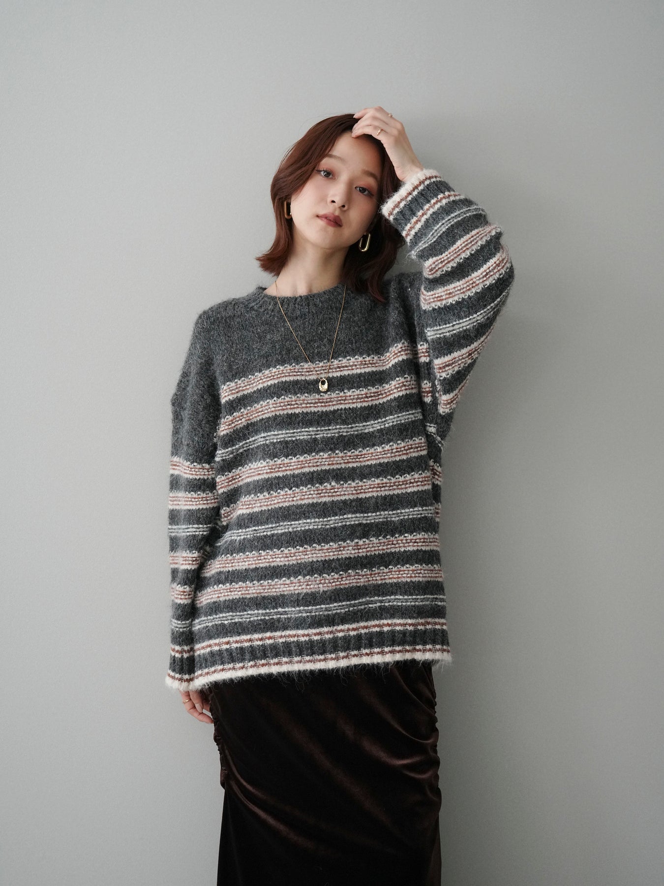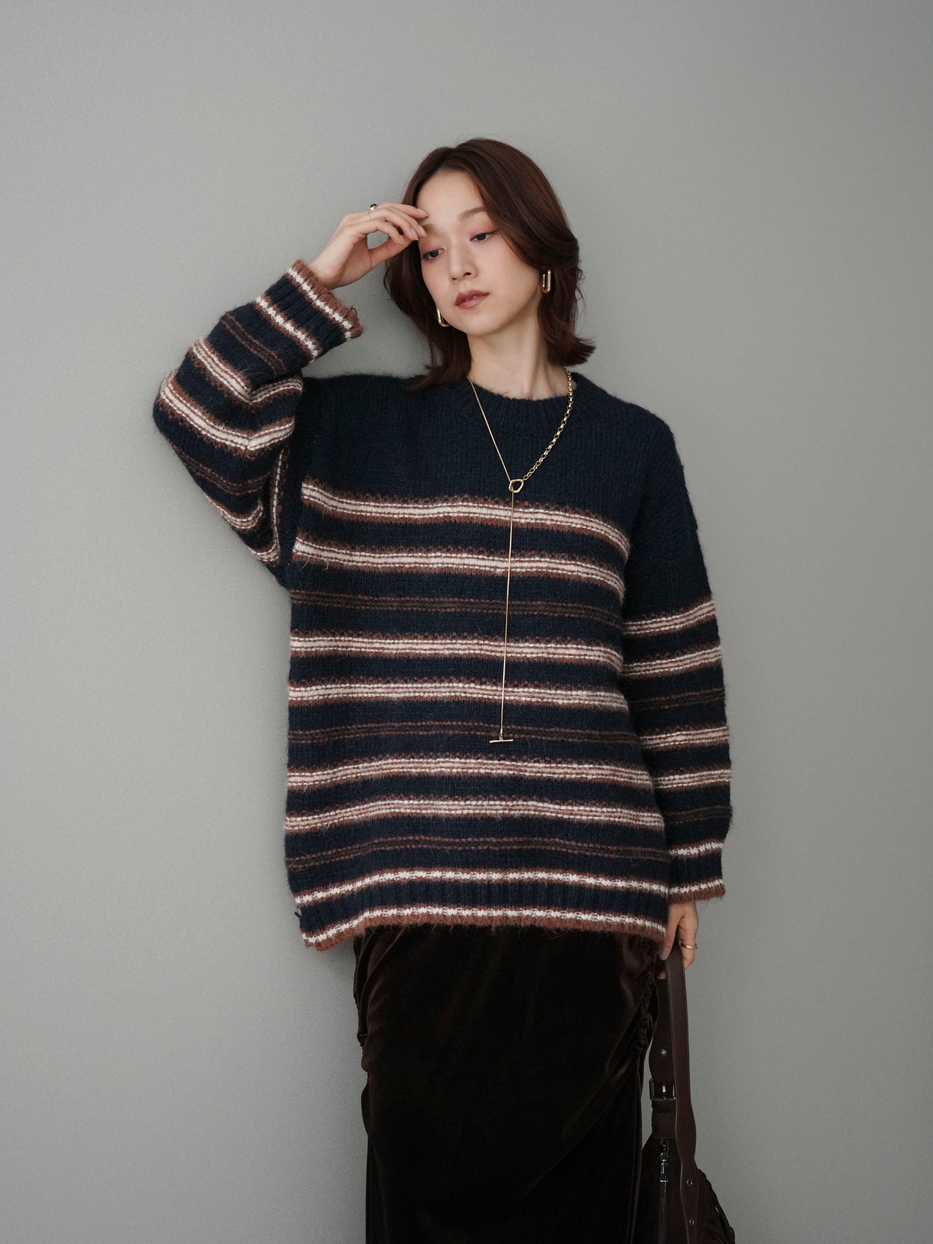 ゆるやかに抜け感を演出するボーダーニット。 シャギー感のある優しい風合いと、ステッチのようなボーダー柄が印象的な1枚。落ち感のあるルーズなシルエットが、カジュアルながらもこなれた雰囲気をプラス。デニムやスラックスはもちろん、スカートとの合わせも◎。1枚で着映えする主役級ニットです。