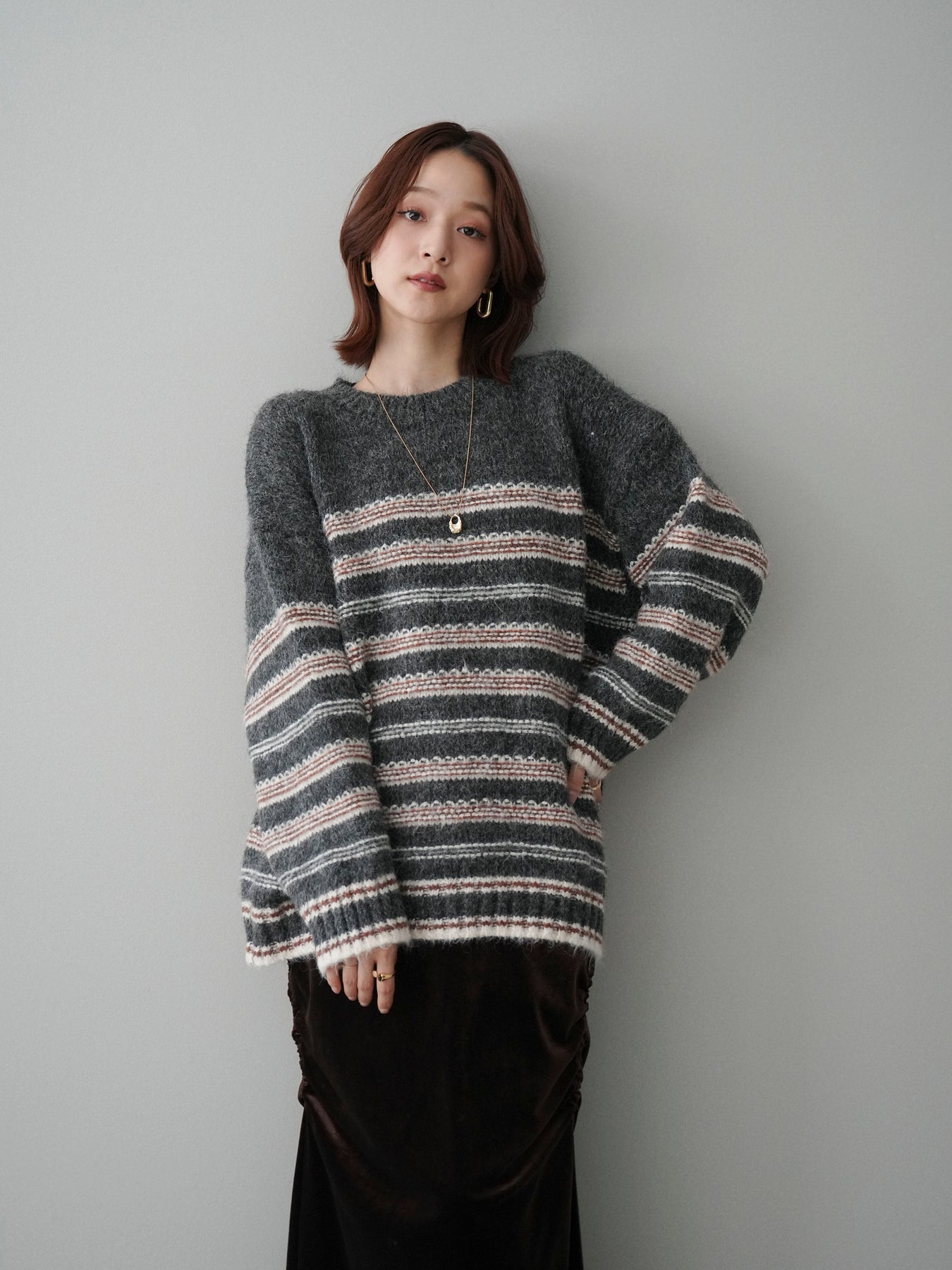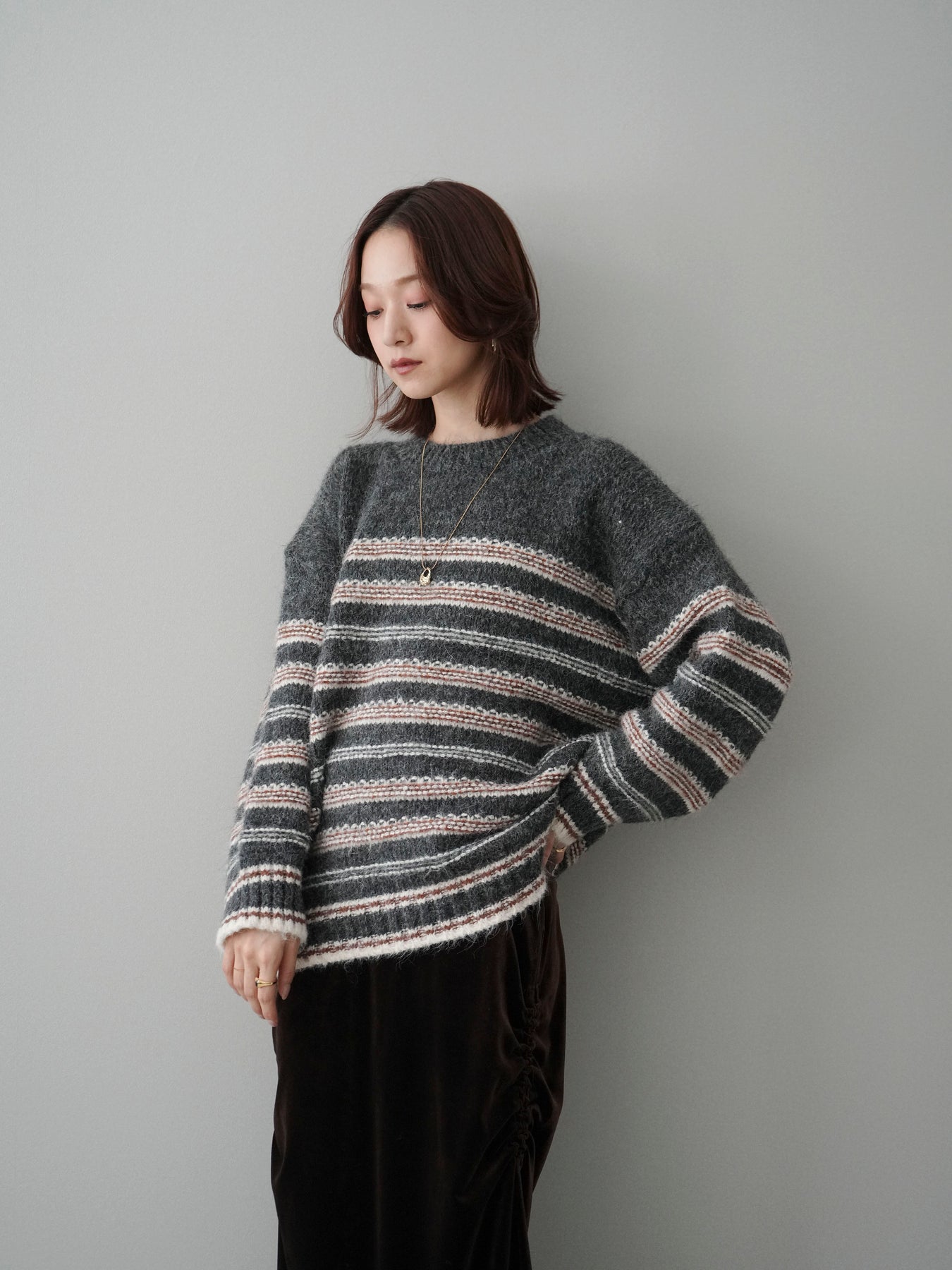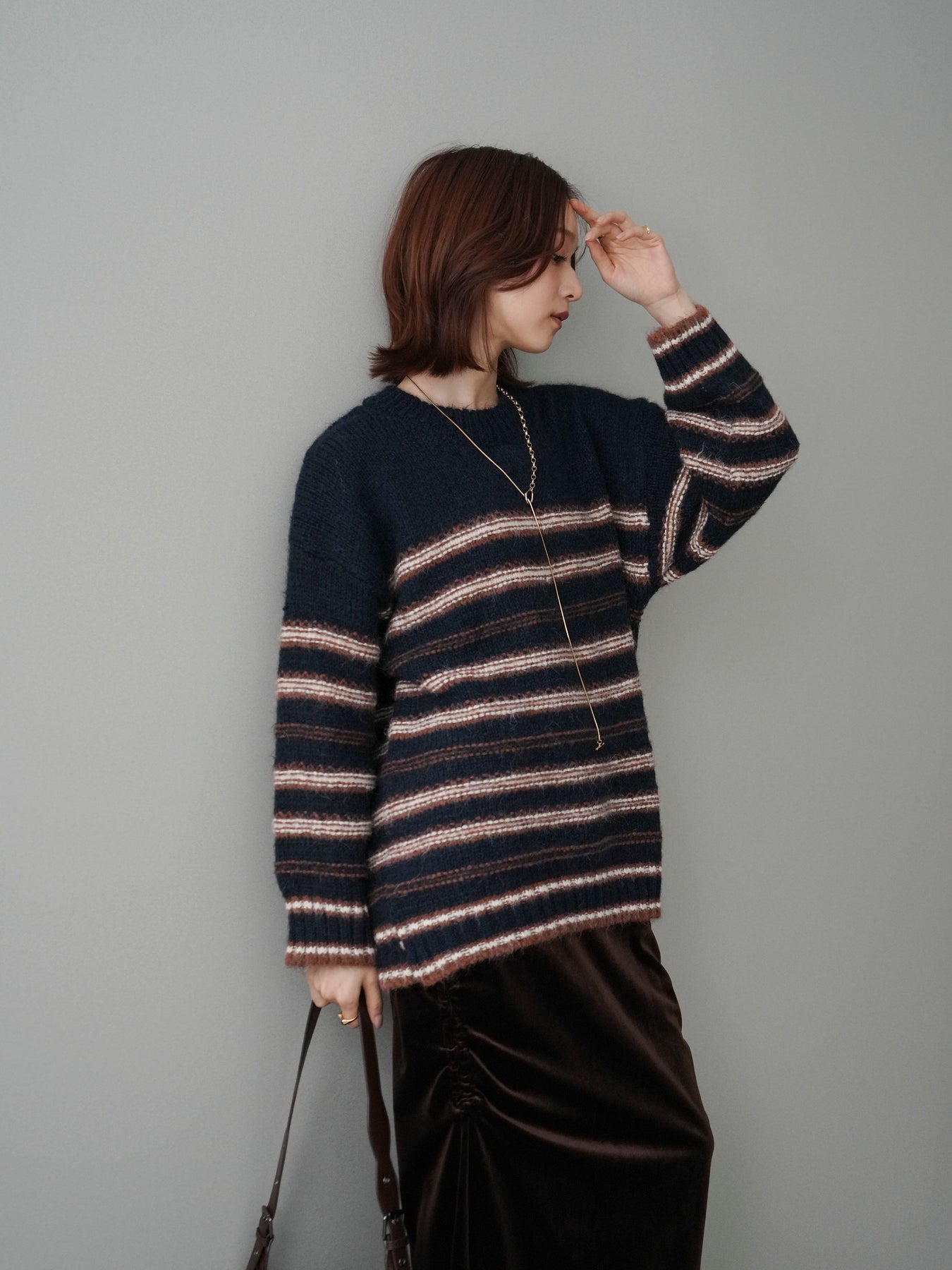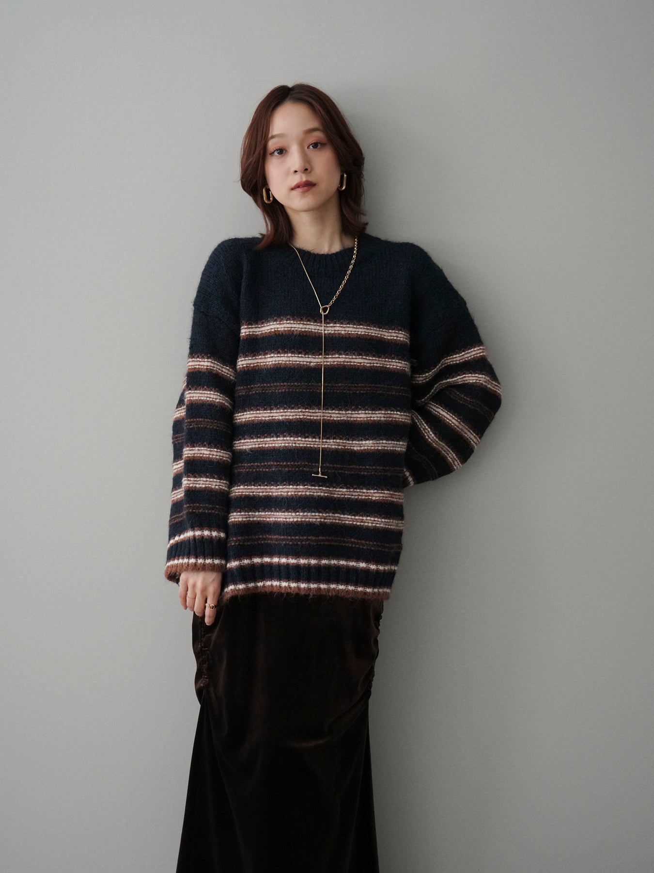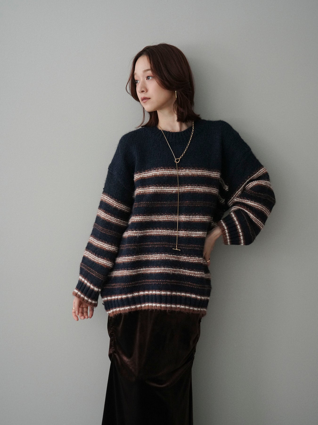 ゆるやかに抜け感を演出するボーダーニット。 シャギー感のある優しい風合いと、ステッチのようなボーダー柄が印象的な1枚。落ち感のあるルーズなシルエットが、カジュアルながらもこなれた雰囲気をプラス。デニムやスラックスはもちろん、スカートとの合わせも◎。1枚で着映えする主役級ニットです。