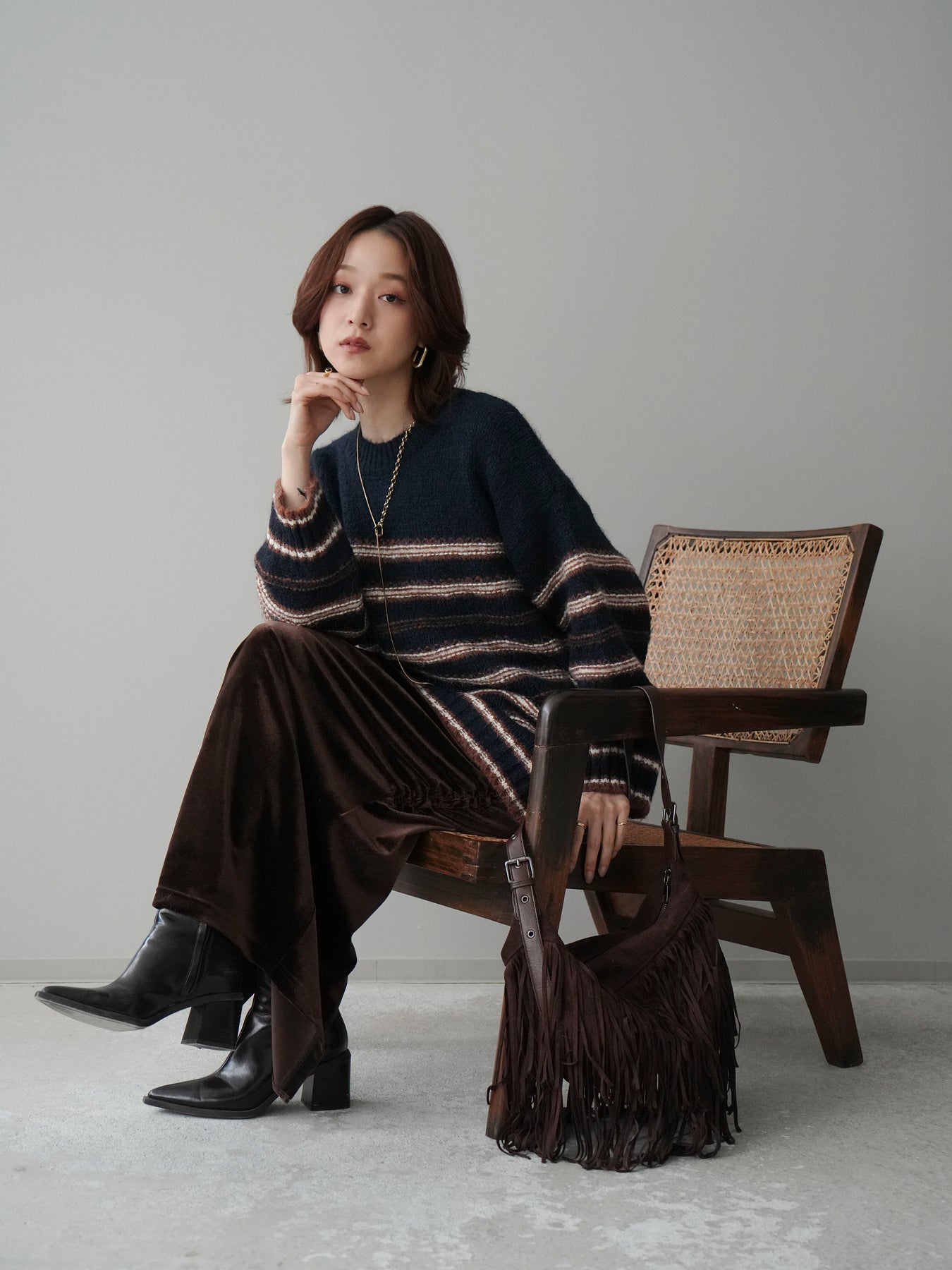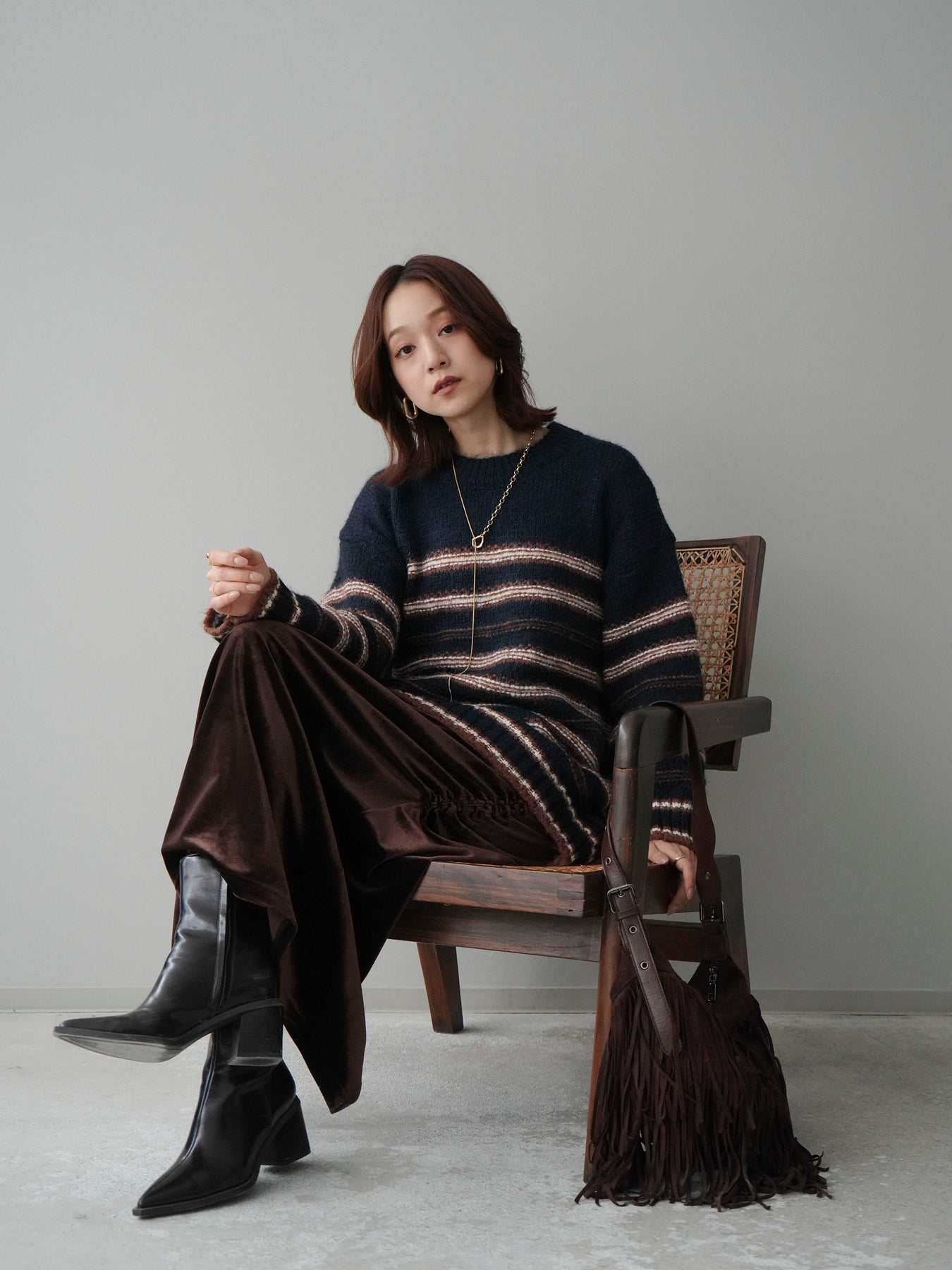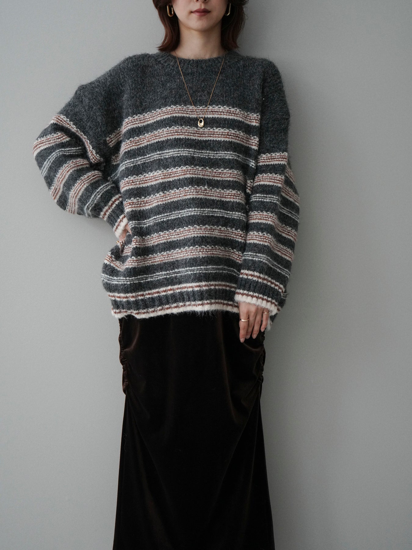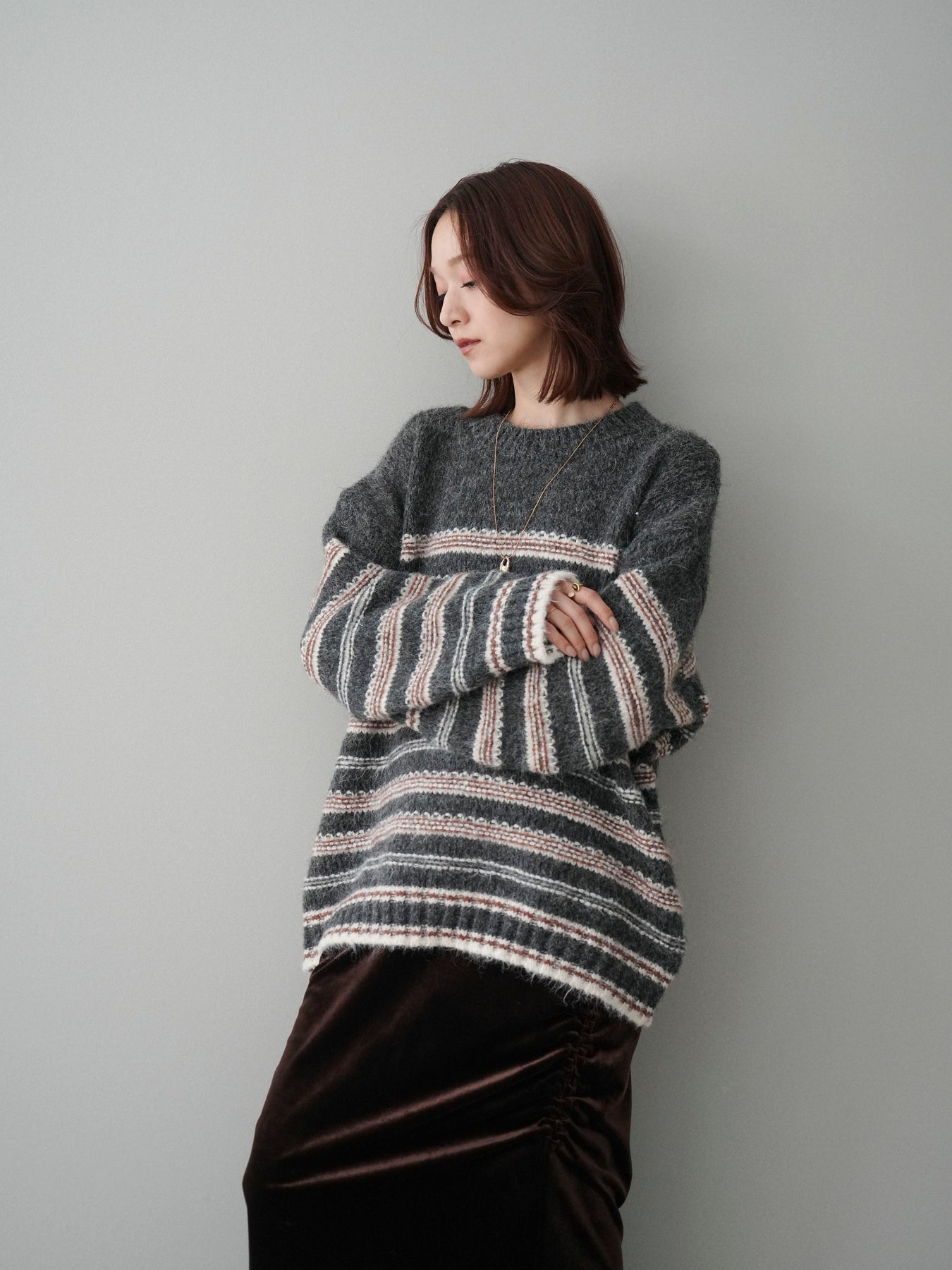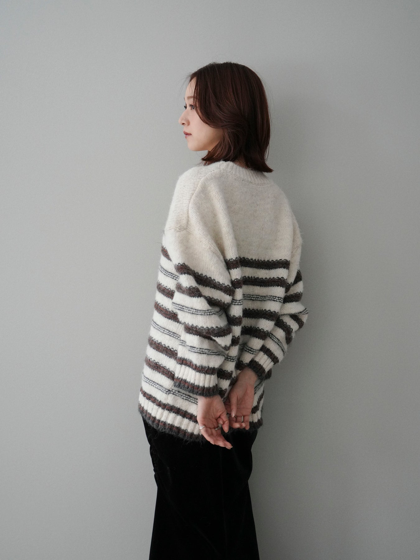 ゆるやかに抜け感を演出するボーダーニット。 シャギー感のある優しい風合いと、ステッチのようなボーダー柄が印象的な1枚。落ち感のあるルーズなシルエットが、カジュアルながらもこなれた雰囲気をプラス。デニムやスラックスはもちろん、スカートとの合わせも◎。1枚で着映えする主役級ニットです。