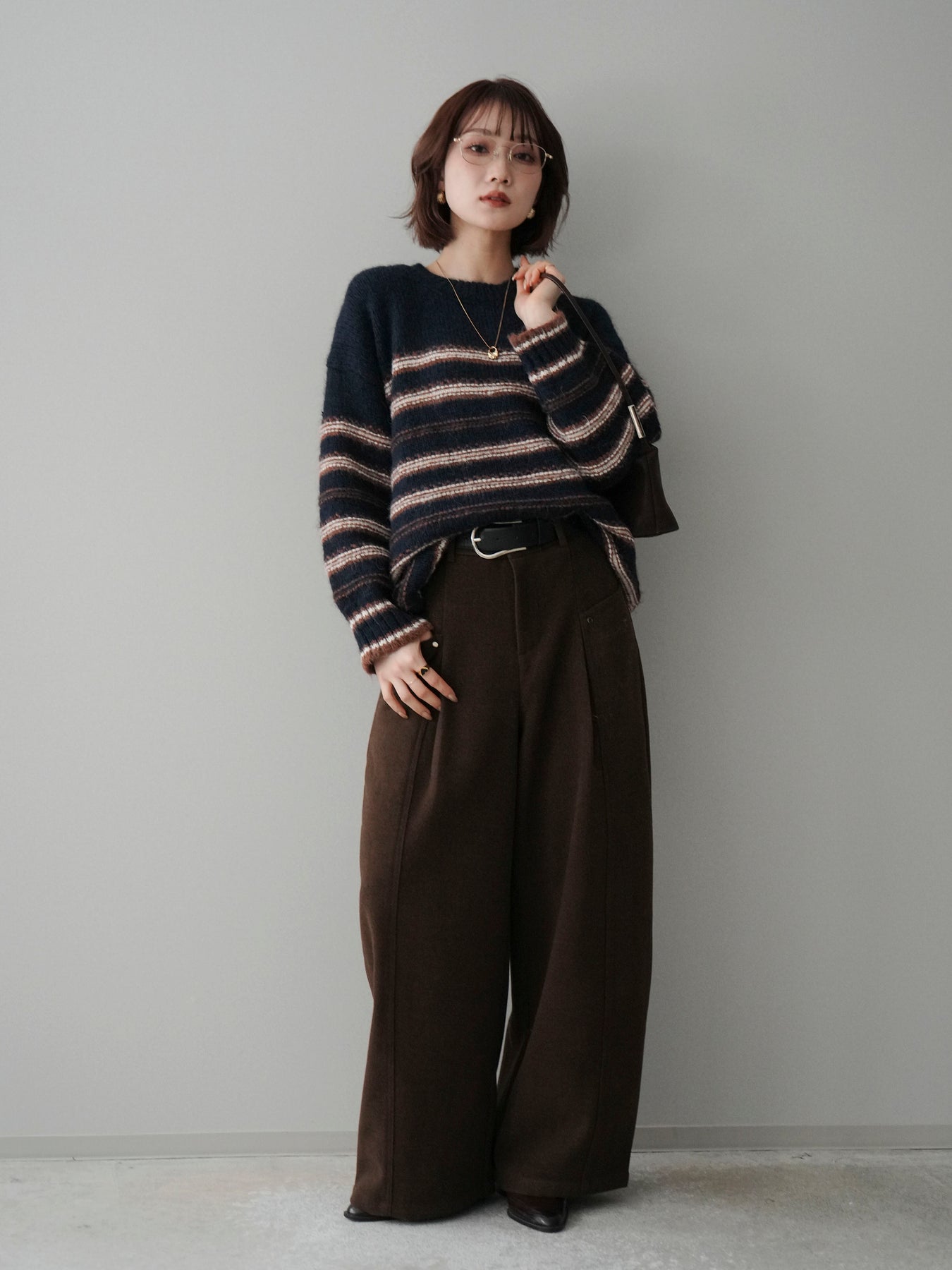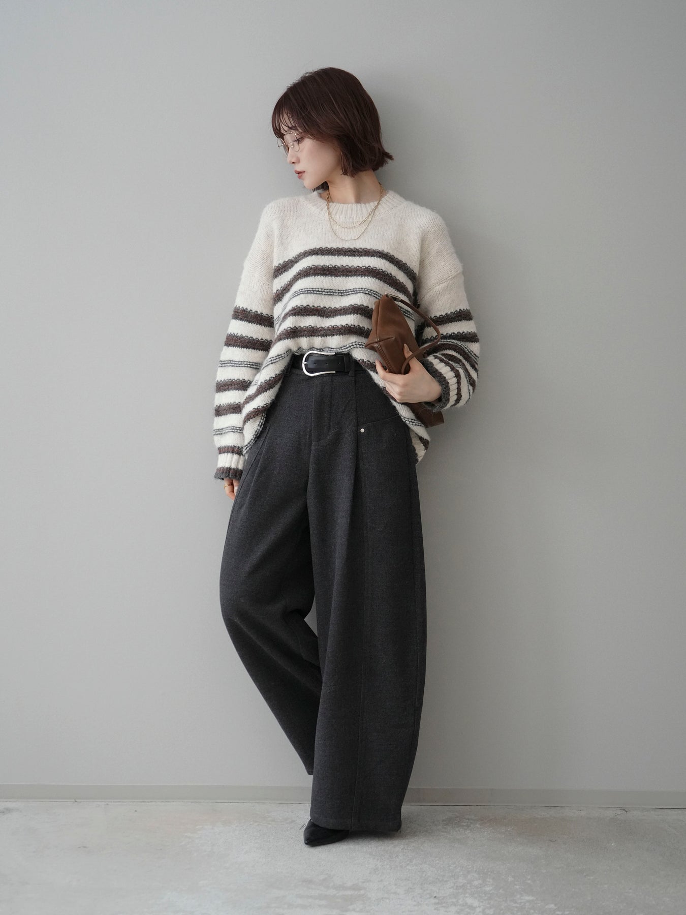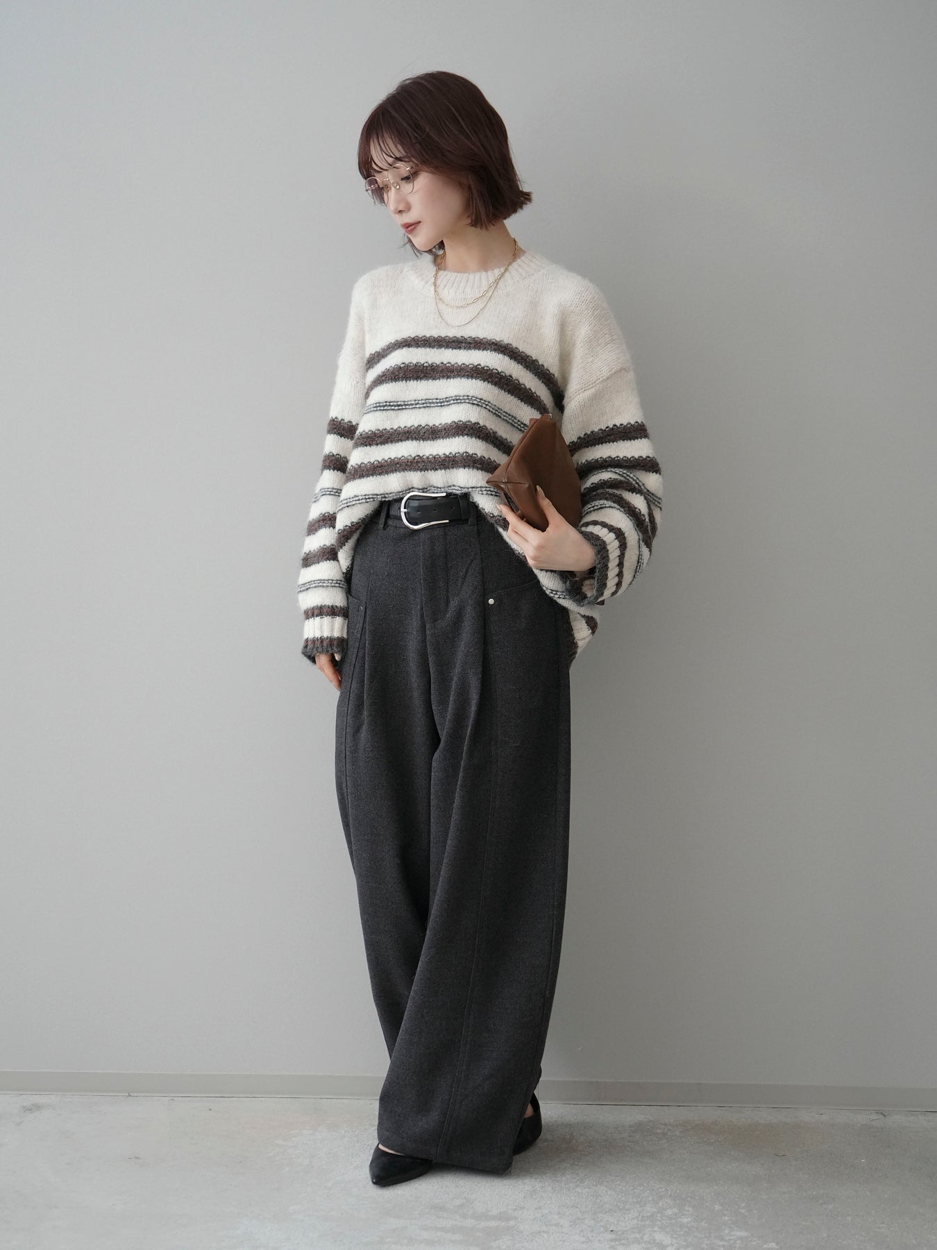[SET]ステッチボーダーニットプルオーバー+ベルト付起毛コクーンパンツ(2set)