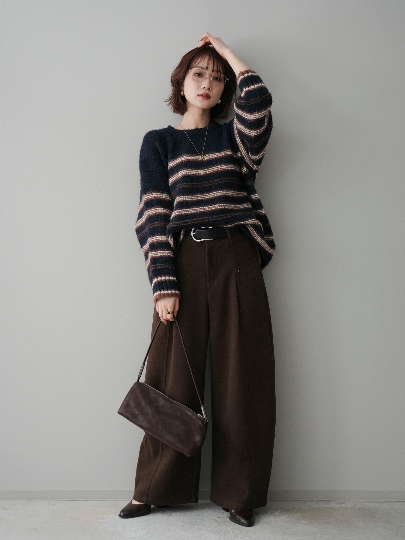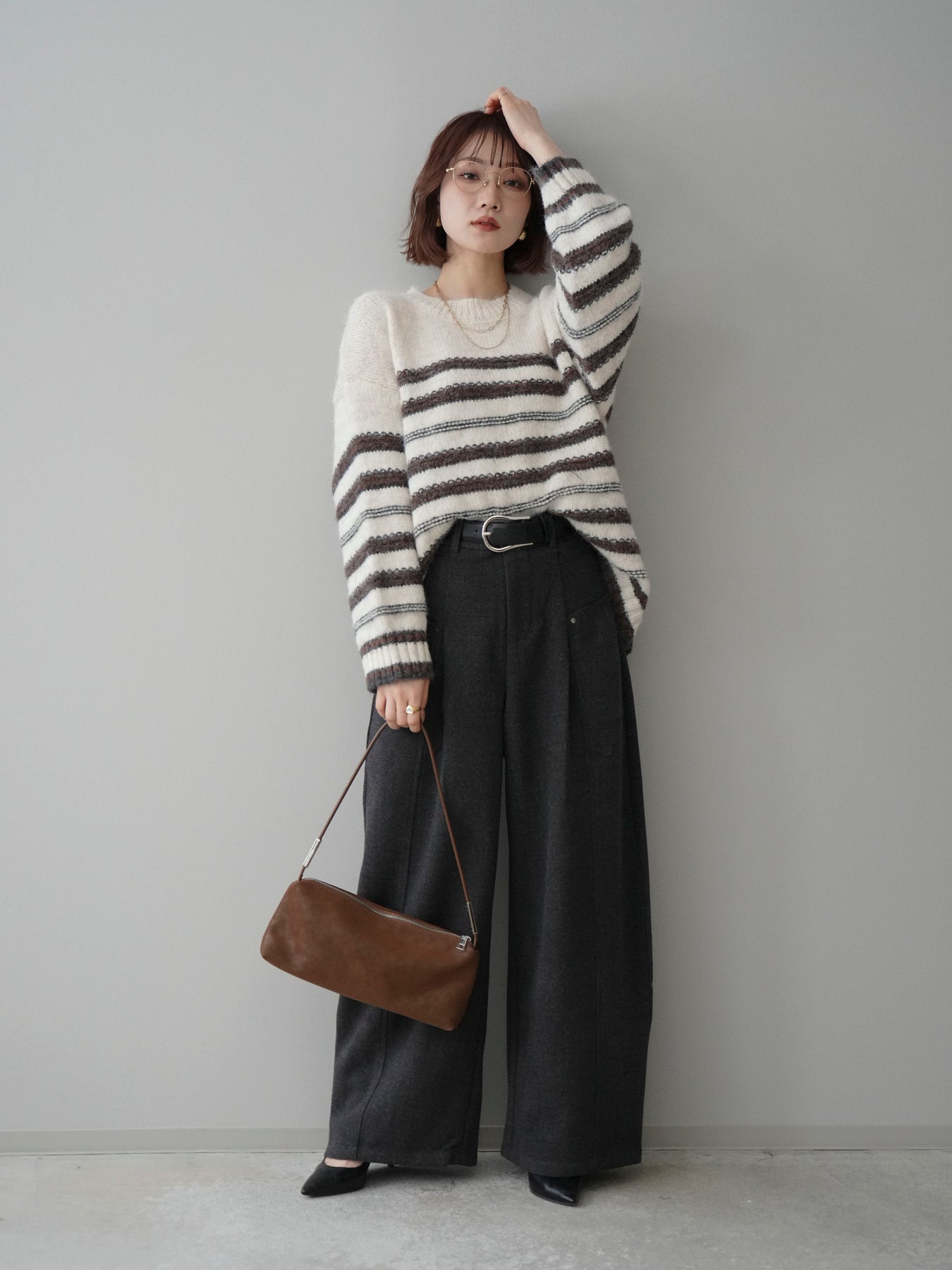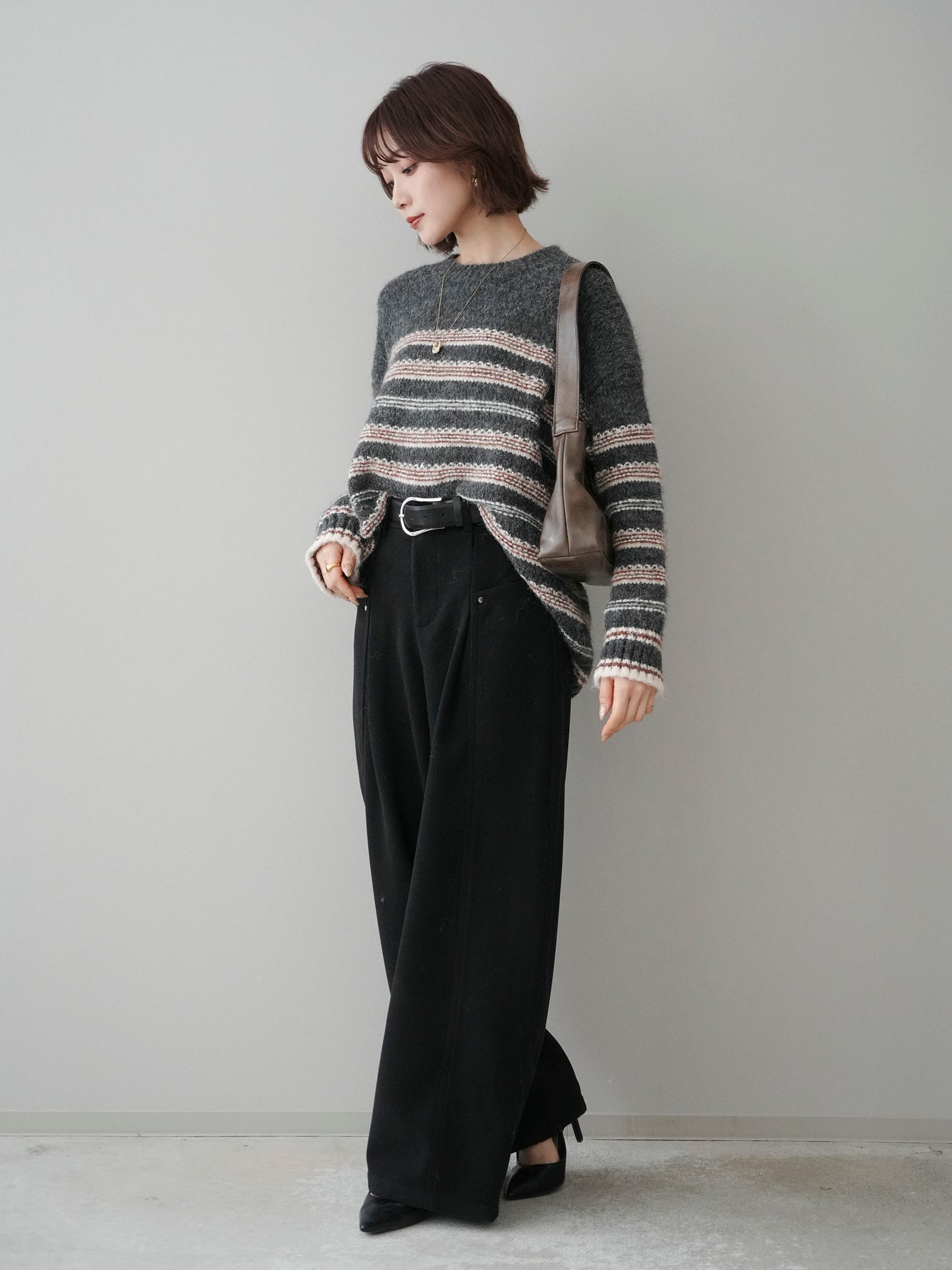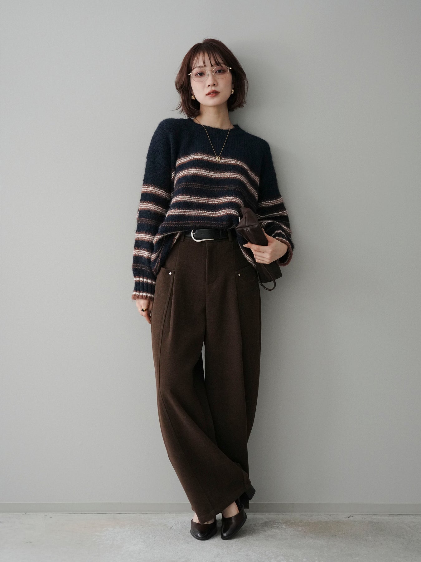 [SET]ステッチボーダーニットプルオーバー+ベルト付起毛コクーンパンツ(2set)