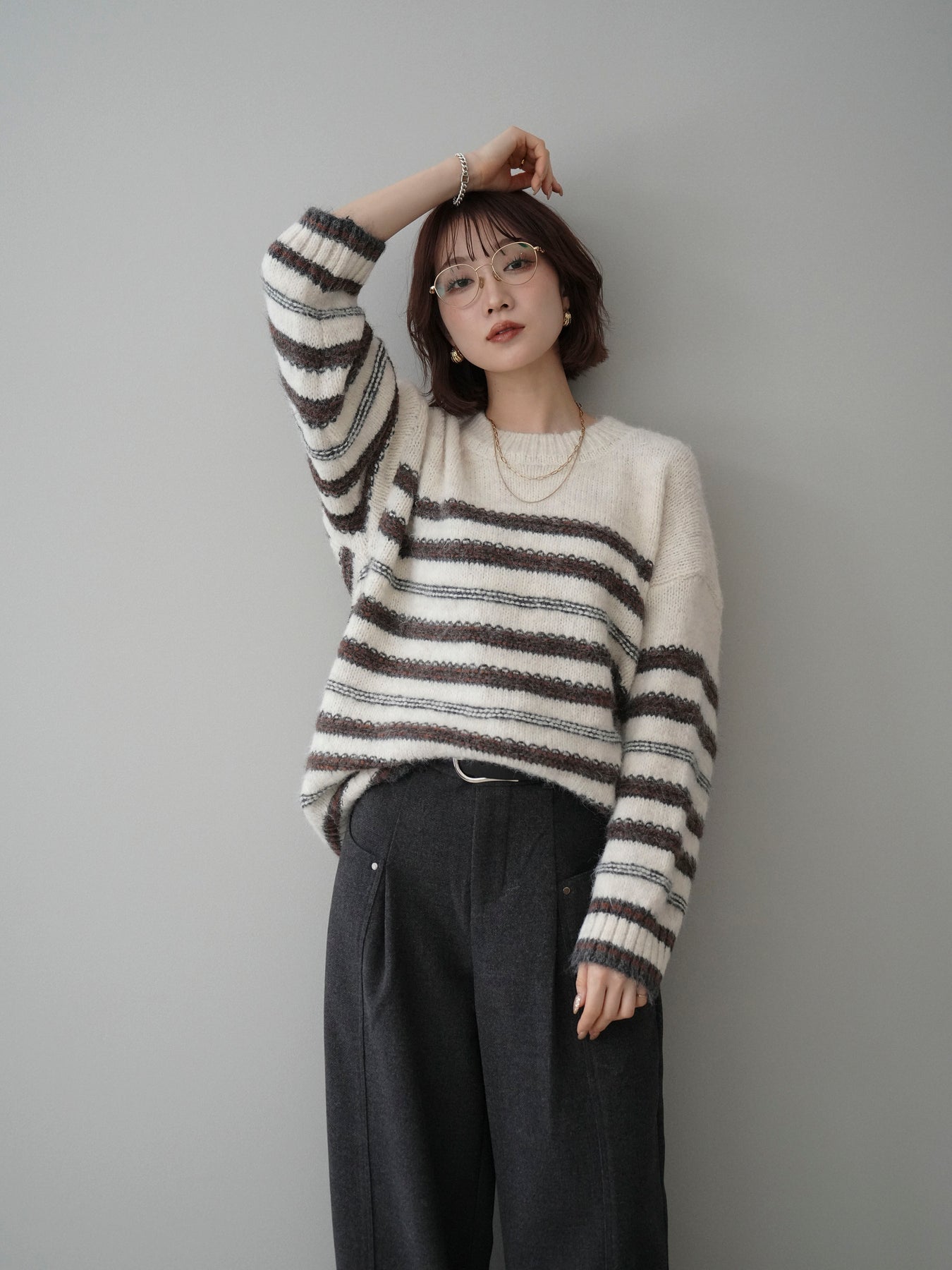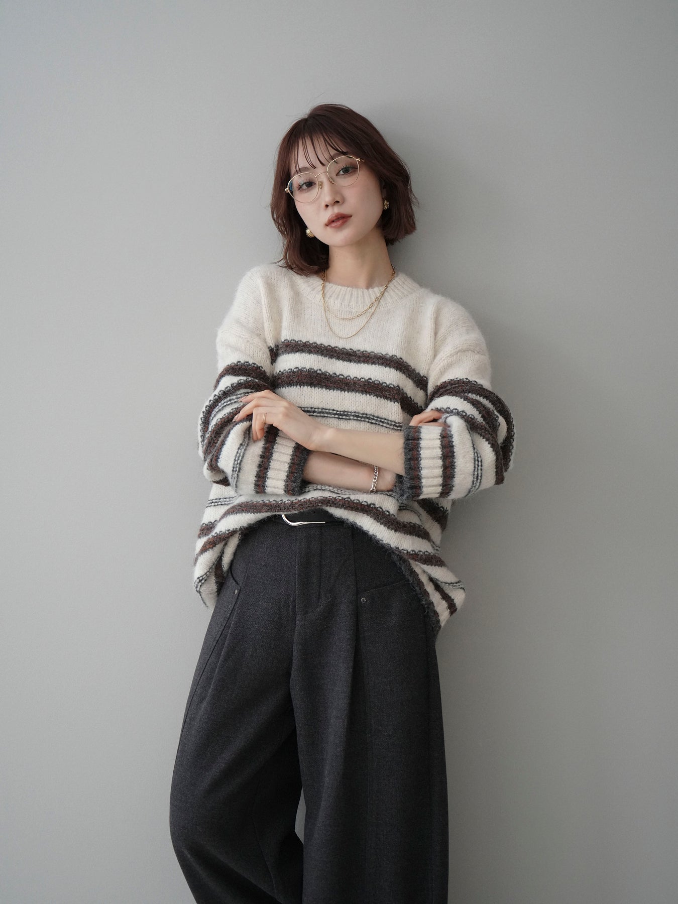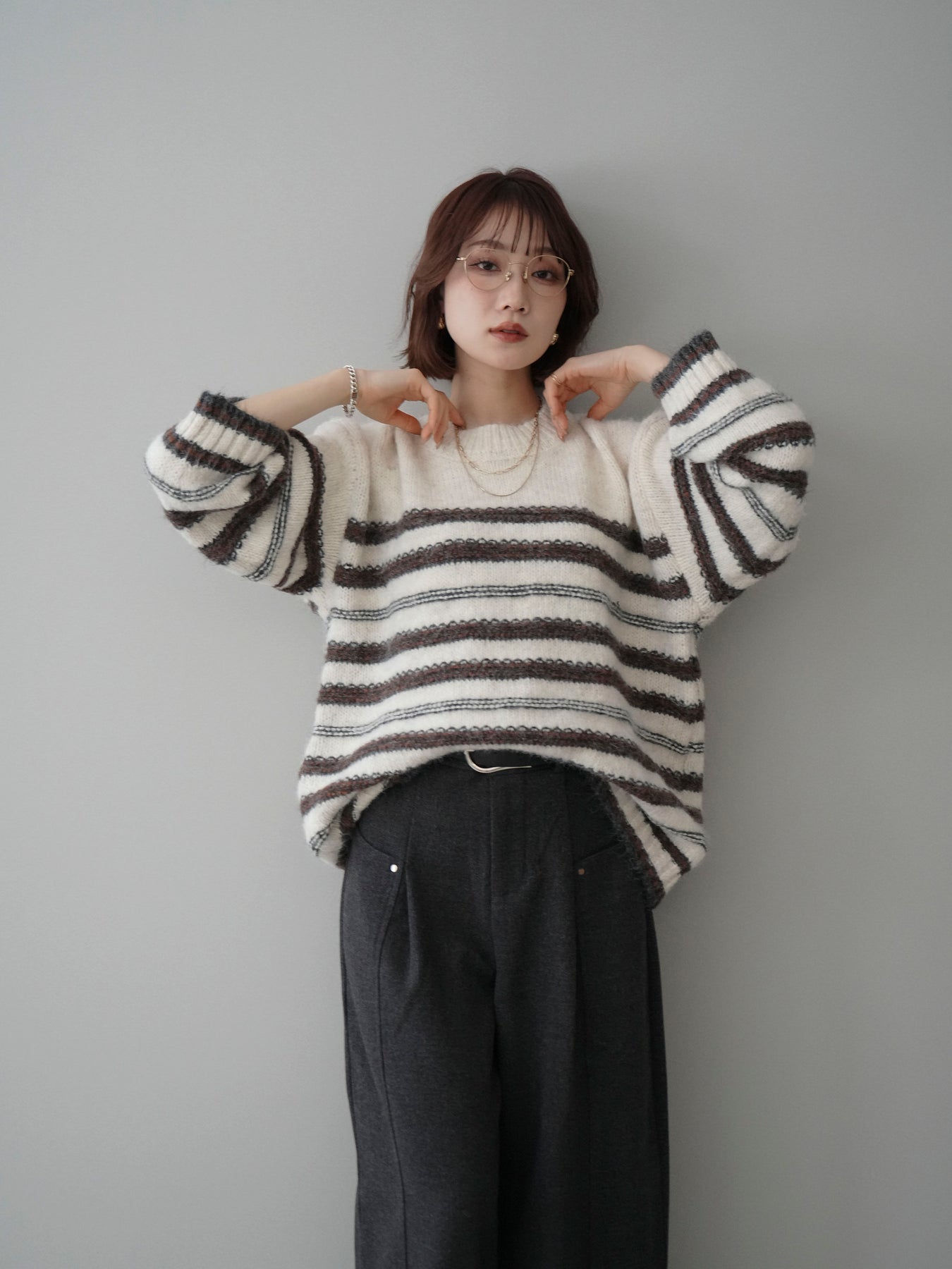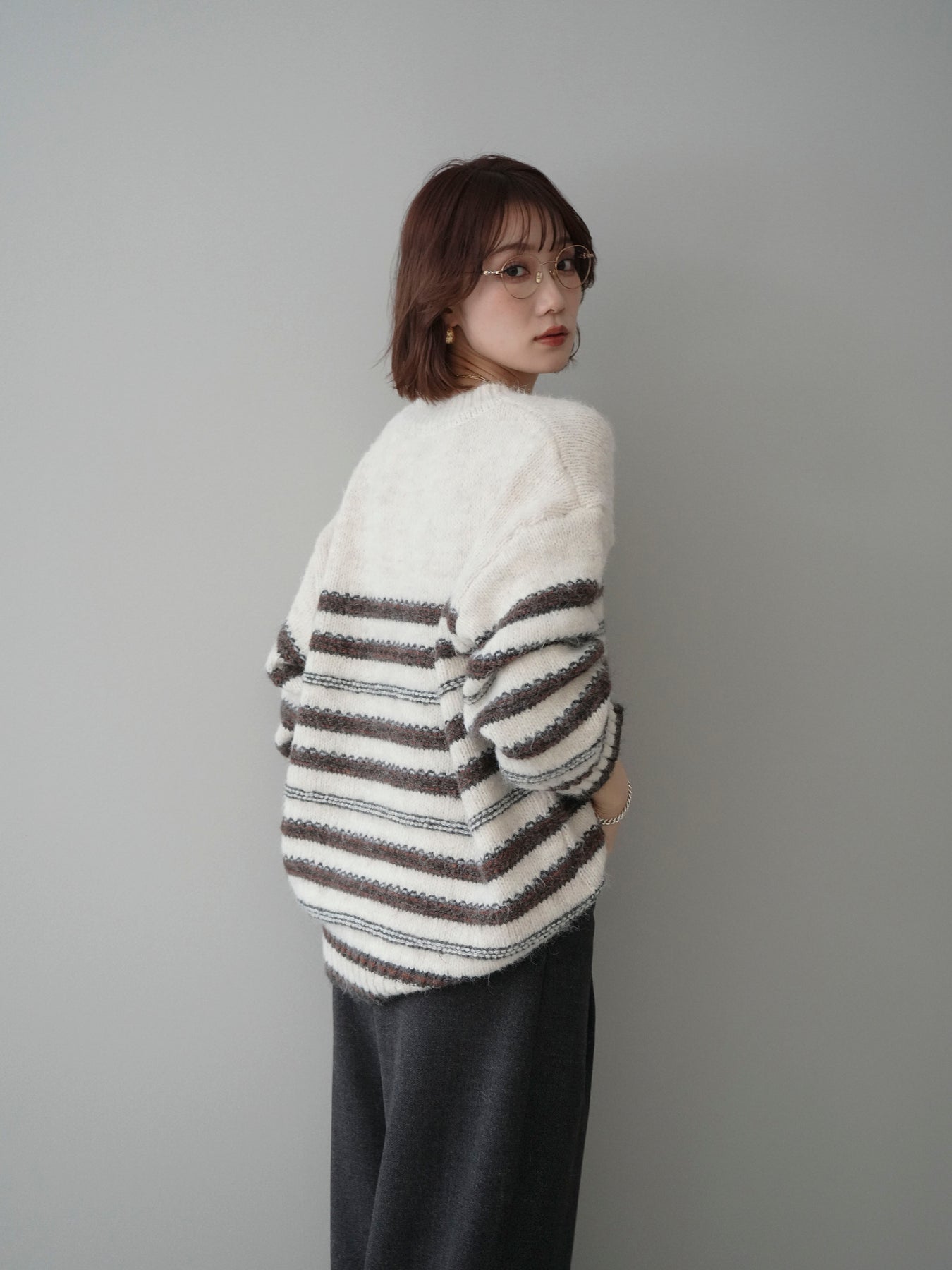 ゆるやかに抜け感を演出するボーダーニット。 シャギー感のある優しい風合いと、ステッチのようなボーダー柄が印象的な1枚。落ち感のあるルーズなシルエットが、カジュアルながらもこなれた雰囲気をプラス。デニムやスラックスはもちろん、スカートとの合わせも◎。1枚で着映えする主役級ニットです。