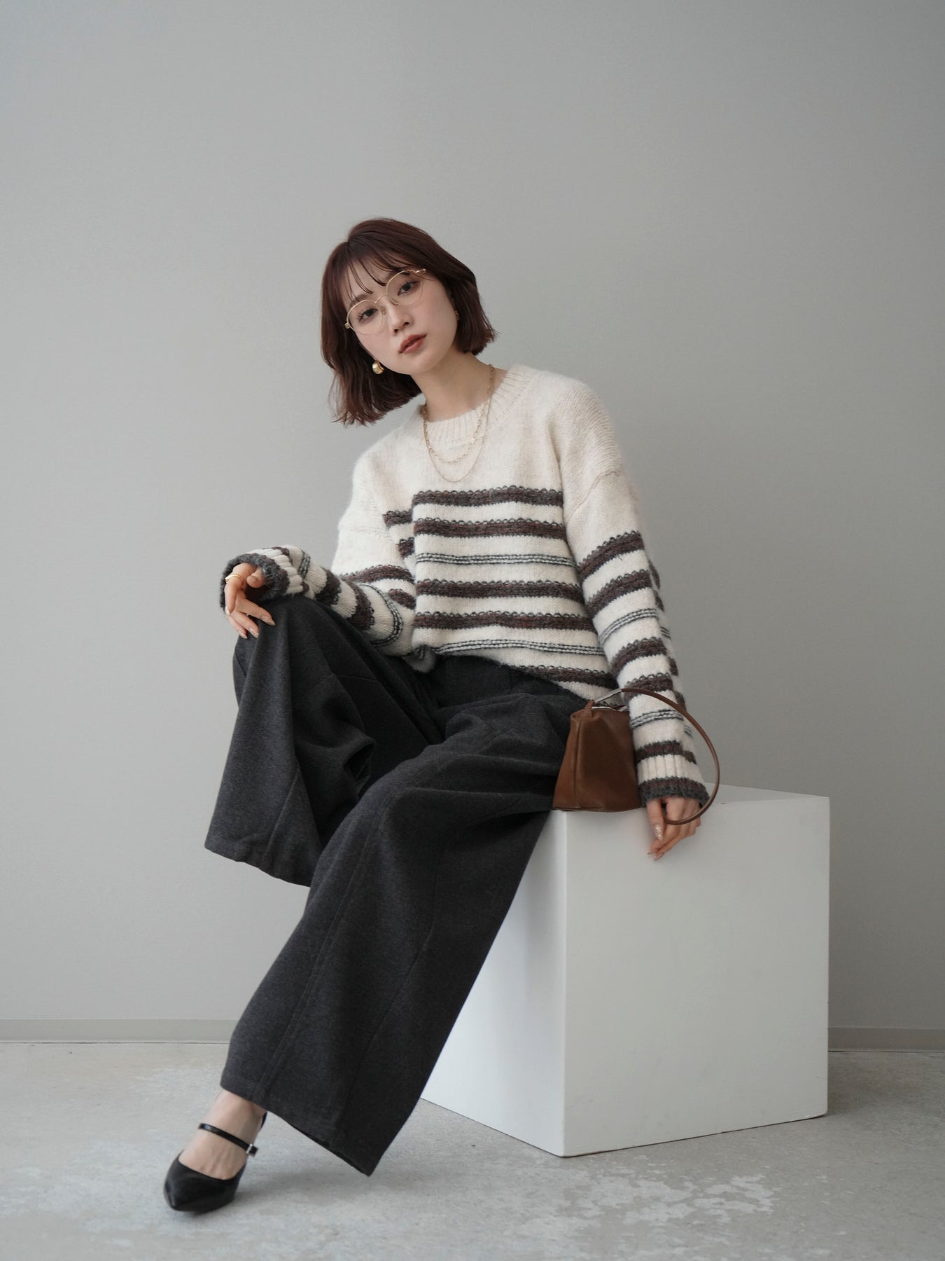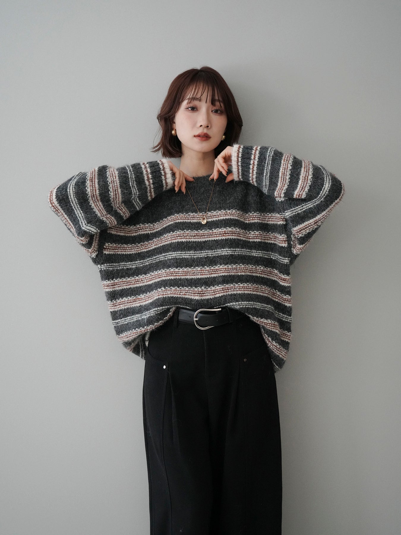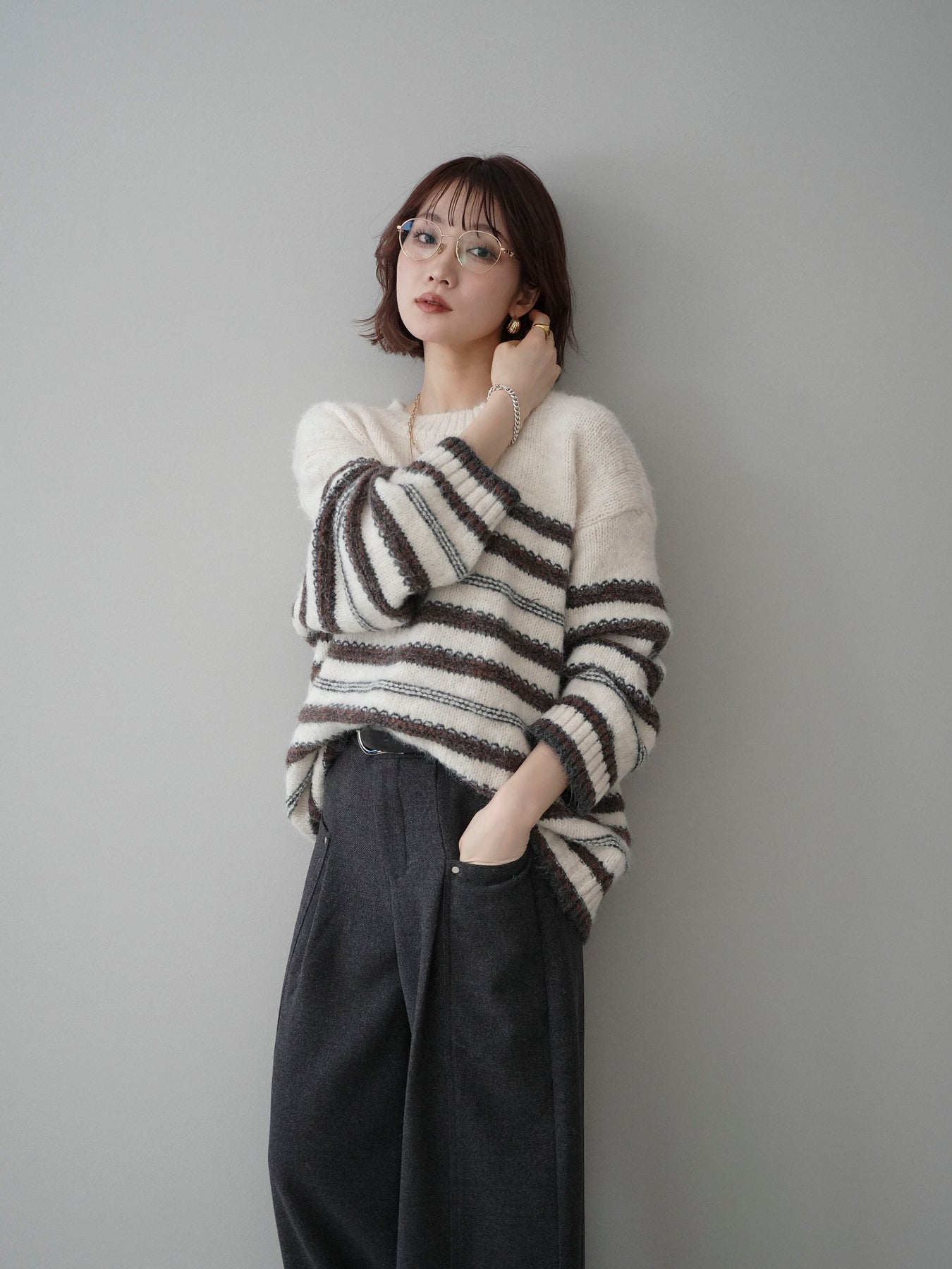 ゆるやかに抜け感を演出するボーダーニット。 シャギー感のある優しい風合いと、ステッチのようなボーダー柄が印象的な1枚。落ち感のあるルーズなシルエットが、カジュアルながらもこなれた雰囲気をプラス。デニムやスラックスはもちろん、スカートとの合わせも◎。1枚で着映えする主役級ニットです。