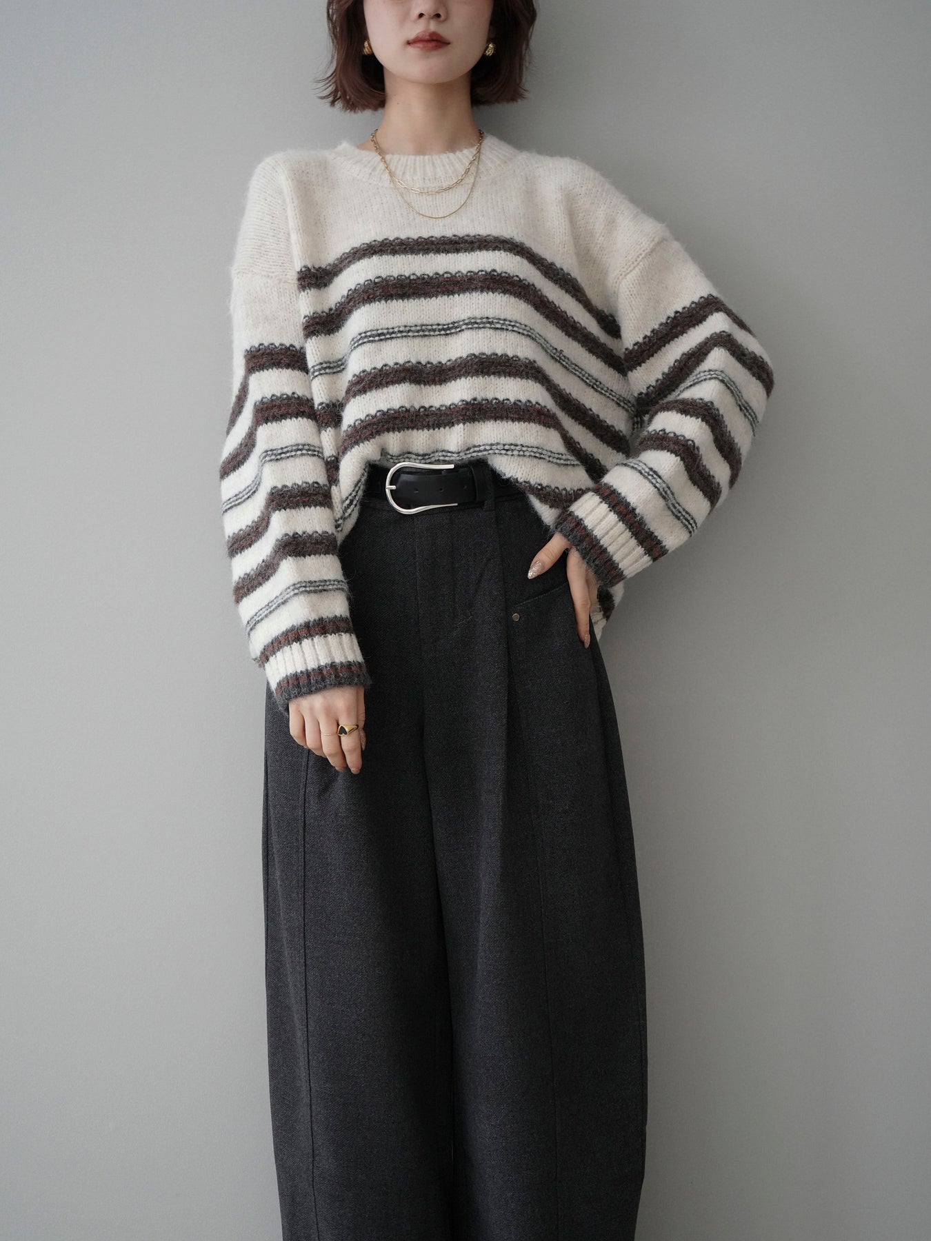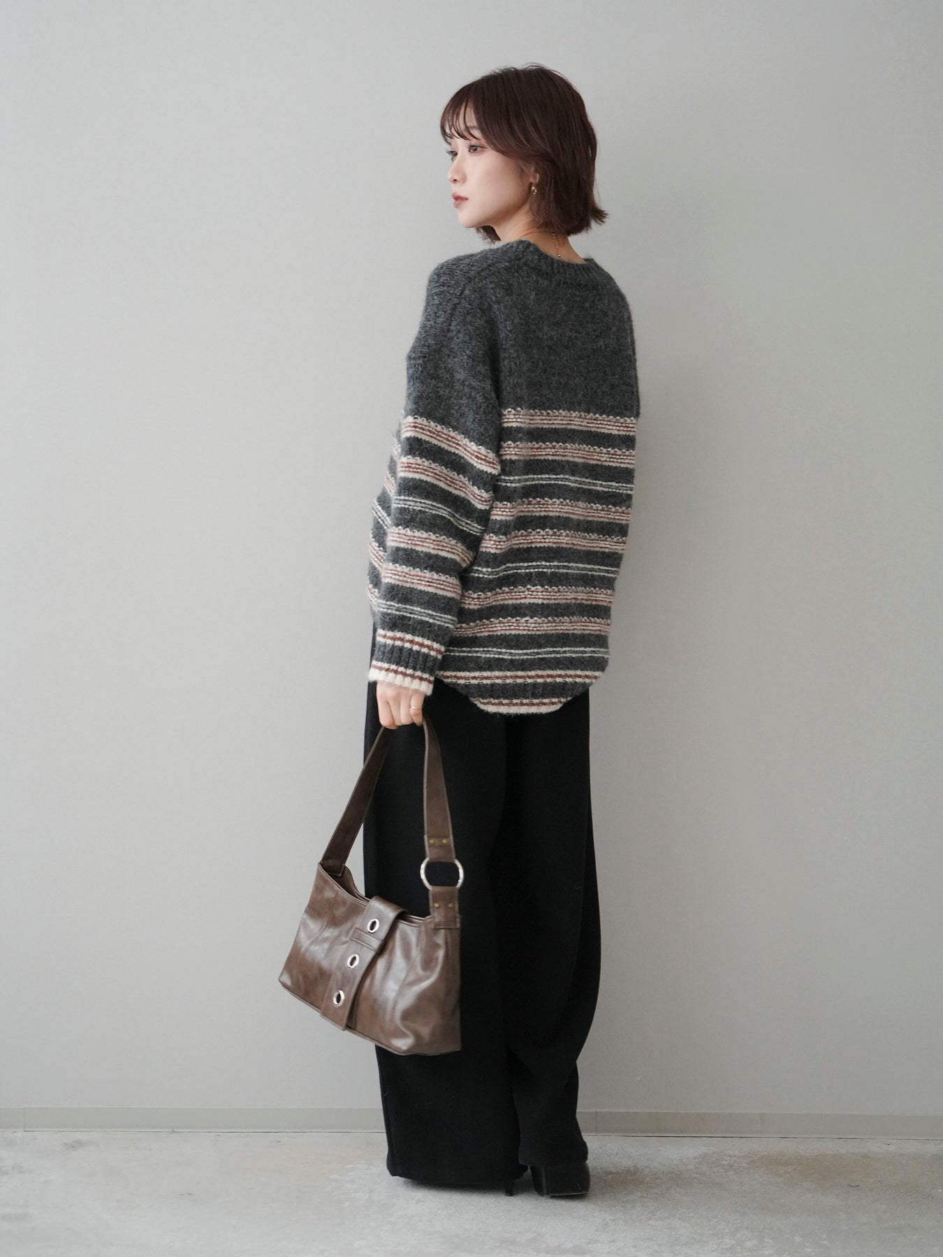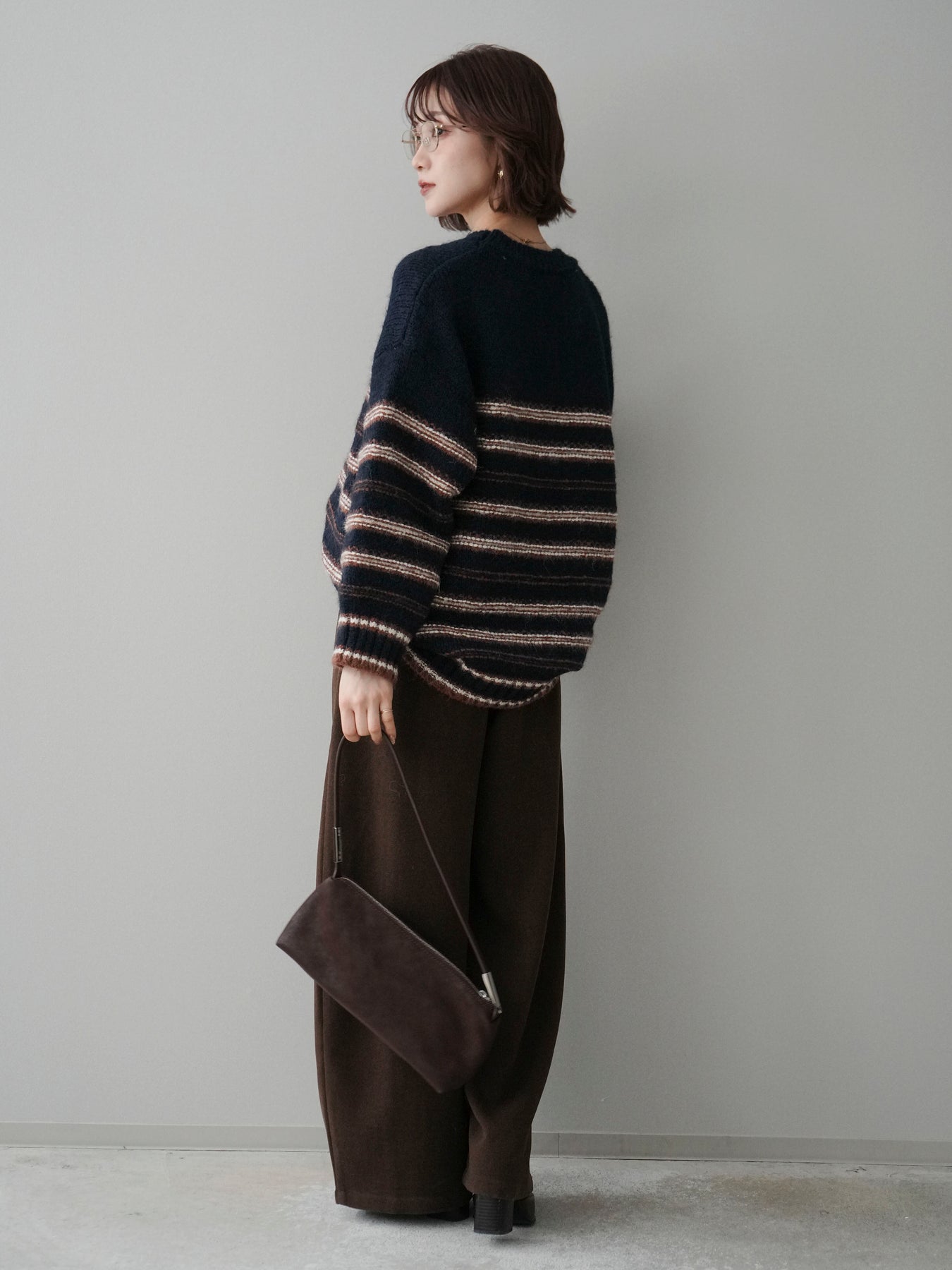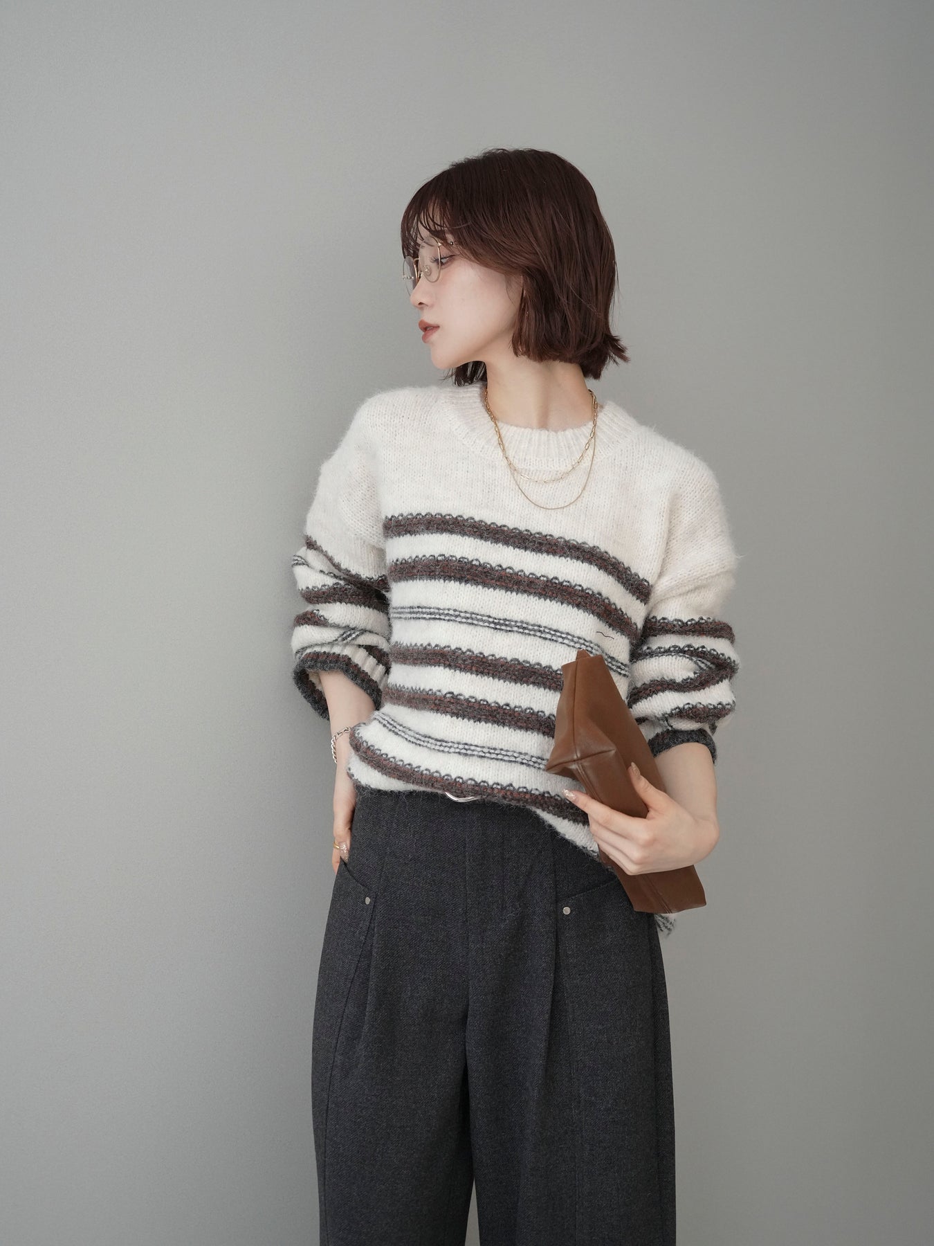 ゆるやかに抜け感を演出するボーダーニット。 シャギー感のある優しい風合いと、ステッチのようなボーダー柄が印象的な1枚。落ち感のあるルーズなシルエットが、カジュアルながらもこなれた雰囲気をプラス。デニムやスラックスはもちろん、スカートとの合わせも◎。1枚で着映えする主役級ニットです。