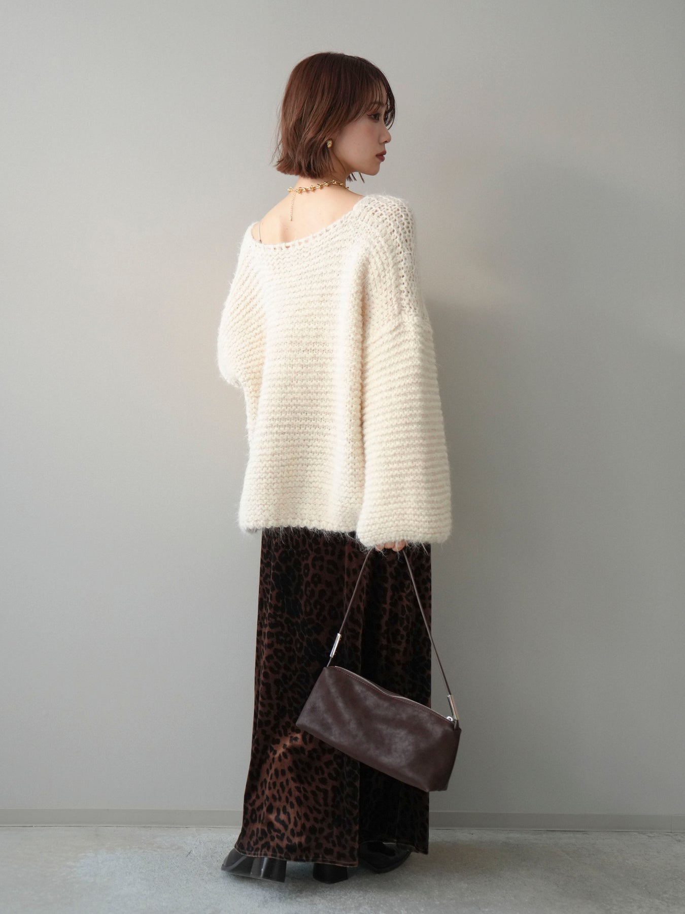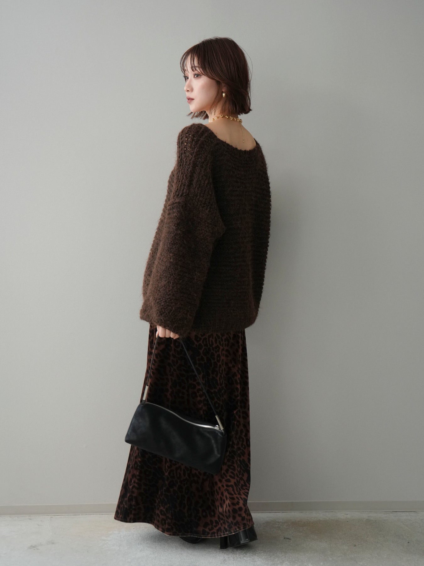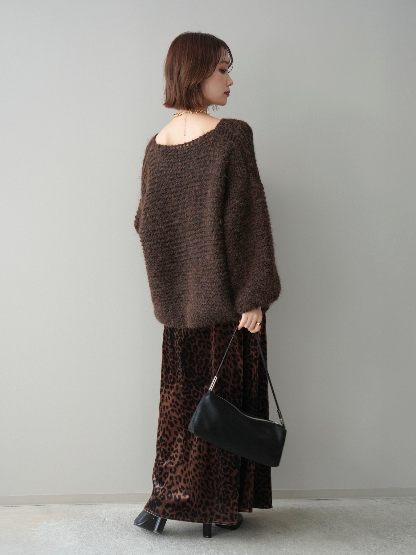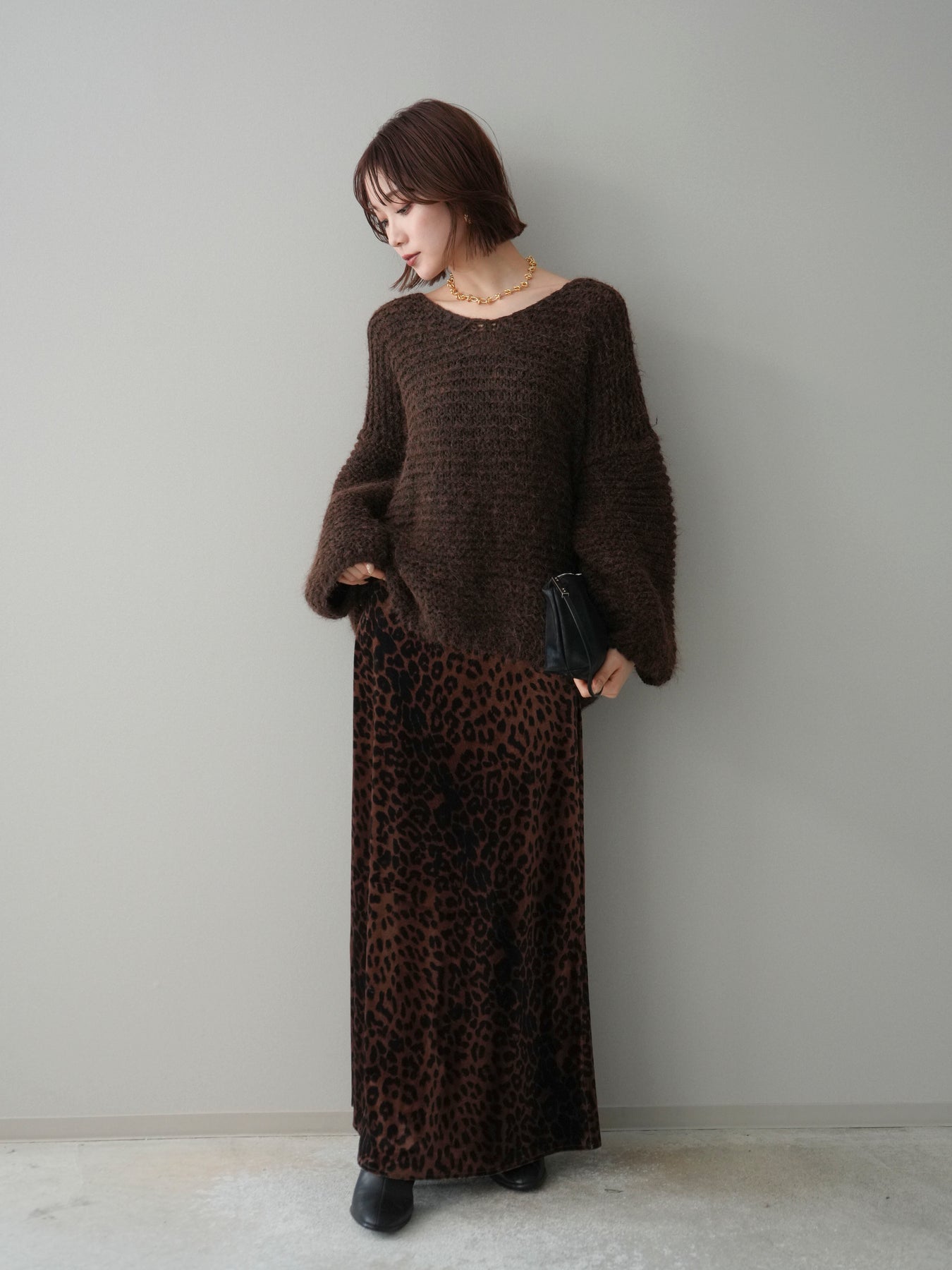 [SET]ワッフル編みシャギーニットプルオーバー+レオパードベロアナロースカート(2set)