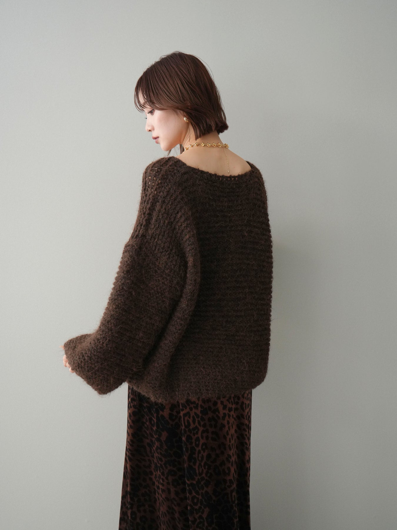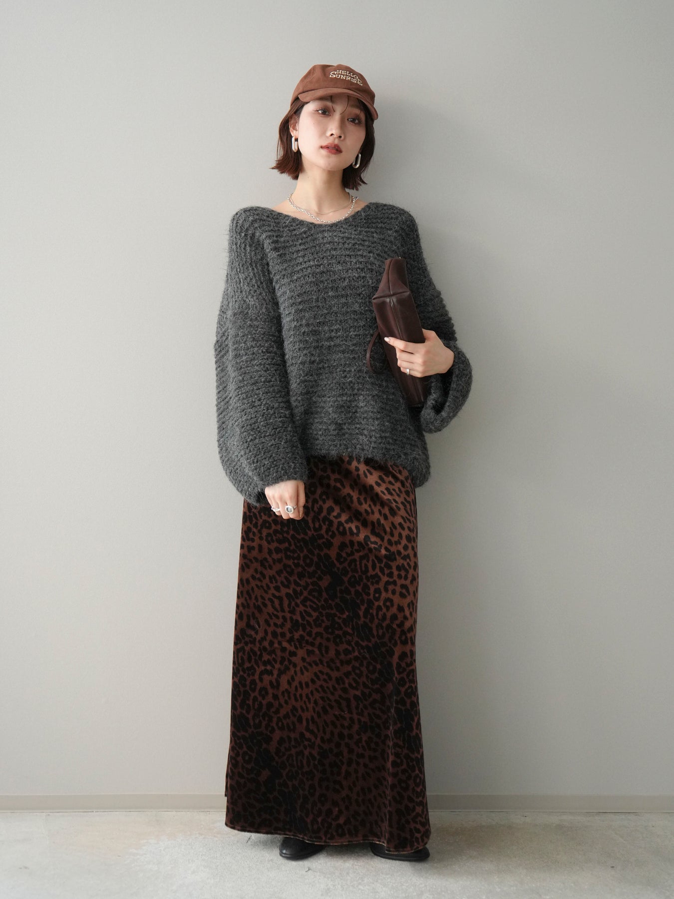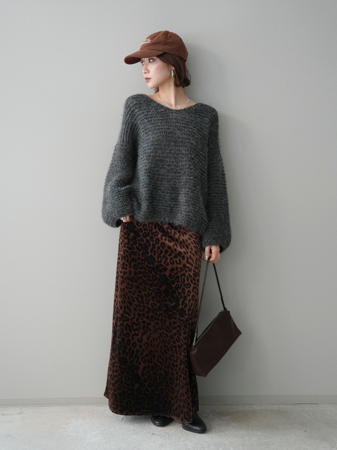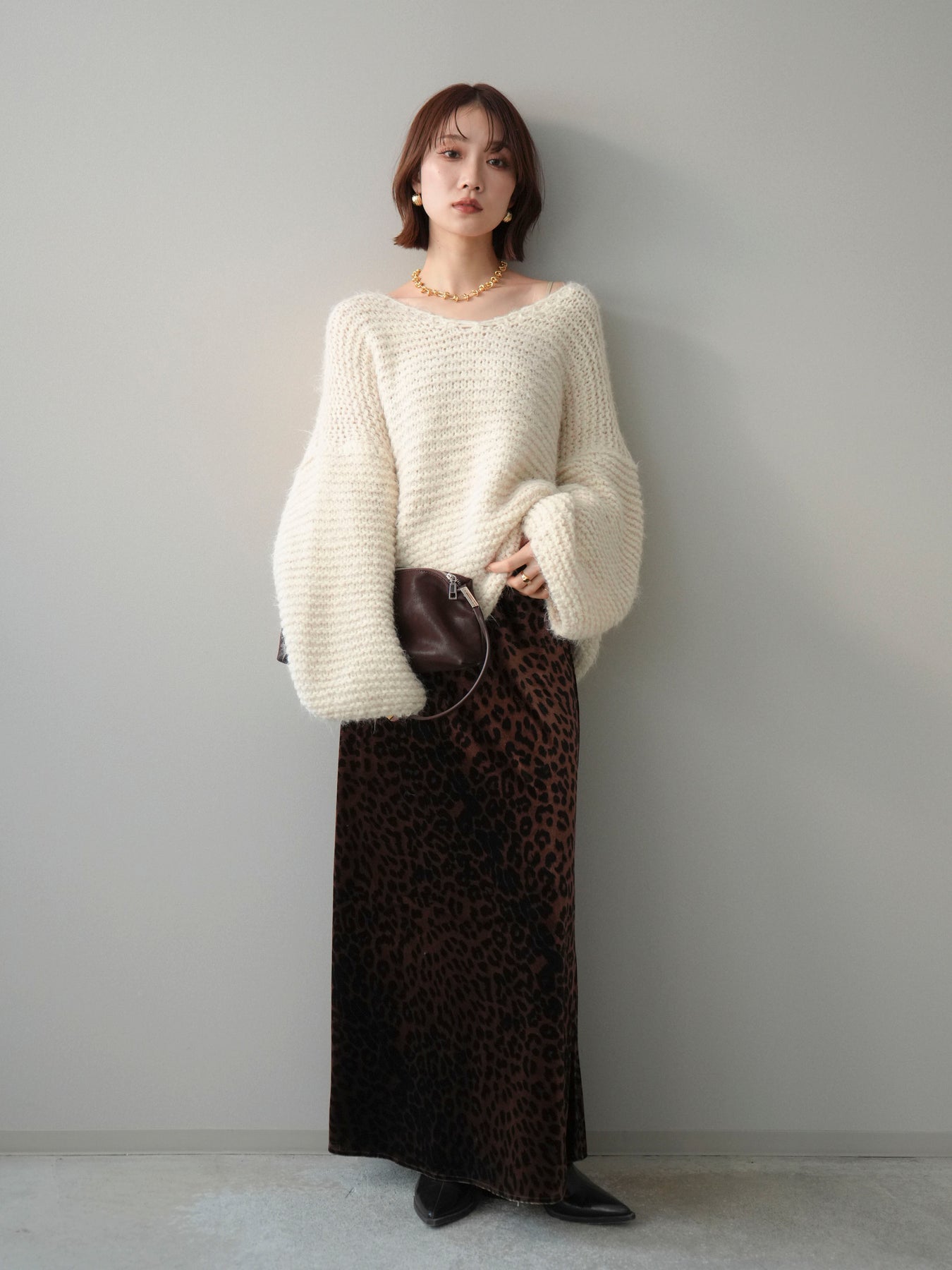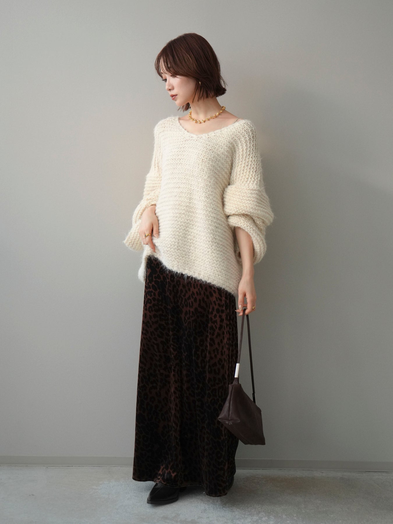 [SET]ワッフル編みシャギーニットプルオーバー+レオパードベロアナロースカート(2set)