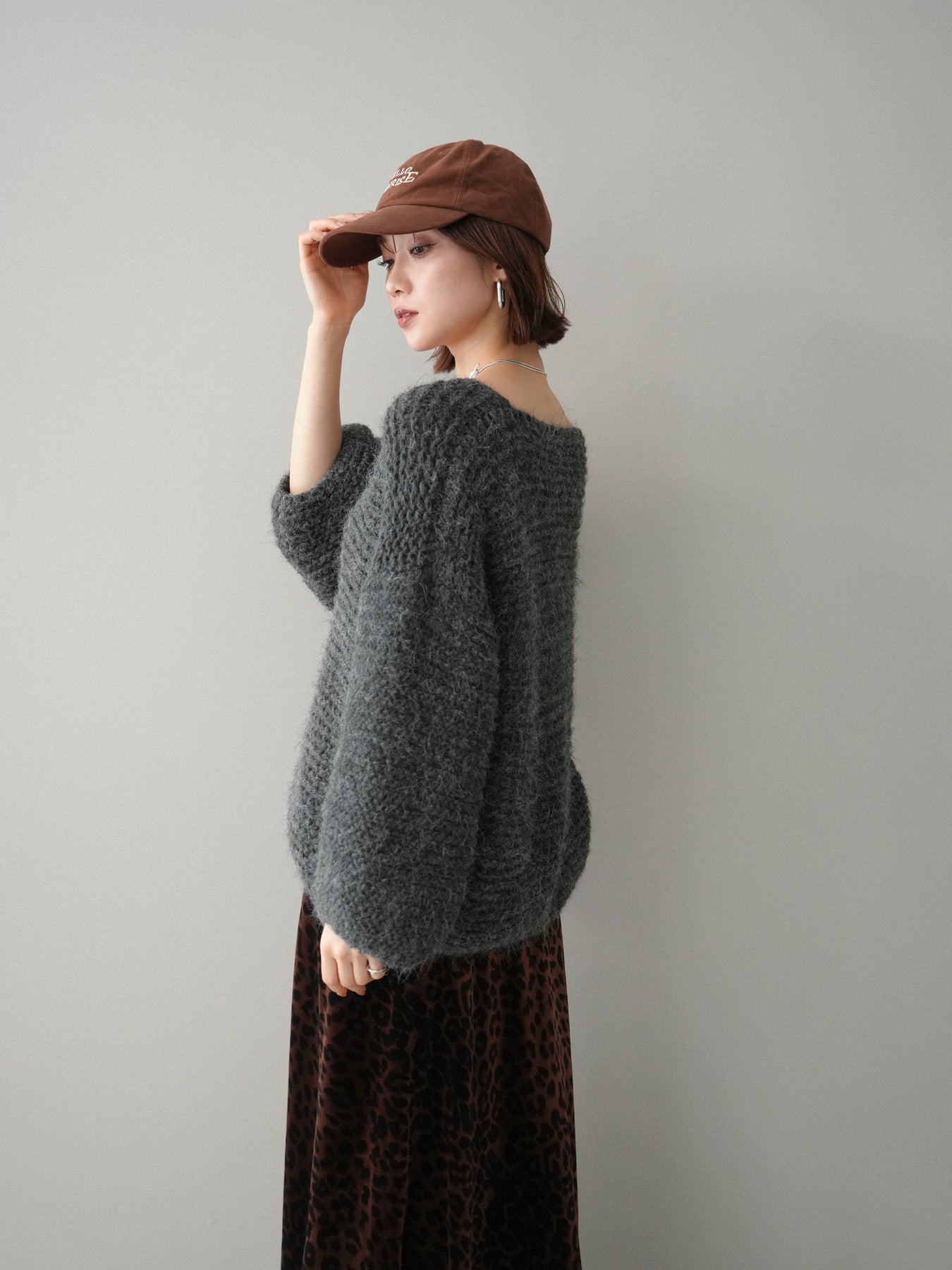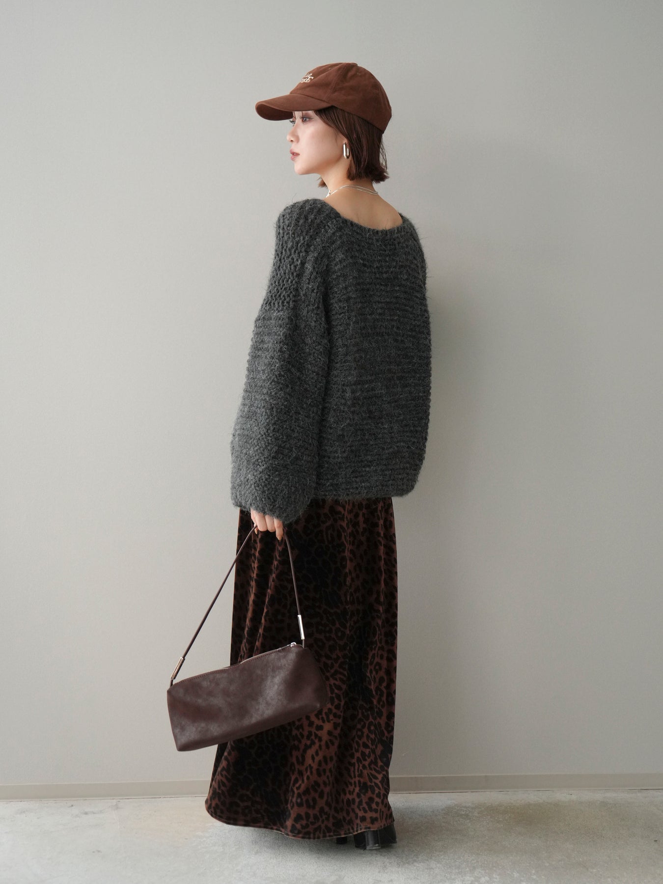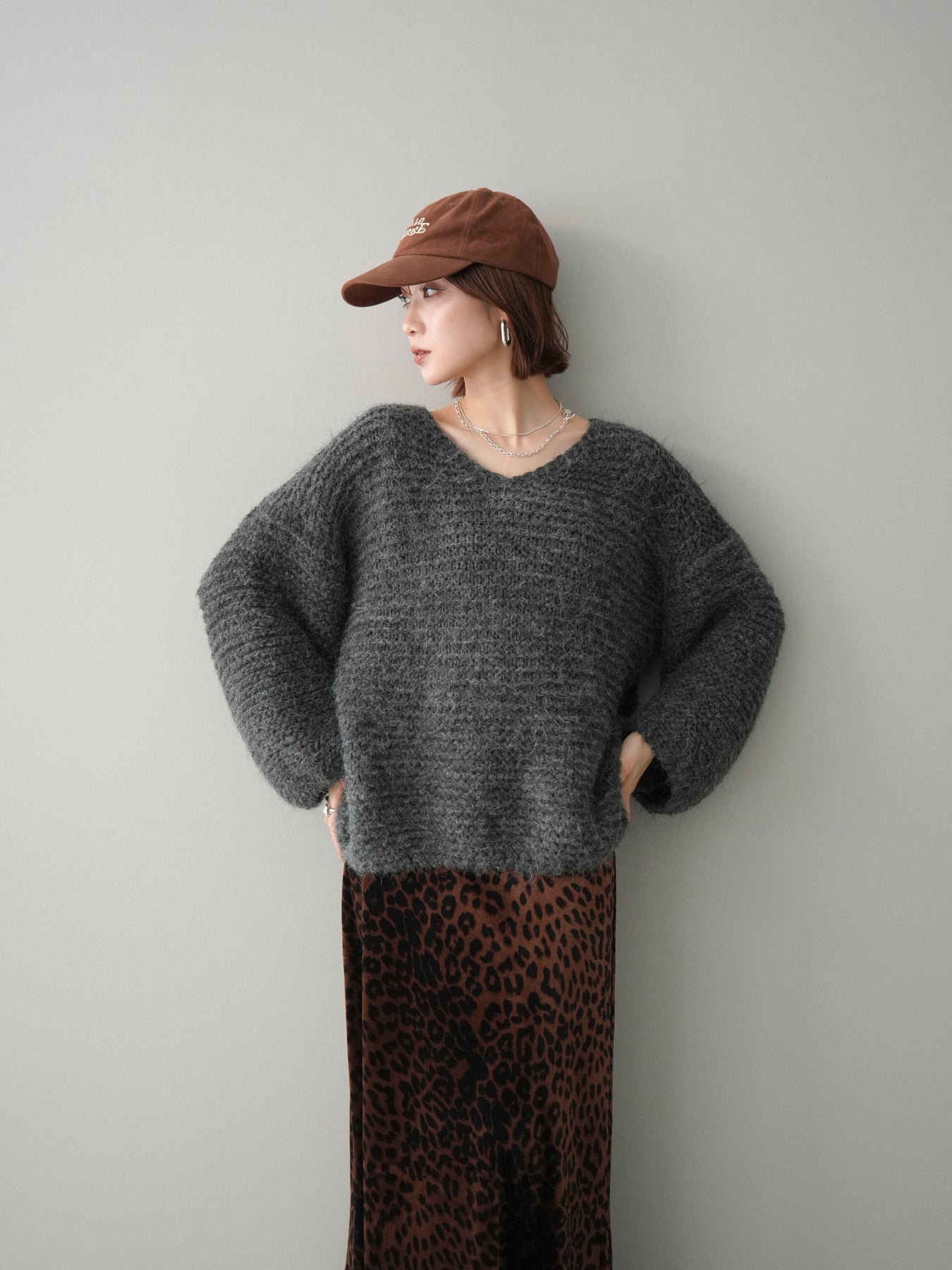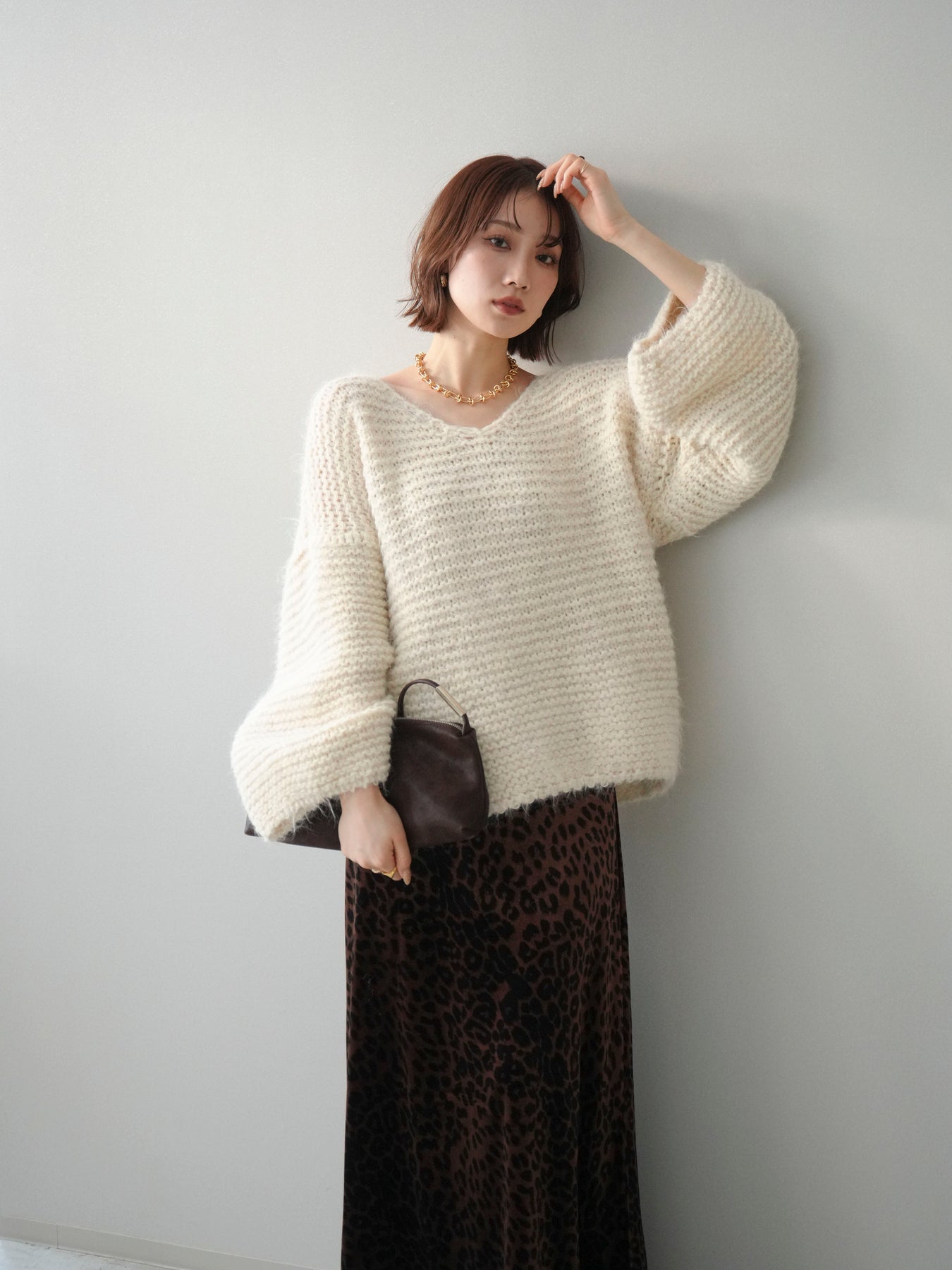 [SET]ワッフル編みシャギーニットプルオーバー+レオパードベロアナロースカート(2set)