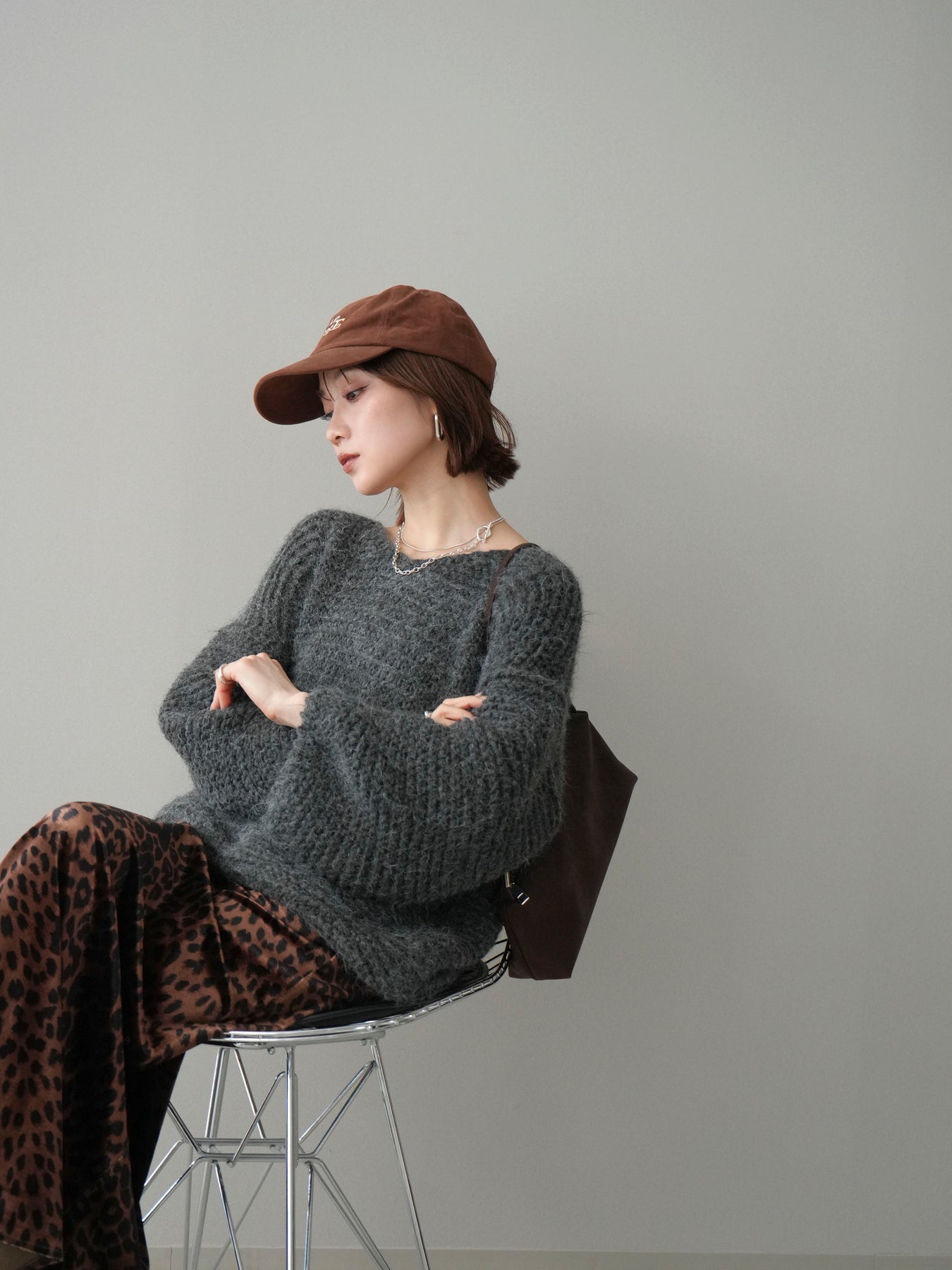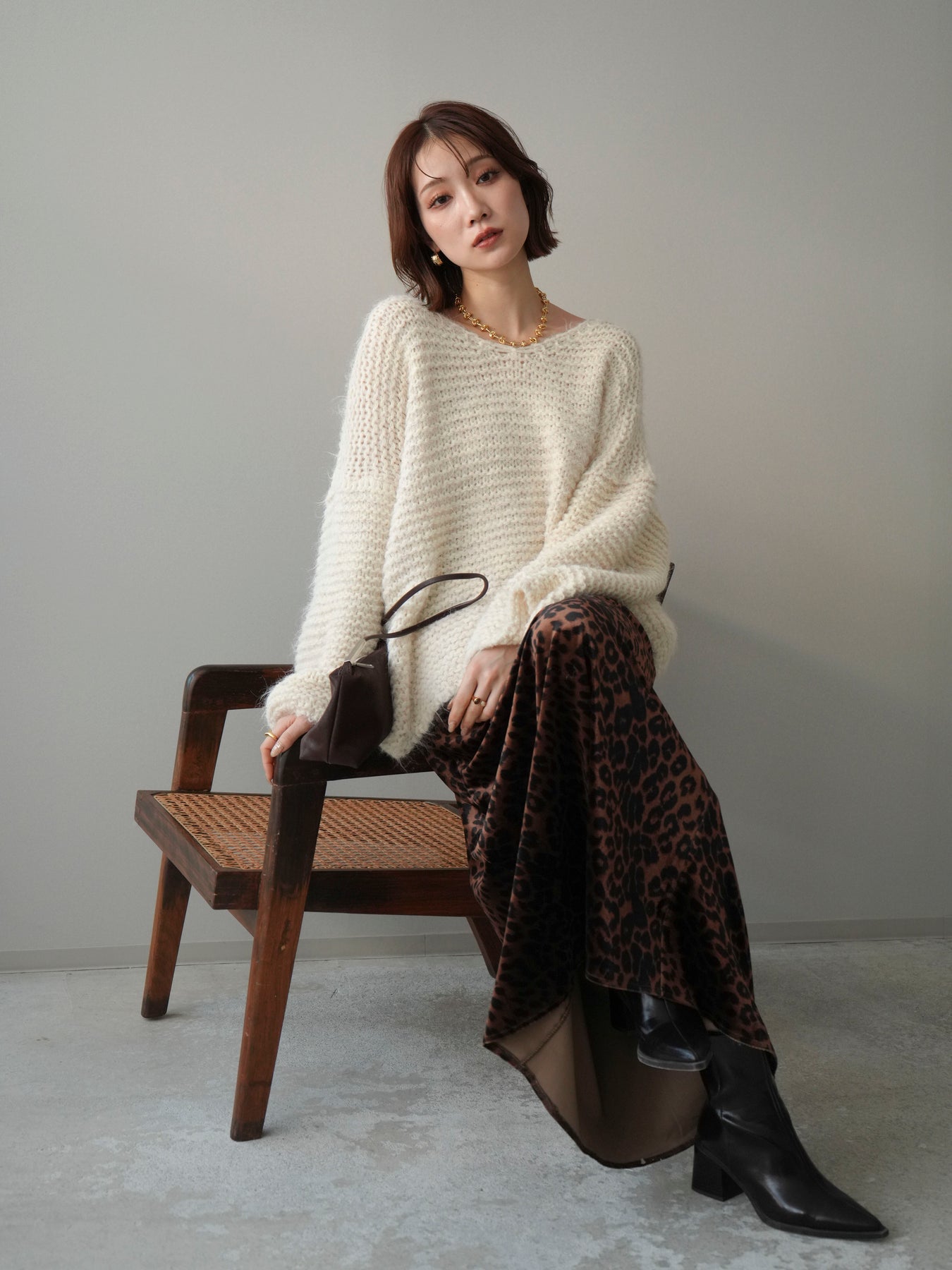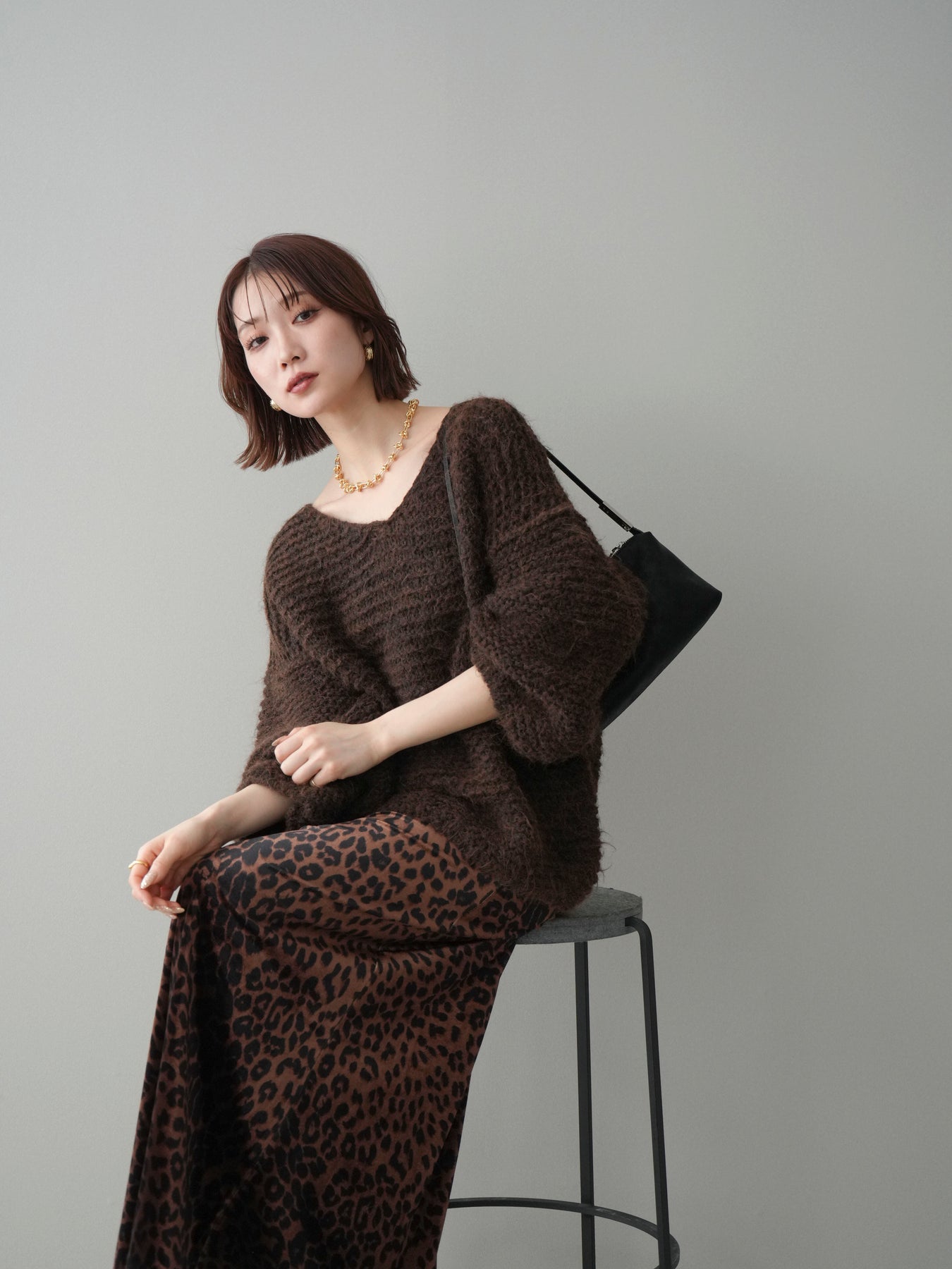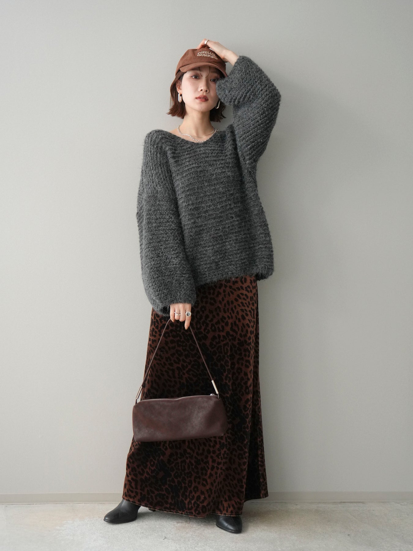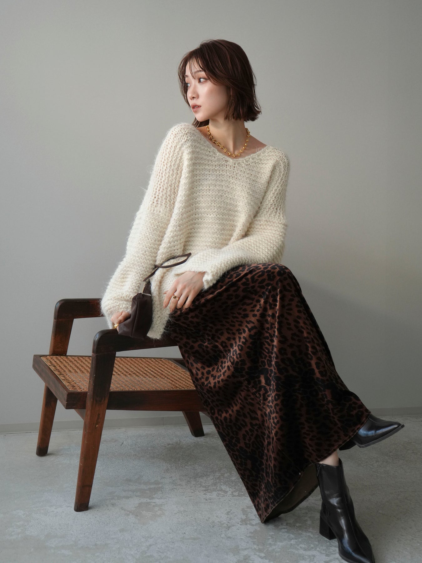 [SET]ワッフル編みシャギーニットプルオーバー+レオパードベロアナロースカート(2set)