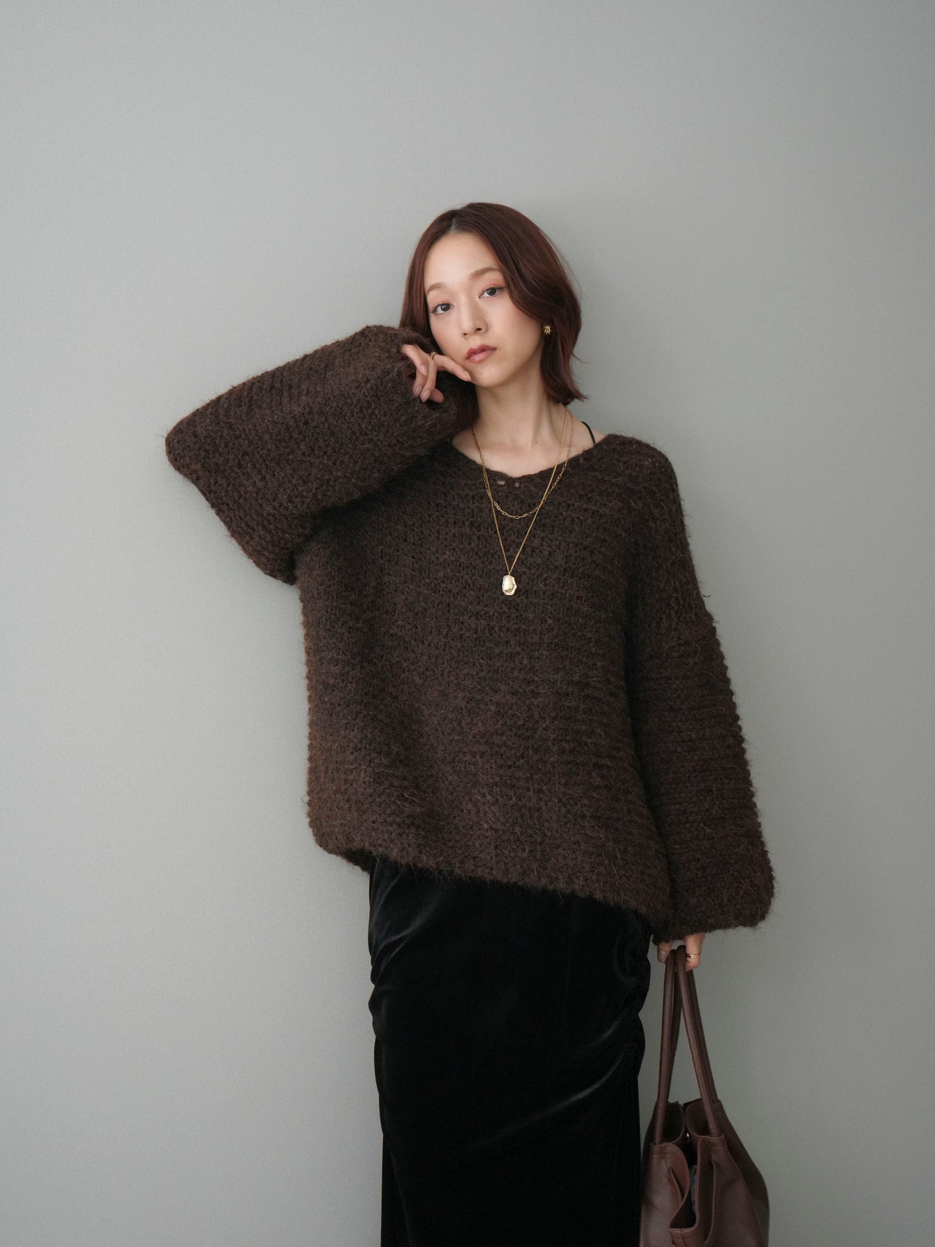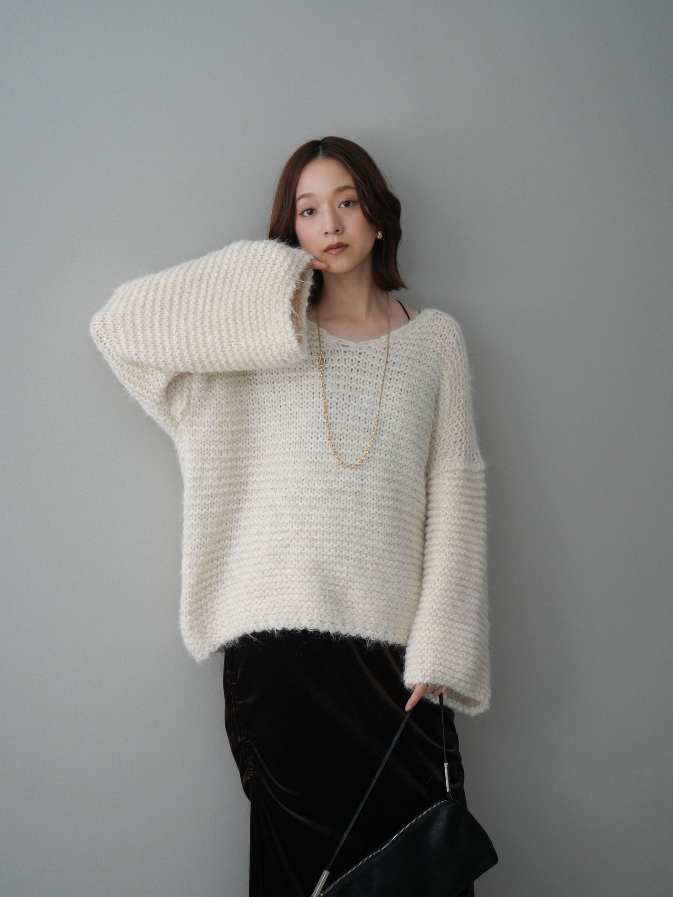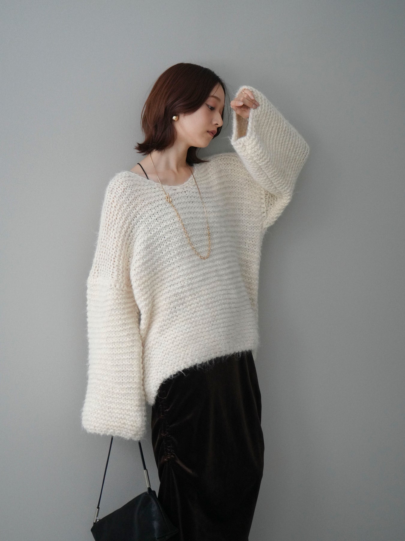 ふんわりとしたシャギー素材とワッフル編みの立体感が魅力のニットプルオーバー。 肌あたりのやさしい風合いで、着心地も抜群。ゆったりとしたルーズシルエットが抜け感を演出し、ナチュラルなムードに仕上げてくれます。 デコルテを美しく見せる絶妙なネックラインで女性らしさも忘れずに。 一枚着としても、シャツやワンピースとのレイヤードスタイルでも活躍する、着回し力の高いアイテムです。