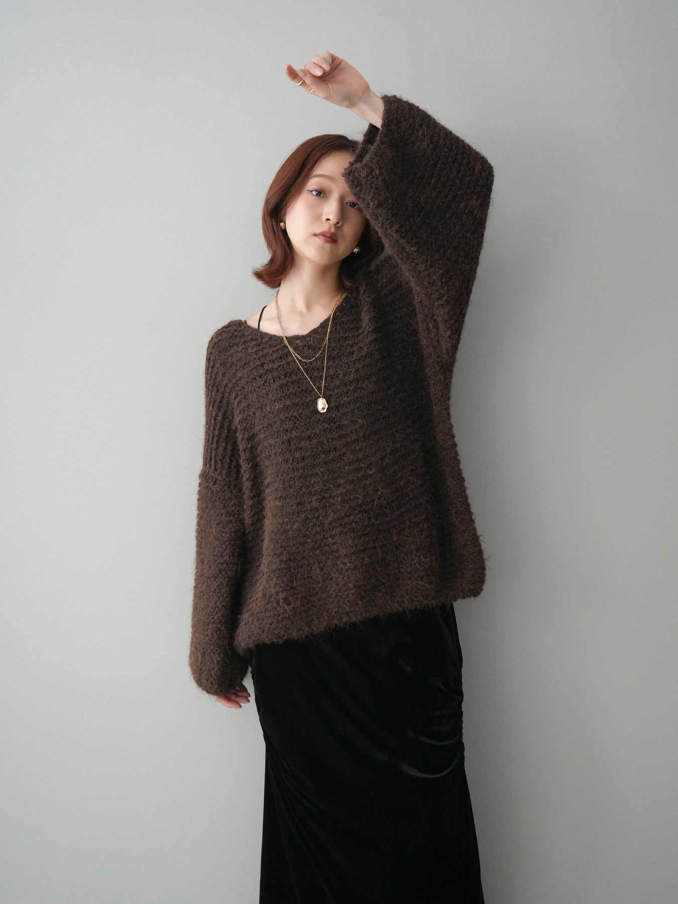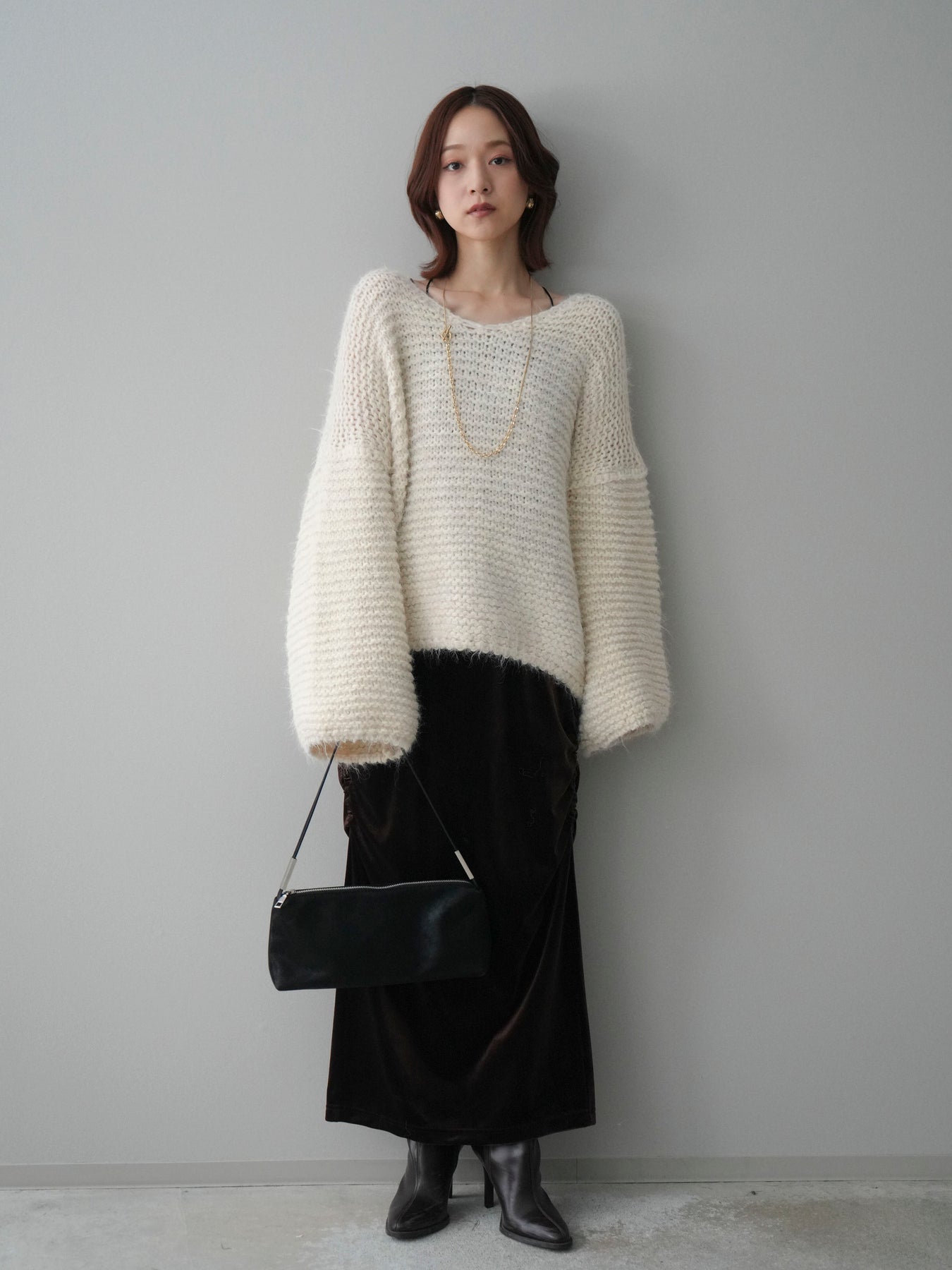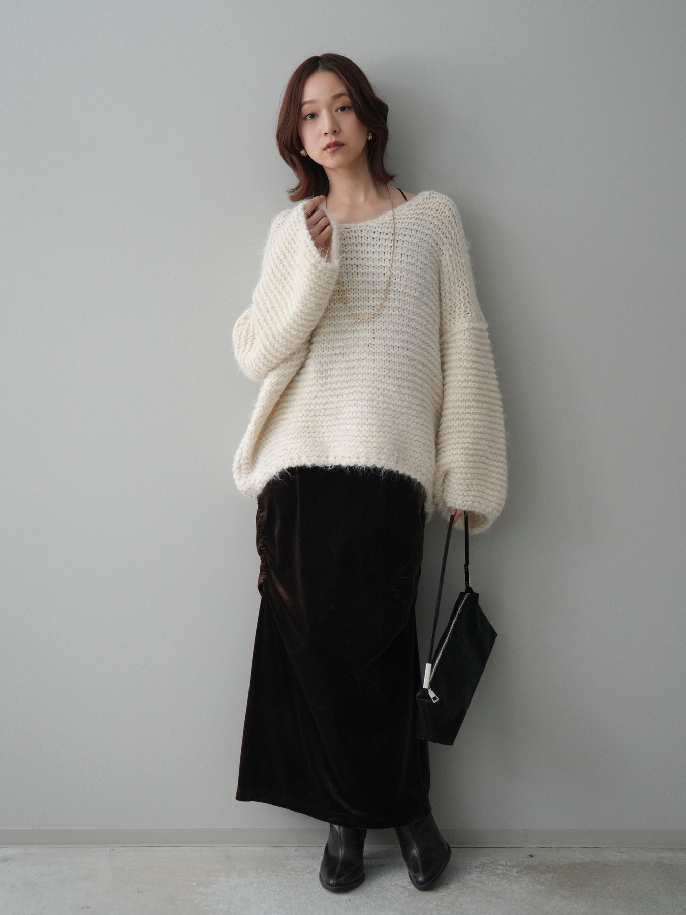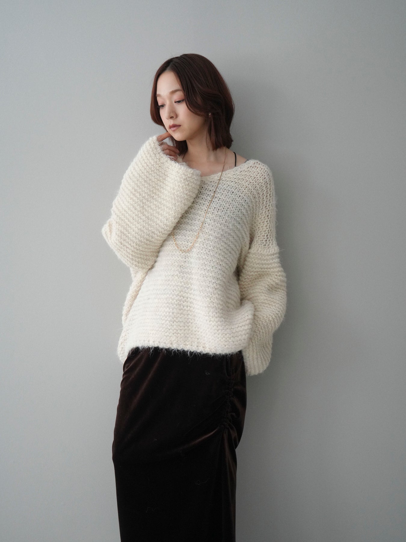 [SET]ワッフル編みシャギーニットプルオーバー+ギャザーベロアスカート(2set)