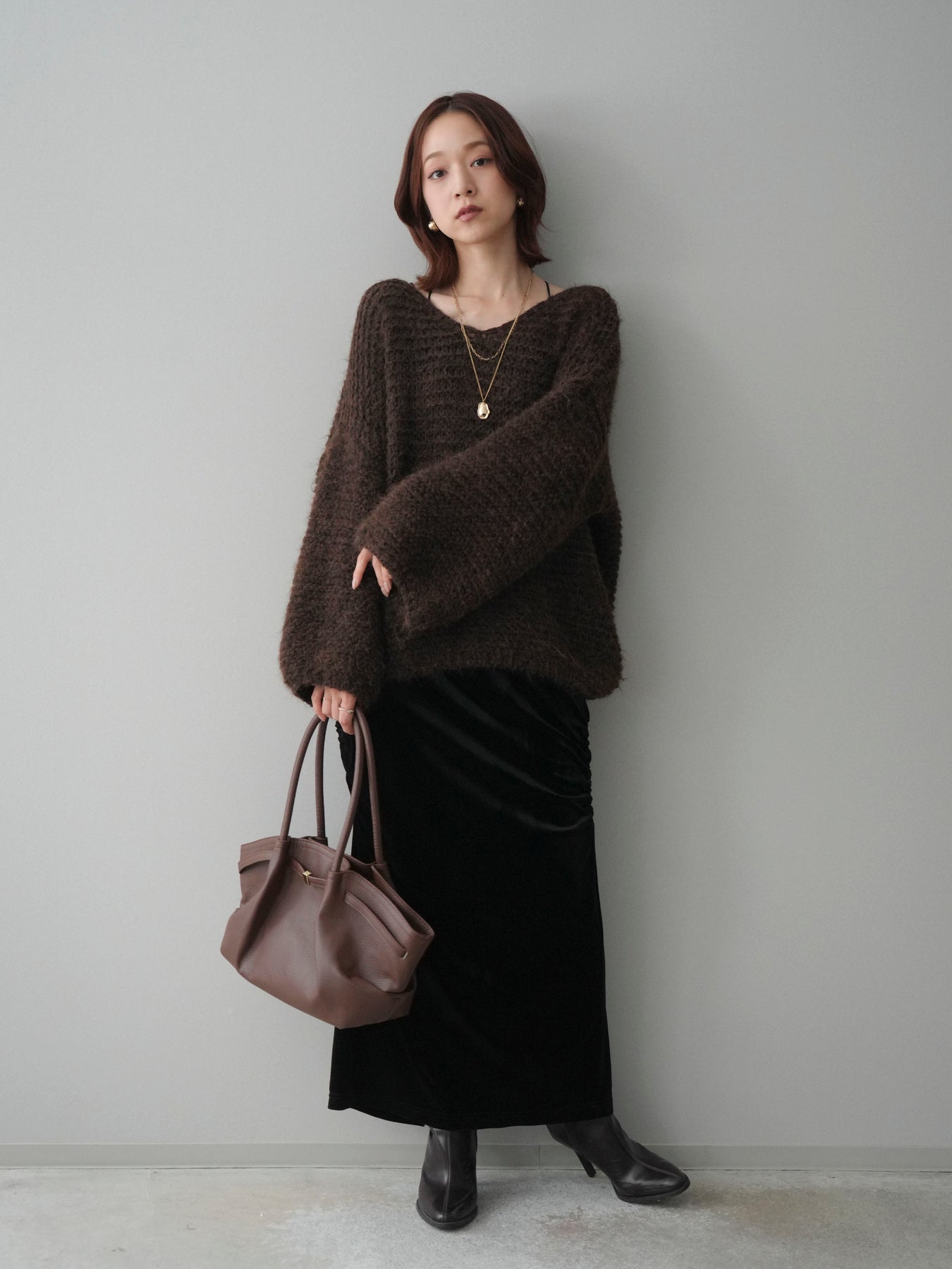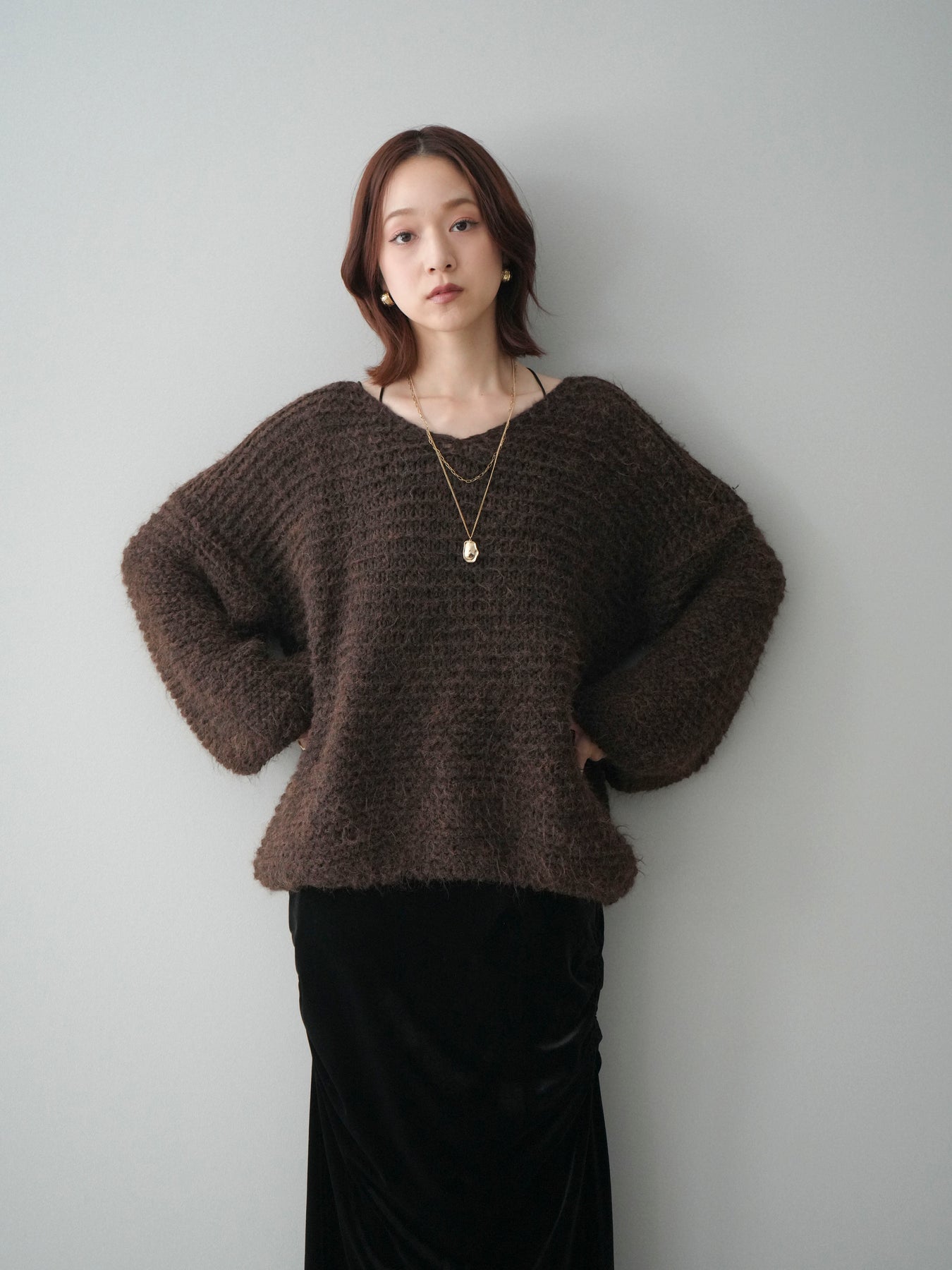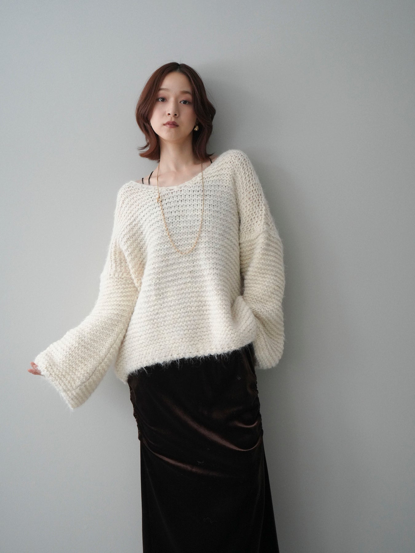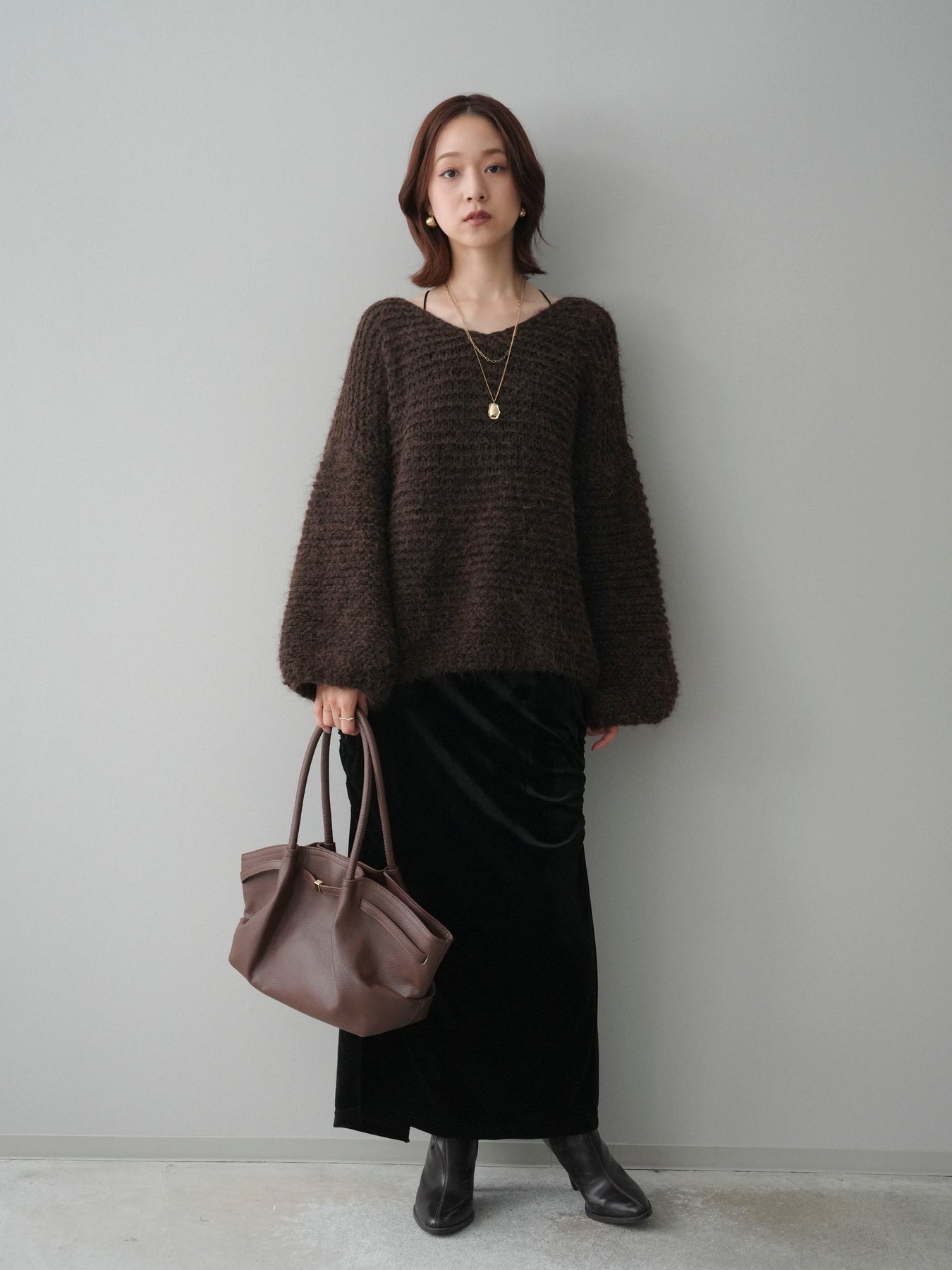 [SET]ワッフル編みシャギーニットプルオーバー+ギャザーベロアスカート(2set)