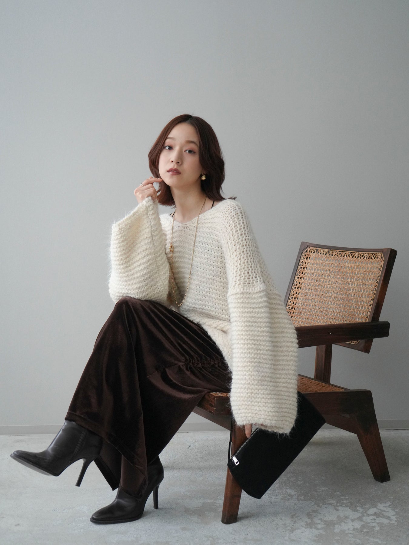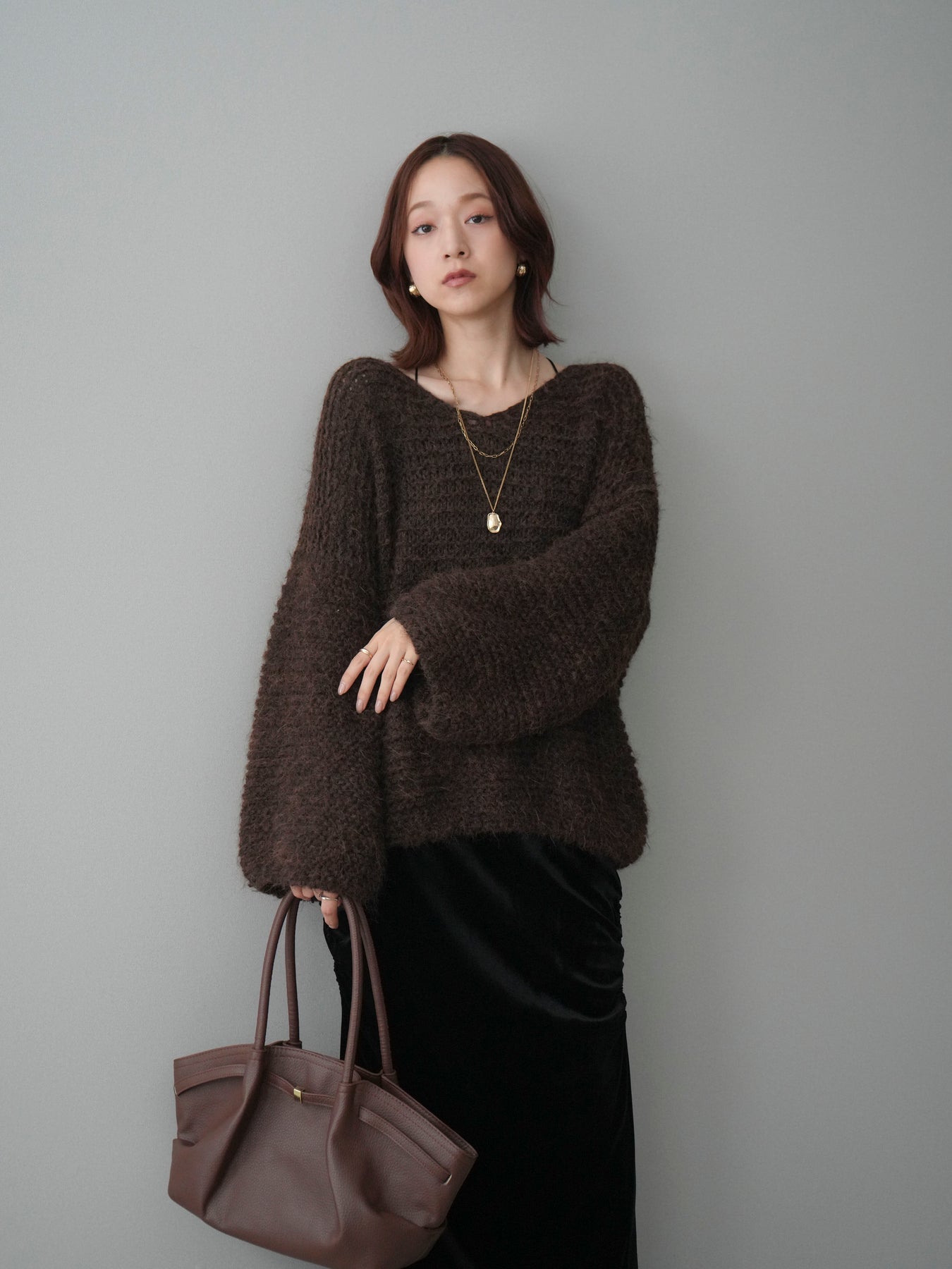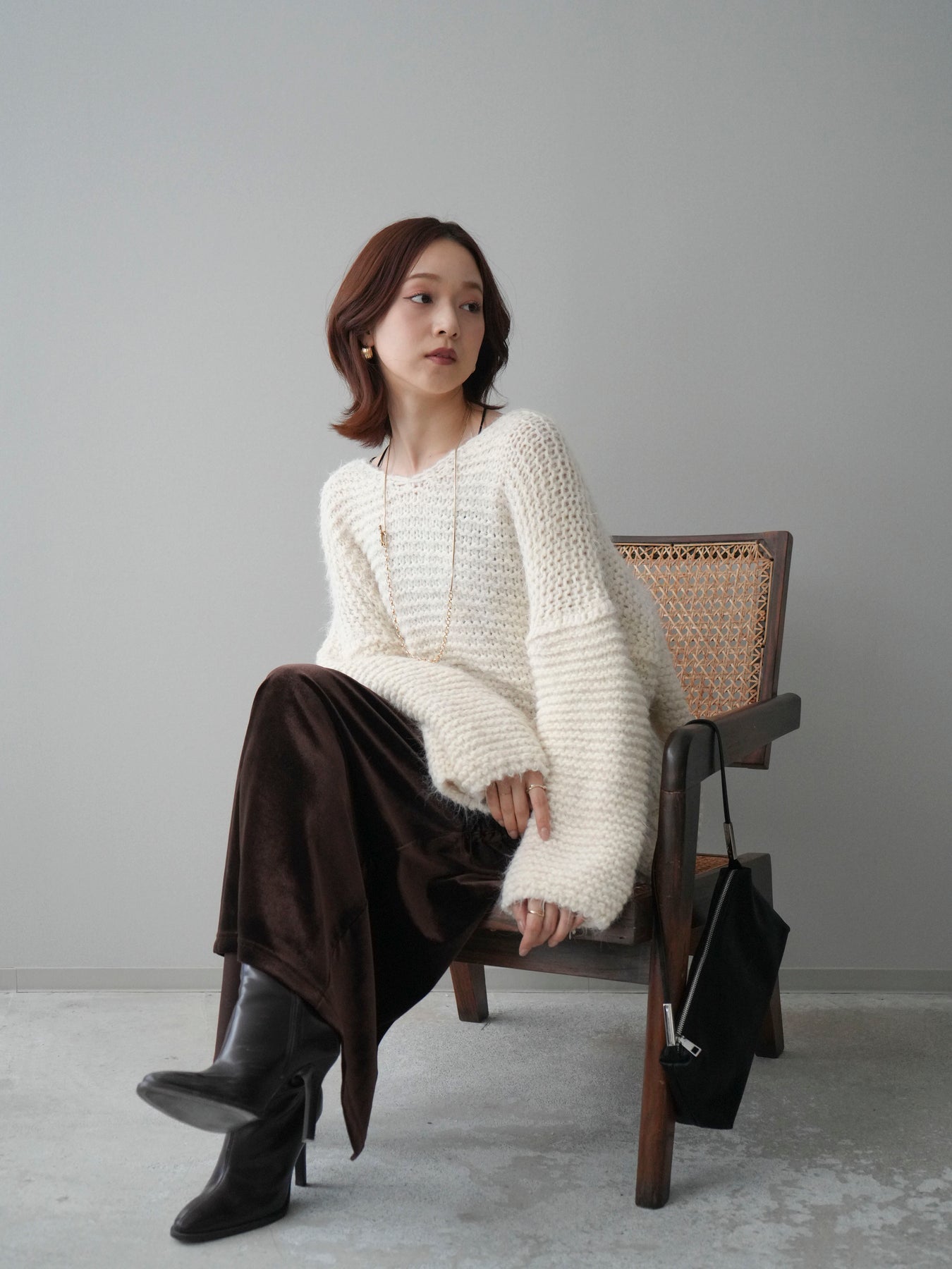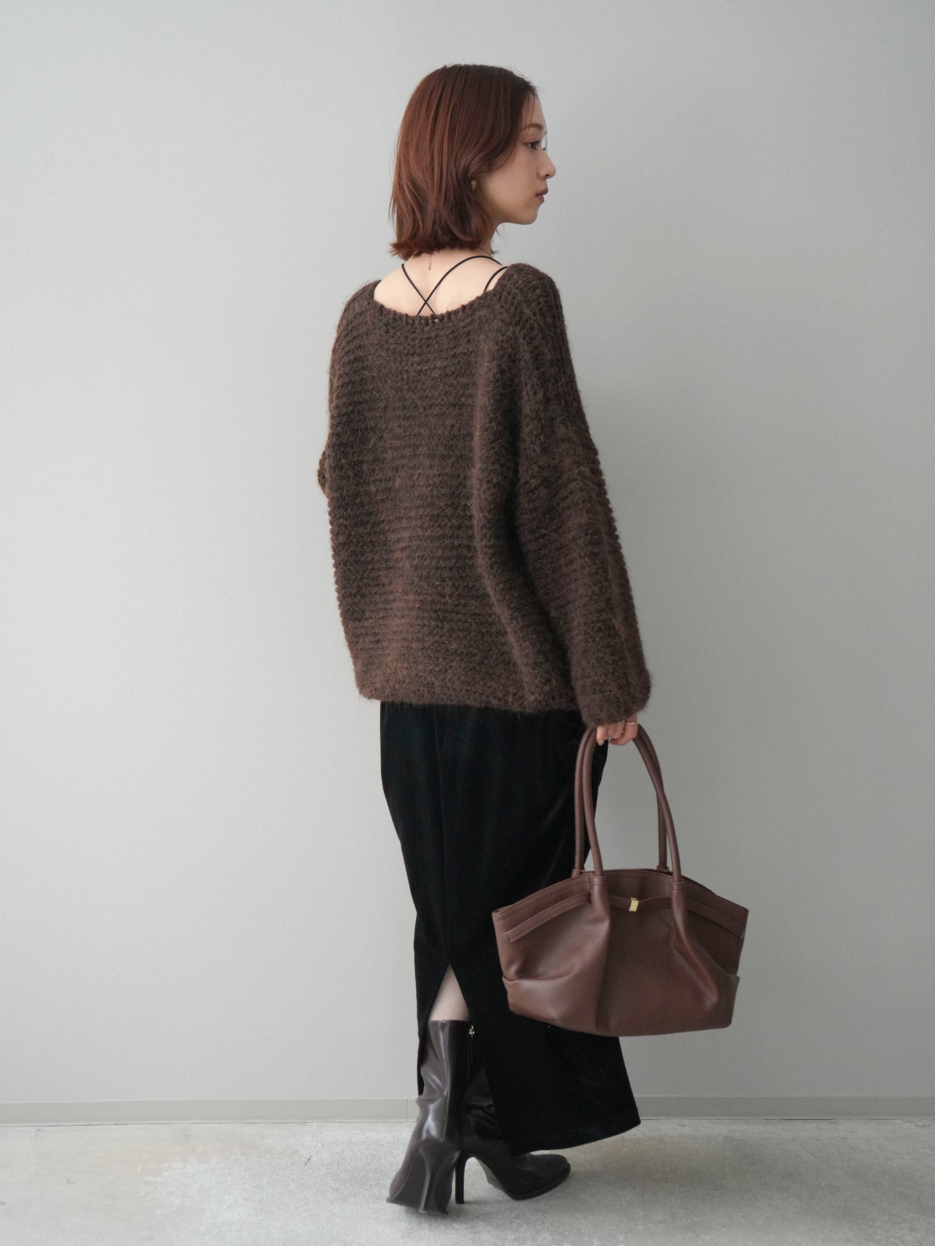 [SET]ワッフル編みシャギーニットプルオーバー+ギャザーベロアスカート(2set)