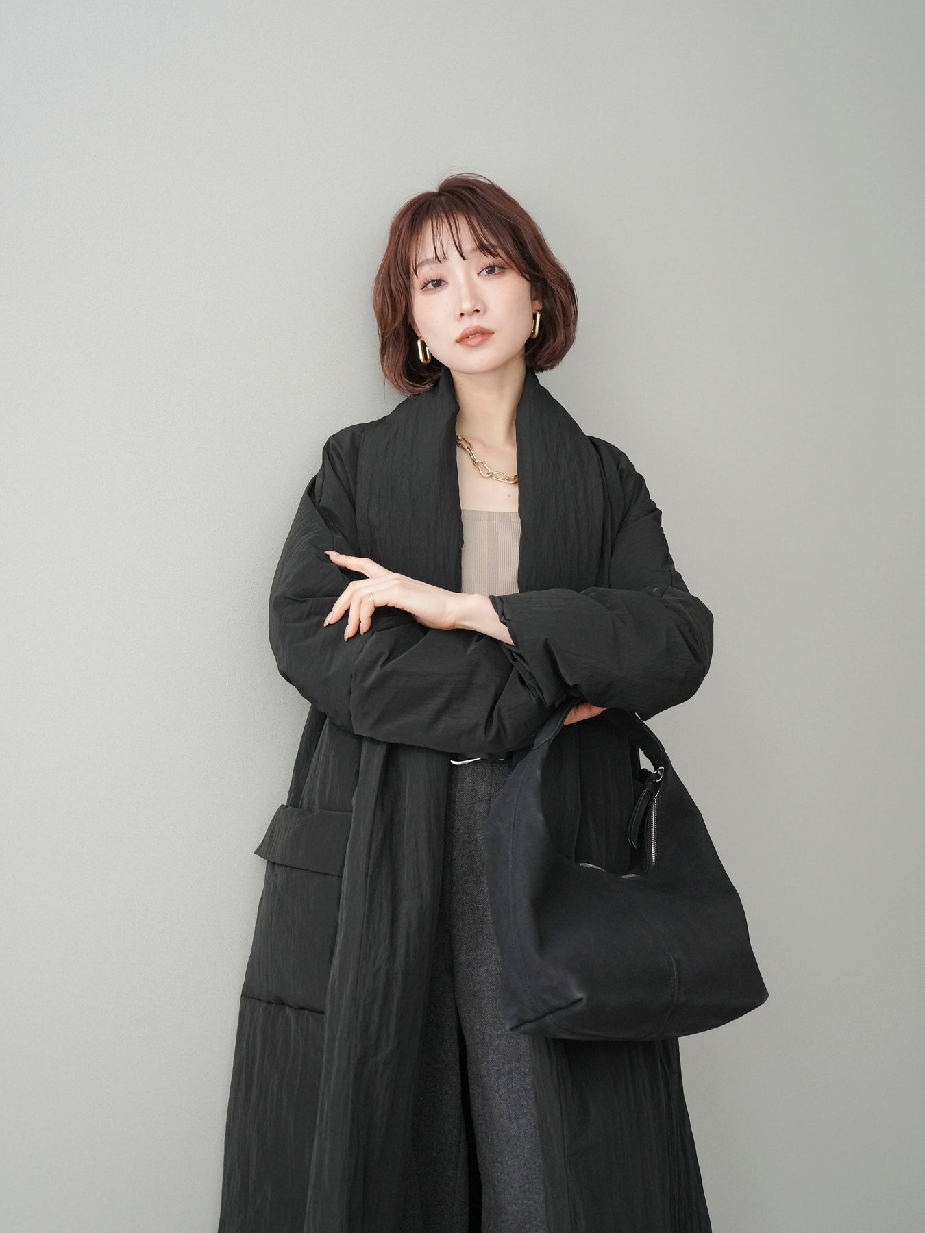 すっきりとした縦のラインが印象的なロング丈ダウンコート。程よくゆとりのあるシルエットで、厚手のトップスの上からも羽織りやすく、スタイリングを選ばず活躍します。軽やかな着心地ながら、シーズンムードを高めてくれる一着です。