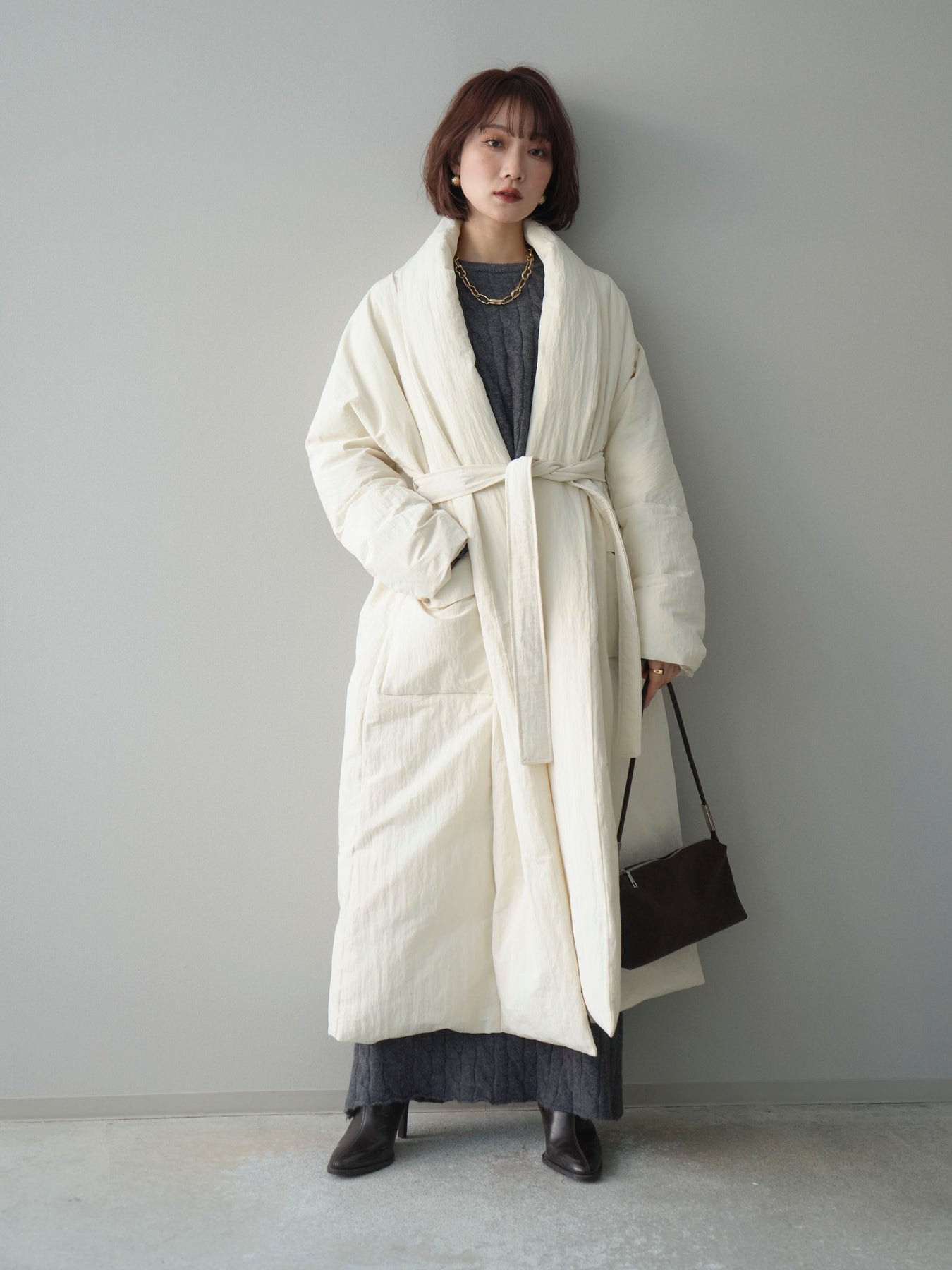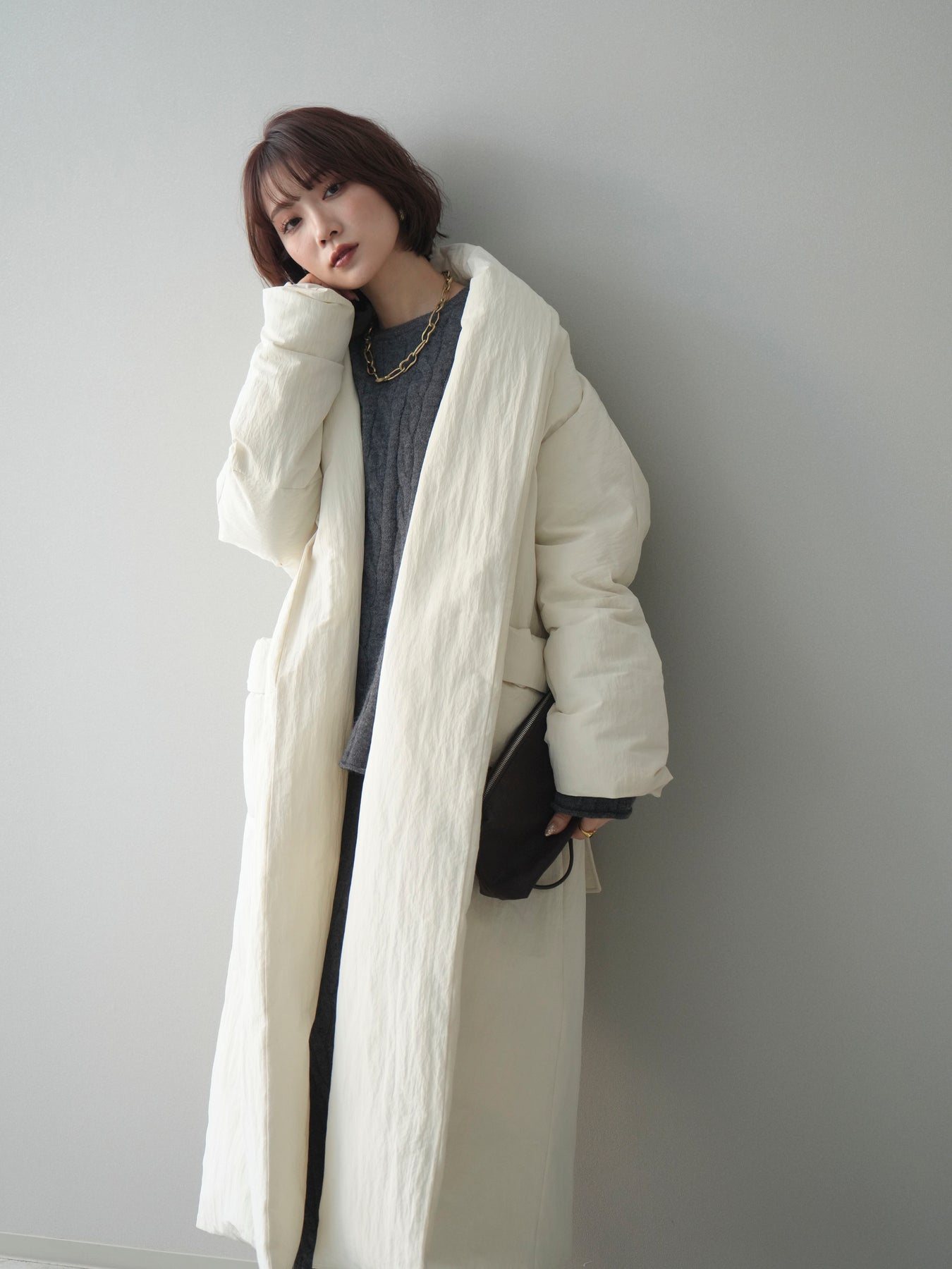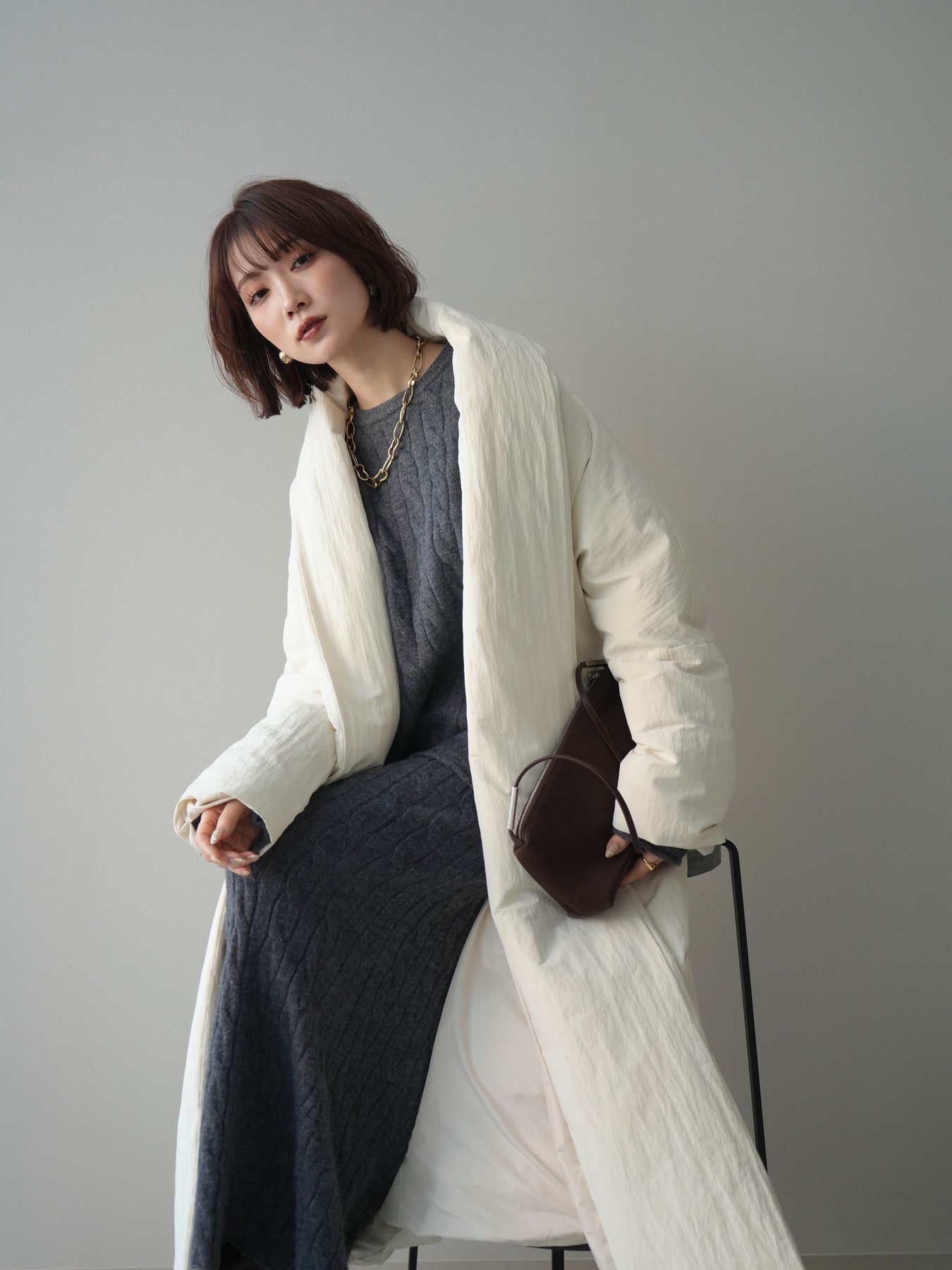 すっきりとした縦のラインが印象的なロング丈ダウンコート。程よくゆとりのあるシルエットで、厚手のトップスの上からも羽織りやすく、スタイリングを選ばず活躍します。軽やかな着心地ながら、シーズンムードを高めてくれる一着です。