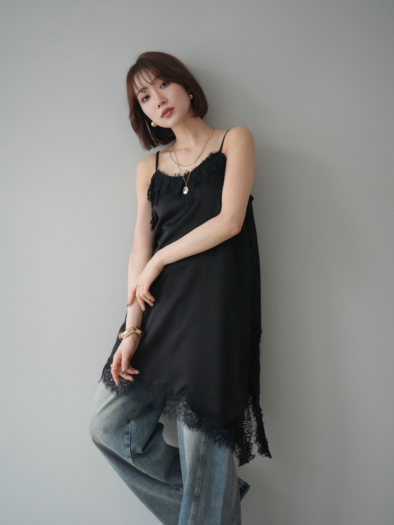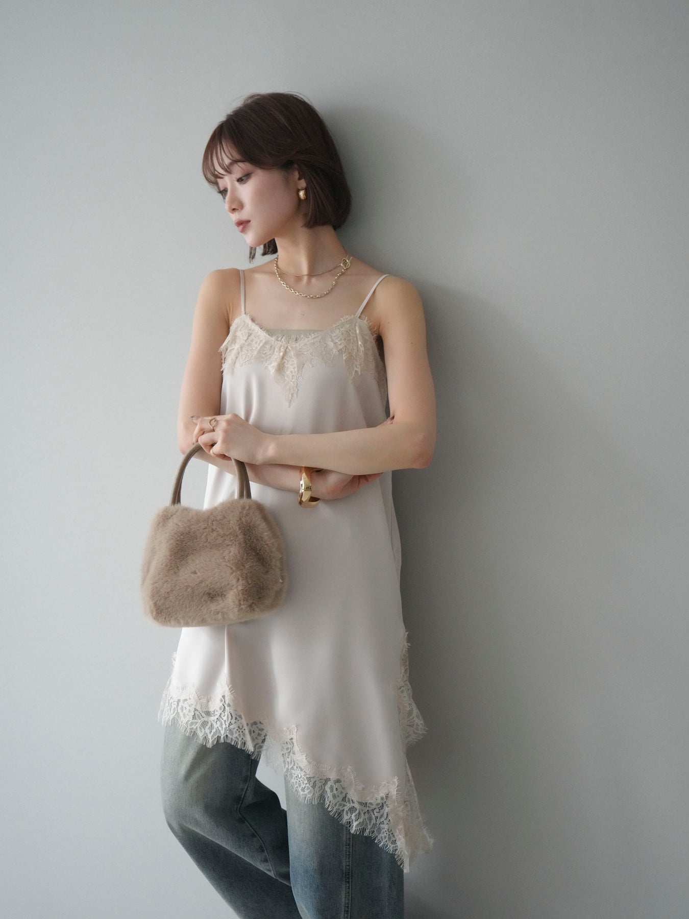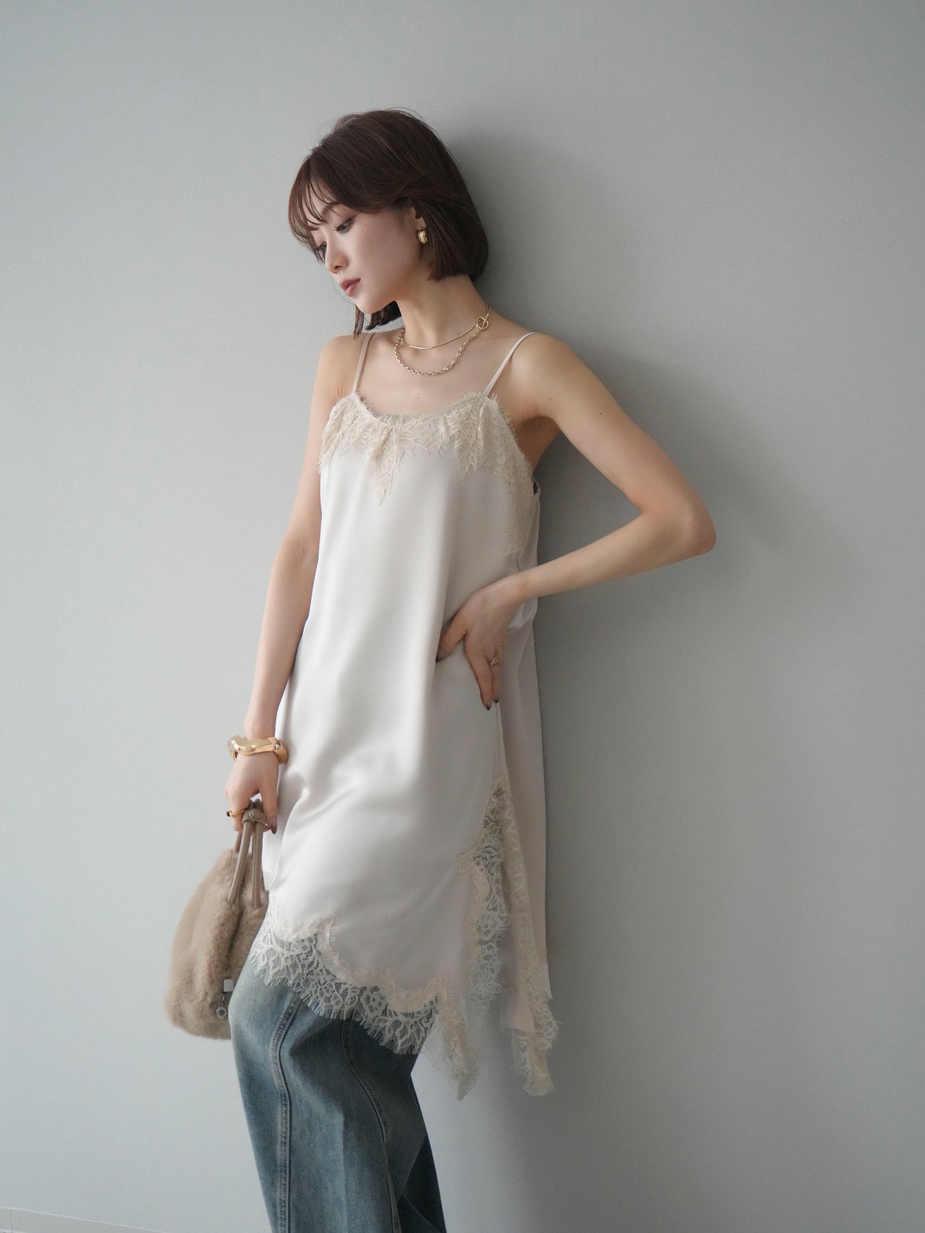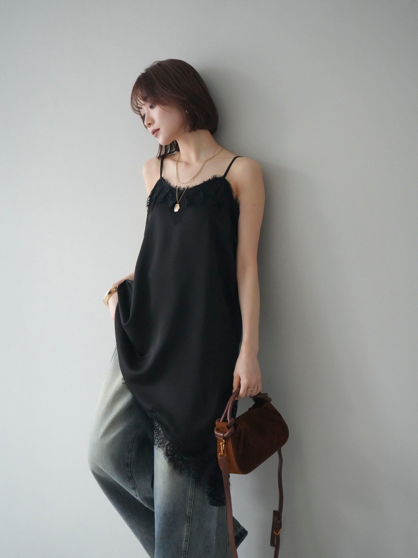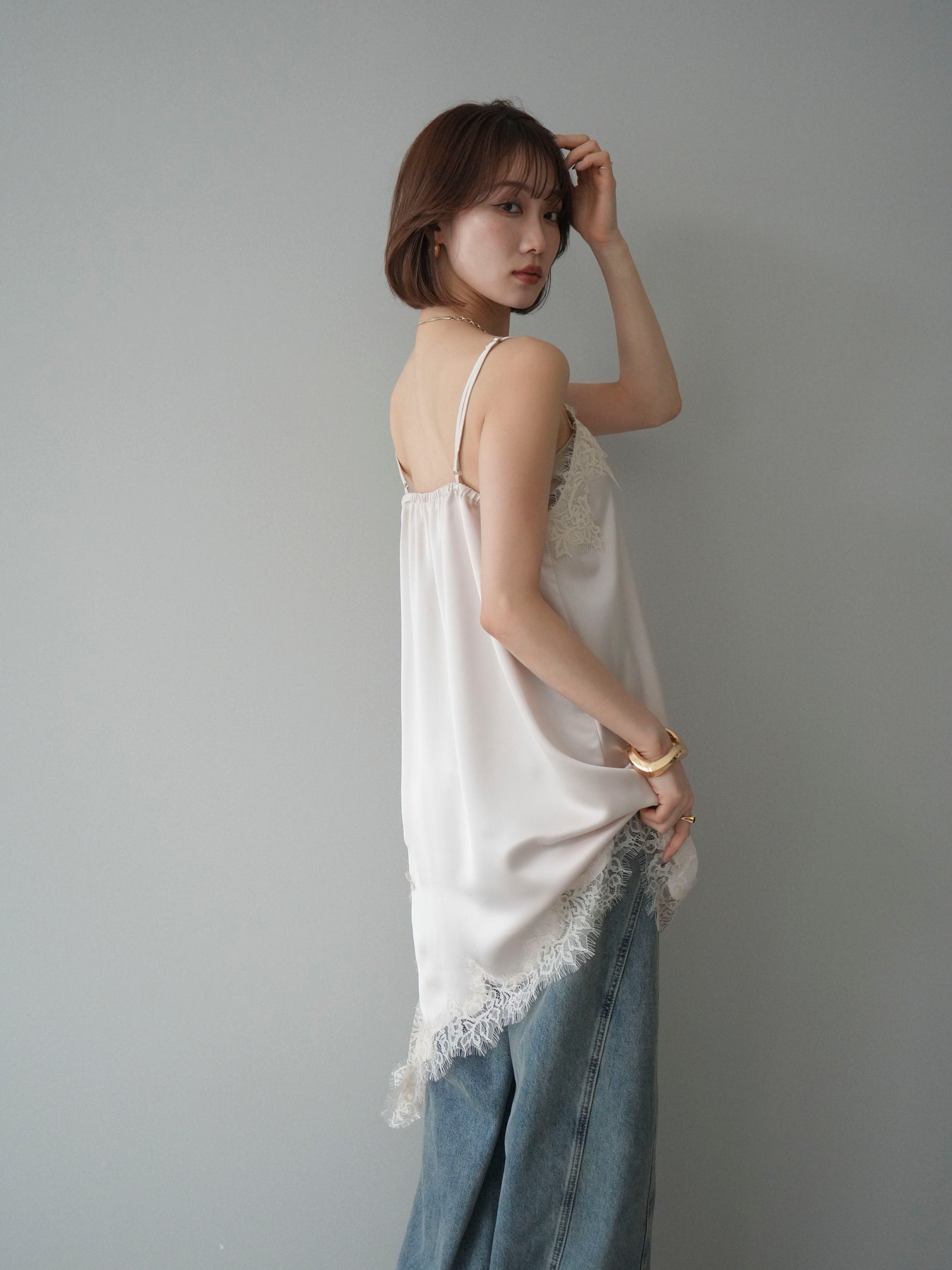 艶やかなサテン素材にレースを組み合わせた、表情豊かなキャミソール。 滑らかな落ち感のある生地が身体のラインに自然に沿い、軽やかな動きを生み出します。裾とネックラインにあしらったレースが、シンプルな中にさりげない奥行きを添えるデザインです。 アシンメトリーなシルエットがポイントとなり、1枚で着ても存在感のある仕上がりに。インナーとして取り入れた際も、レイヤードスタイルのアクセントとして映えます。ストラップは華奢な仕様で、全体をすっきりと見せてくれるのも魅力です。 デニムやスラックスと合わせてラフに、ジャケットやカーディガンのインに重ねてきちんと感のある着こなしにも対応。幅広いスタイリングに取り入れやすい、予約アイテムとして揃えておきたいキャミソールです。 ※ボトムス、キャミソール(インナー)以外の商品は一律でインナーは付属していません。