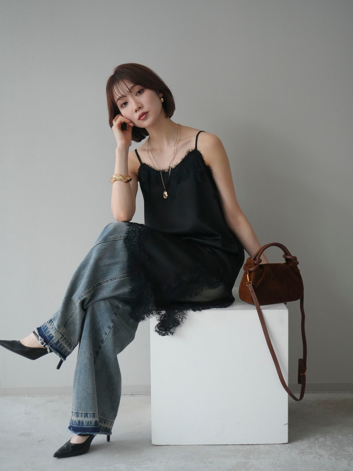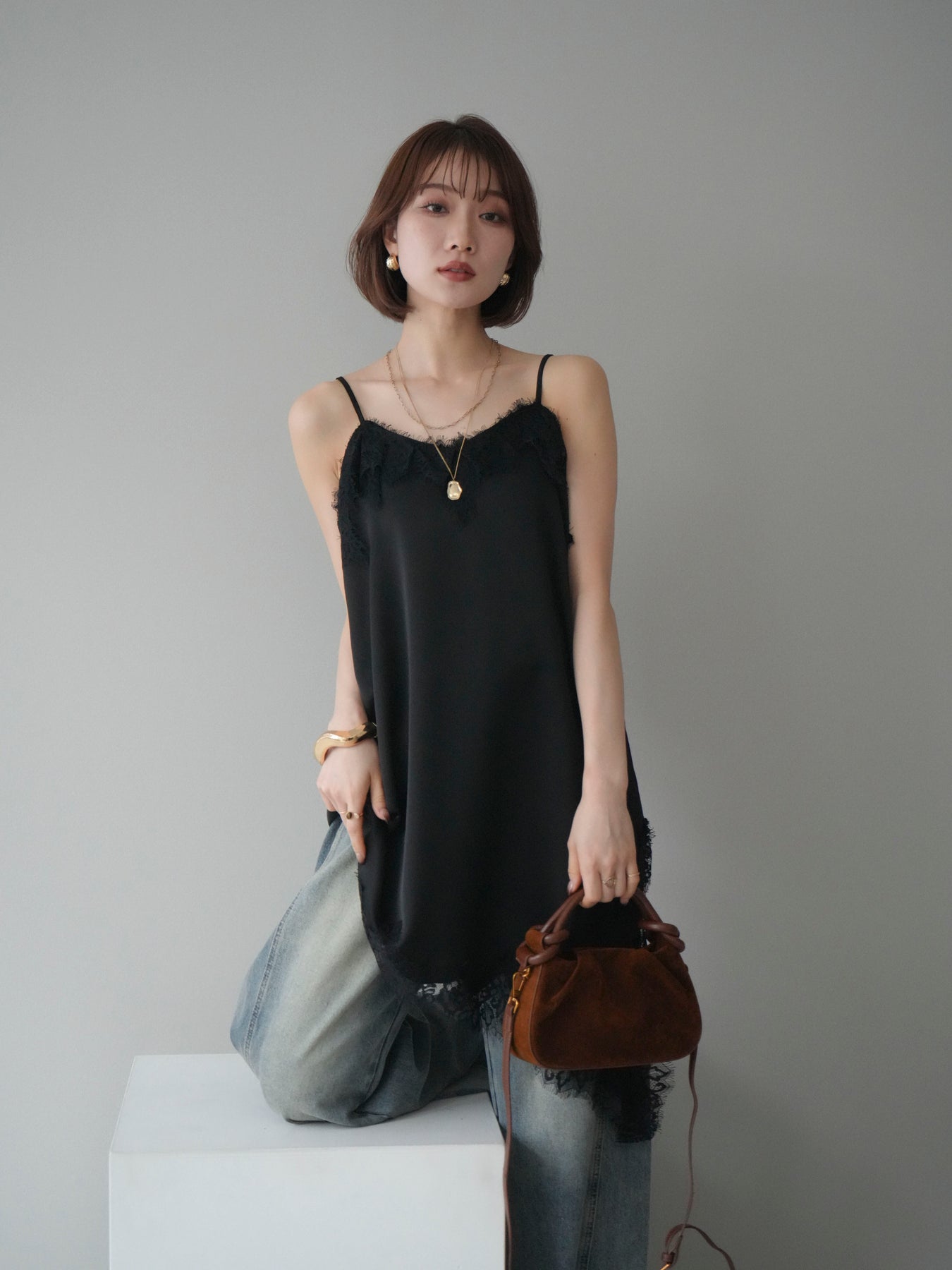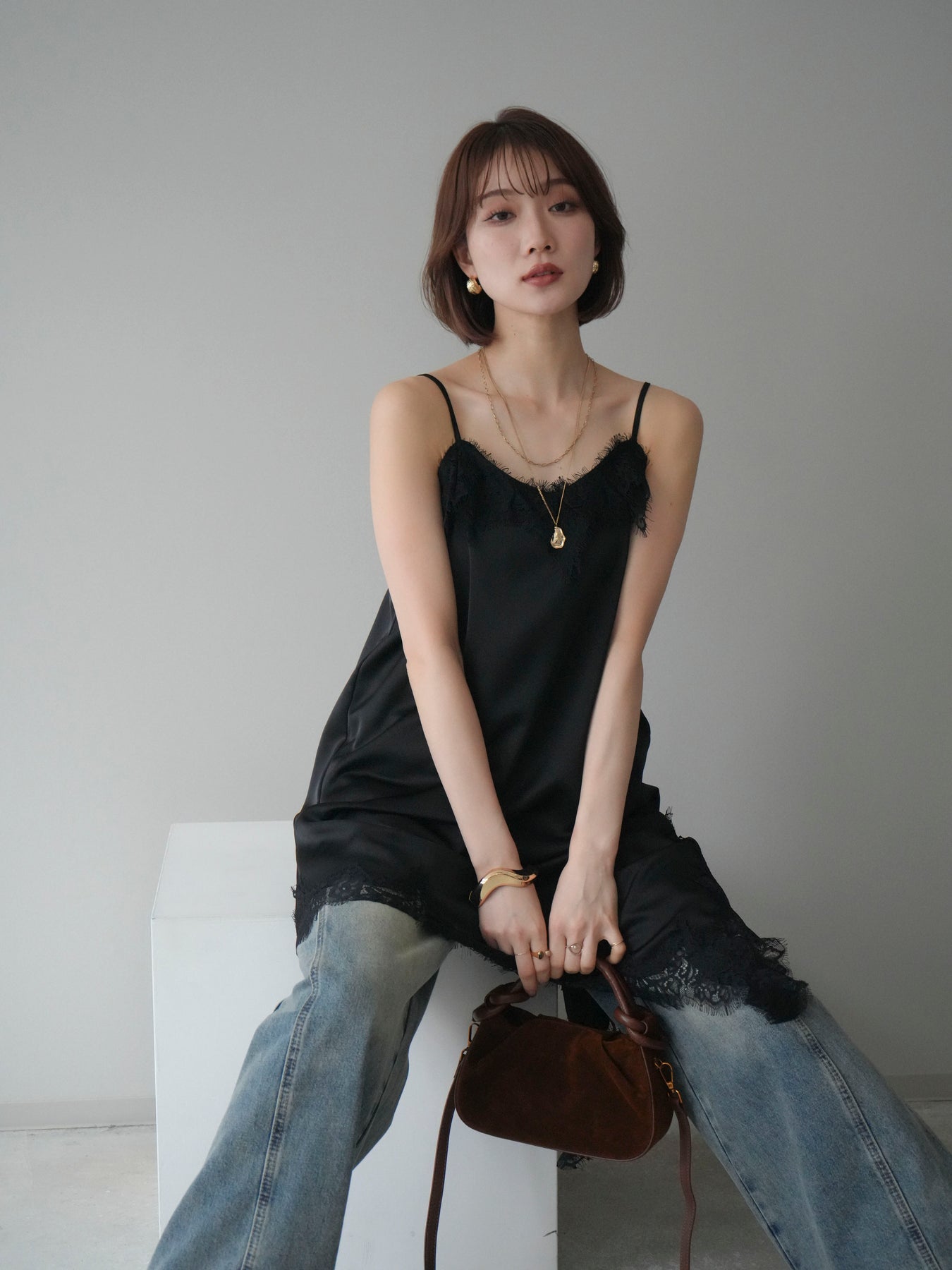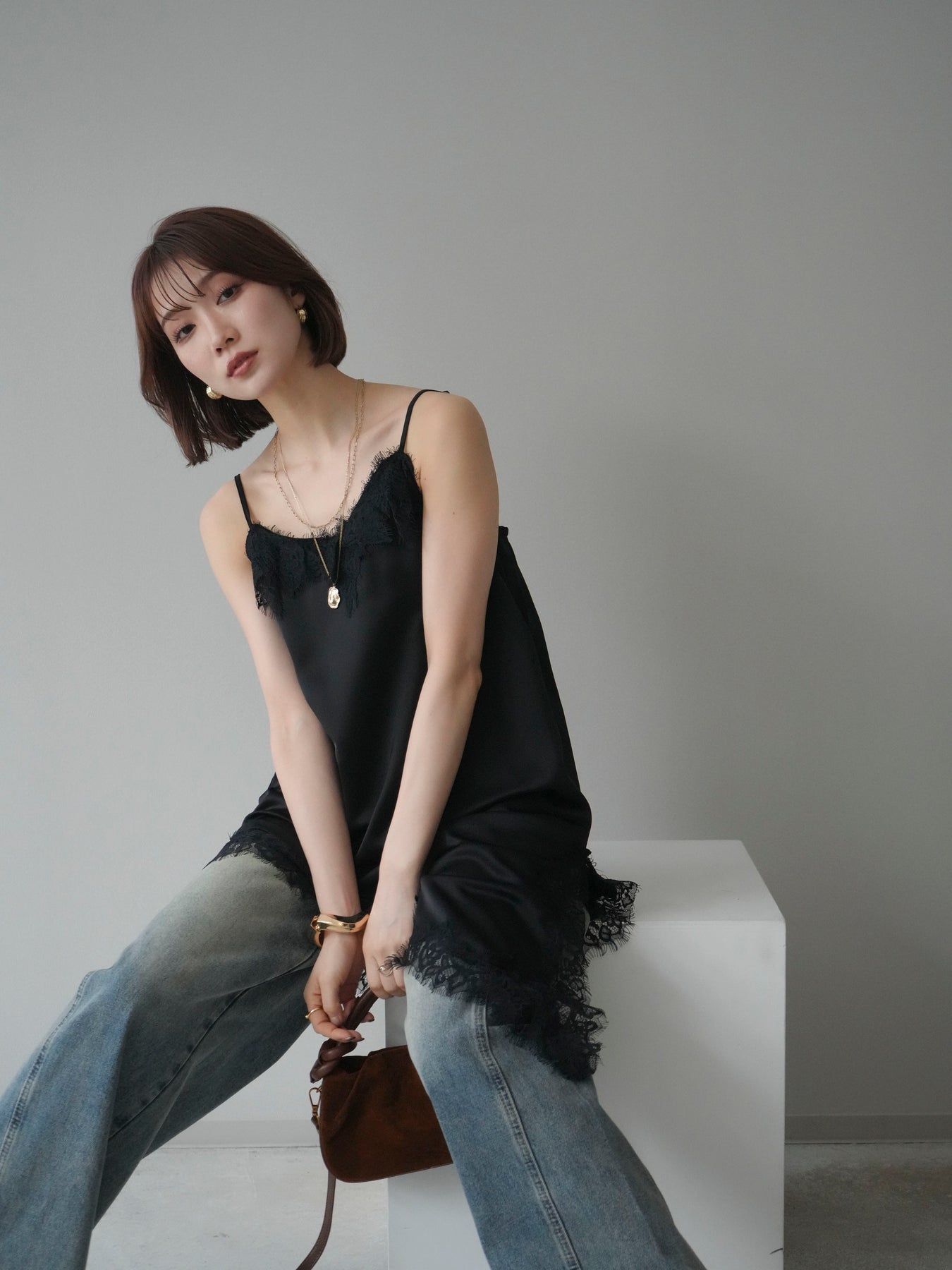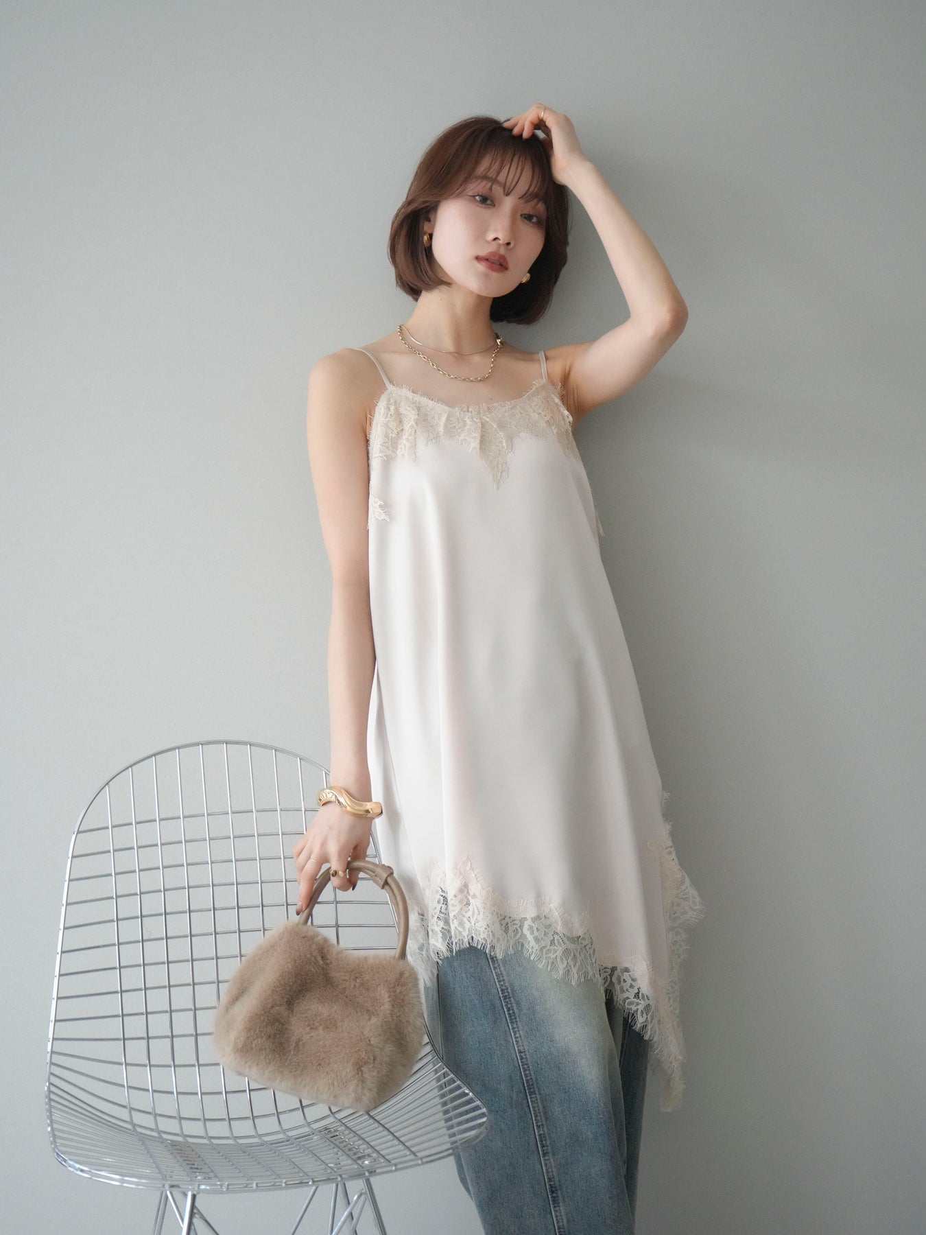 艶やかなサテン素材にレースを組み合わせた、表情豊かなキャミソール。 滑らかな落ち感のある生地が身体のラインに自然に沿い、軽やかな動きを生み出します。裾とネックラインにあしらったレースが、シンプルな中にさりげない奥行きを添えるデザインです。 アシンメトリーなシルエットがポイントとなり、1枚で着ても存在感のある仕上がりに。インナーとして取り入れた際も、レイヤードスタイルのアクセントとして映えます。ストラップは華奢な仕様で、全体をすっきりと見せてくれるのも魅力です。 デニムやスラックスと合わせてラフに、ジャケットやカーディガンのインに重ねてきちんと感のある着こなしにも対応。幅広いスタイリングに取り入れやすい、予約アイテムとして揃えておきたいキャミソールです。 ※ボトムス、キャミソール(インナー)以外の商品は一律でインナーは付属していません。