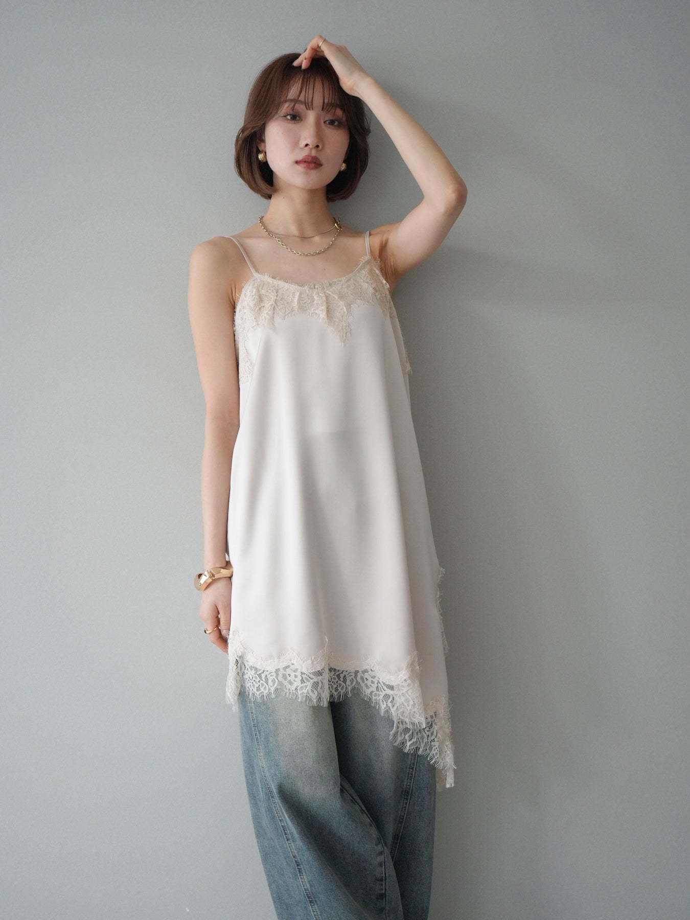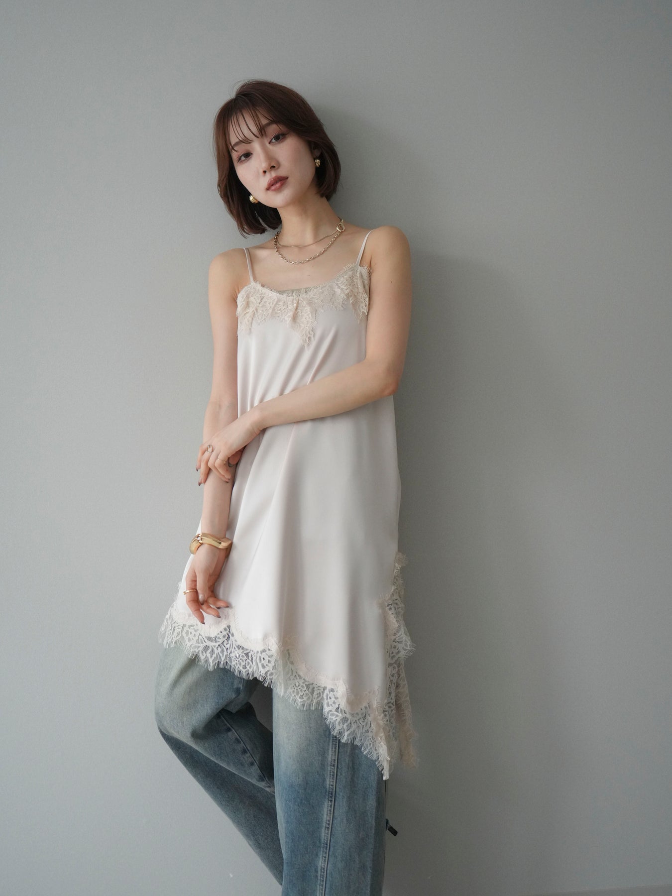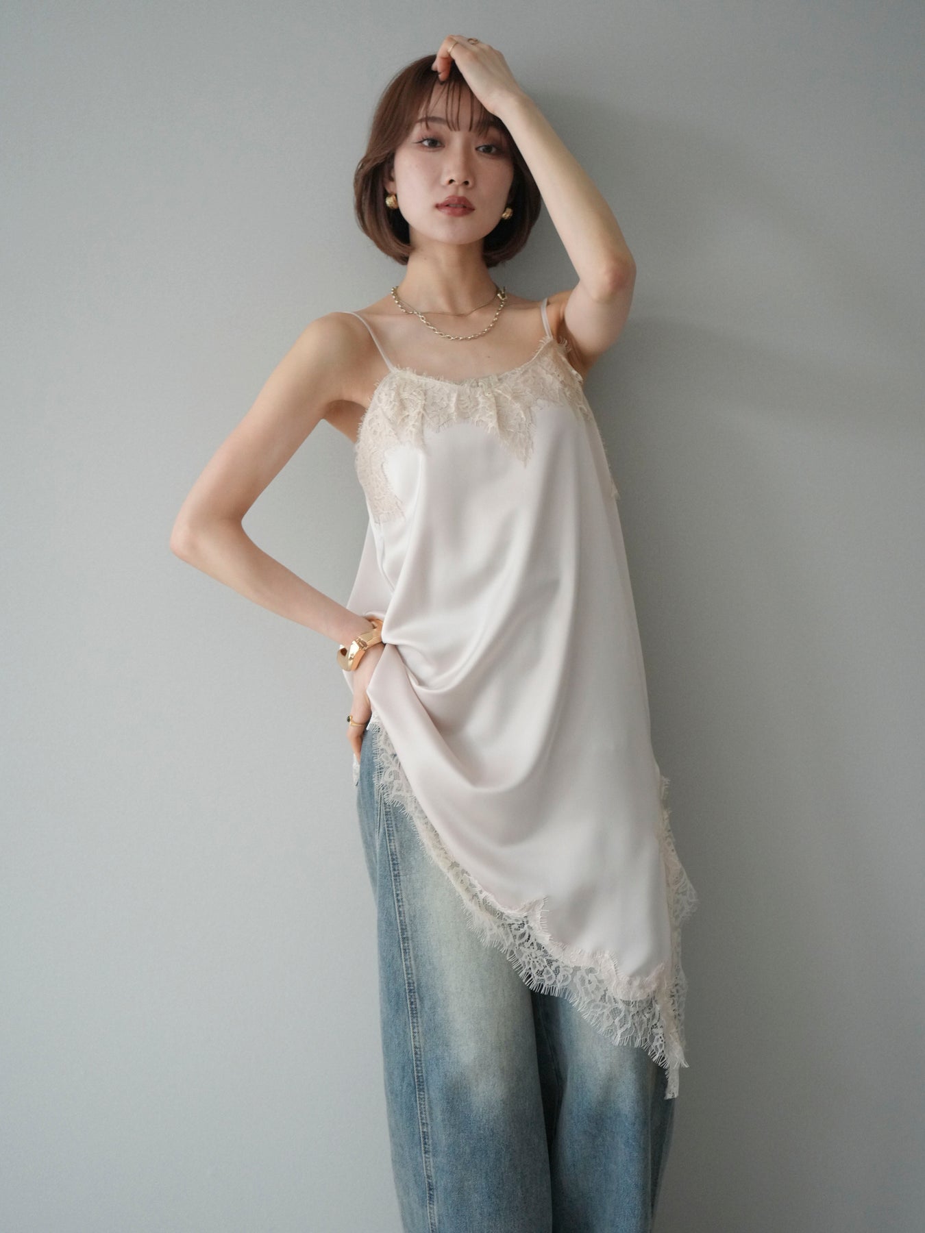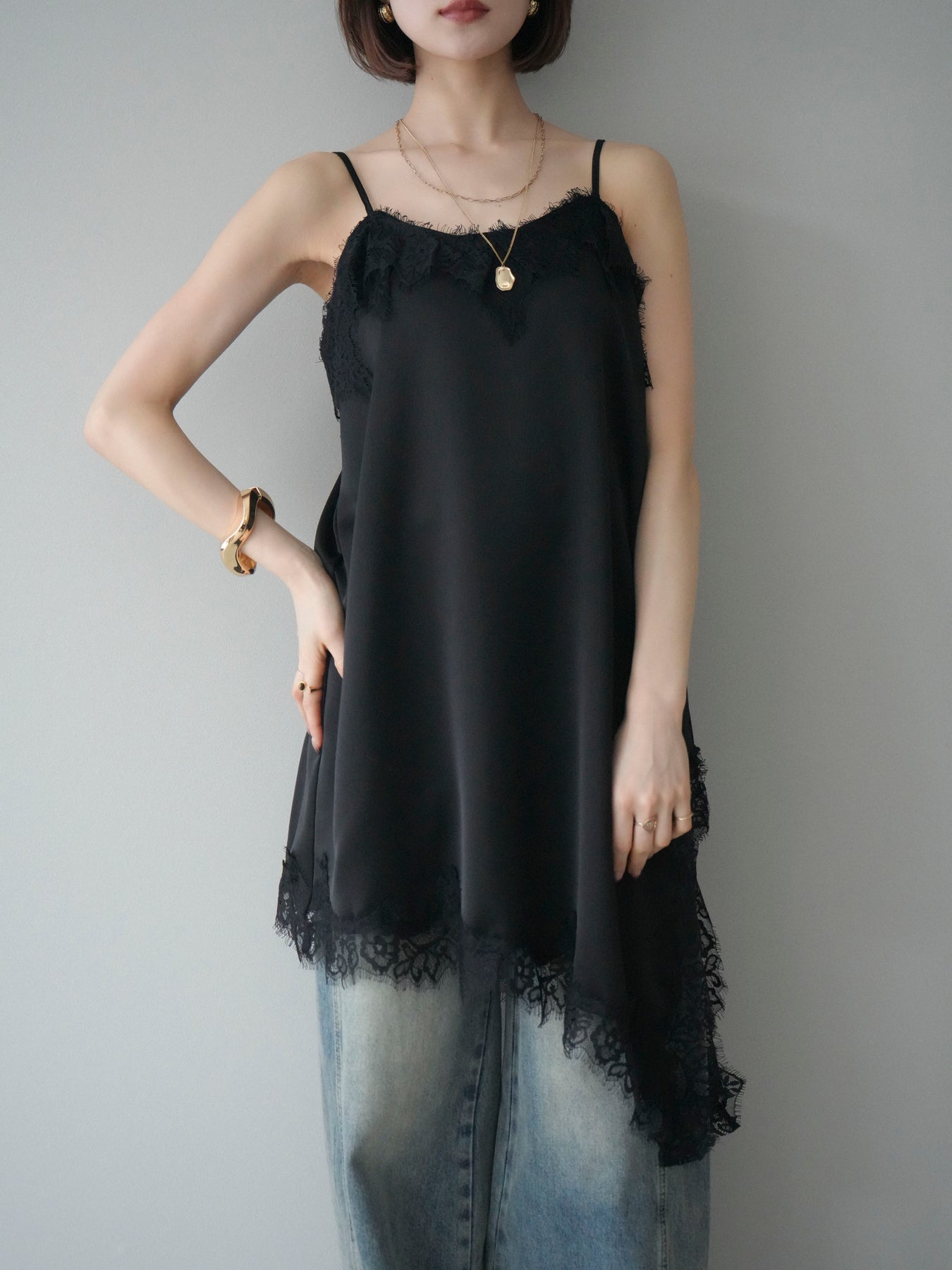 [SET]アシンメトリーサテンレースキャミソール+アシンメトリーサテンレースキャミソール(2set)