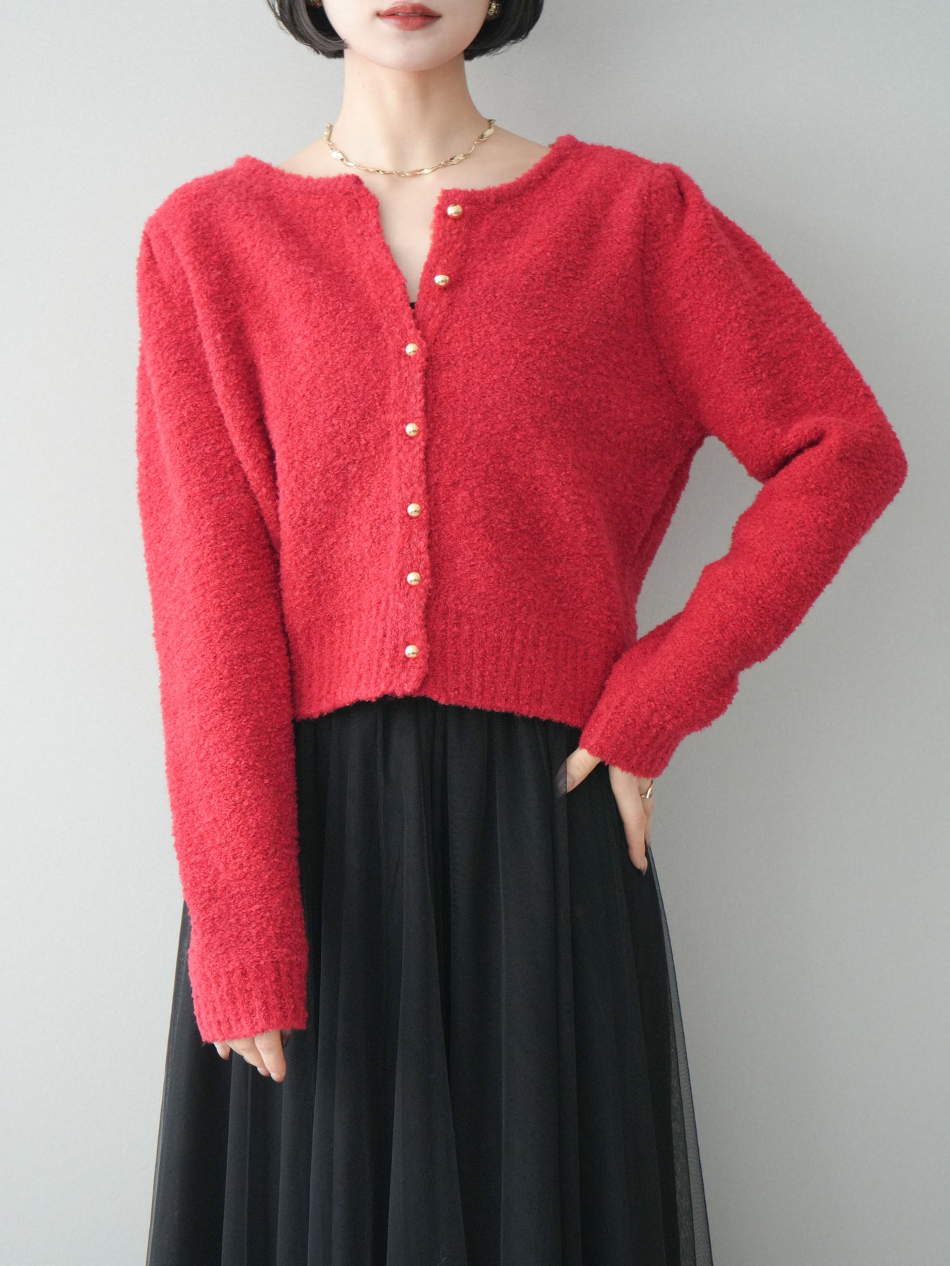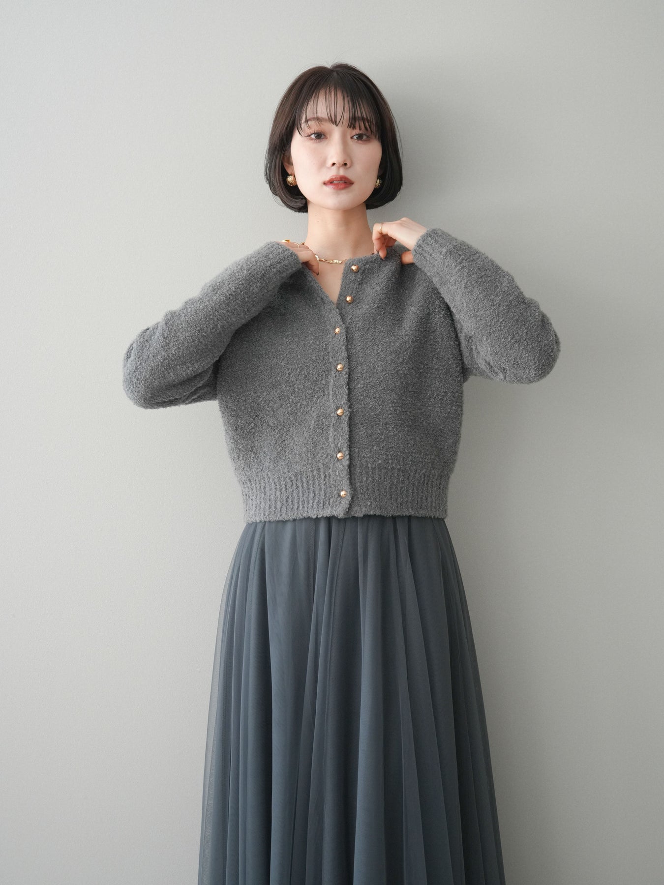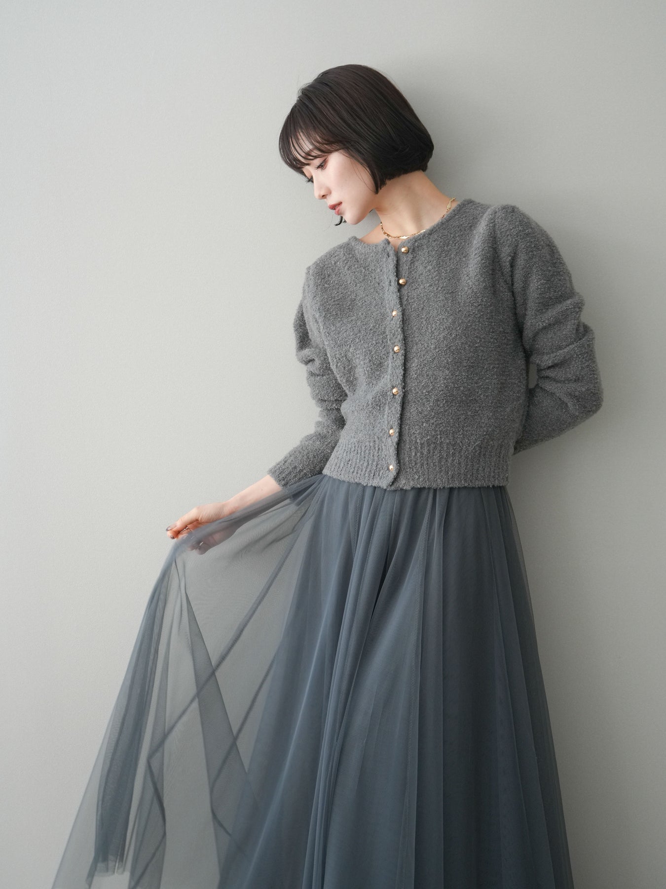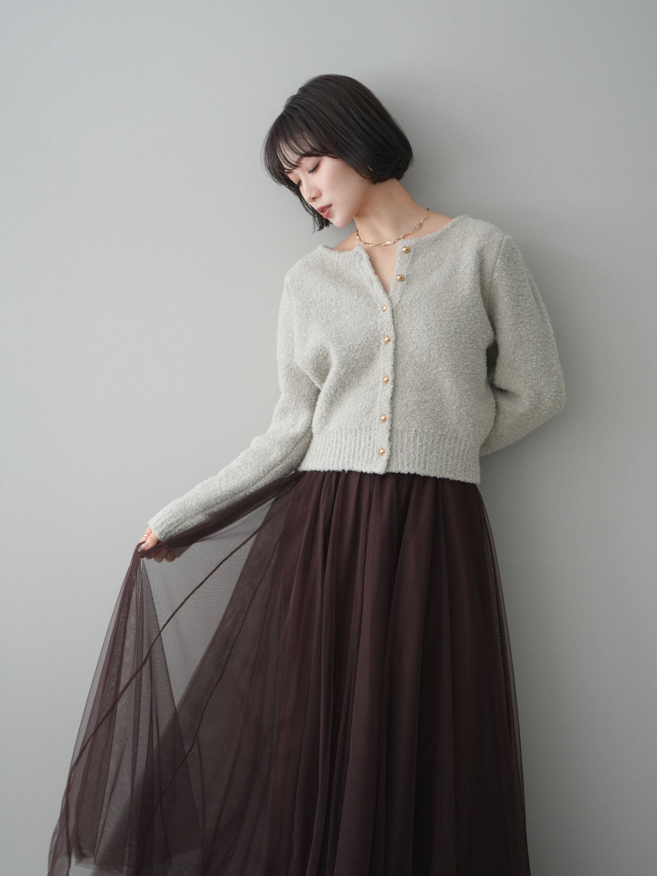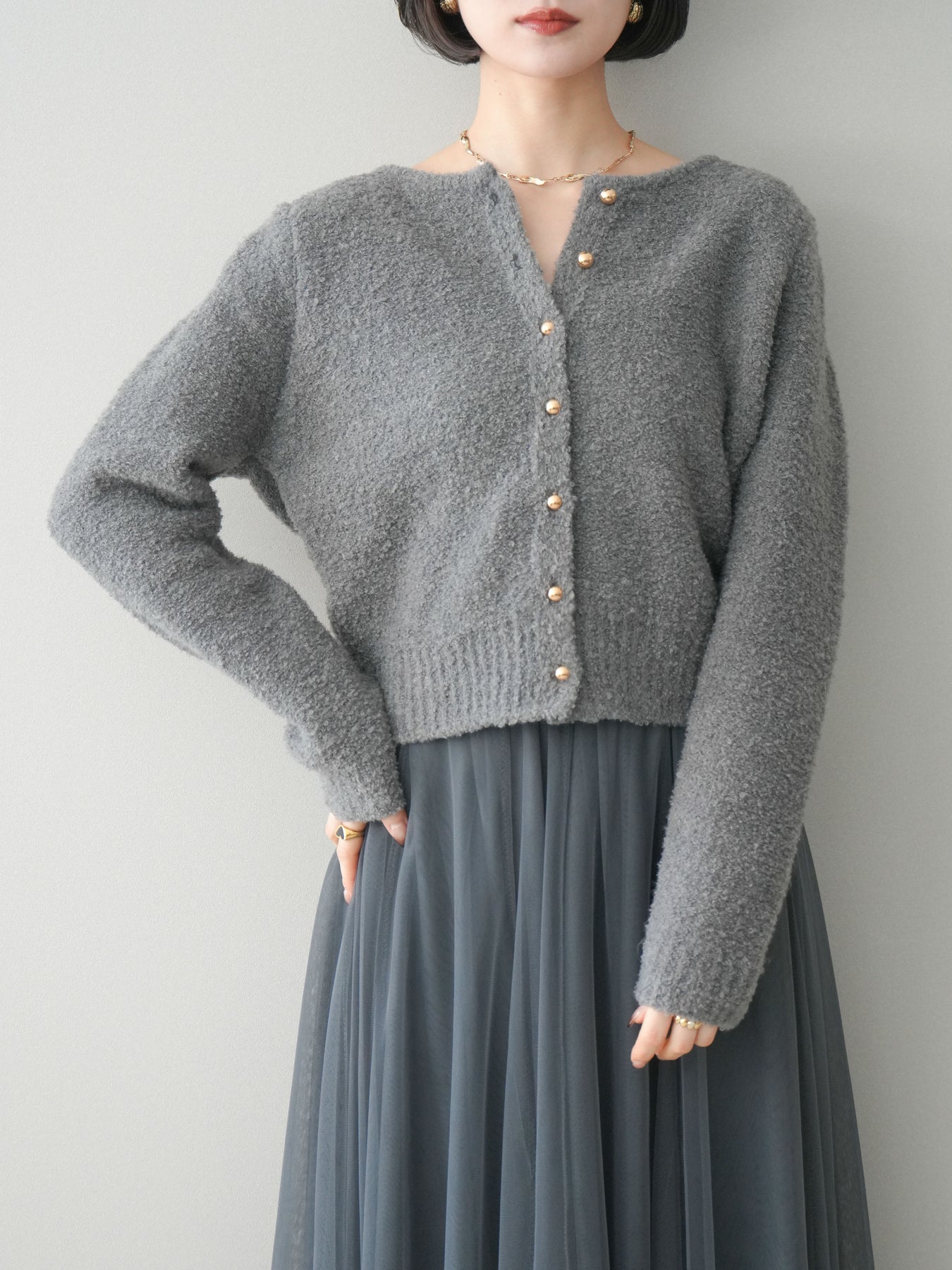 [SET]ゴールドボタンブークレニットカーディガン+チュールボリュームスカート(2set)