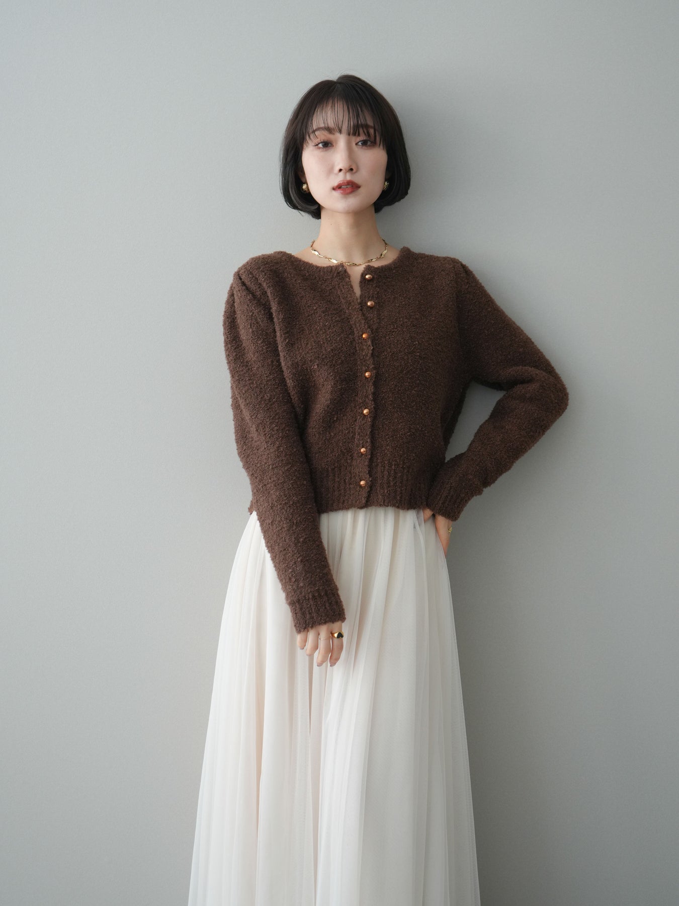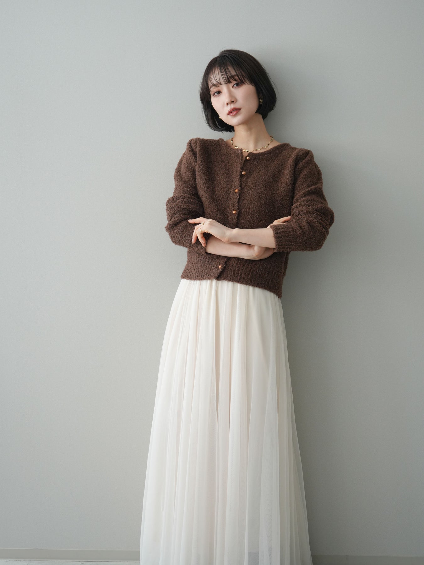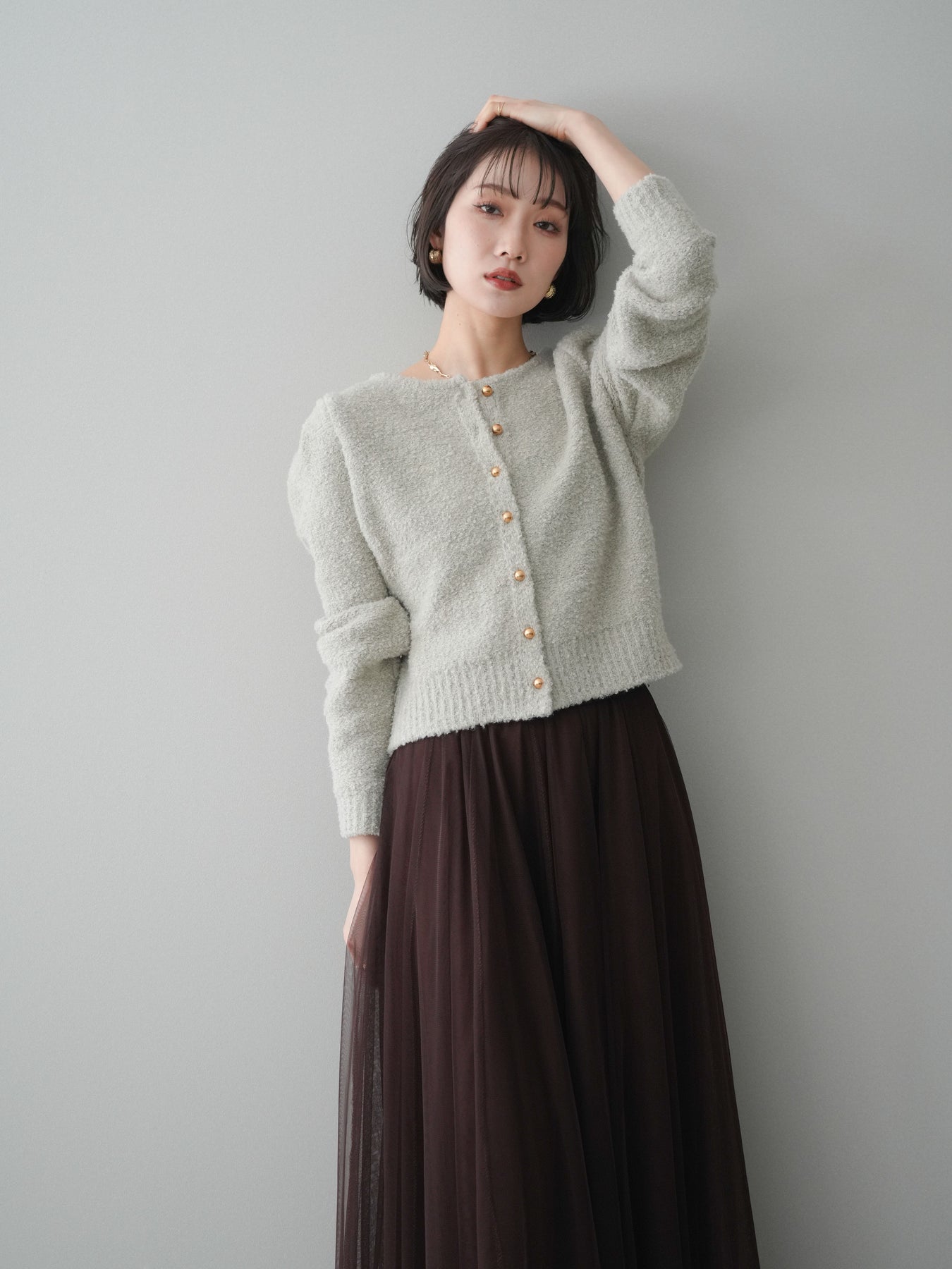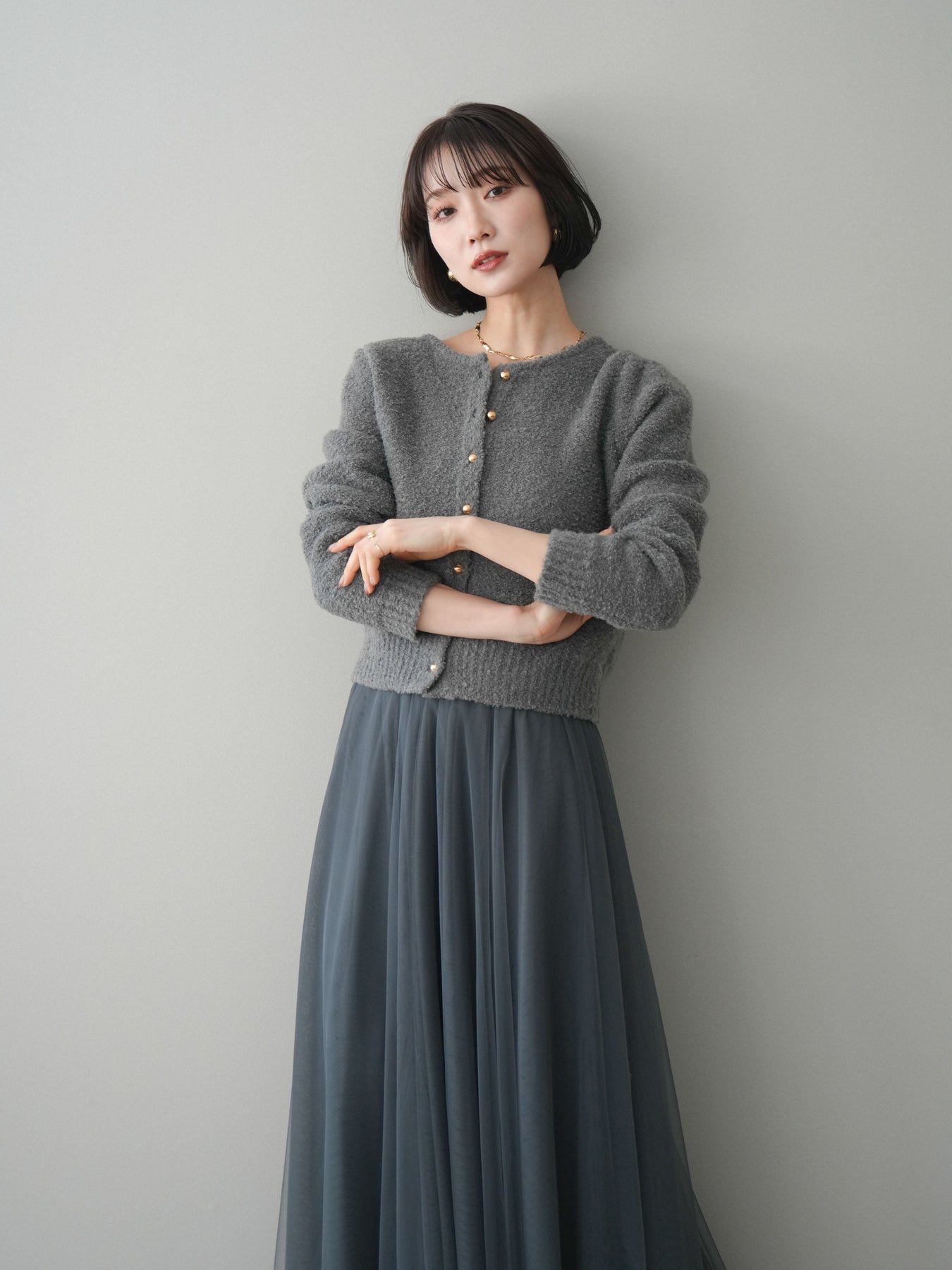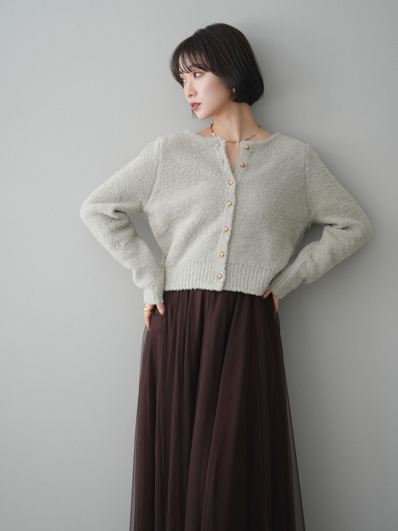 [SET]ゴールドボタンブークレニットカーディガン+チュールボリュームスカート(2set)