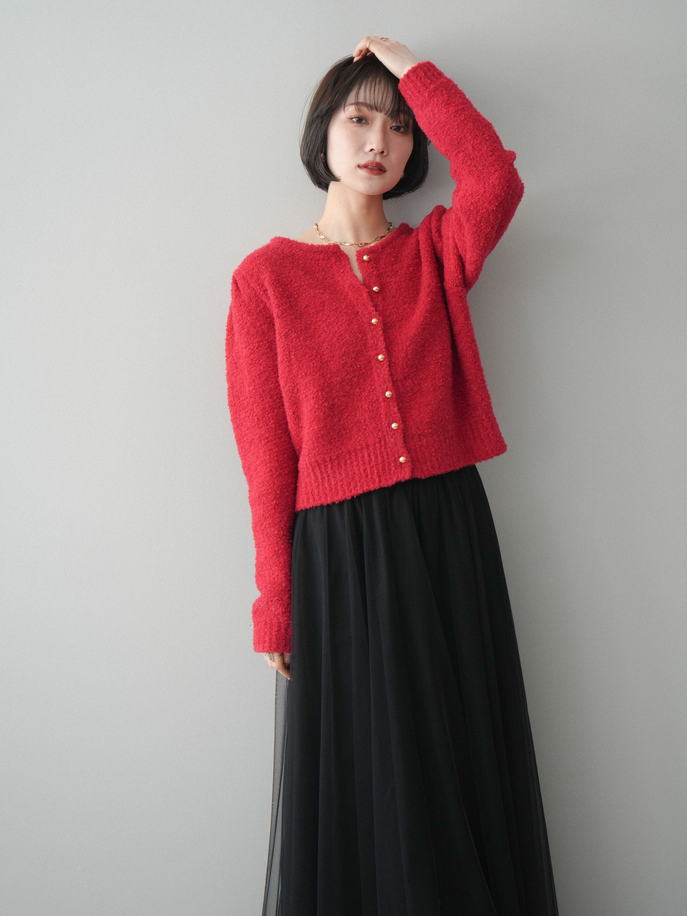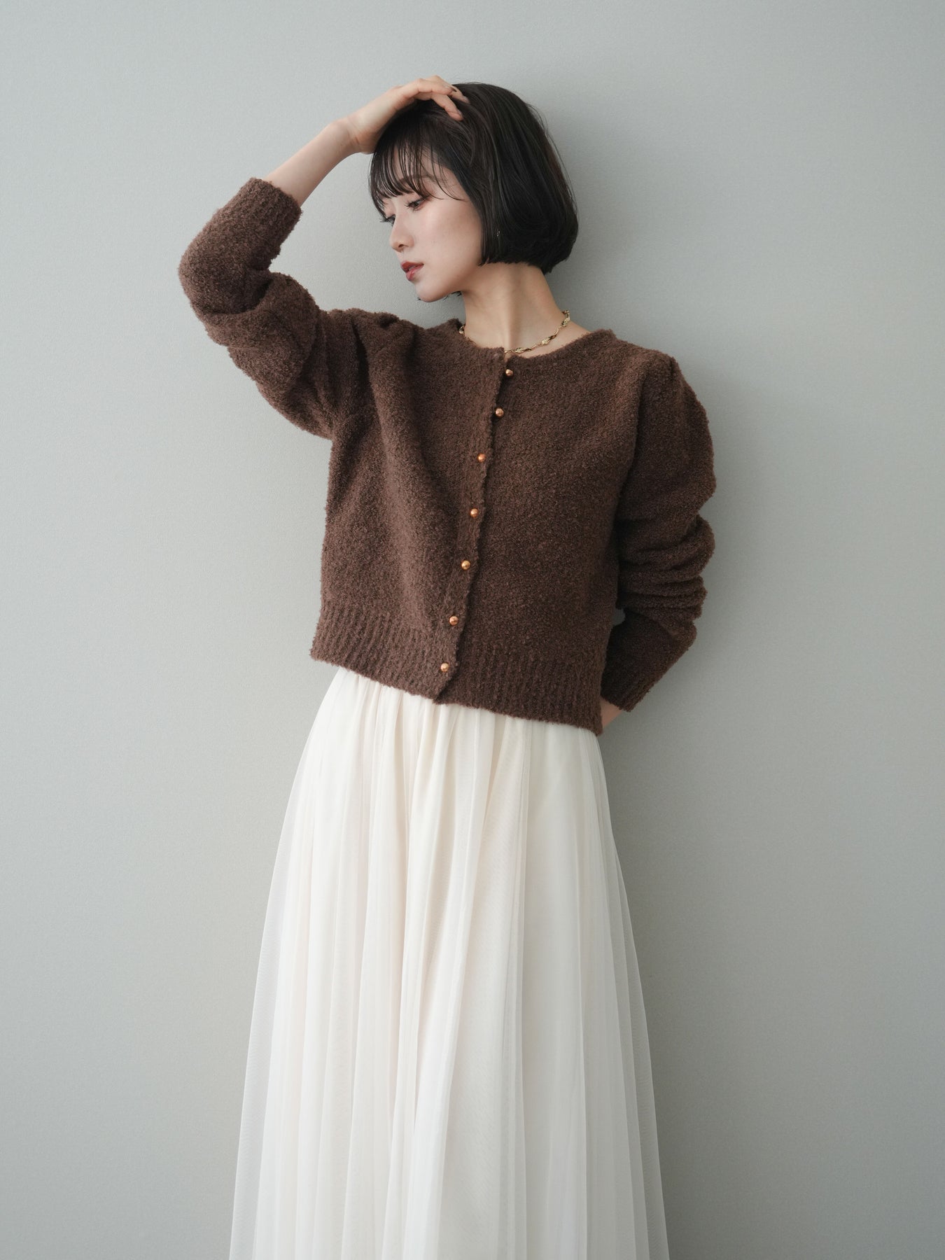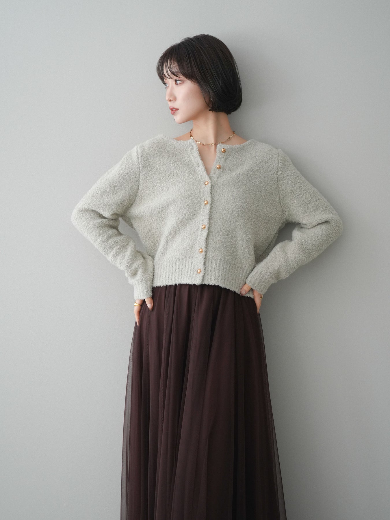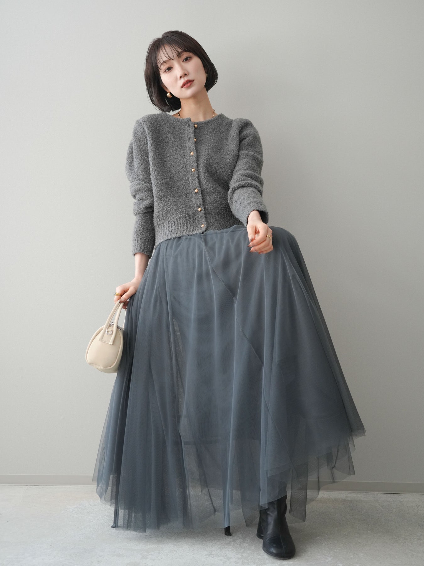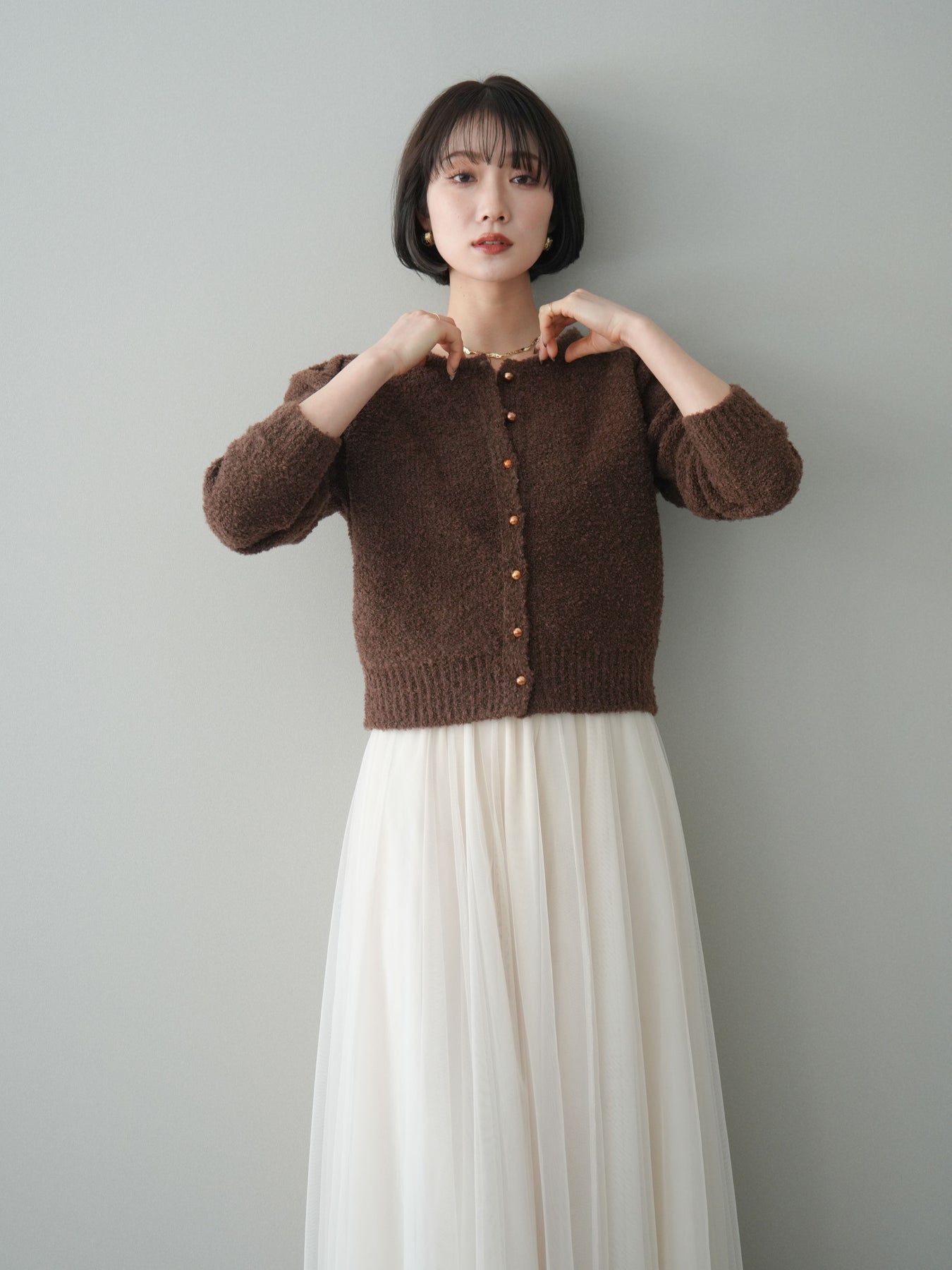 [SET]ゴールドボタンブークレニットカーディガン+チュールボリュームスカート(2set)