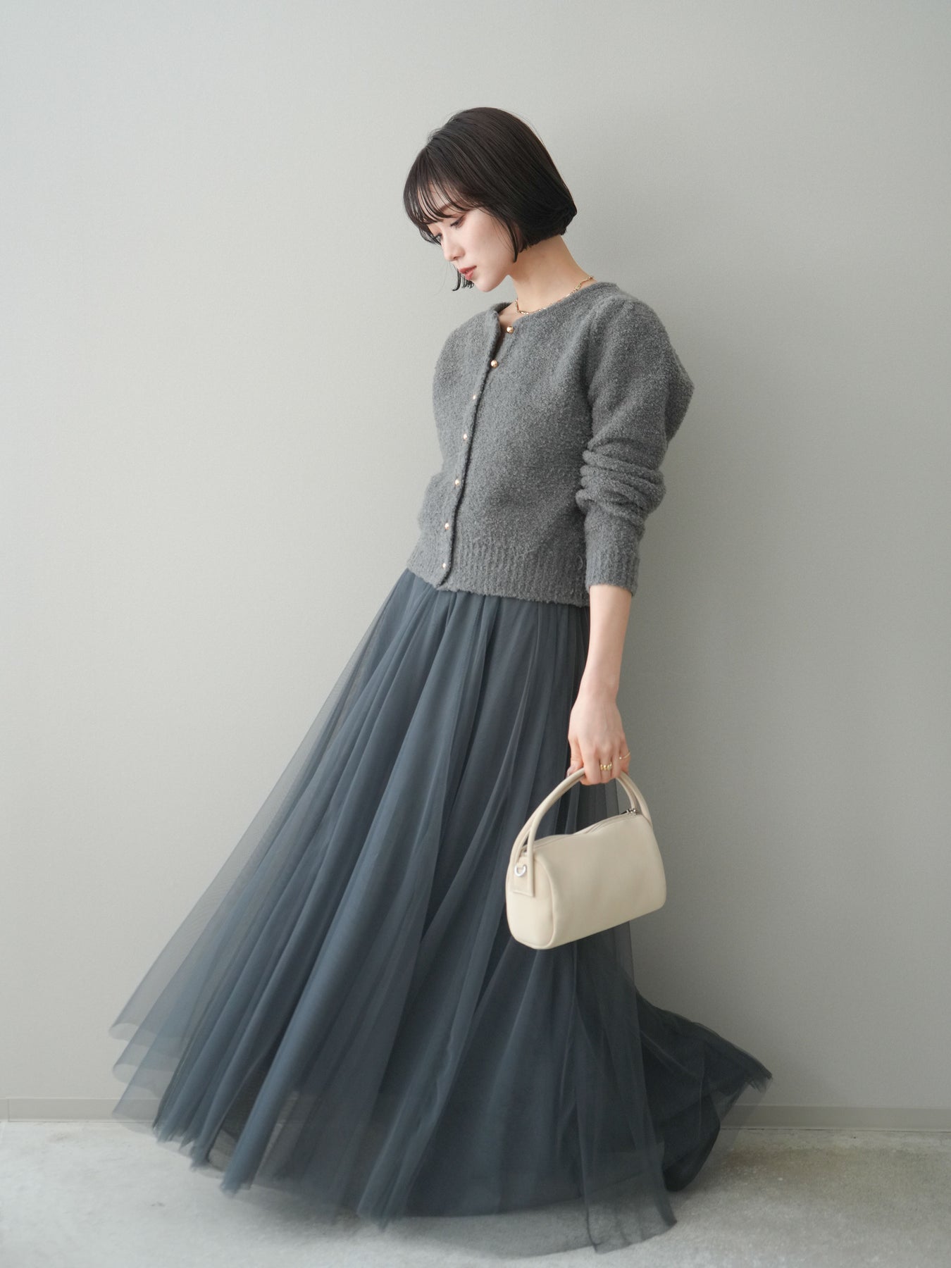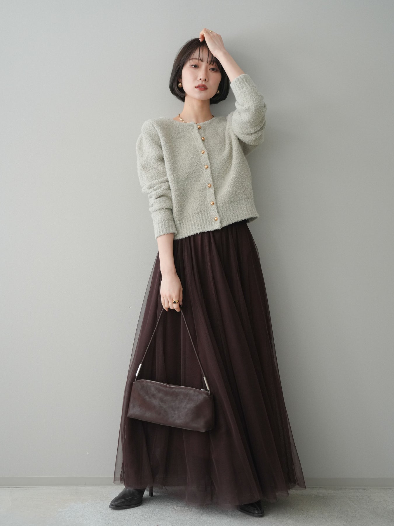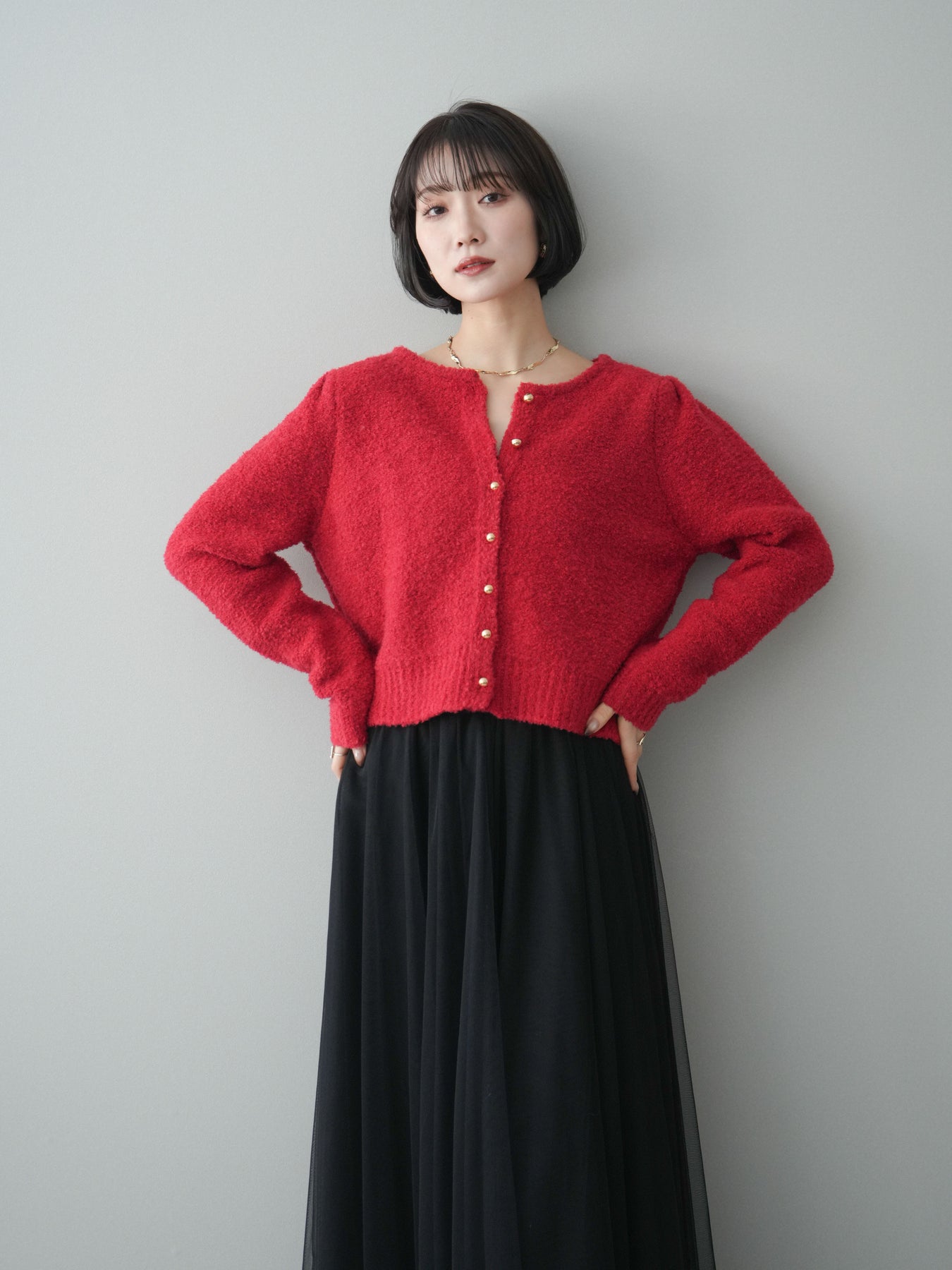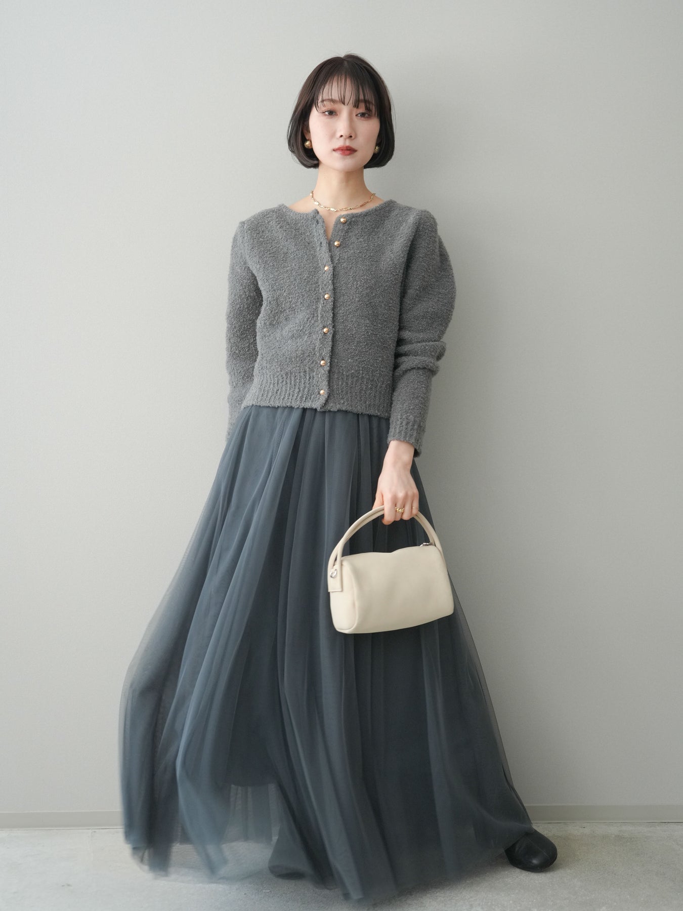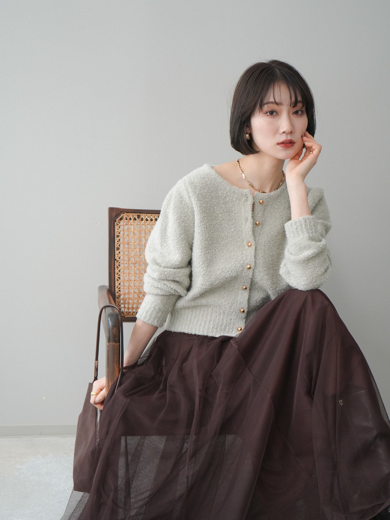 [SET]ゴールドボタンブークレニットカーディガン+チュールボリュームスカート(2set)