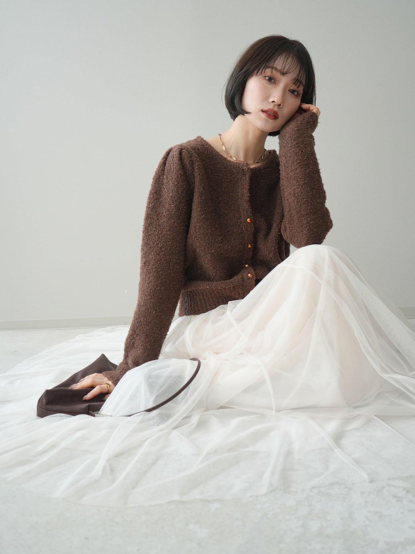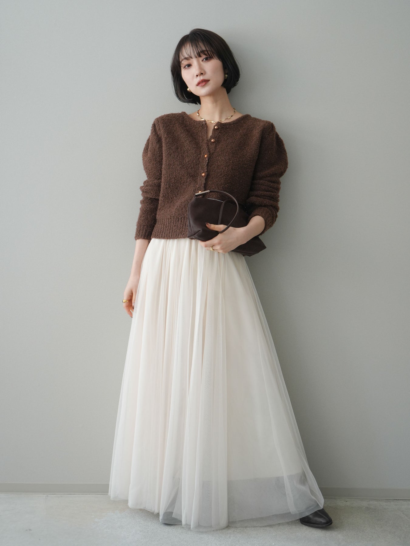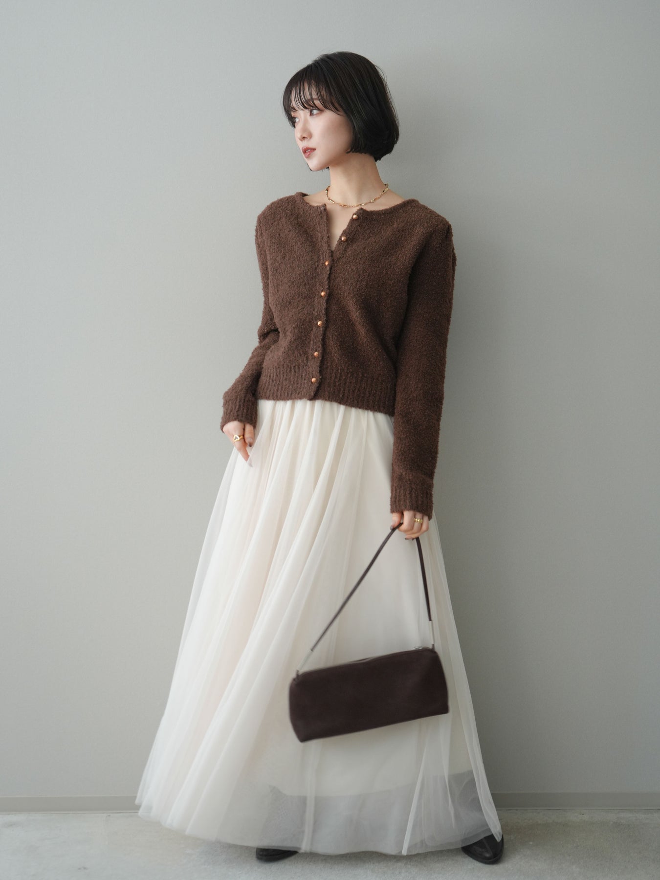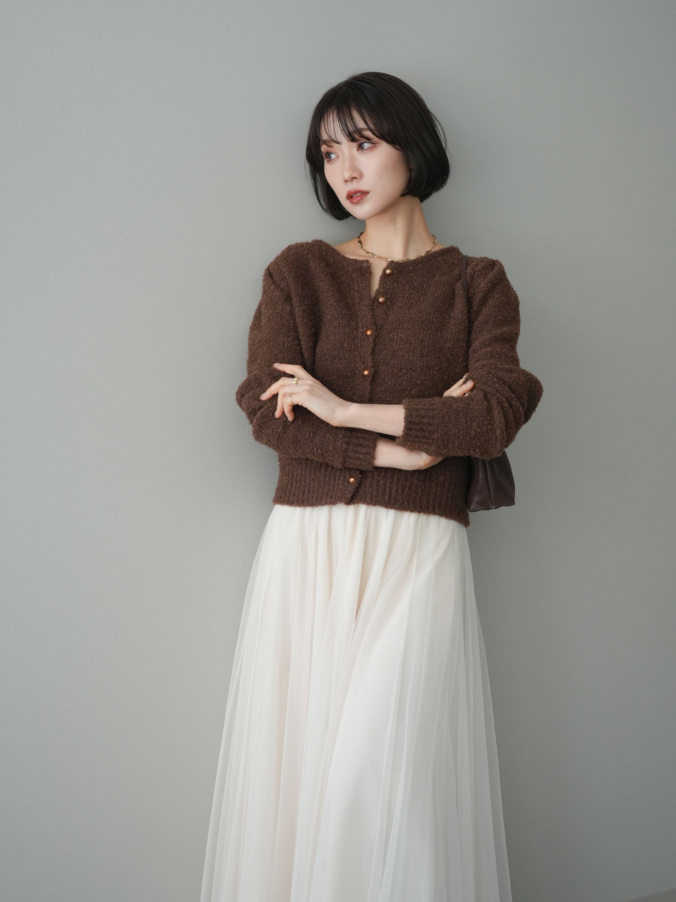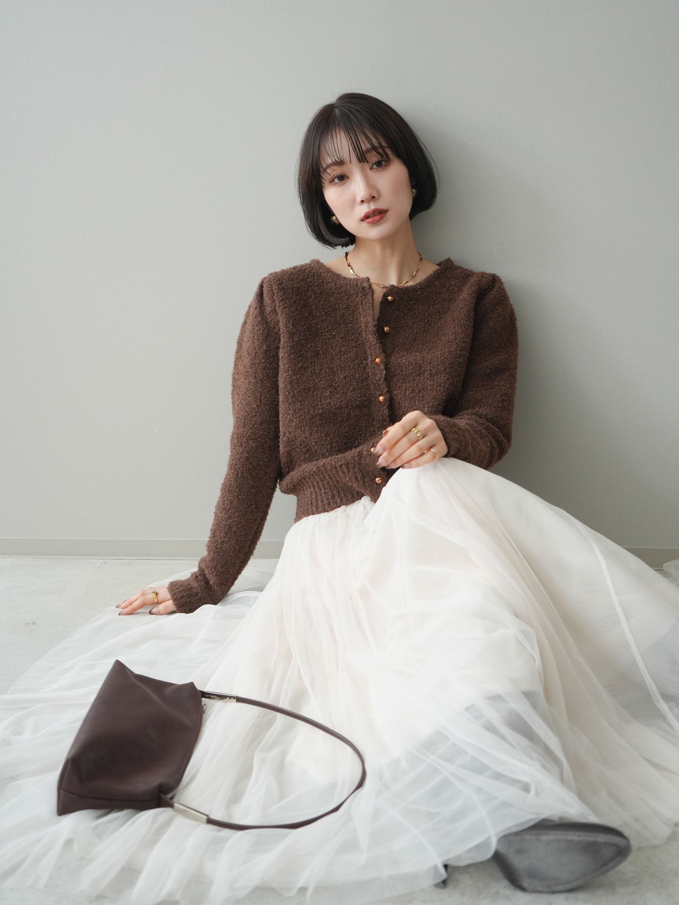 [SET]ゴールドボタンブークレニットカーディガン+チュールボリュームスカート(2set)