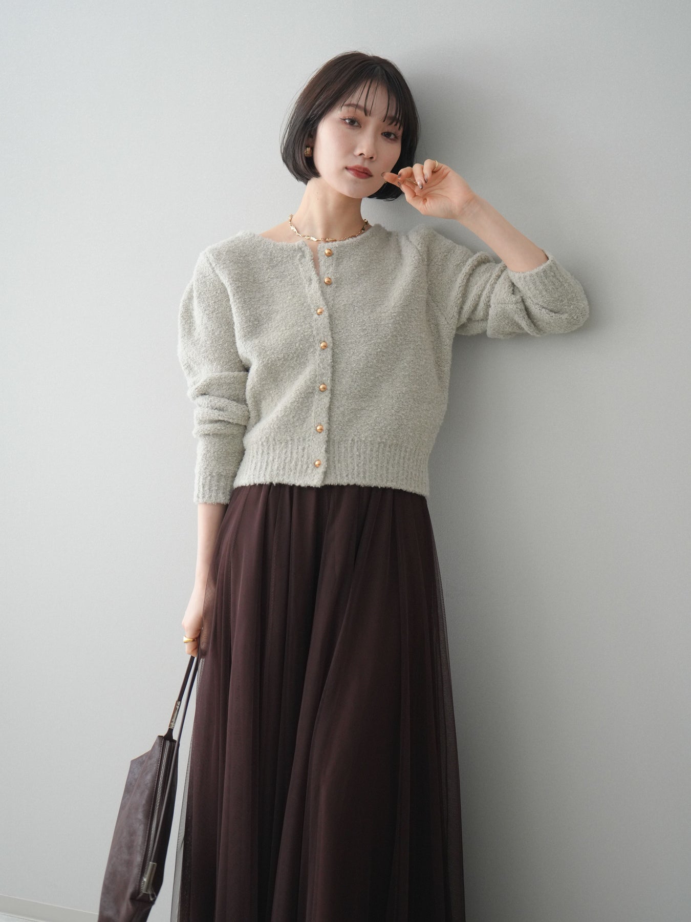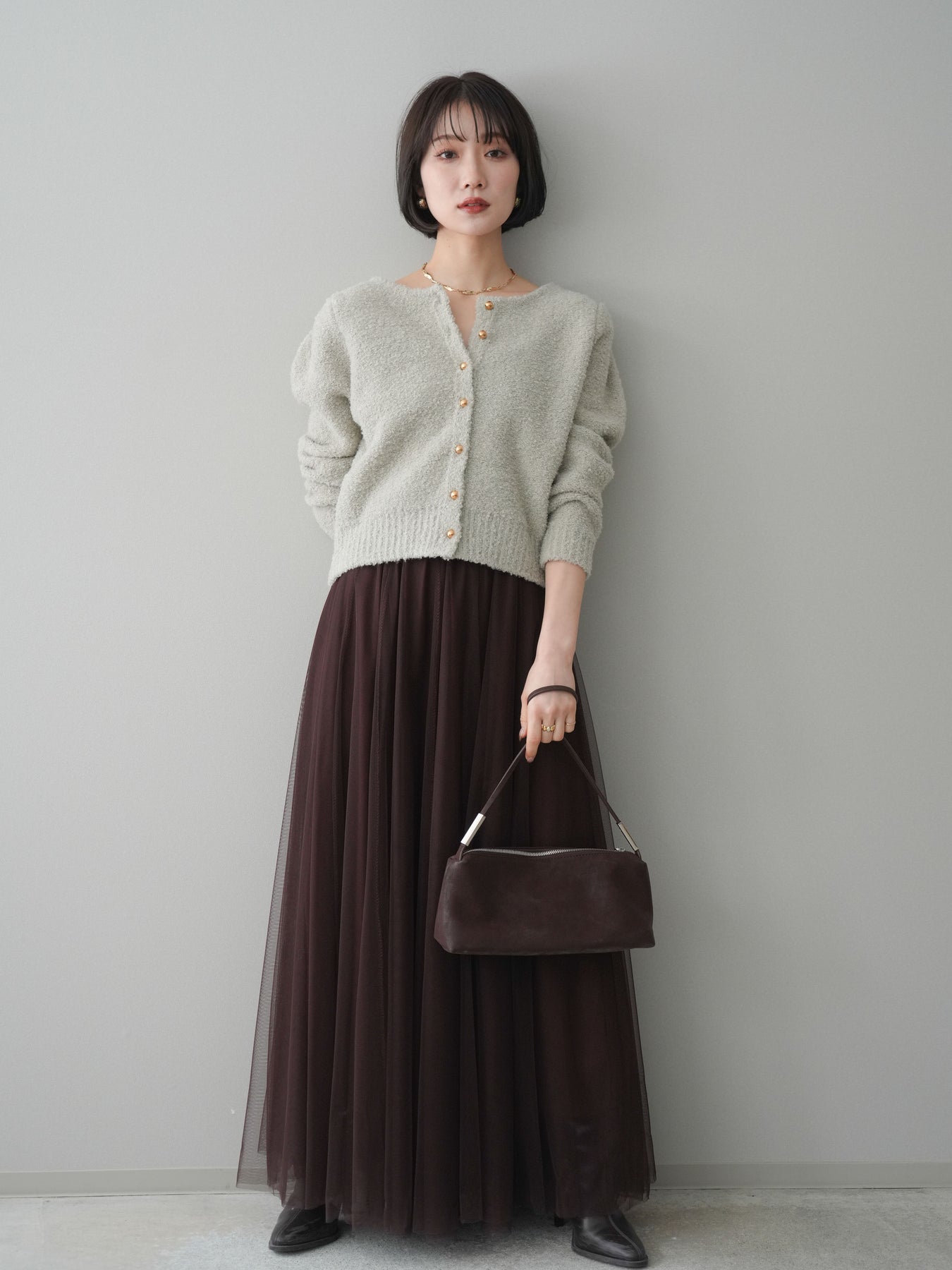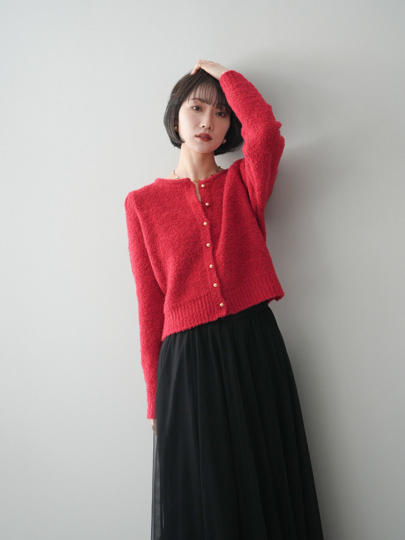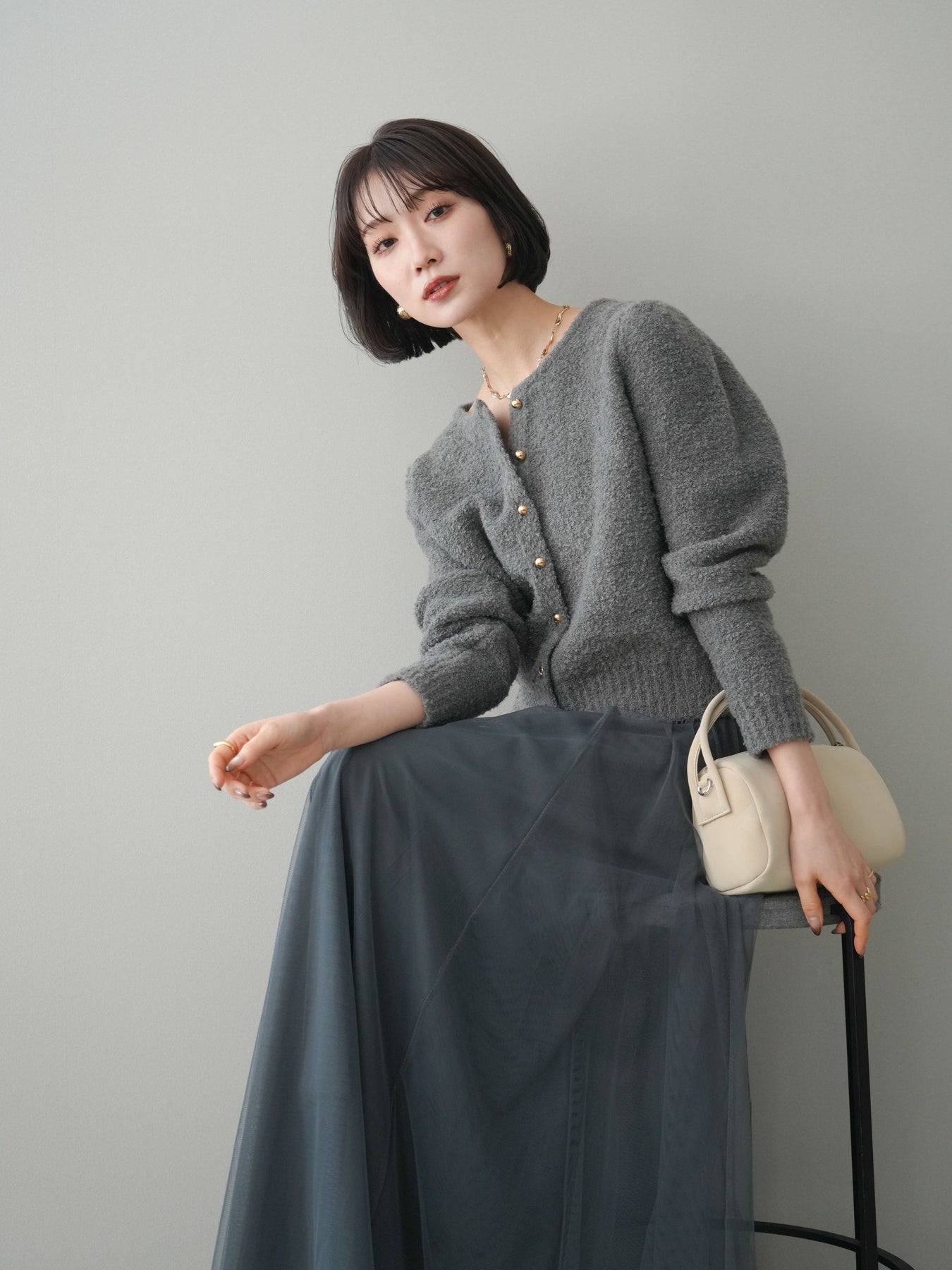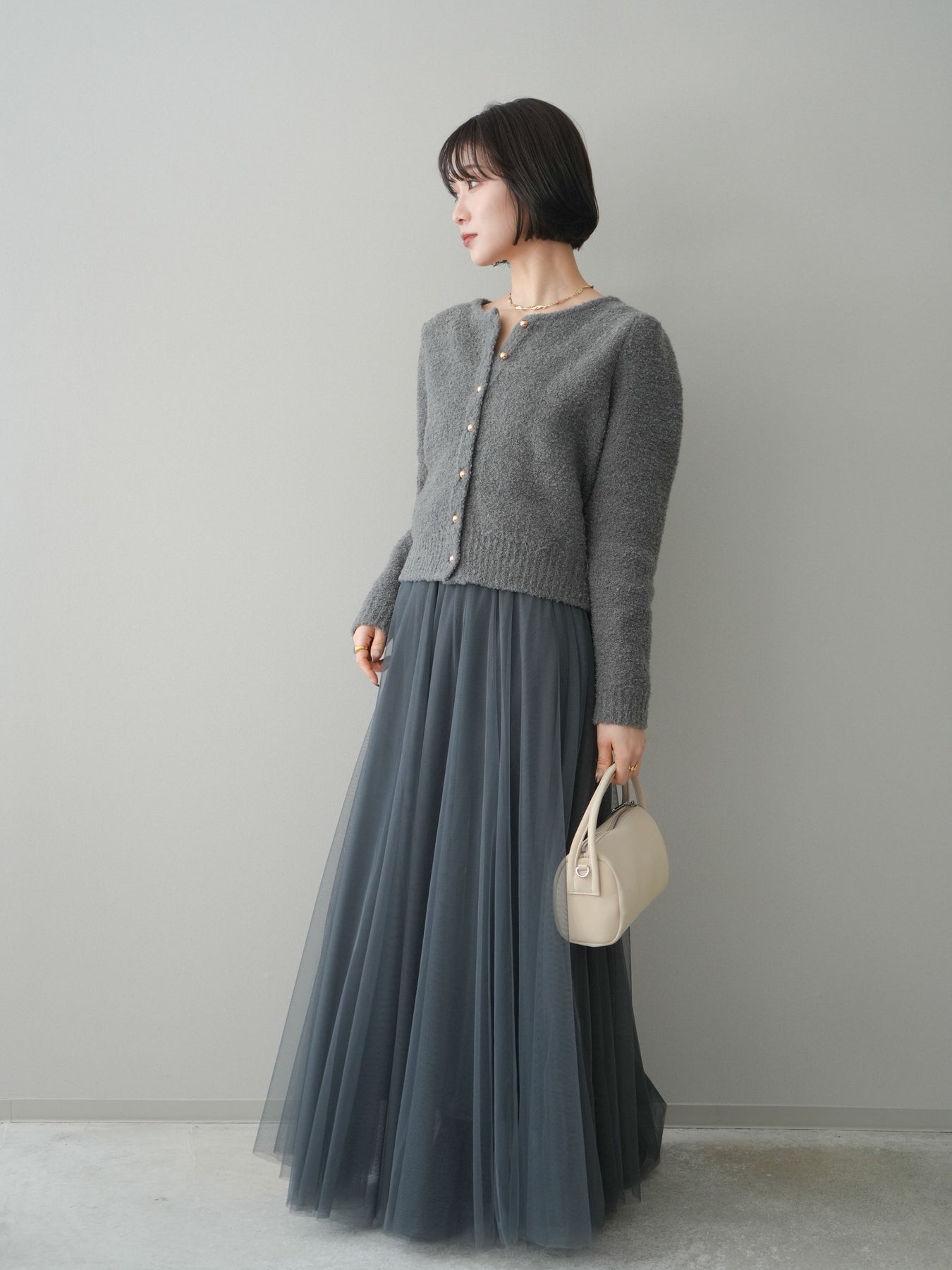 [SET]ゴールドボタンブークレニットカーディガン+チュールボリュームスカート(2set)