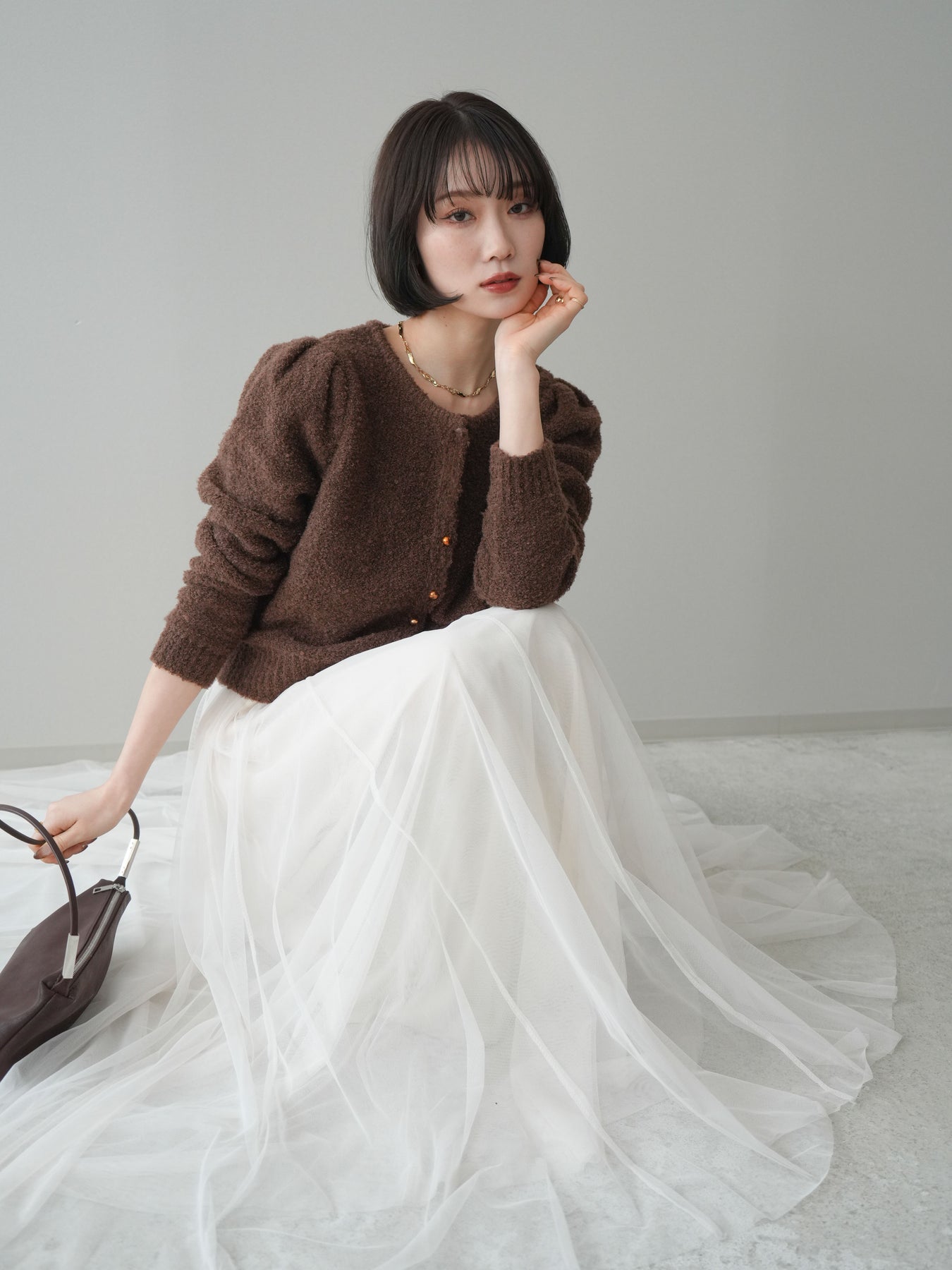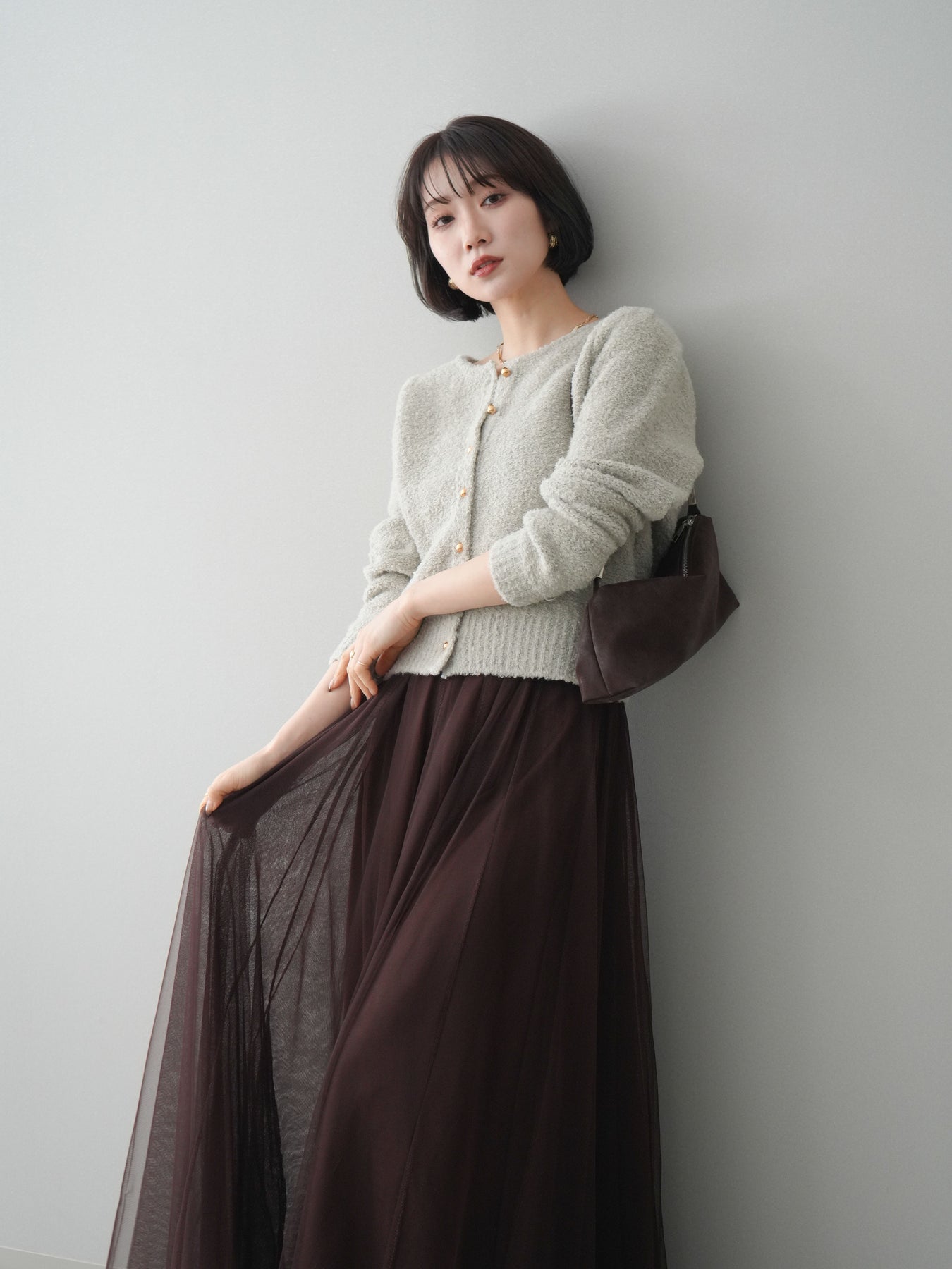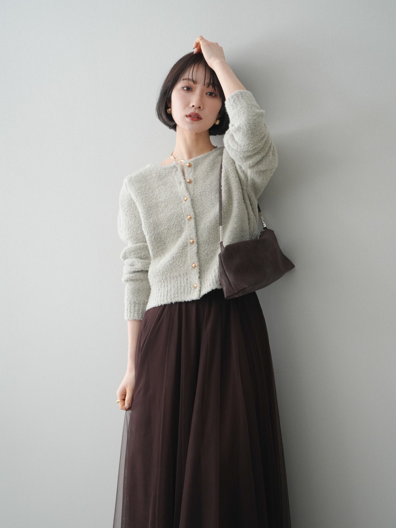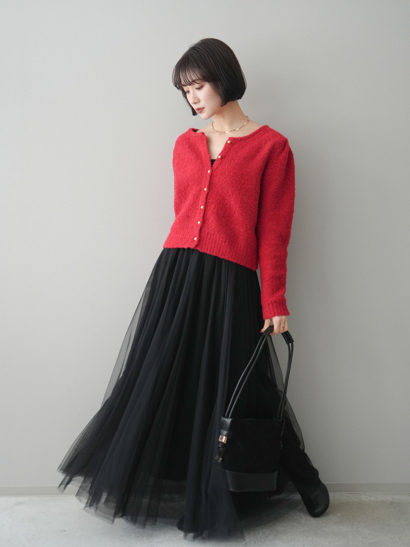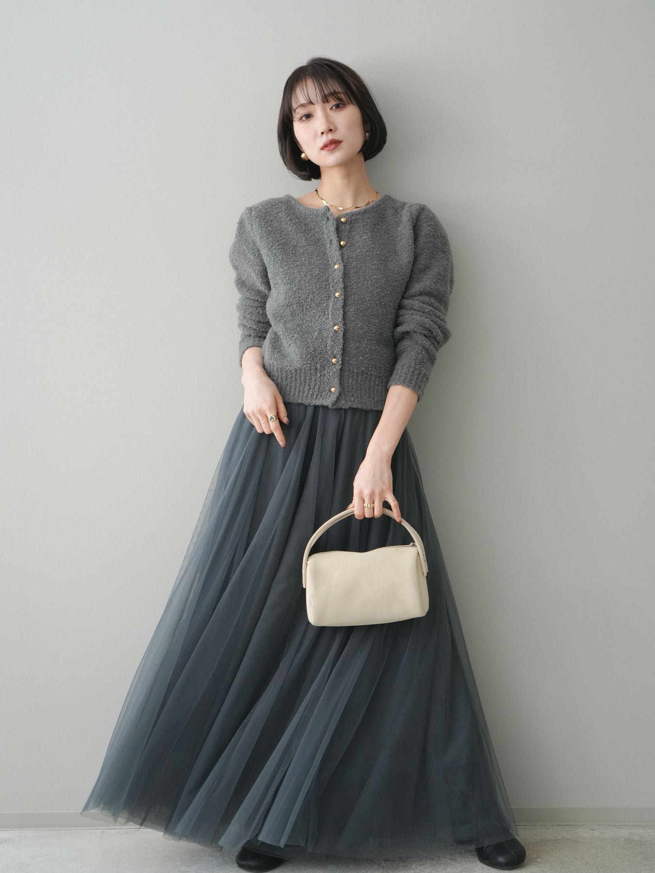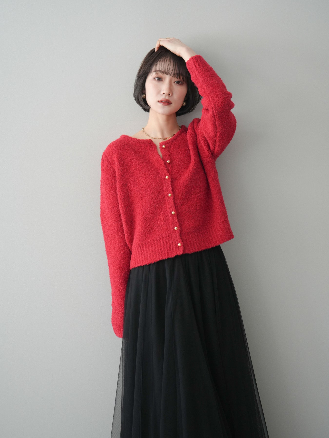 [SET]ゴールドボタンブークレニットカーディガン+チュールボリュームスカート(2set)