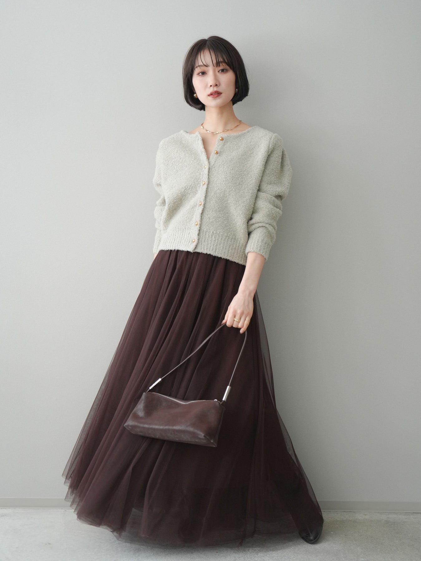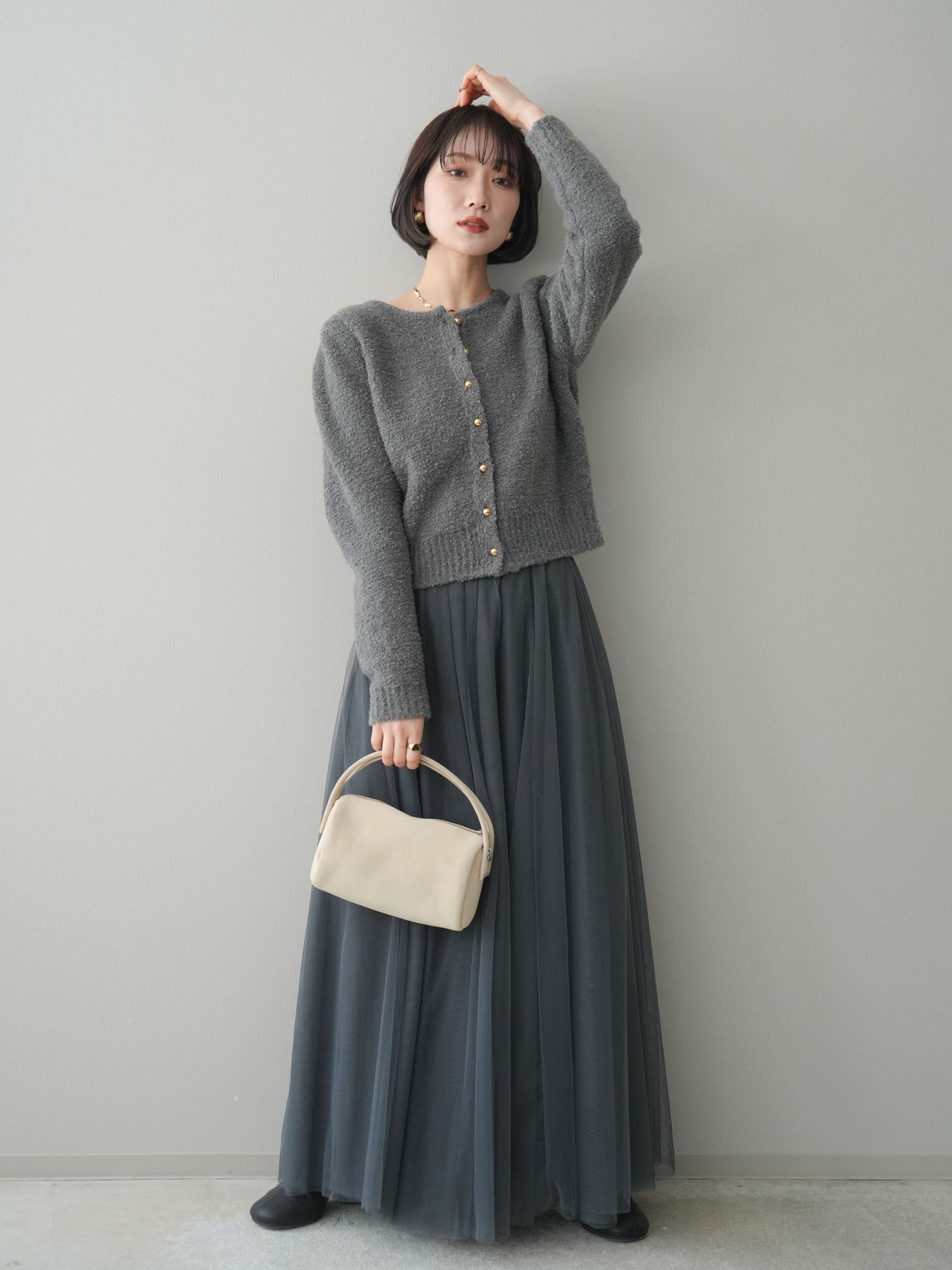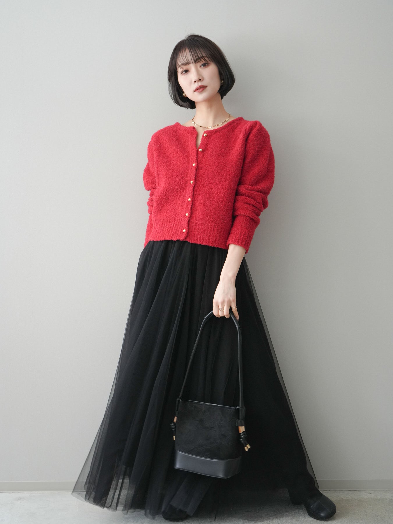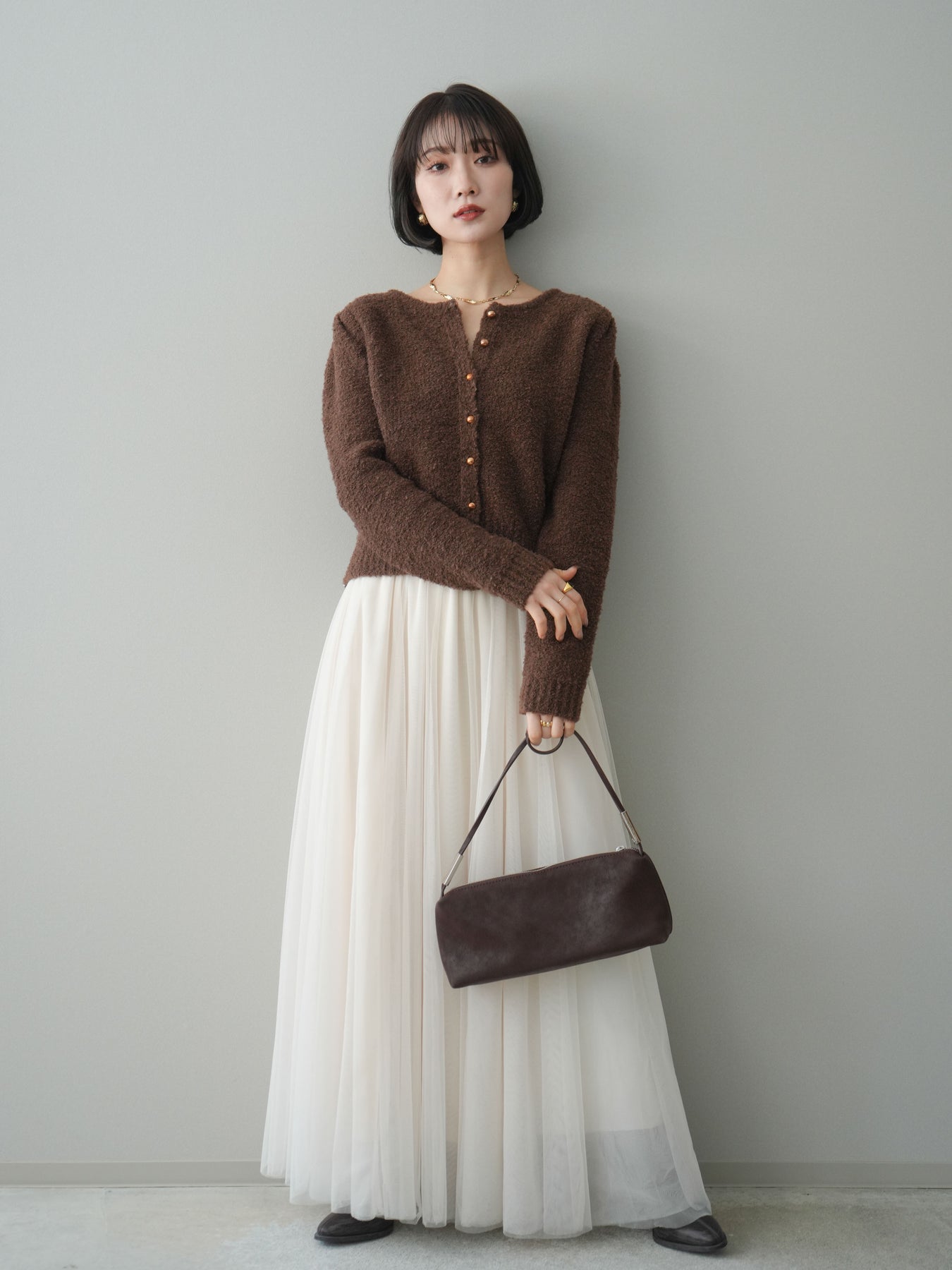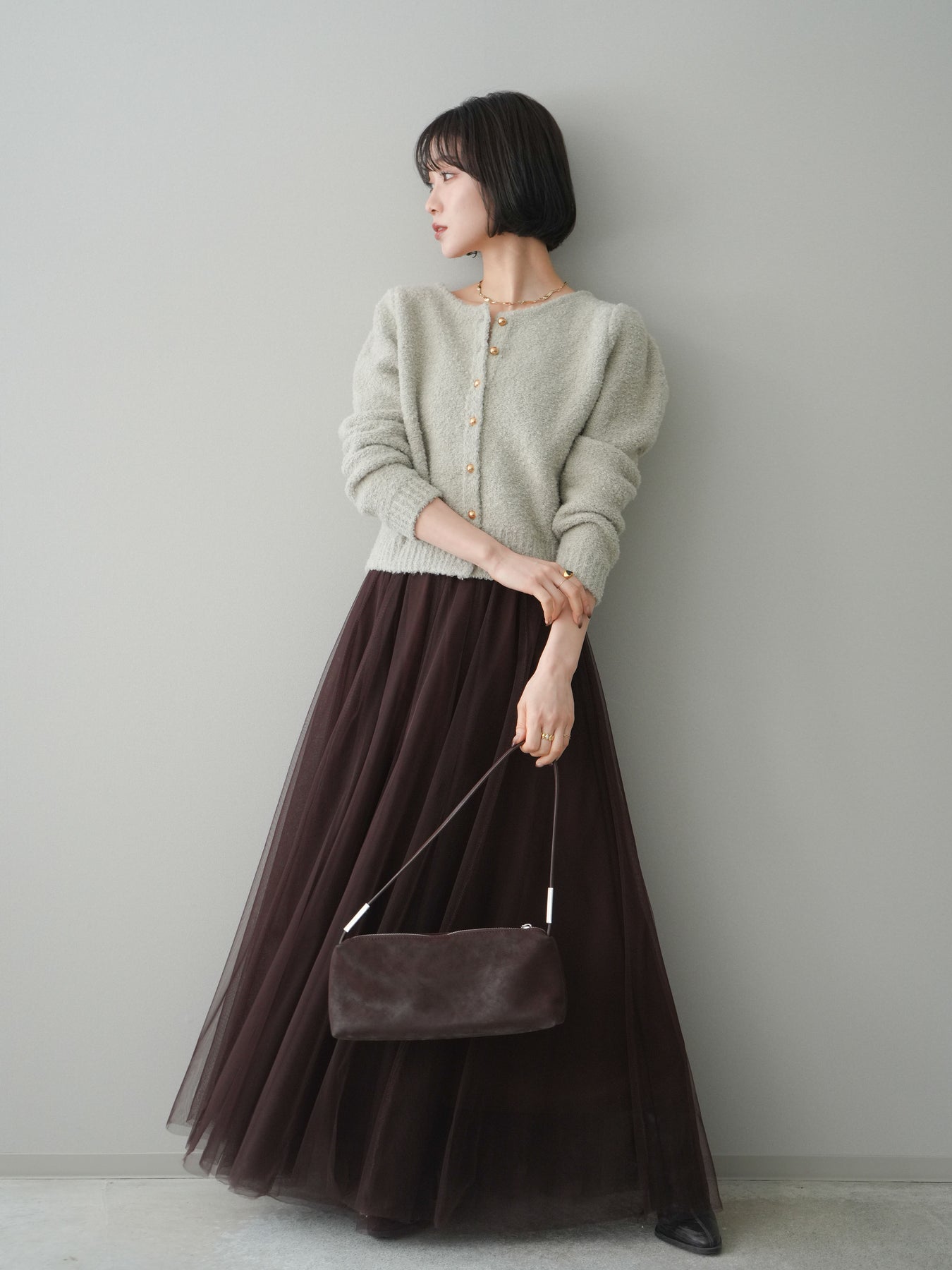[SET]ゴールドボタンブークレニットカーディガン+チュールボリュームスカート(2set)